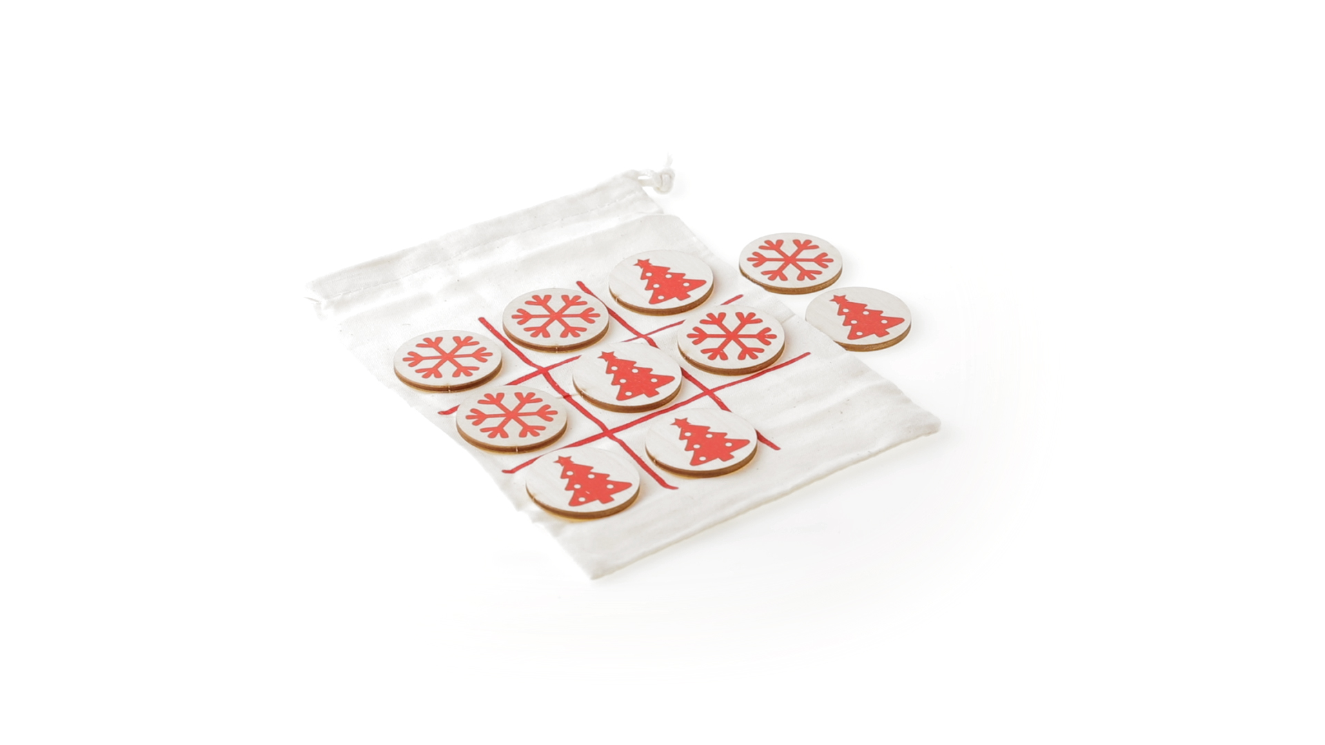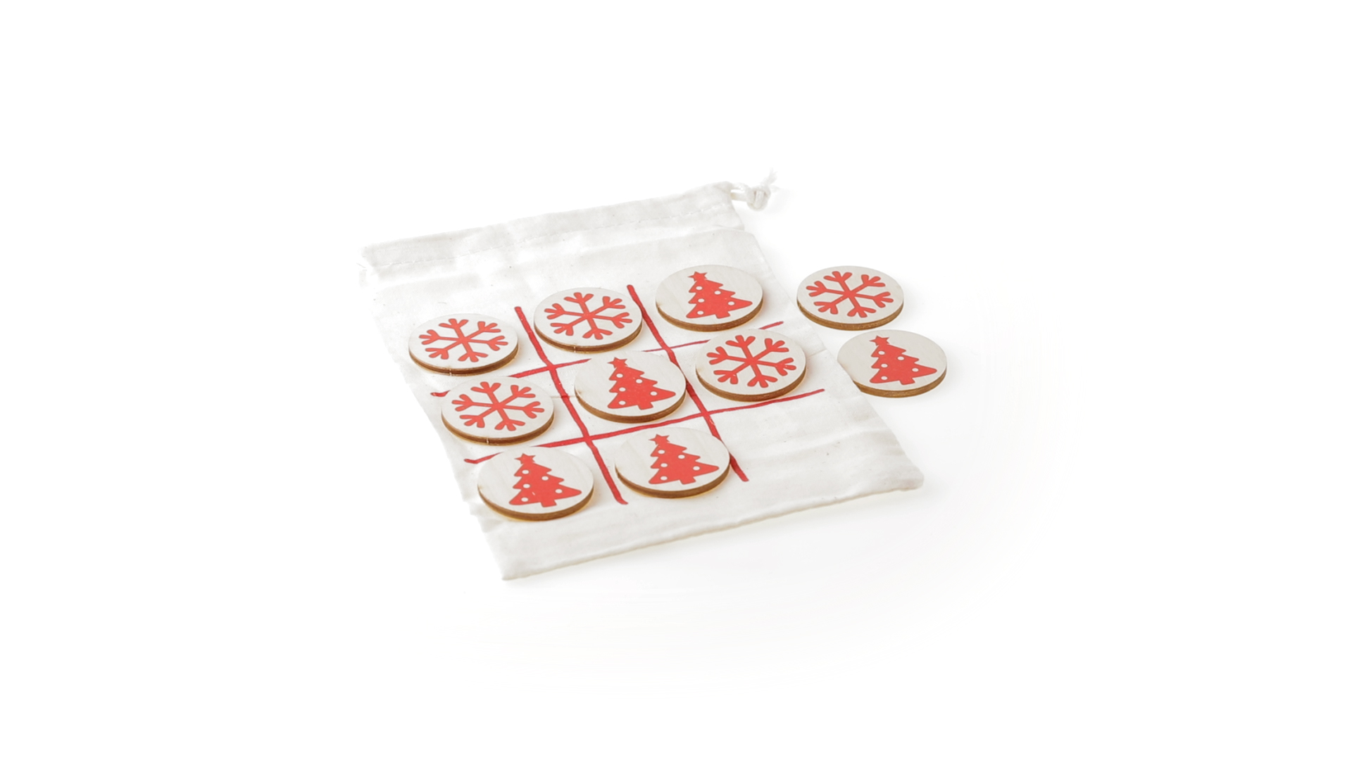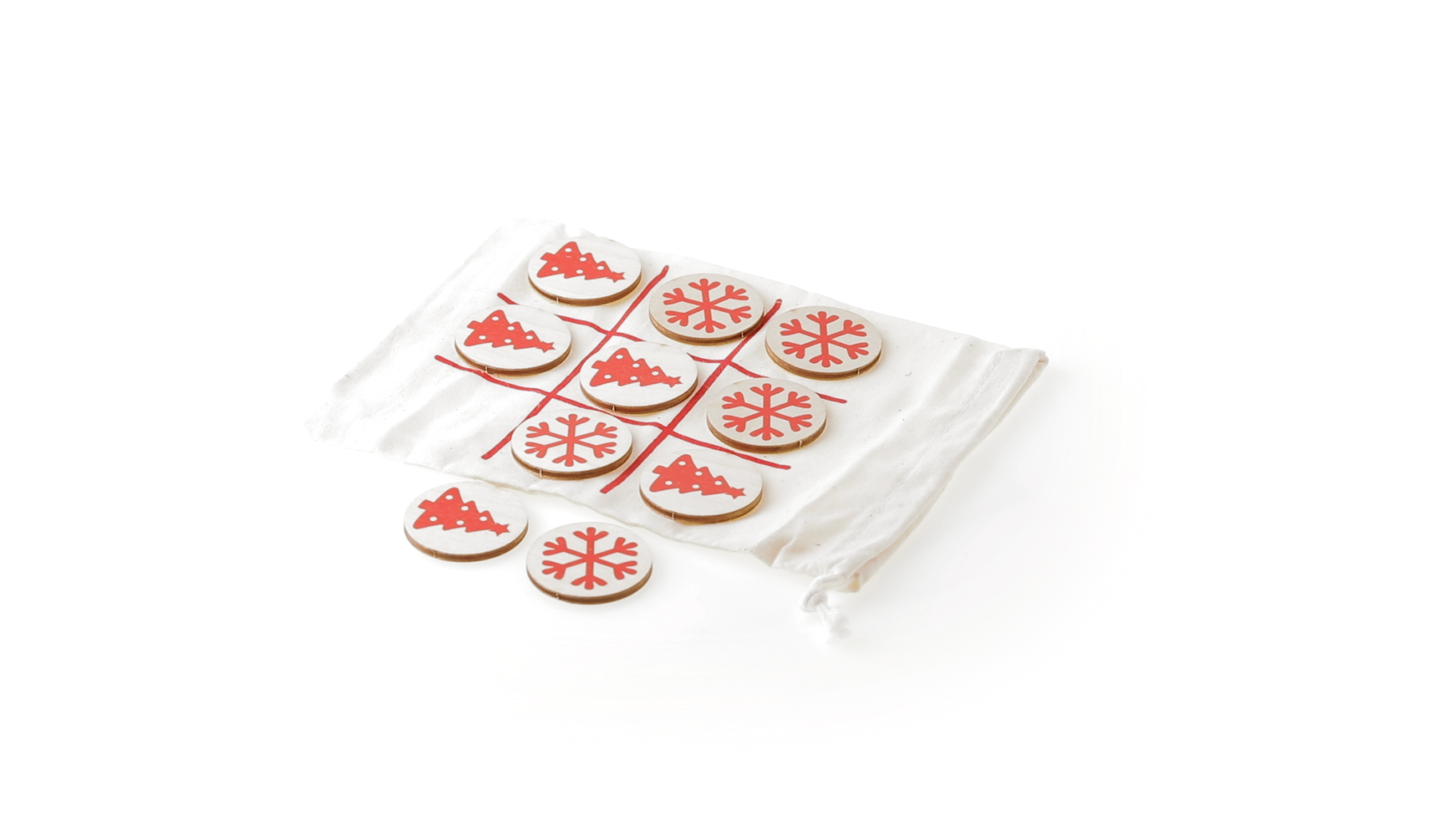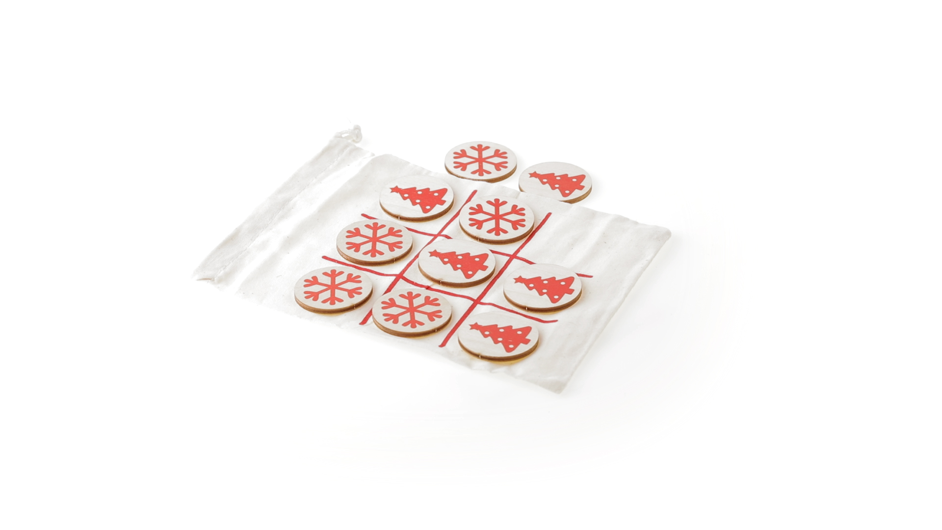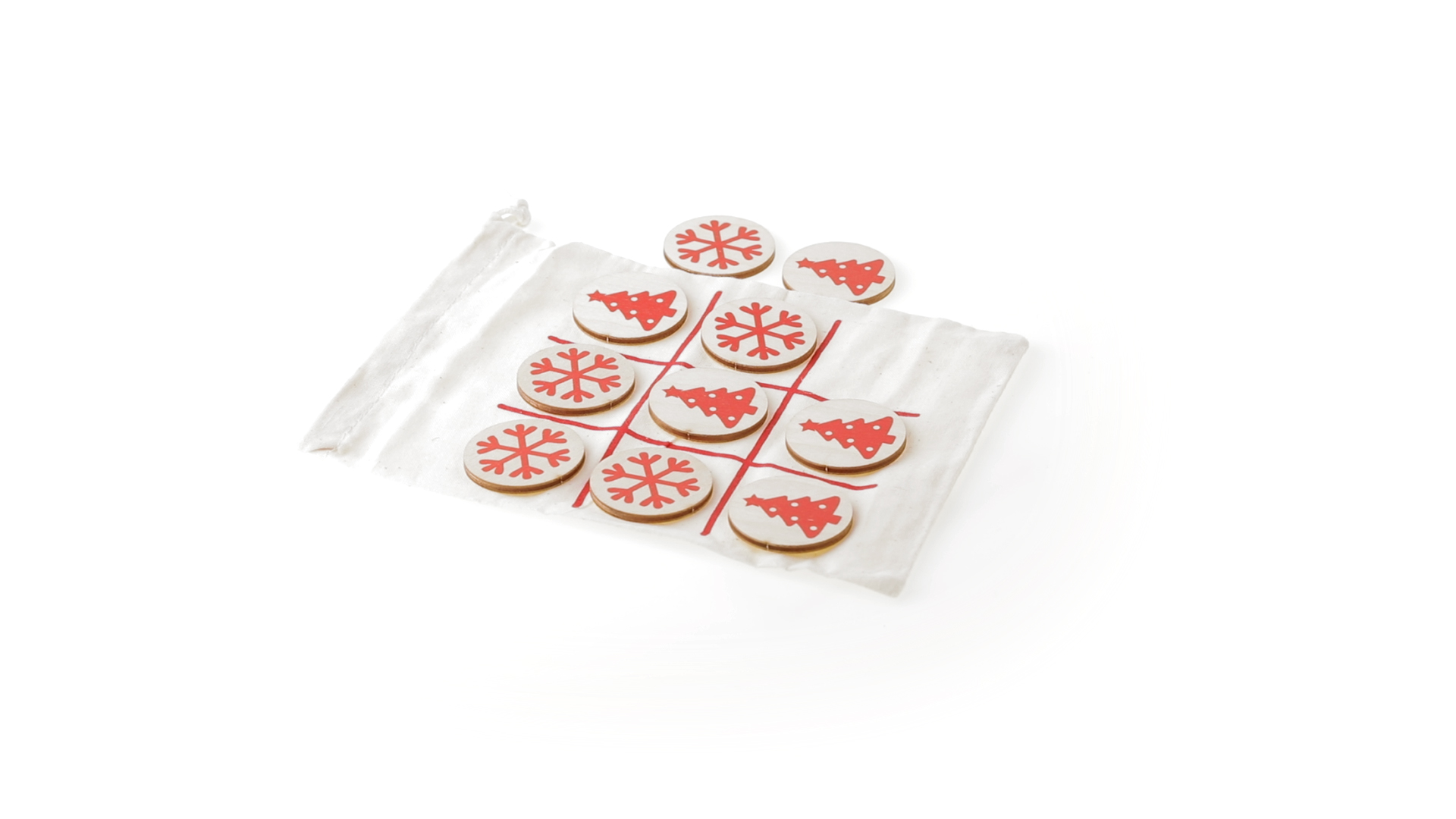 Tic-Tac-Toe-Spiel im originellen Weihnachtsdesign und aus Naturholz. Präsentiert in einem Beutel mit Kordelzug, einschliesslich 5 Schneeflocken-Spielsteine und 5 Weihnachtsbaum-Spielsteine.