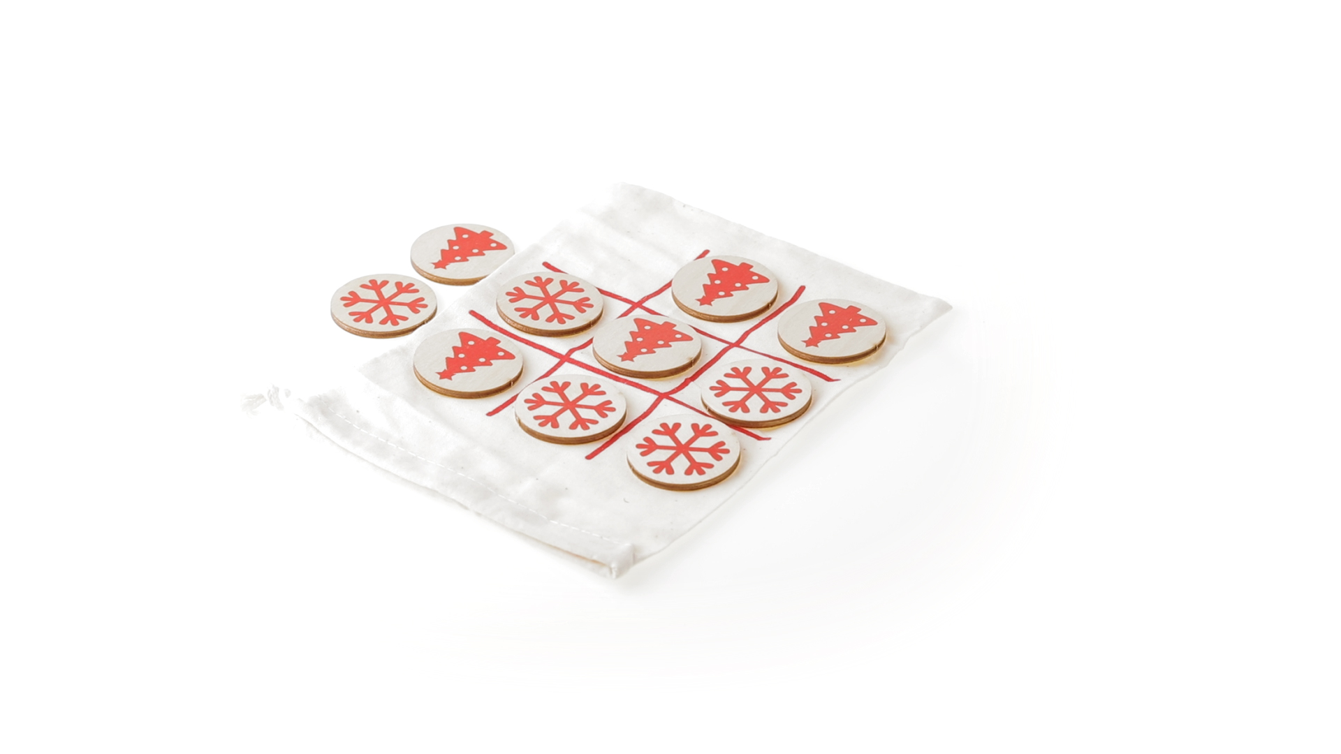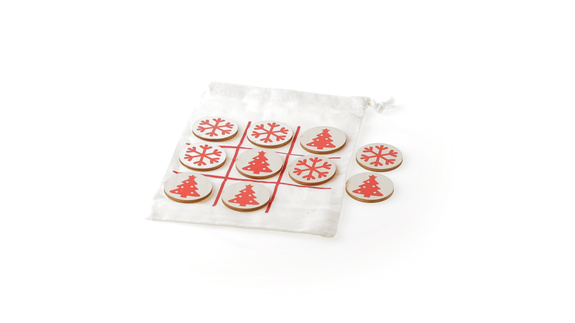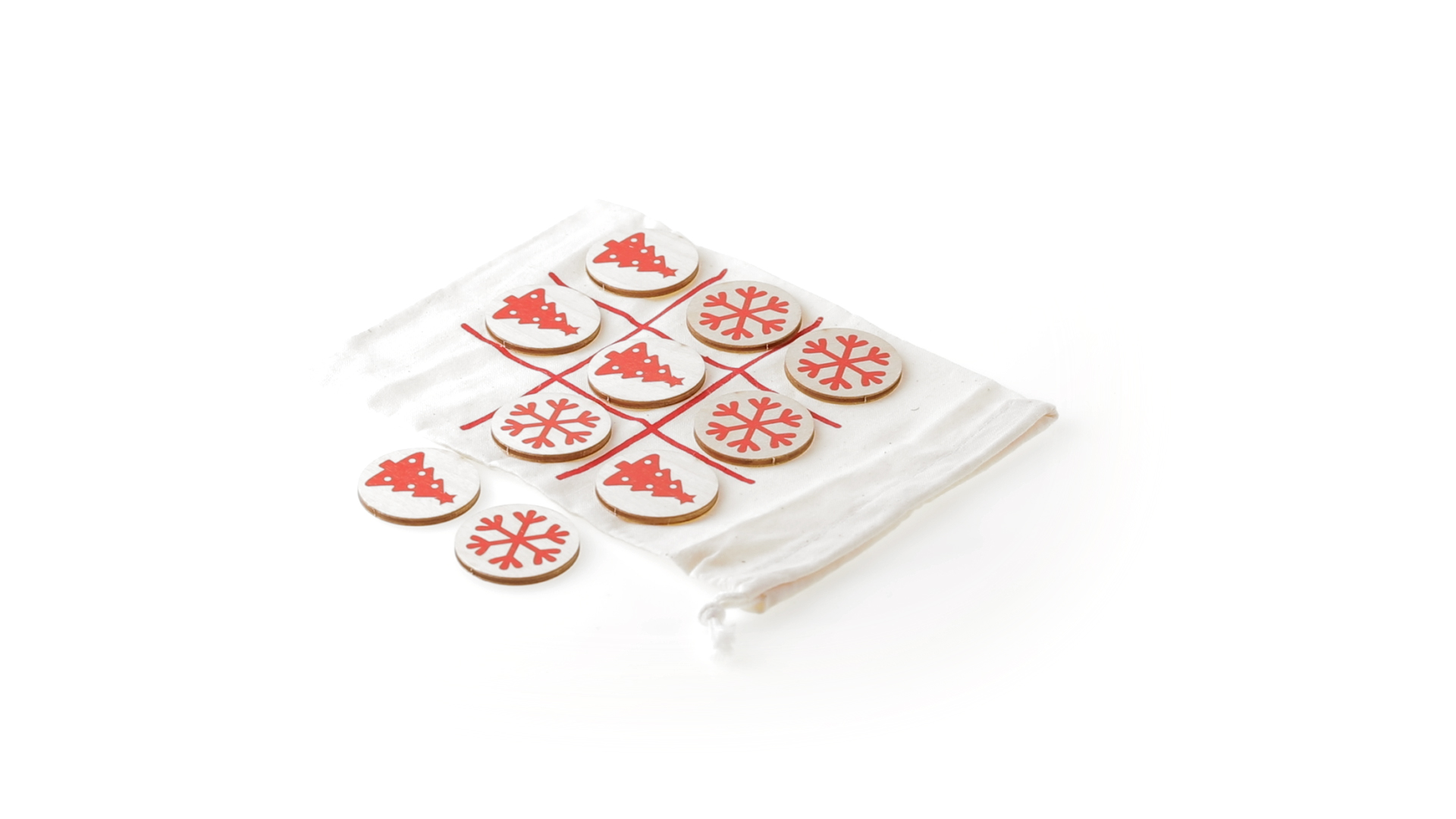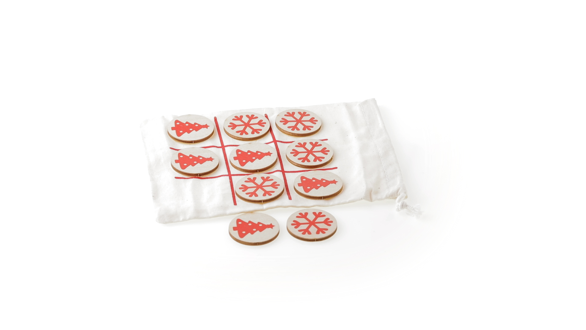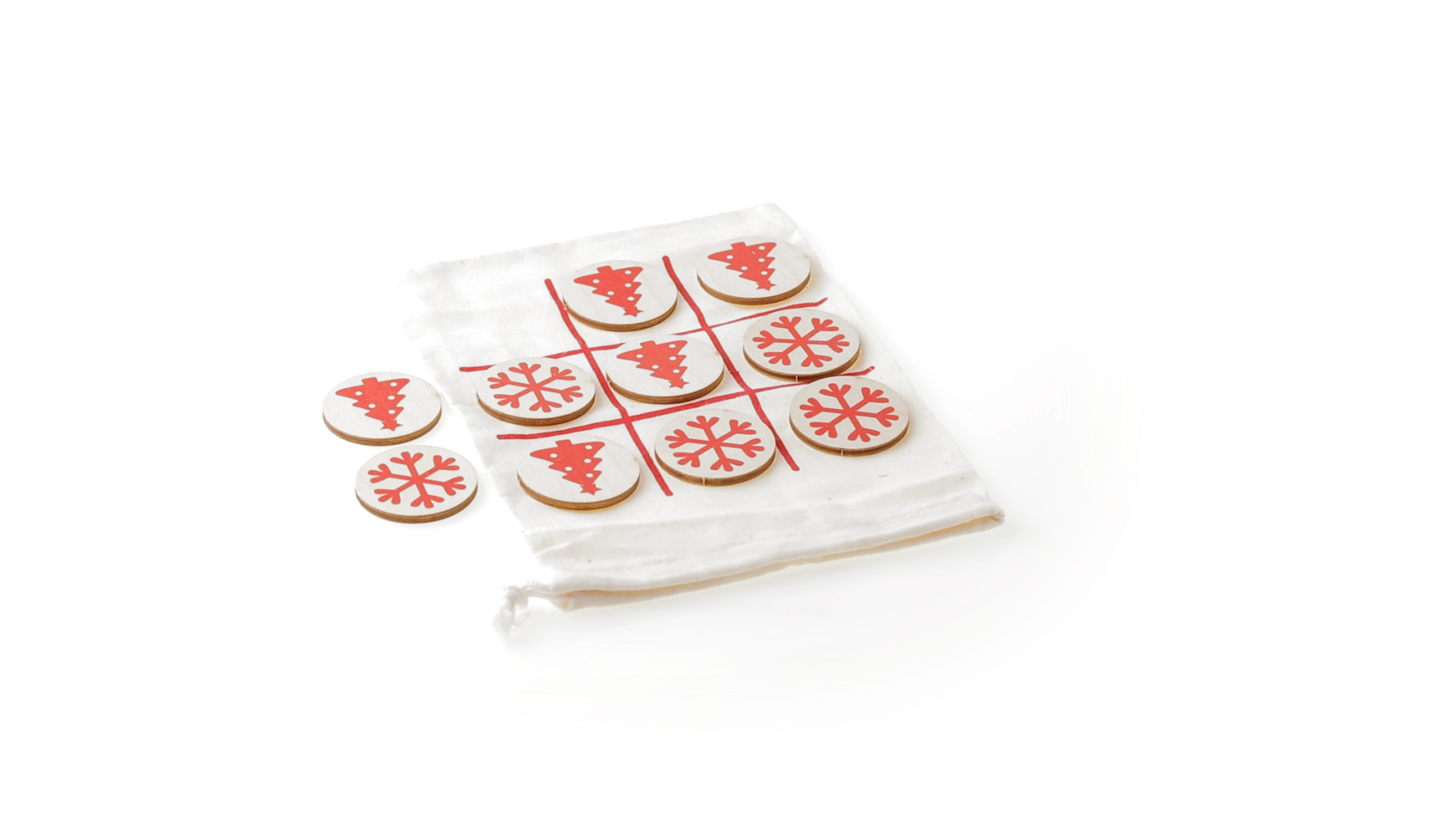 Tic-Tac-Toe-Spiel im originellen Weihnachtsdesign und aus Naturholz. Präsentiert in einem Beutel mit Kordelzug, einschliesslich 5 Schneeflocken-Spielsteine und 5 Weihnachtsbaum-Spielsteine.