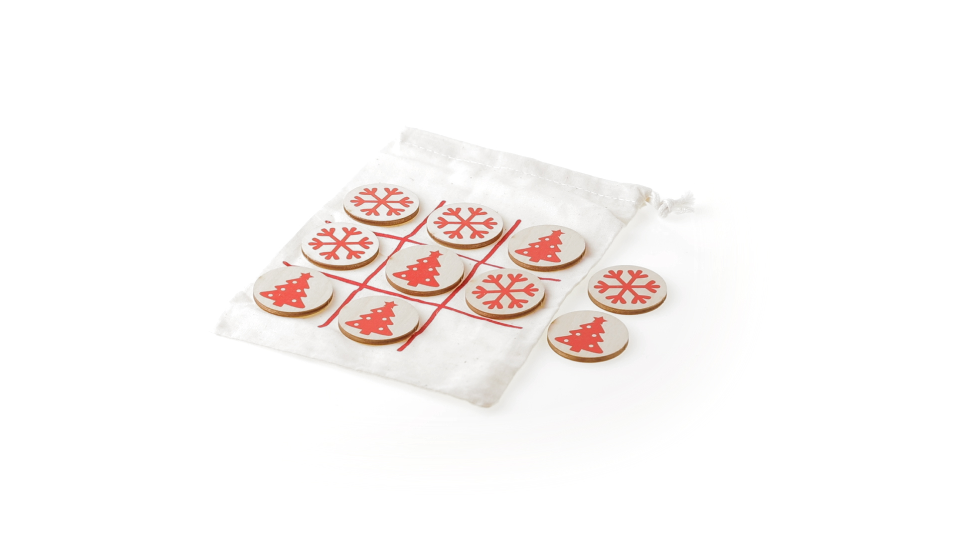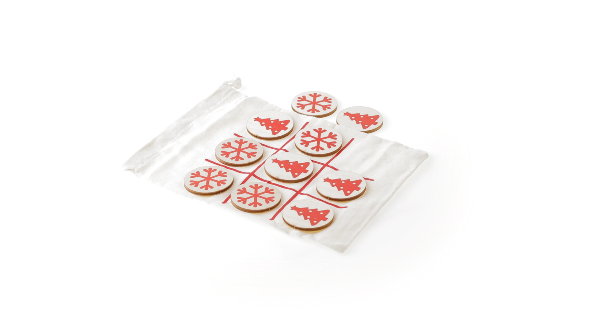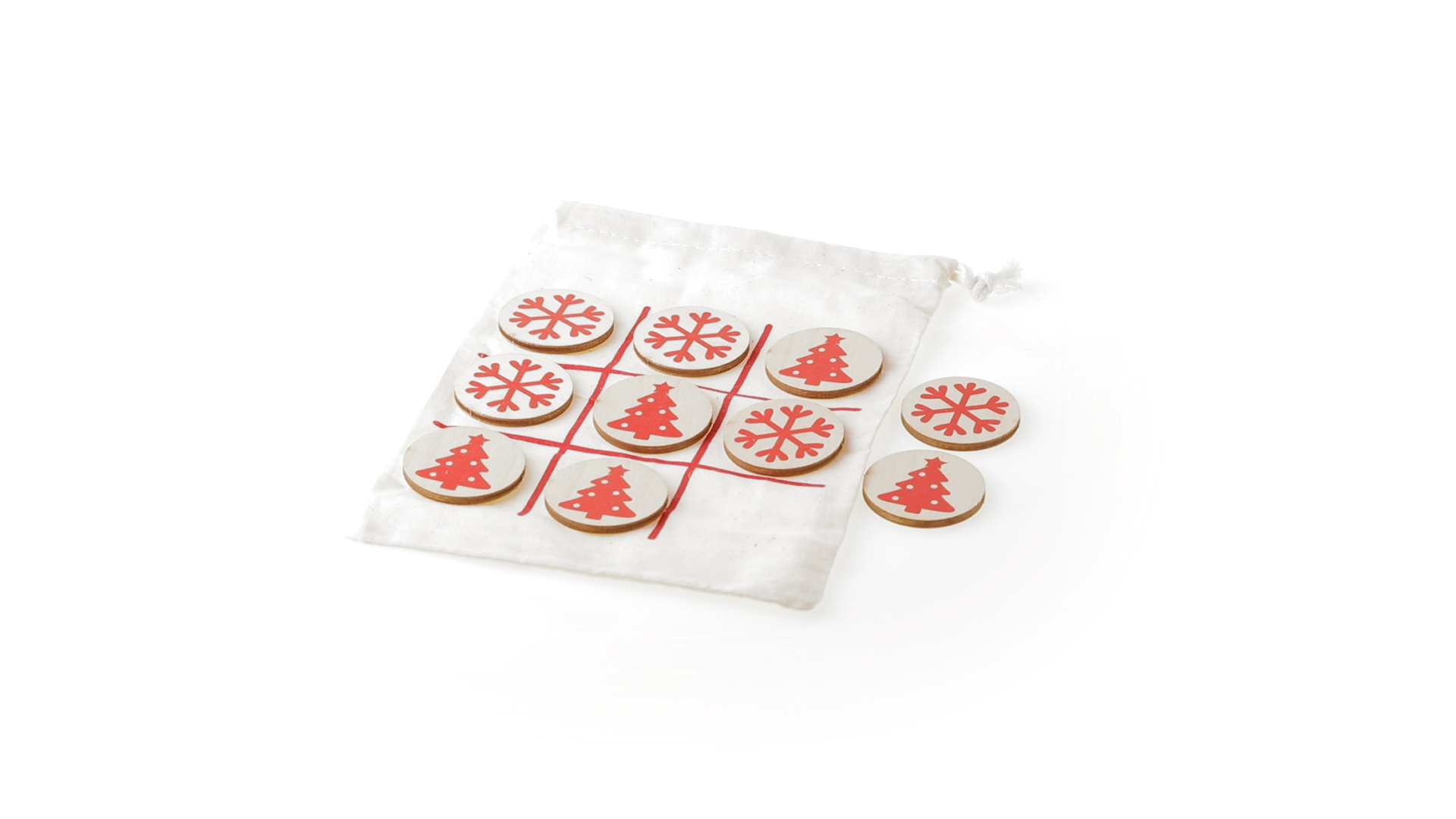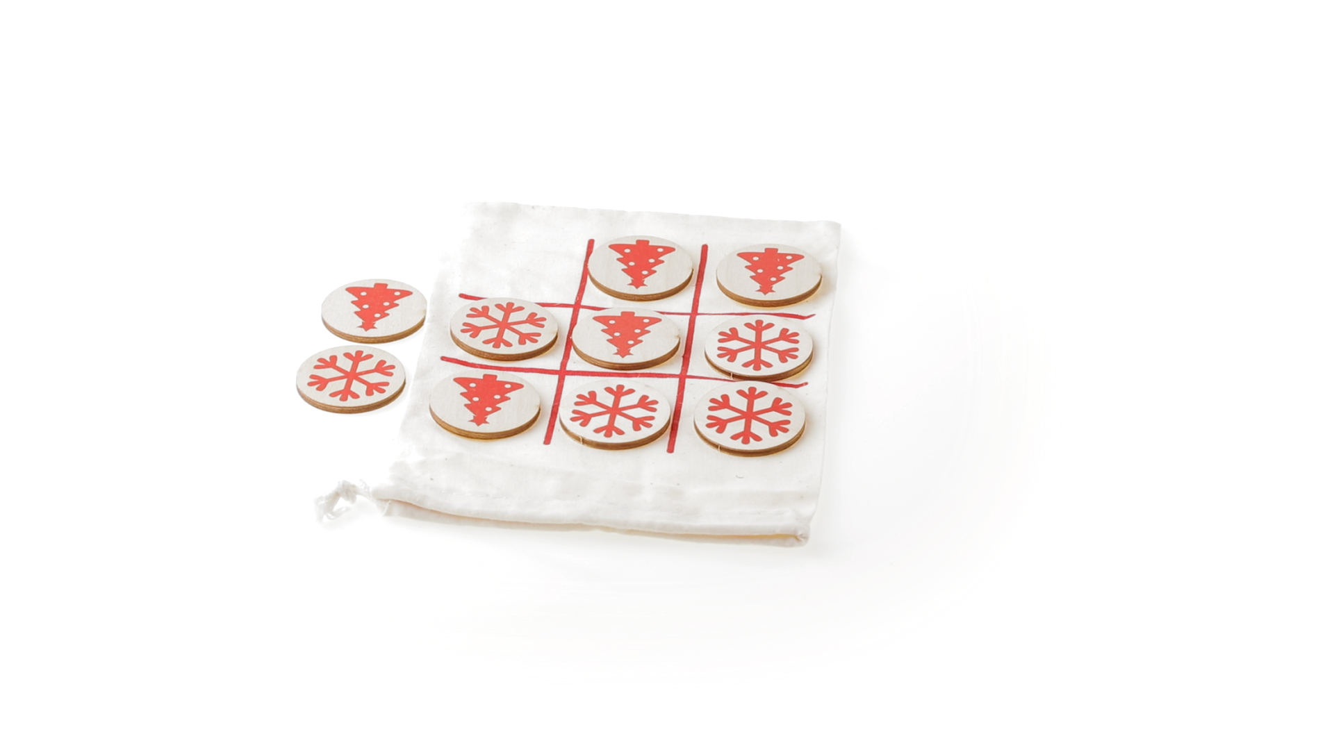 Tic-Tac-Toe-Spiel im originellen Weihnachtsdesign und aus Naturholz. Präsentiert in einem Beutel mit Kordelzug, einschliesslich 5 Schneeflocken-Spielsteine und 5 Weihnachtsbaum-Spielsteine.