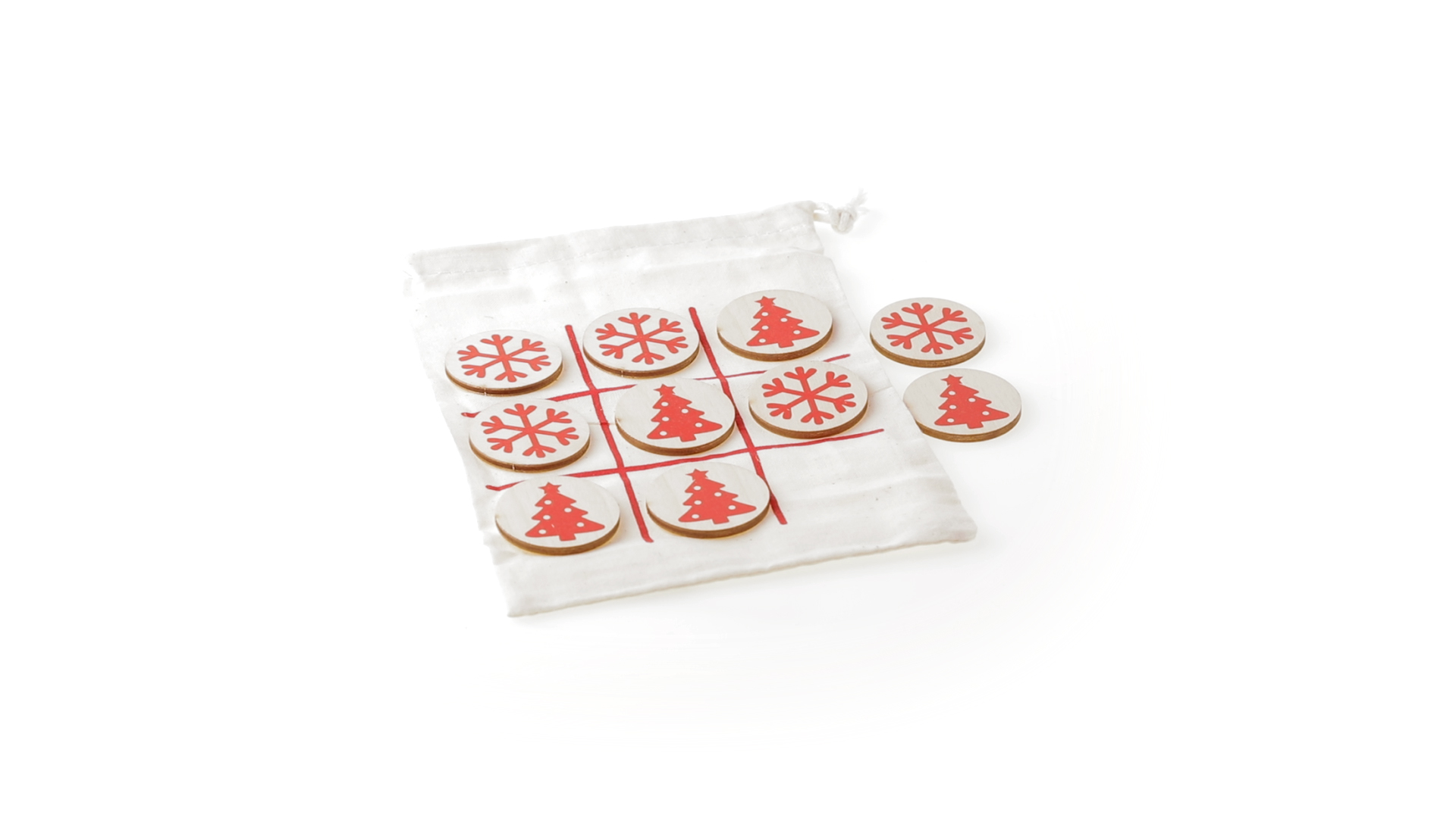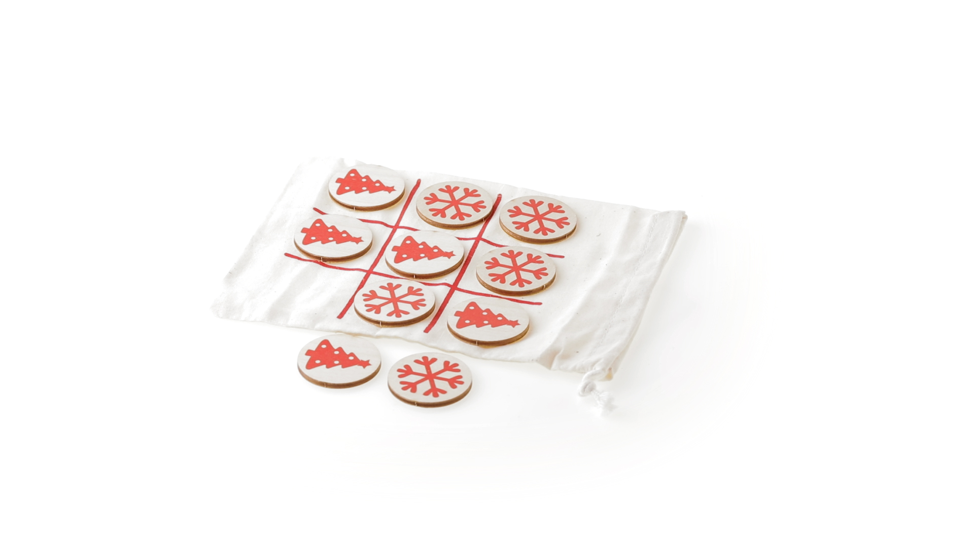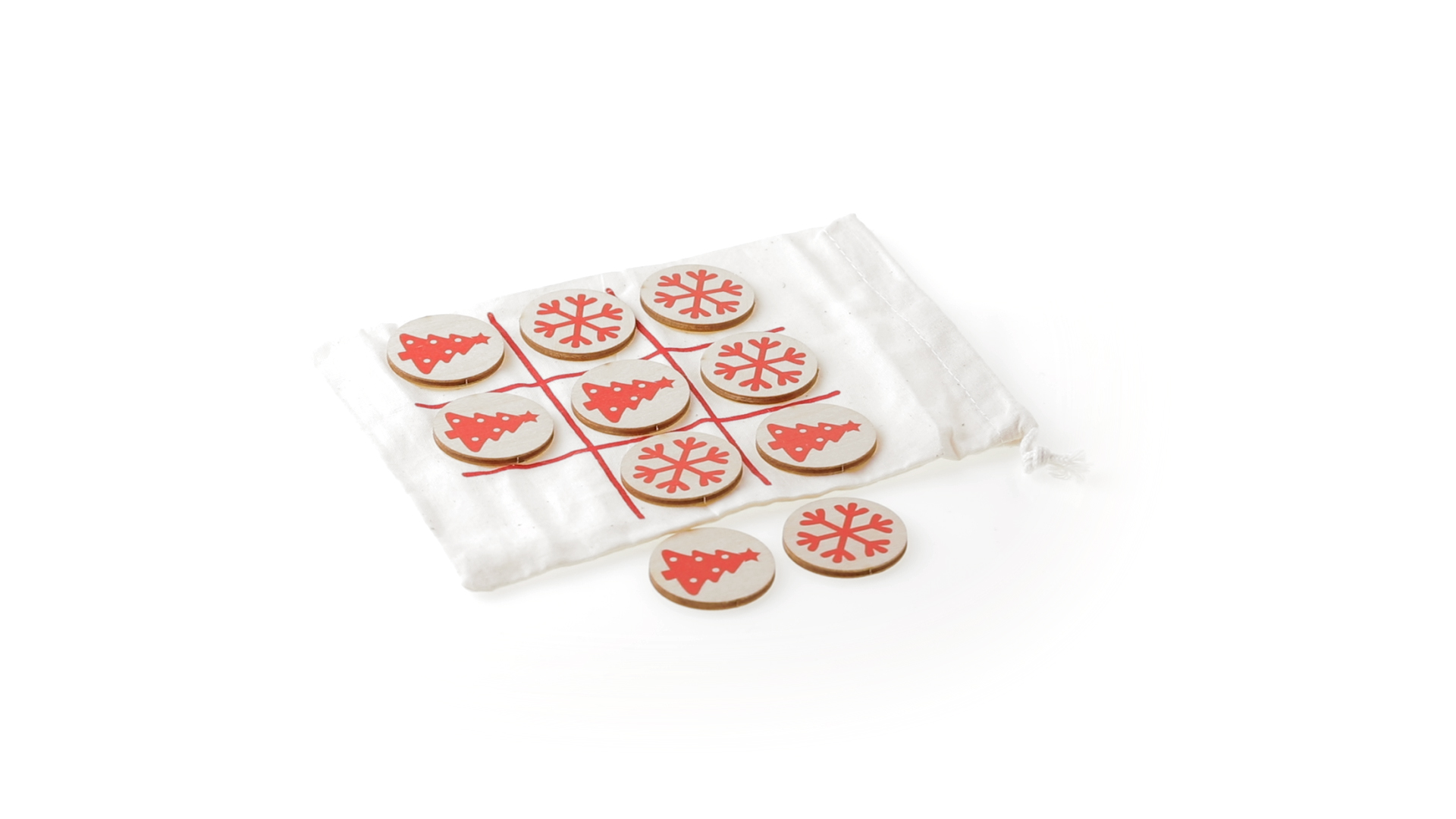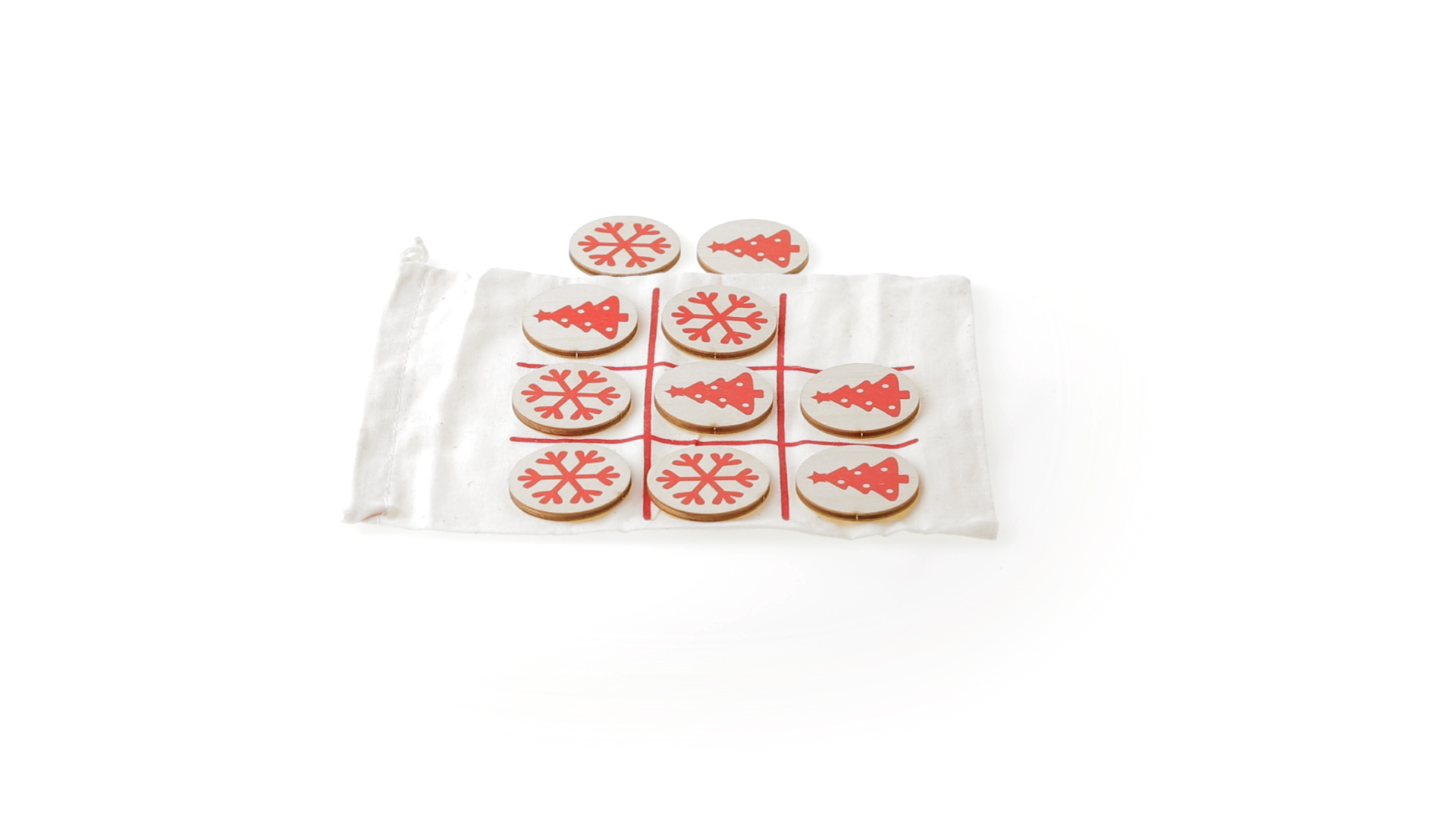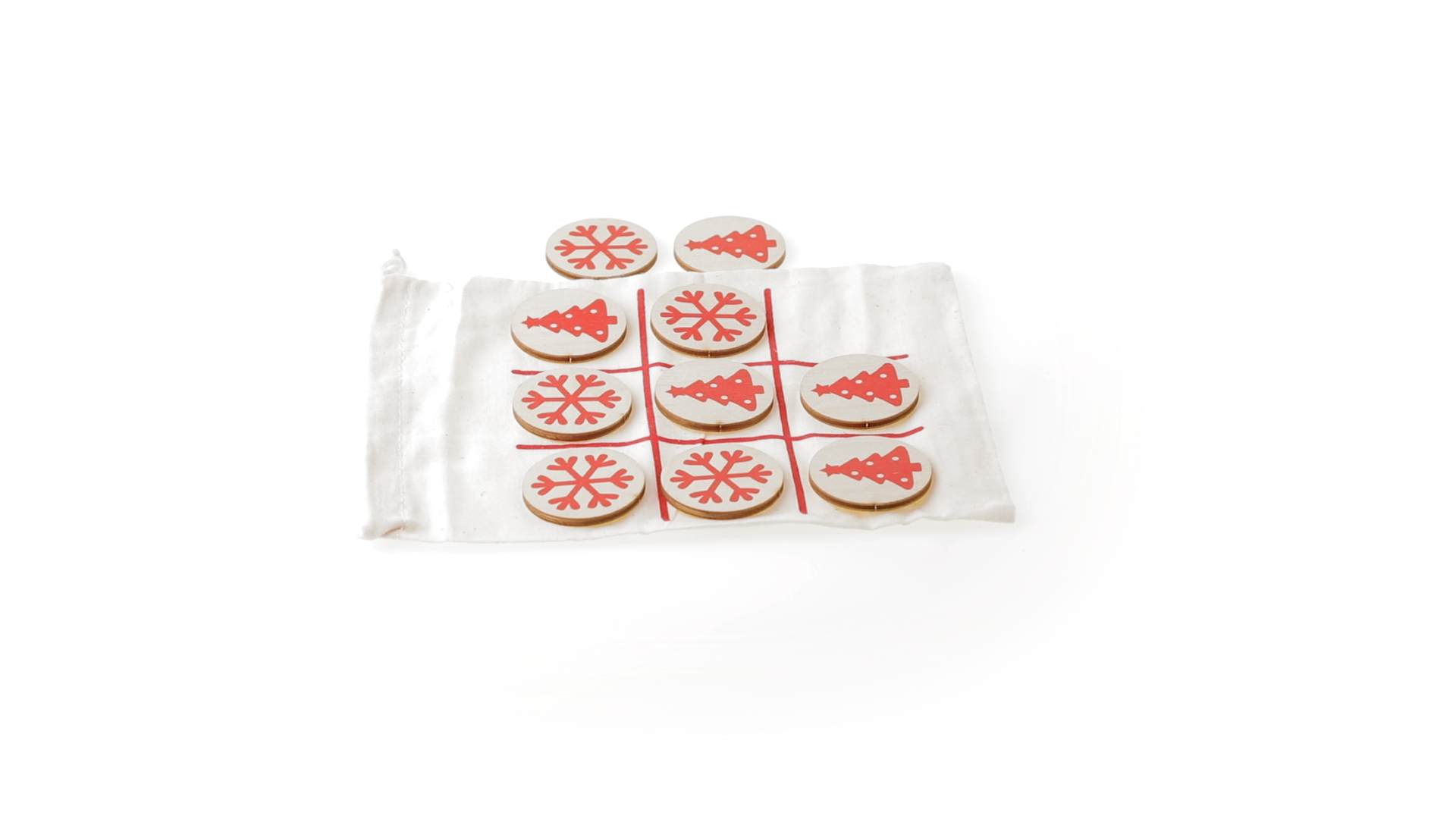 Tic-Tac-Toe-Spiel im originellen Weihnachtsdesign und aus Naturholz. Präsentiert in einem Beutel mit Kordelzug, einschliesslich 5 Schneeflocken-Spielsteine und 5 Weihnachtsbaum-Spielsteine.