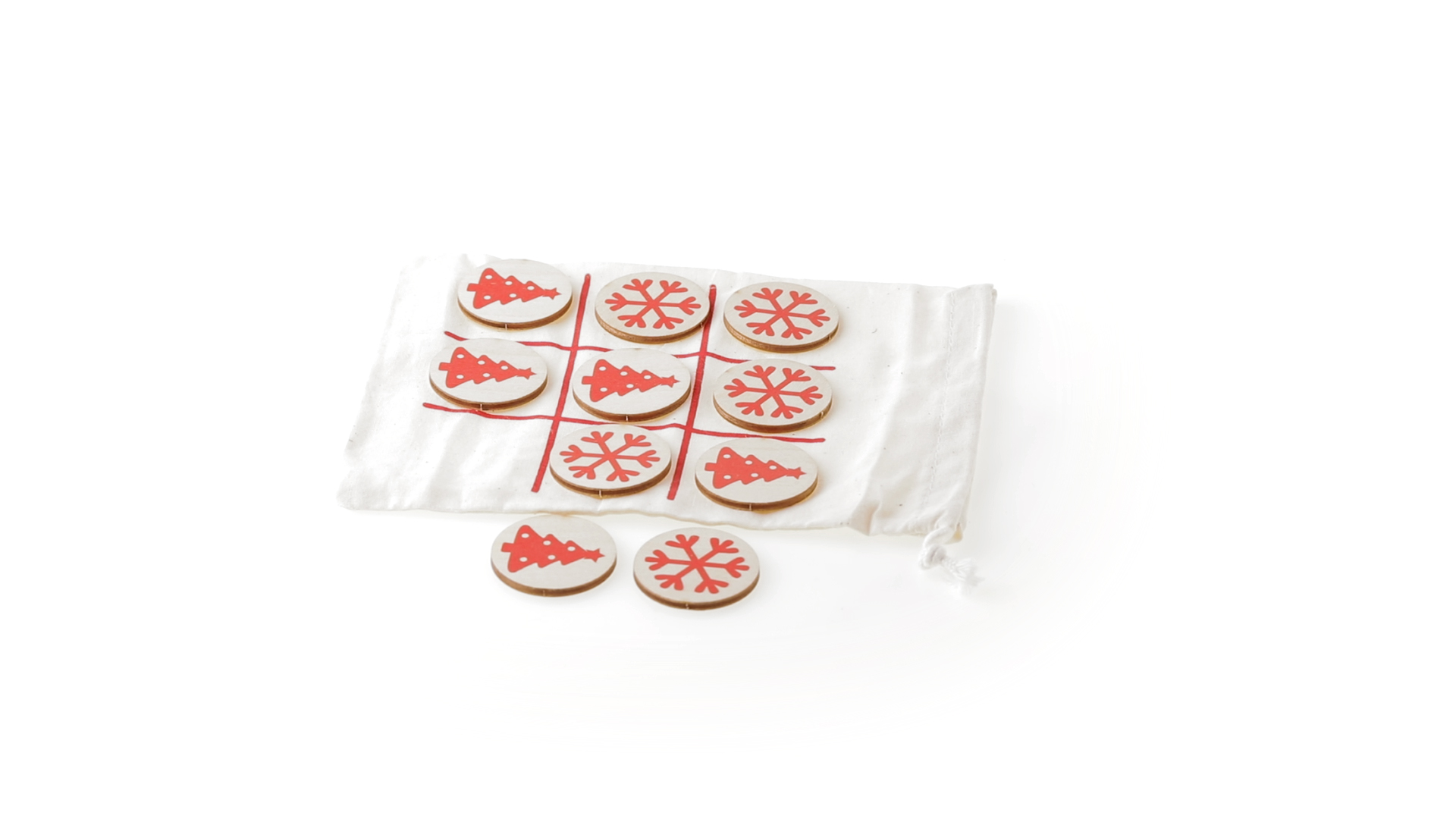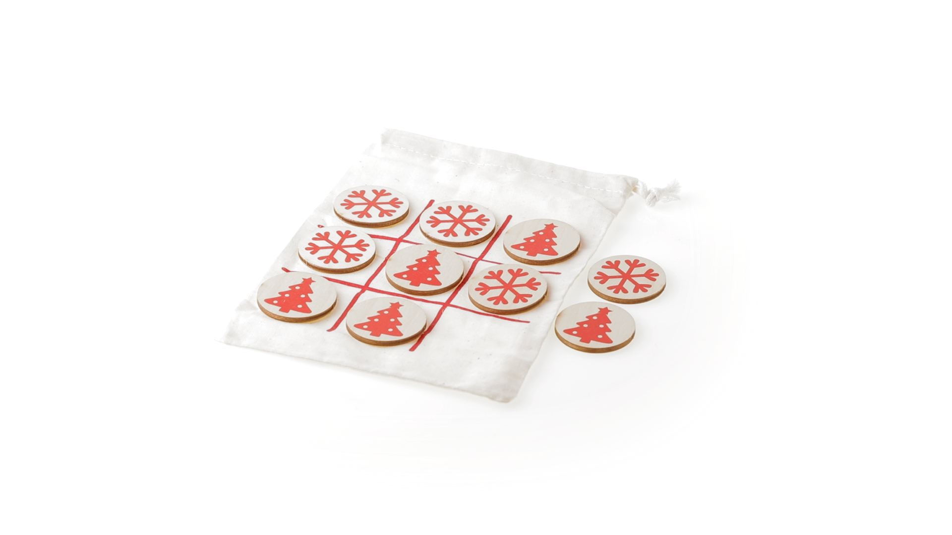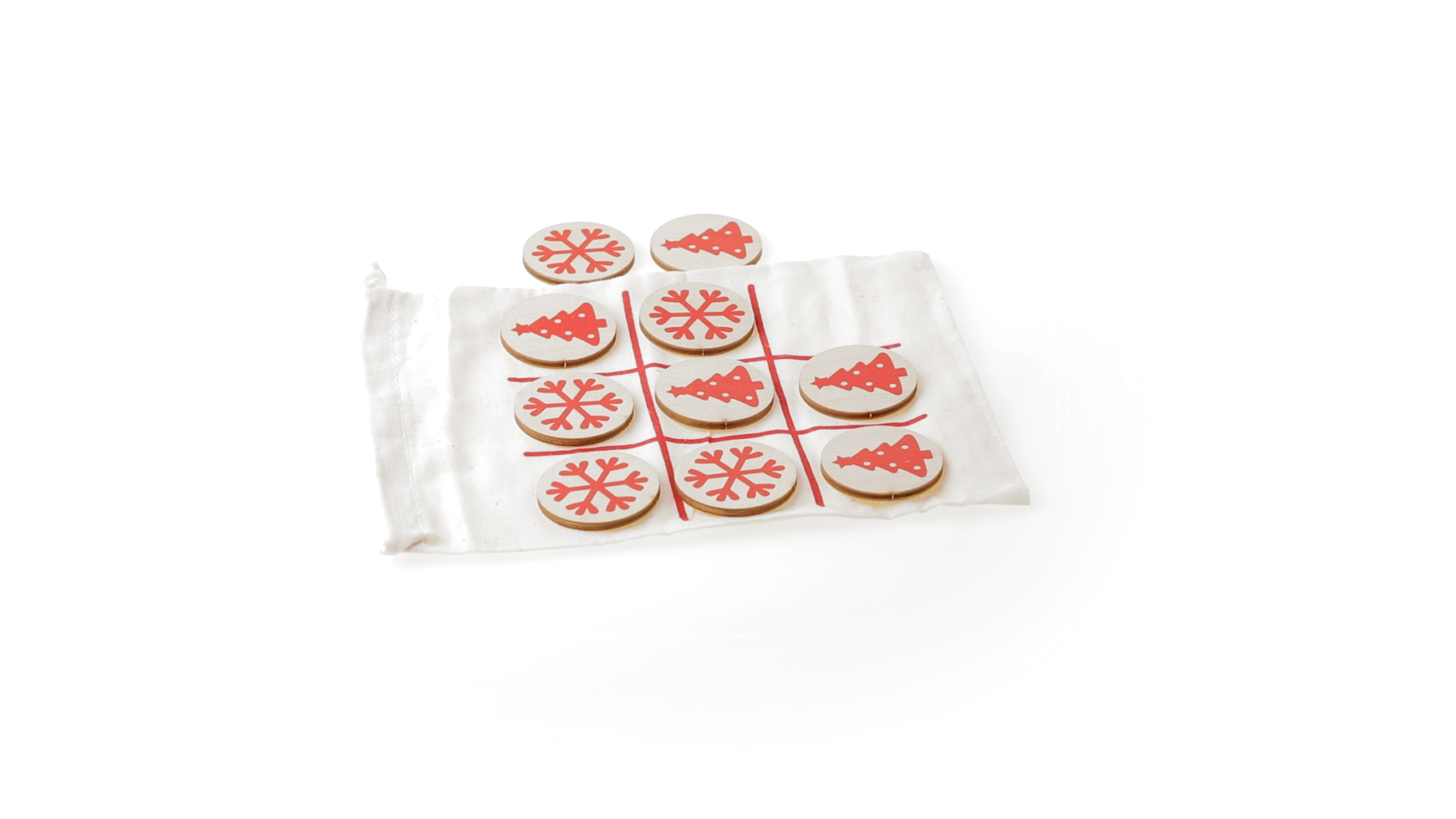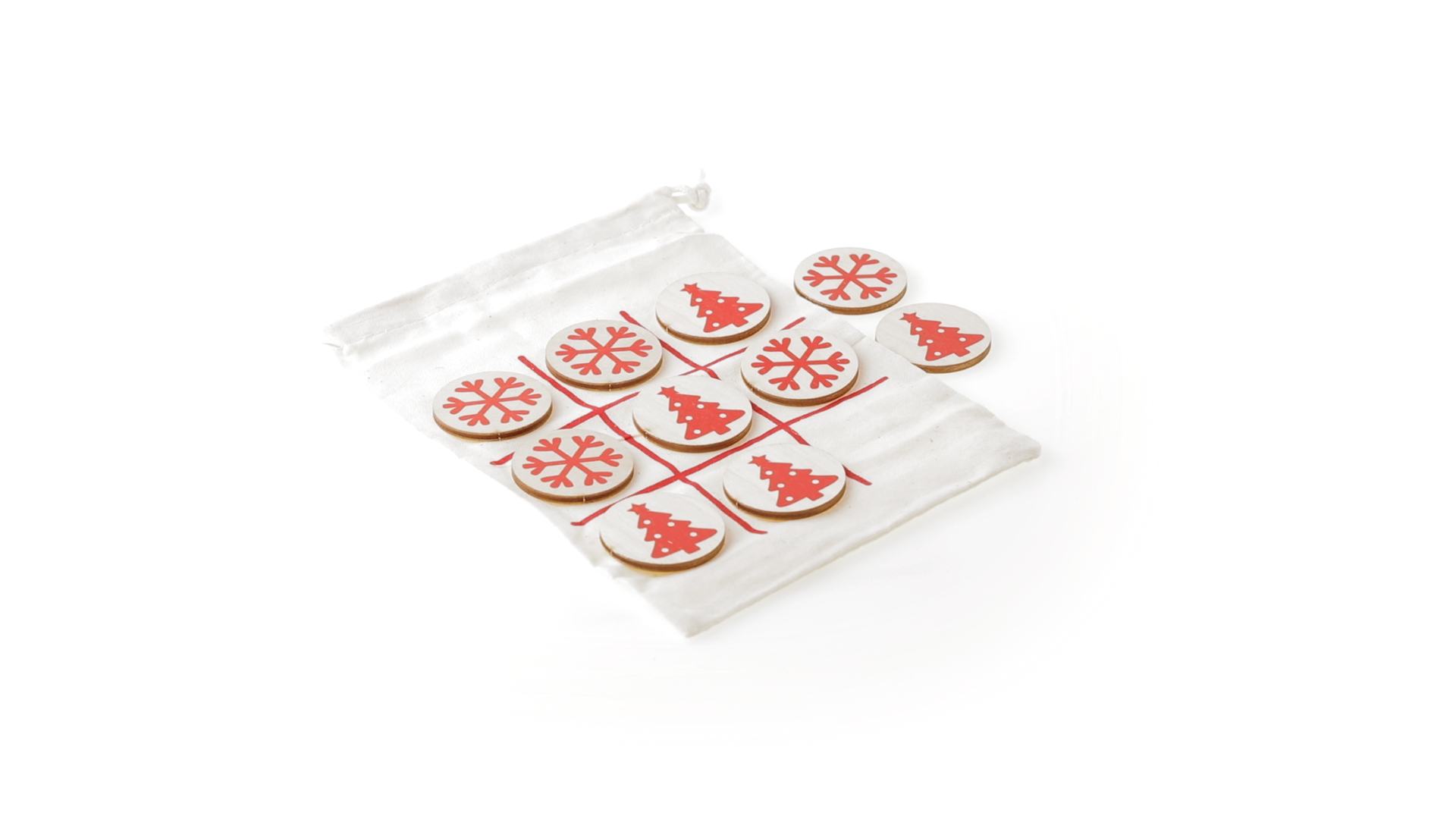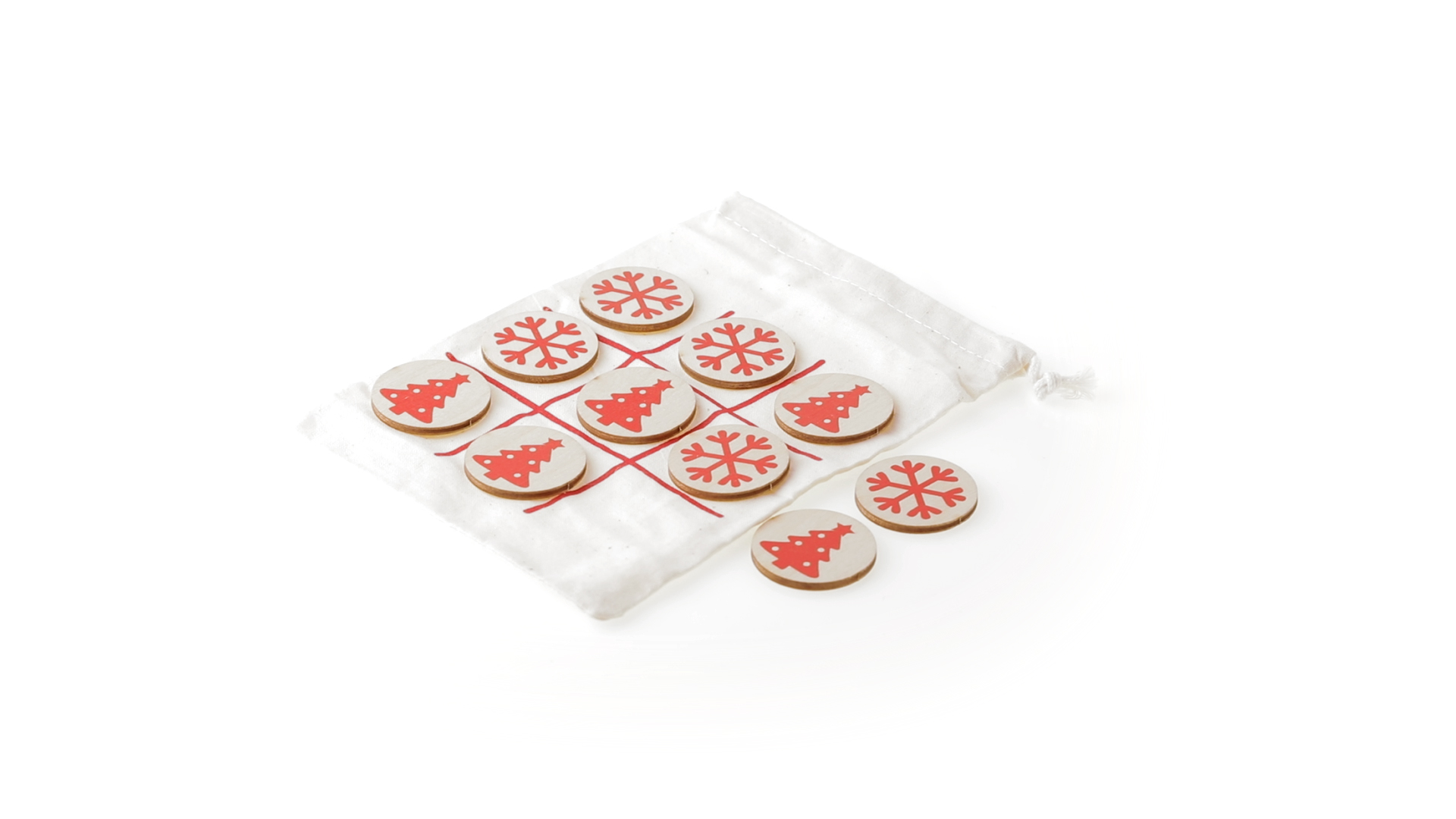 Tic-Tac-Toe-Spiel im originellen Weihnachtsdesign und aus Naturholz. Präsentiert in einem Beutel mit Kordelzug, einschliesslich 5 Schneeflocken-Spielsteine und 5 Weihnachtsbaum-Spielsteine.