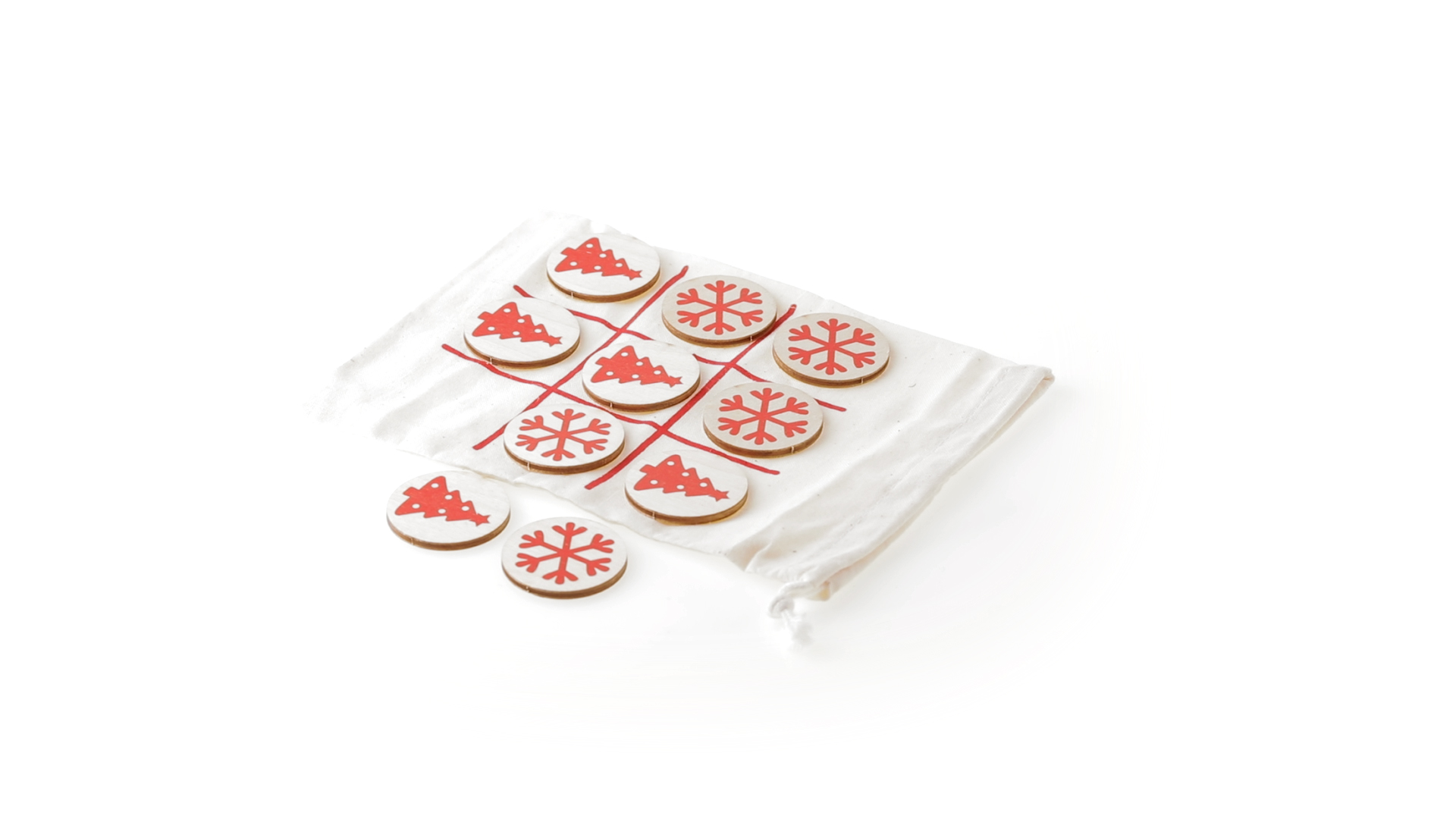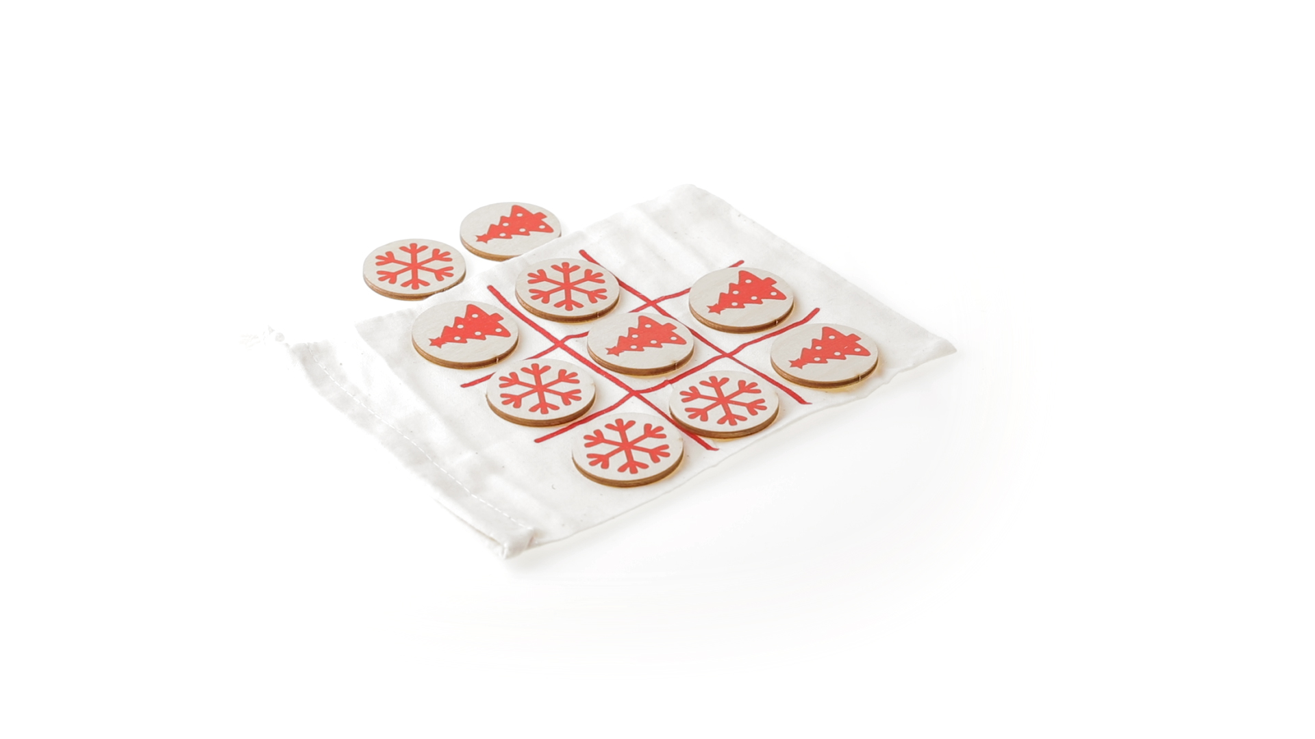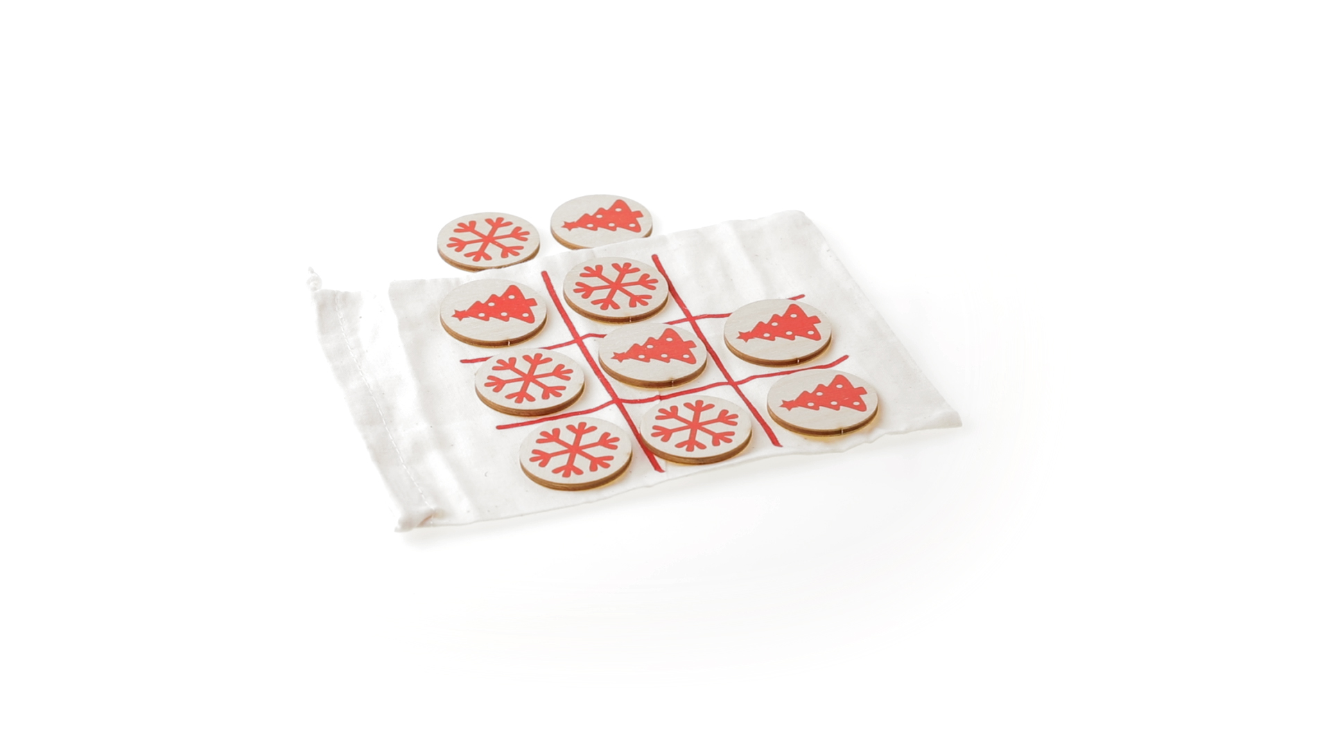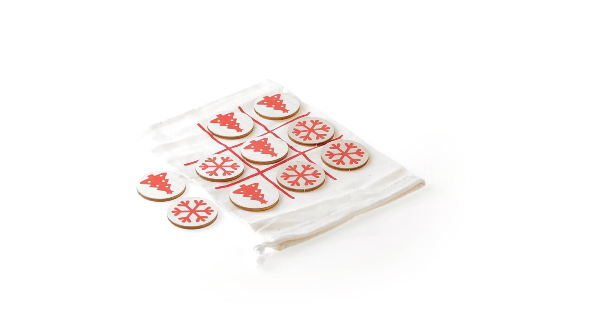 Tic-Tac-Toe-Spiel im originellen Weihnachtsdesign und aus Naturholz. Präsentiert in einem Beutel mit Kordelzug, einschliesslich 5 Schneeflocken-Spielsteine und 5 Weihnachtsbaum-Spielsteine.