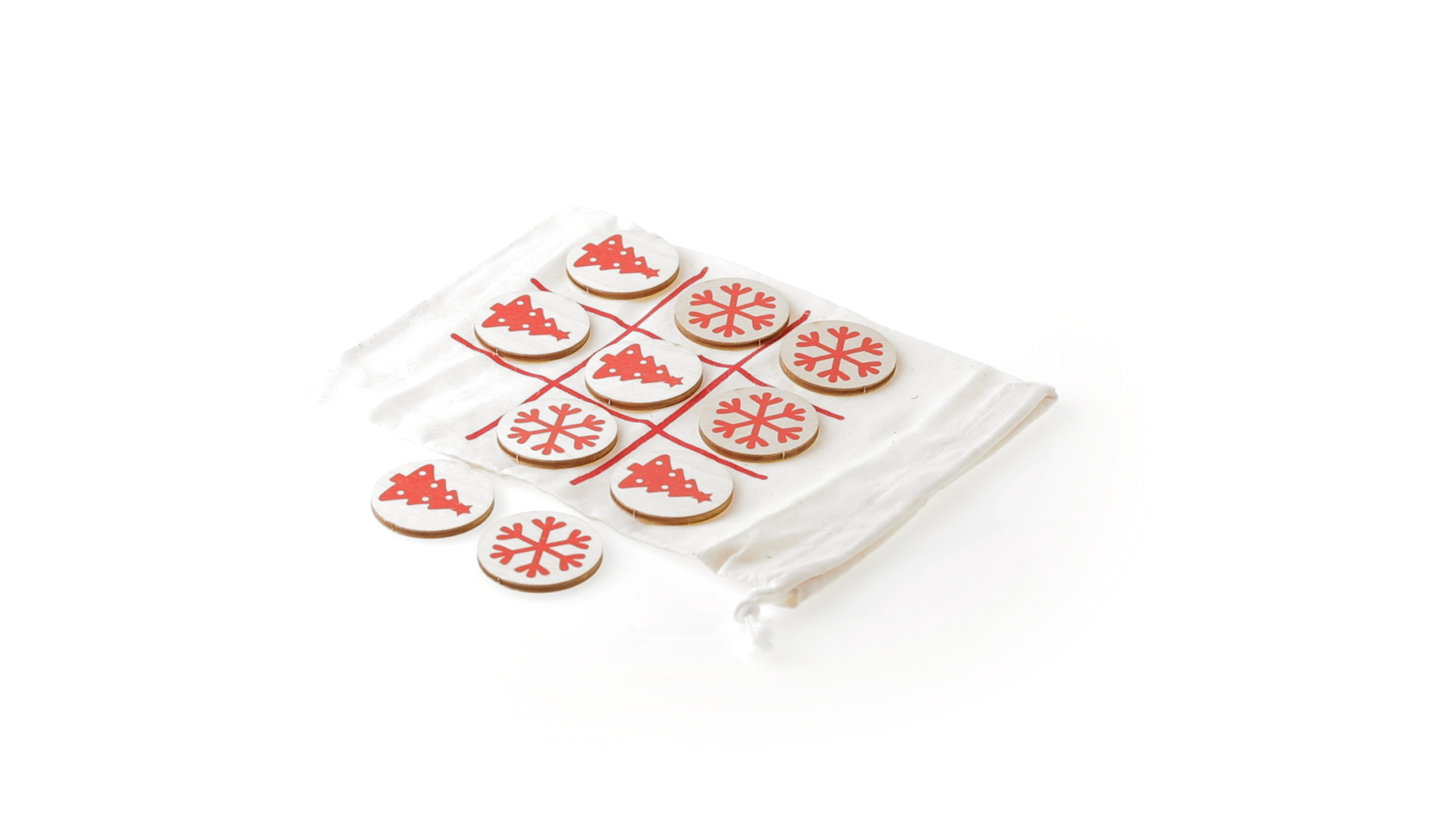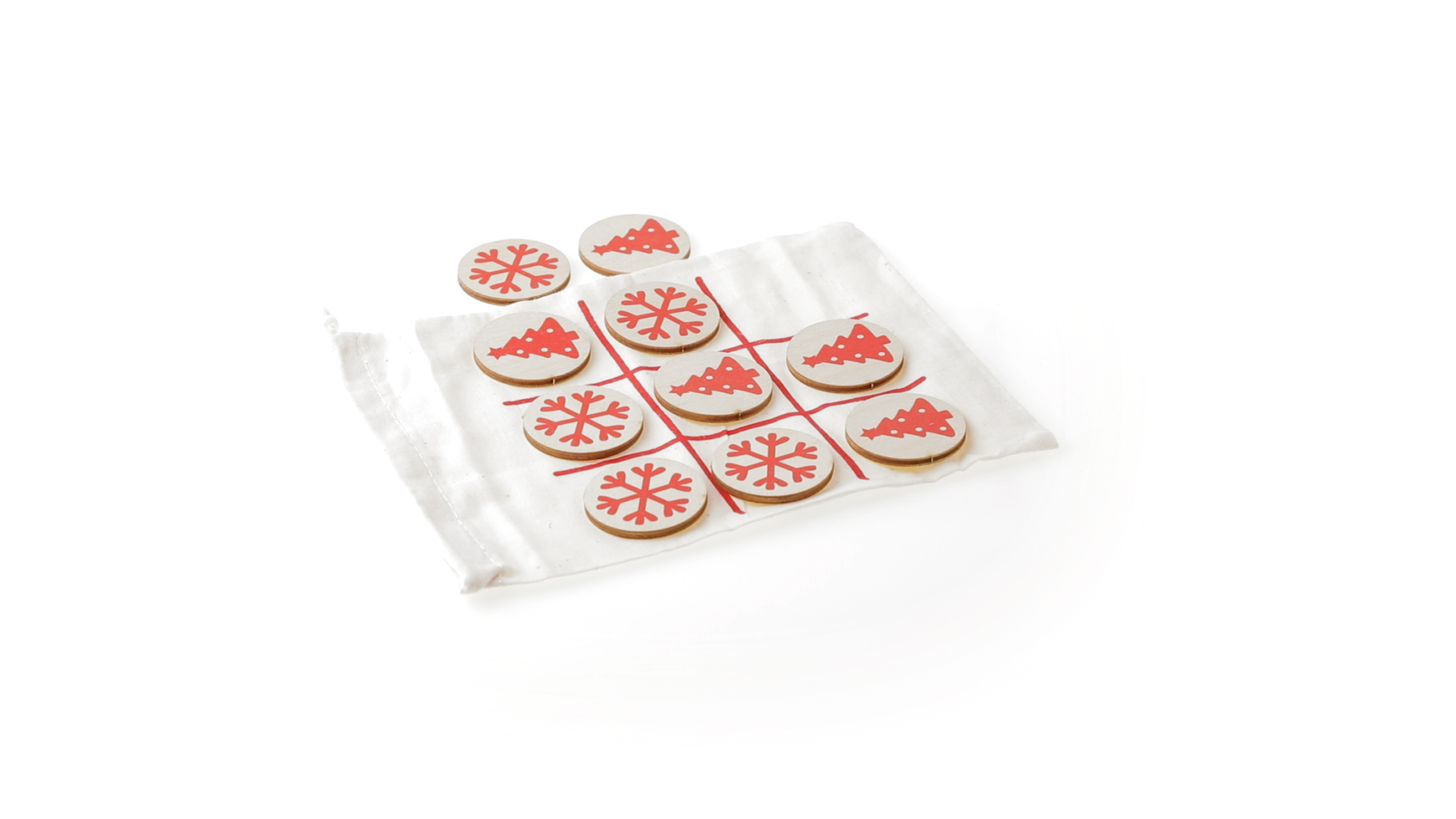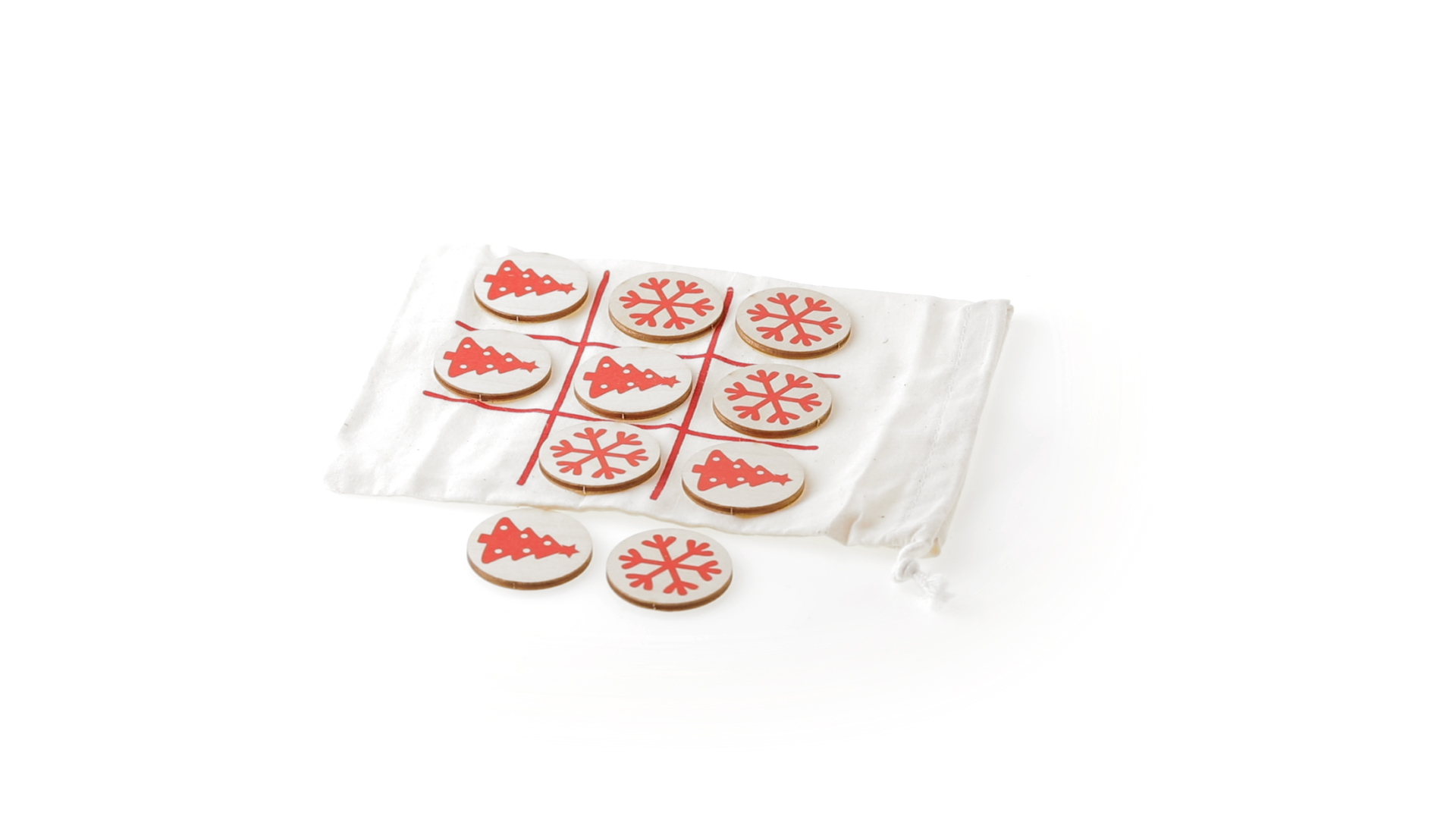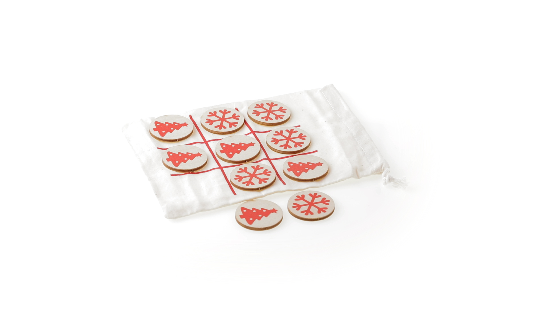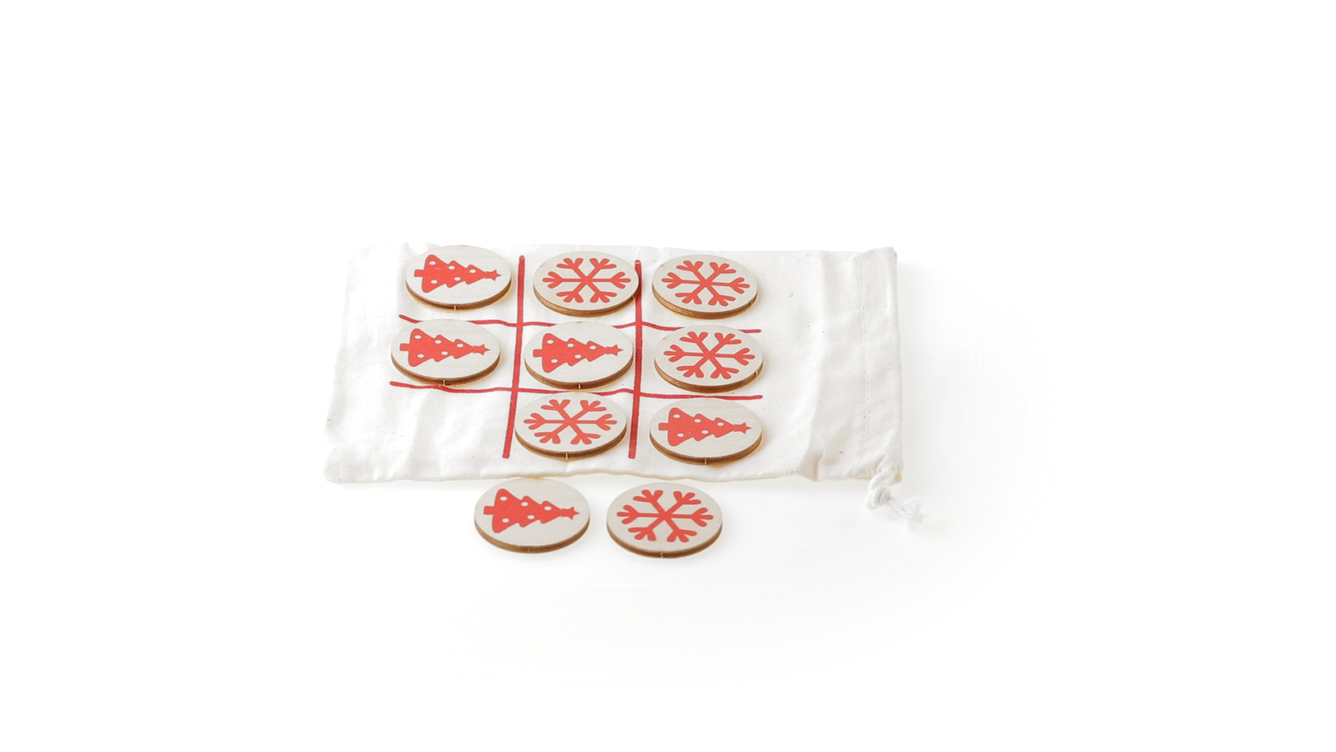Tic-Tac-Toe-Spiel im originellen Weihnachtsdesign und aus Naturholz. Präsentiert in einem Beutel mit Kordelzug, einschliesslich 5 Schneeflocken-Spielsteine und 5 Weihnachtsbaum-Spielsteine.