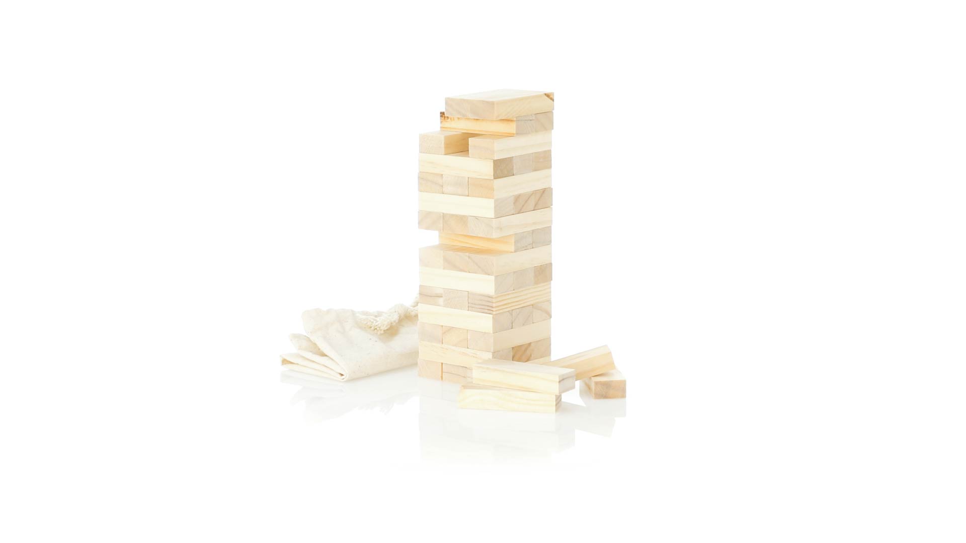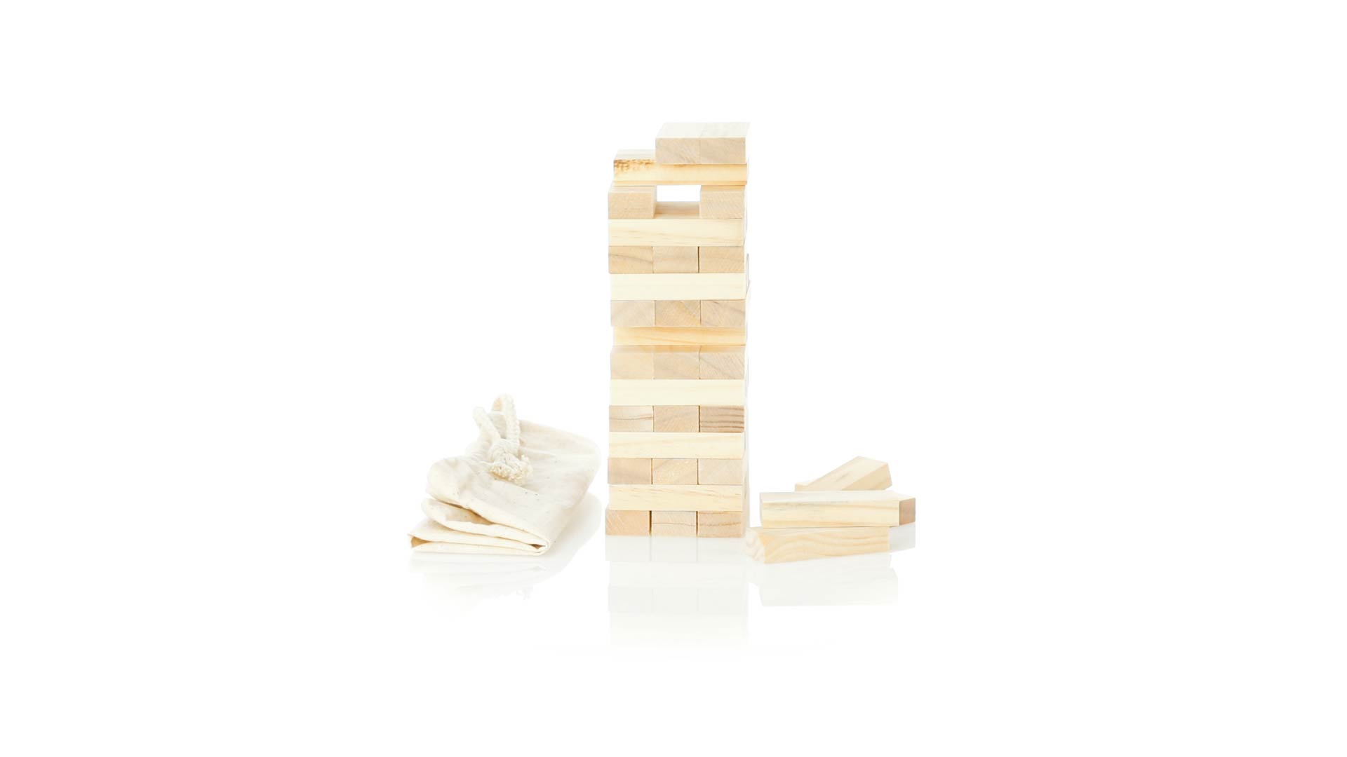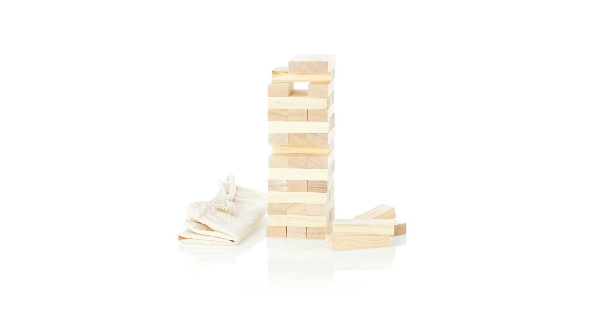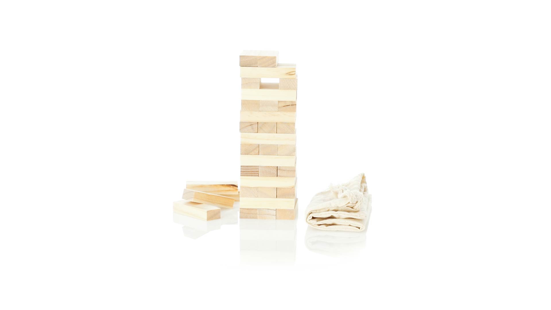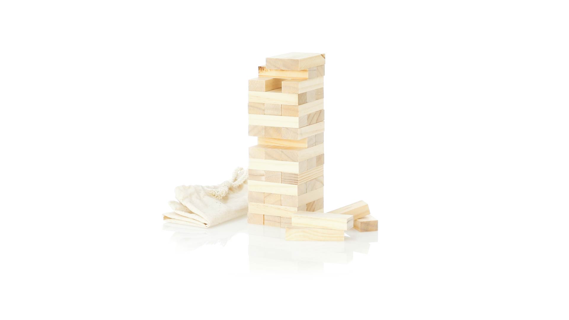 Geschicklichkeitsspiel für gerissene Spieler. Inklusive 45 Holzstücken, inklusive einem haltbaren Baumwollbeutel mit Schnurverschluss.