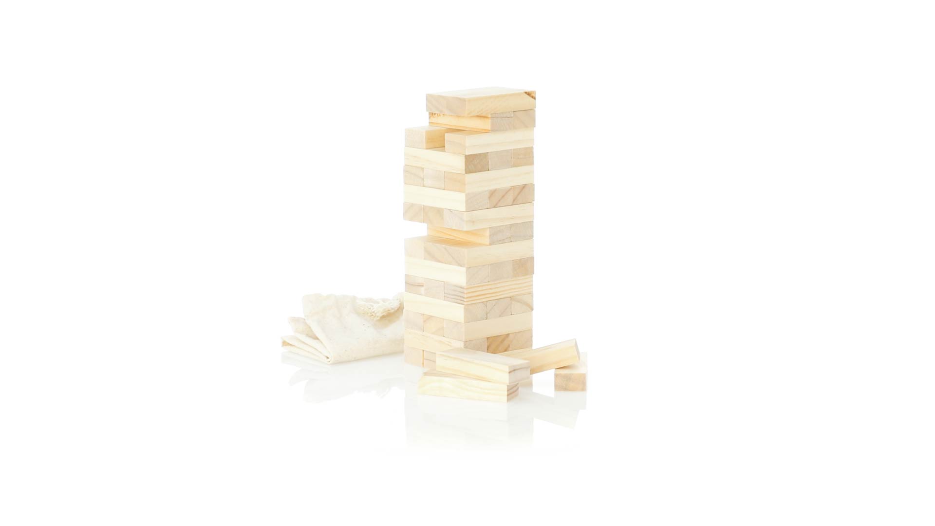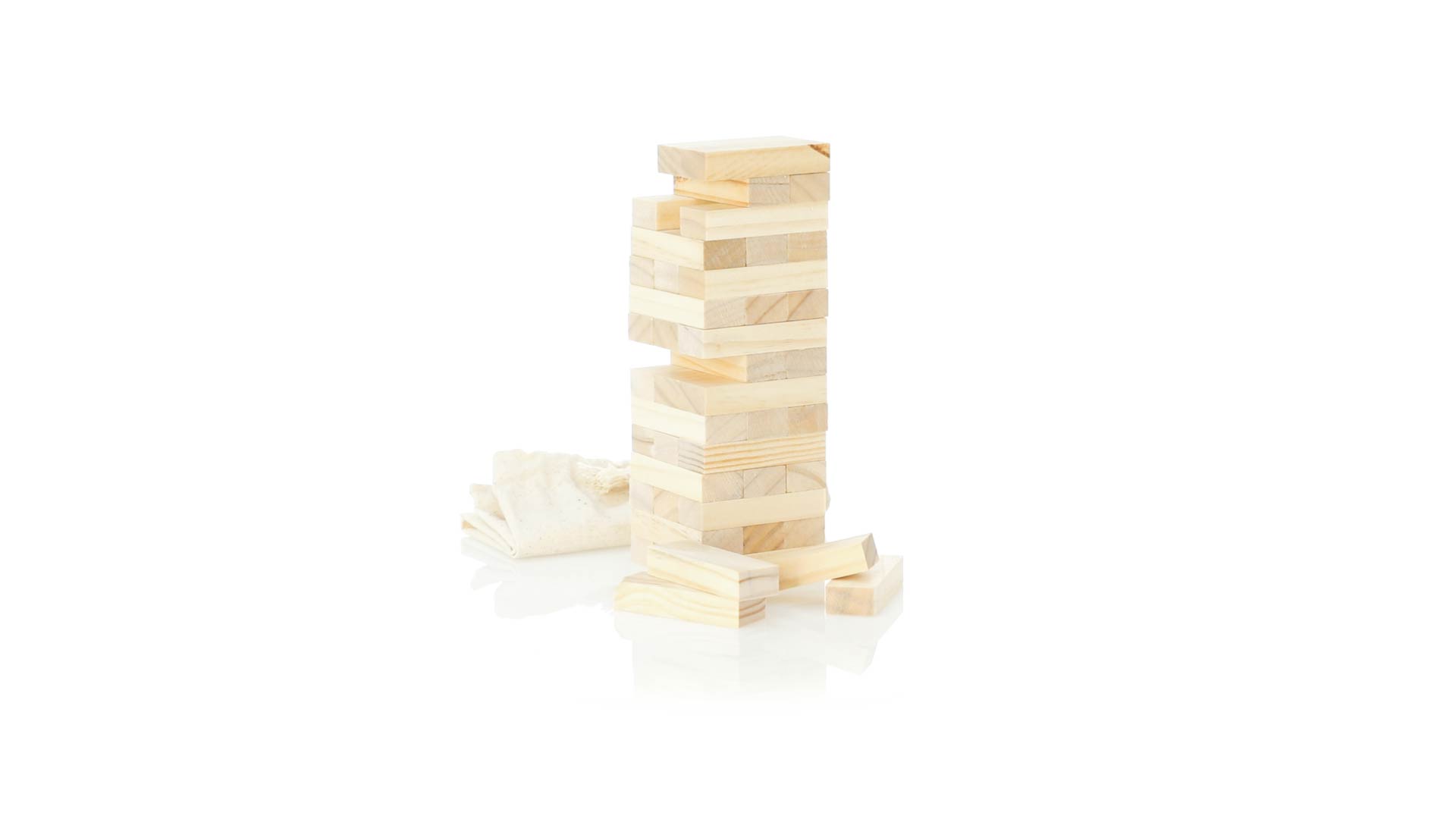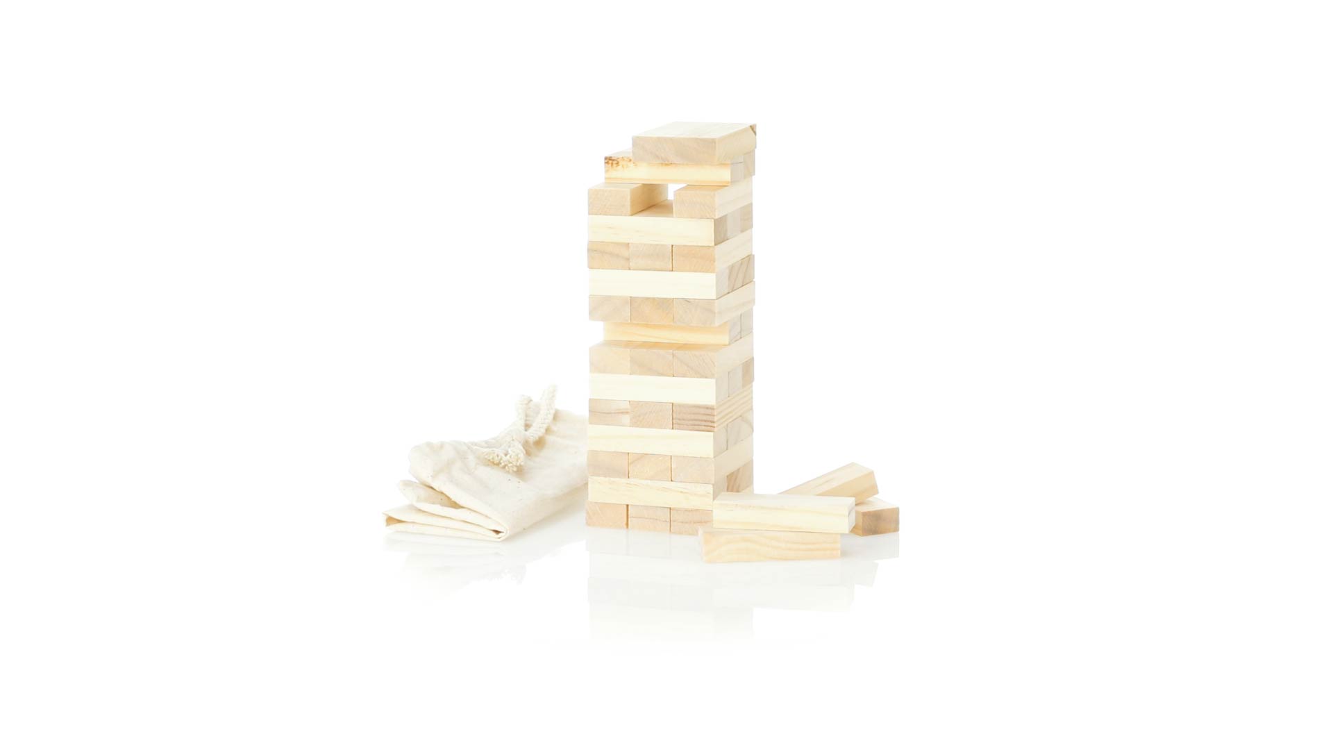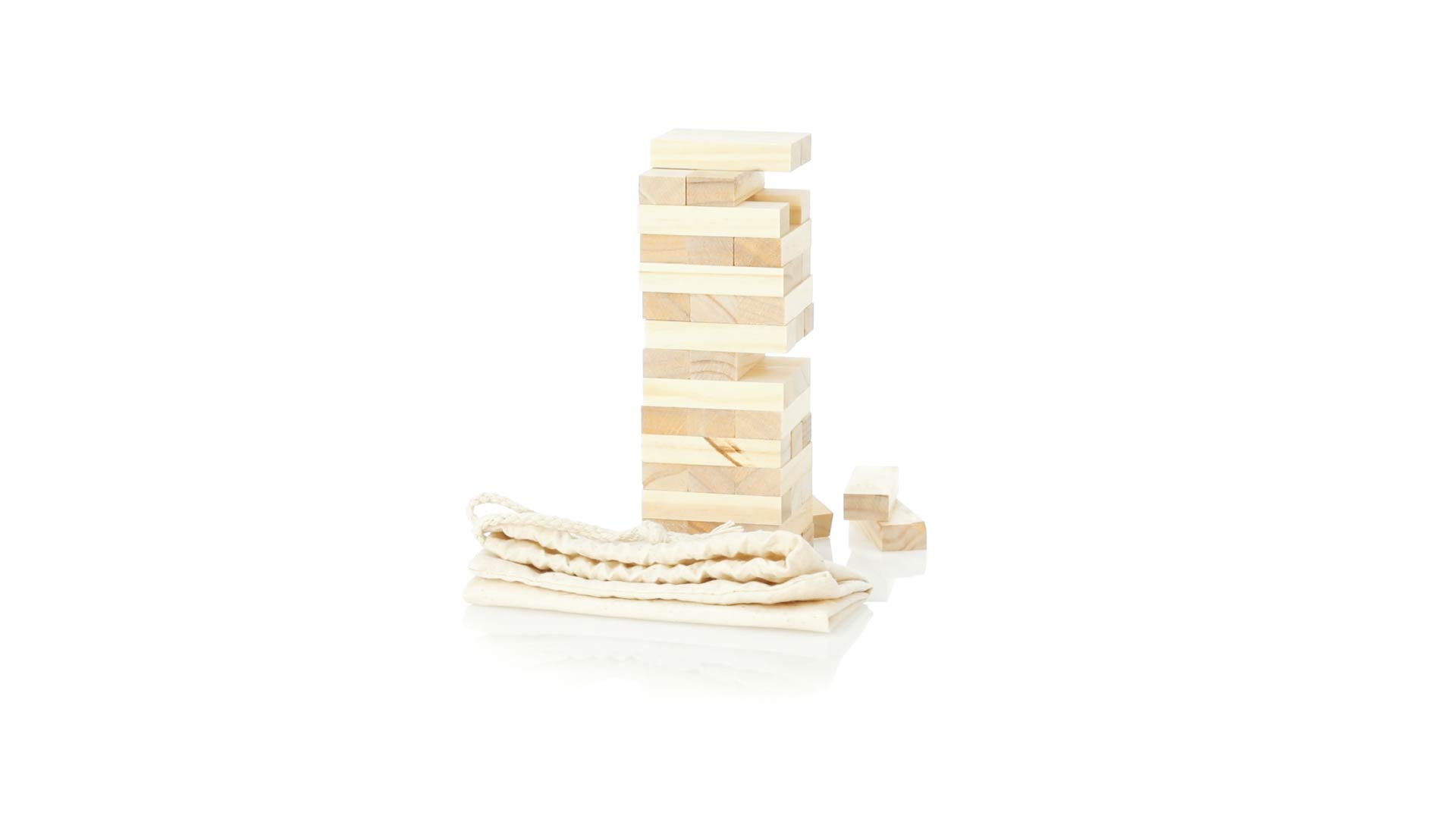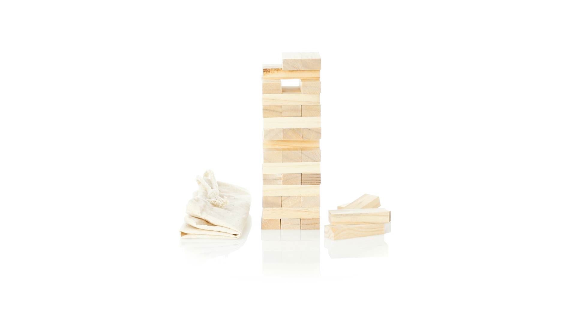 Geschicklichkeitsspiel für gerissene Spieler. Inklusive 45 Holzstücken, inklusive einem haltbaren Baumwollbeutel mit Schnurverschluss.