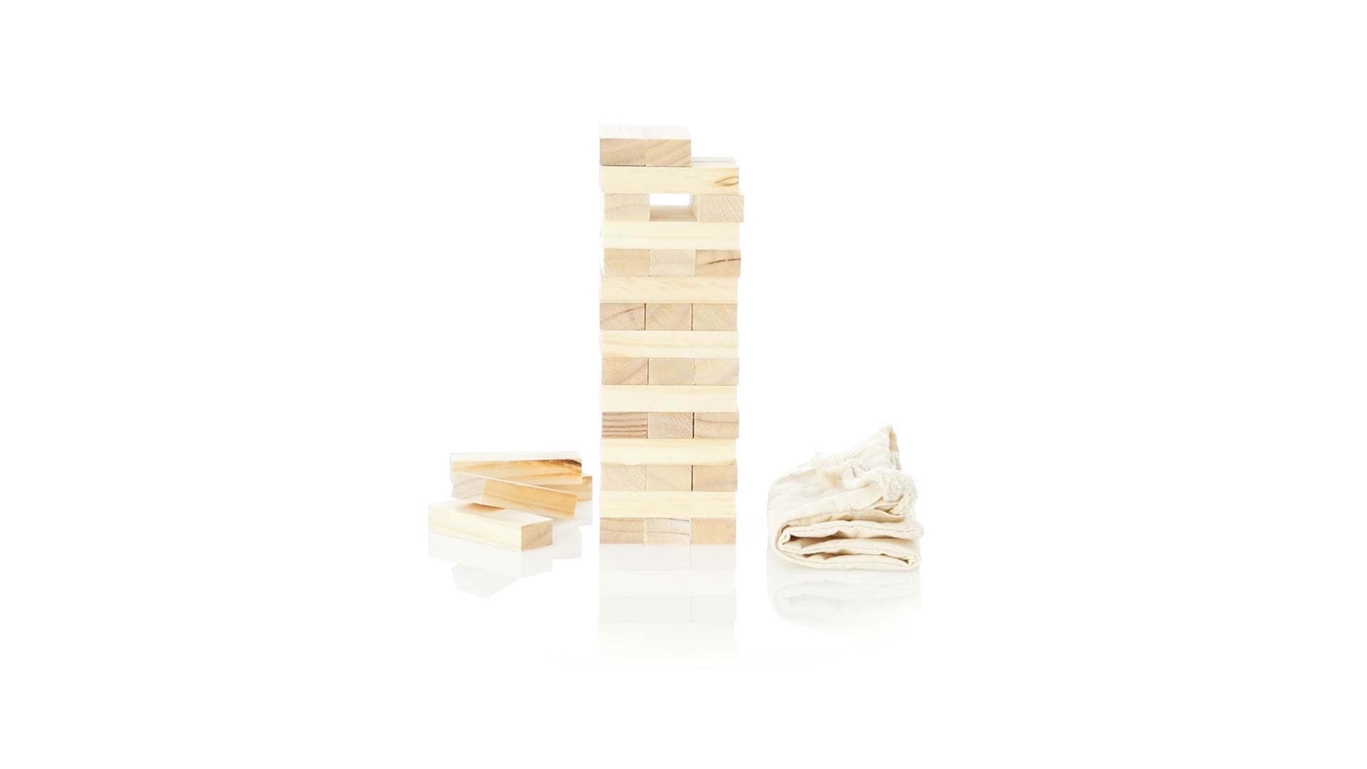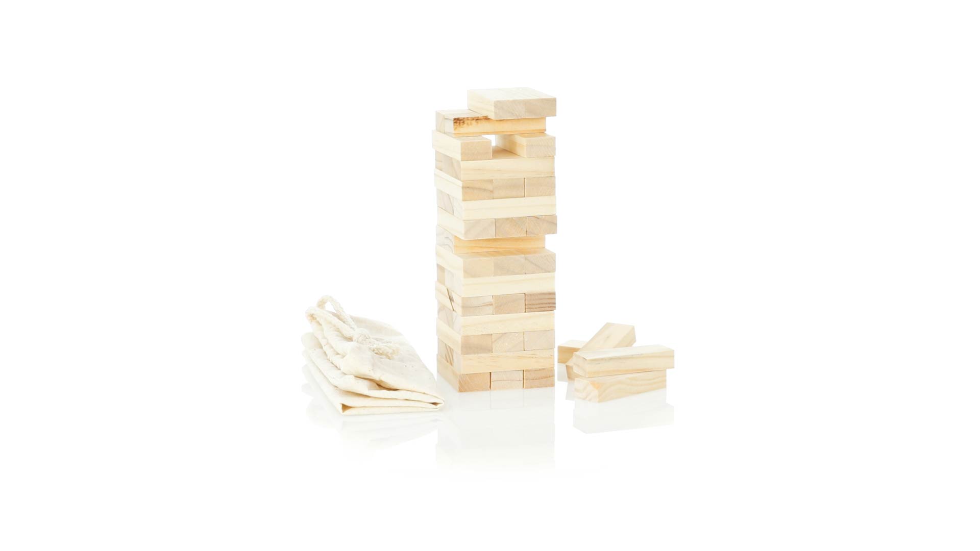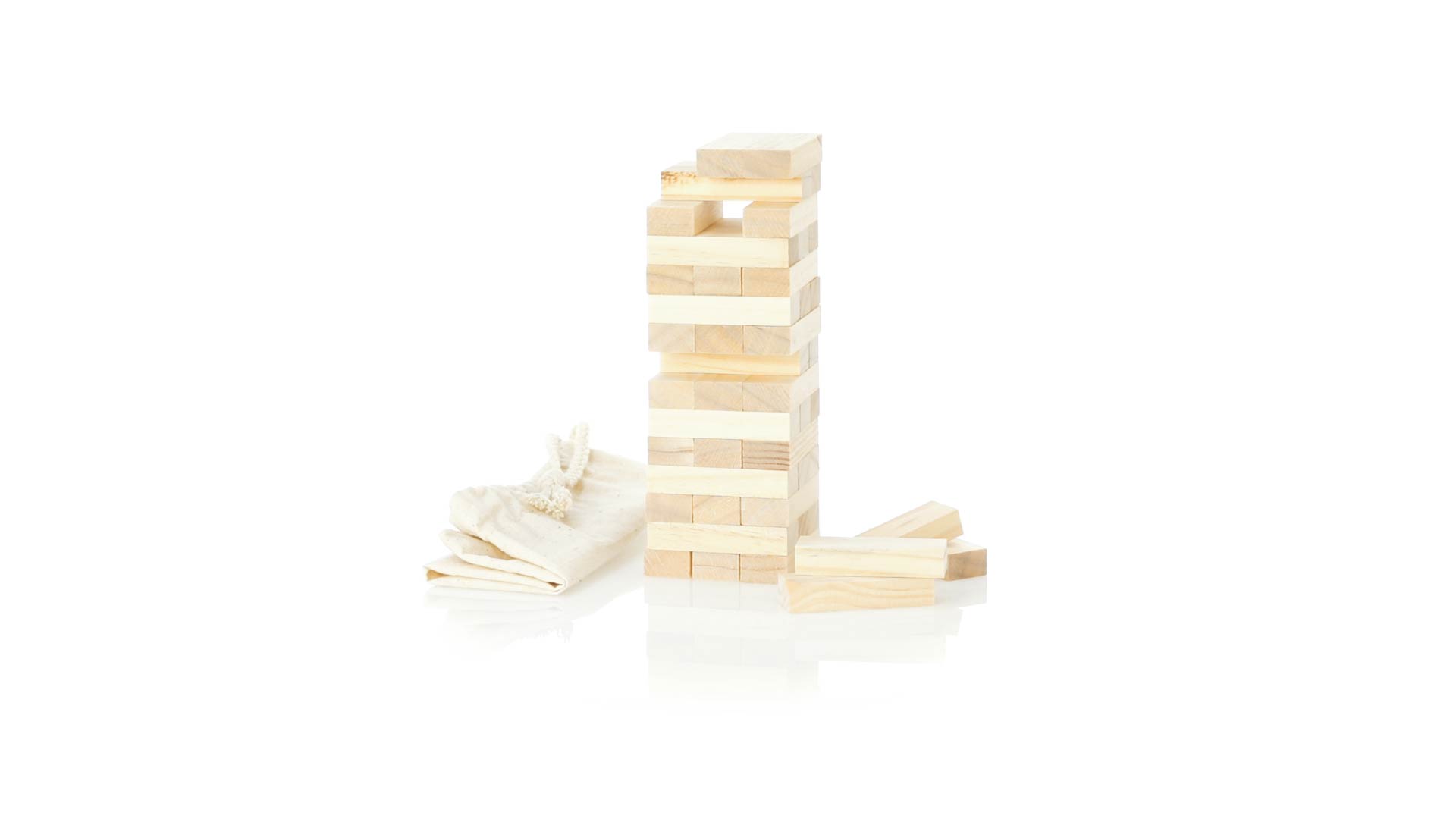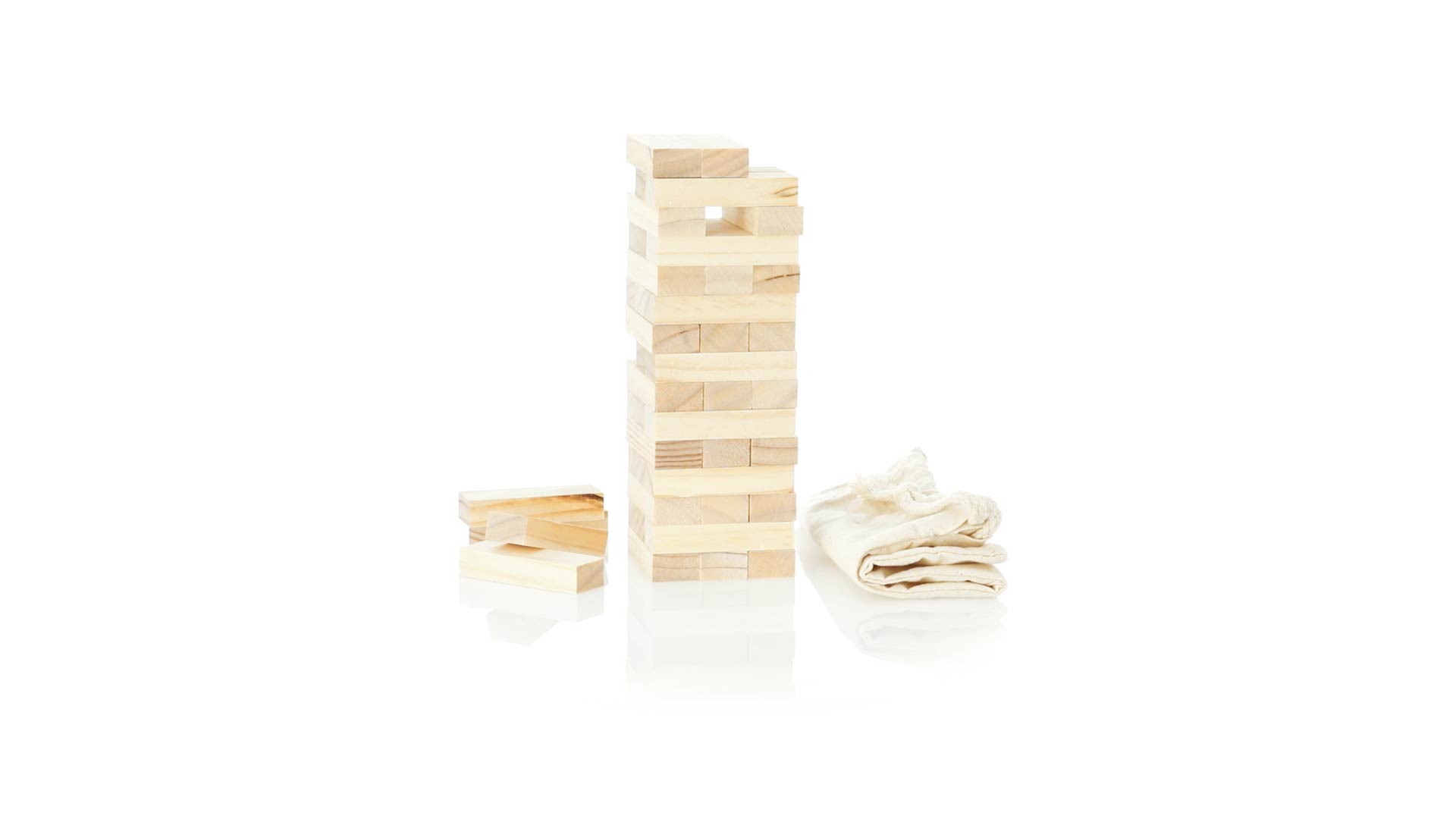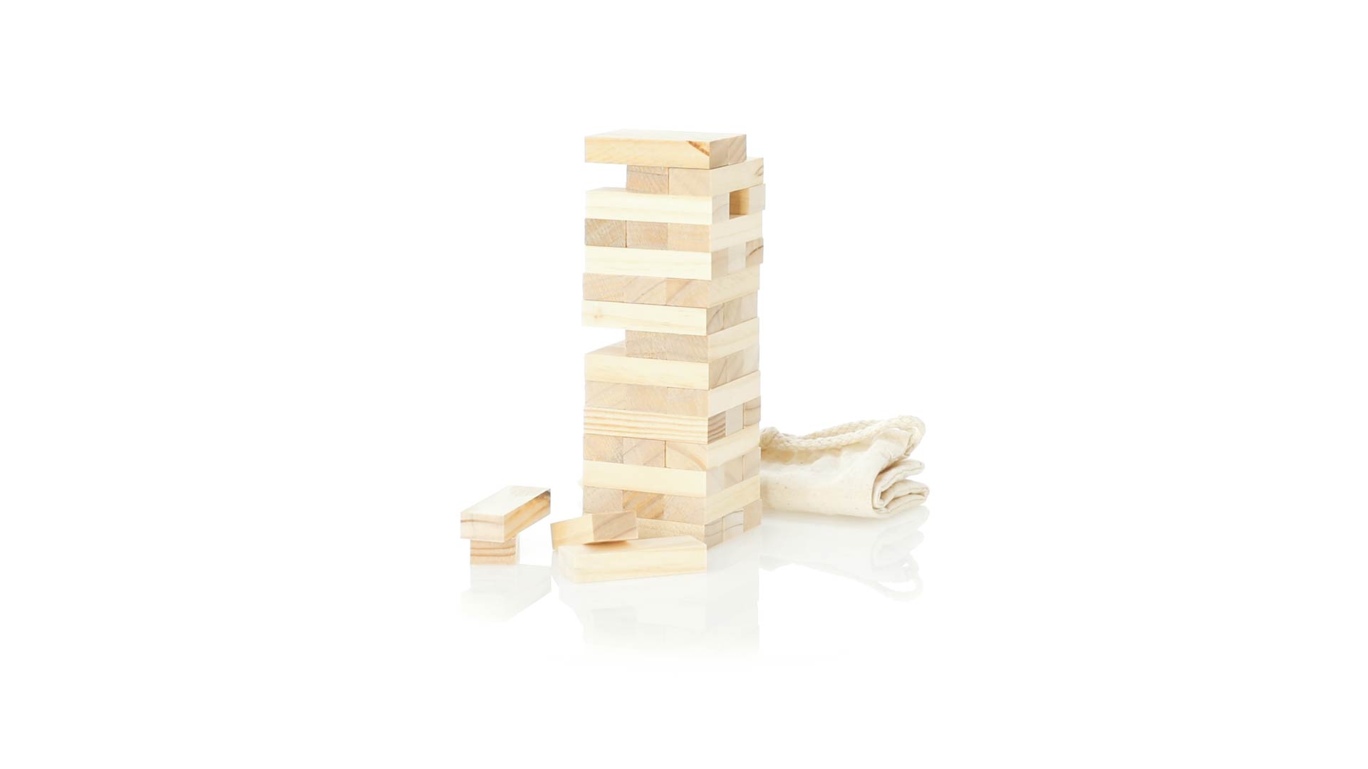 Geschicklichkeitsspiel für gerissene Spieler. Inklusive 45 Holzstücken, inklusive einem haltbaren Baumwollbeutel mit Schnurverschluss.