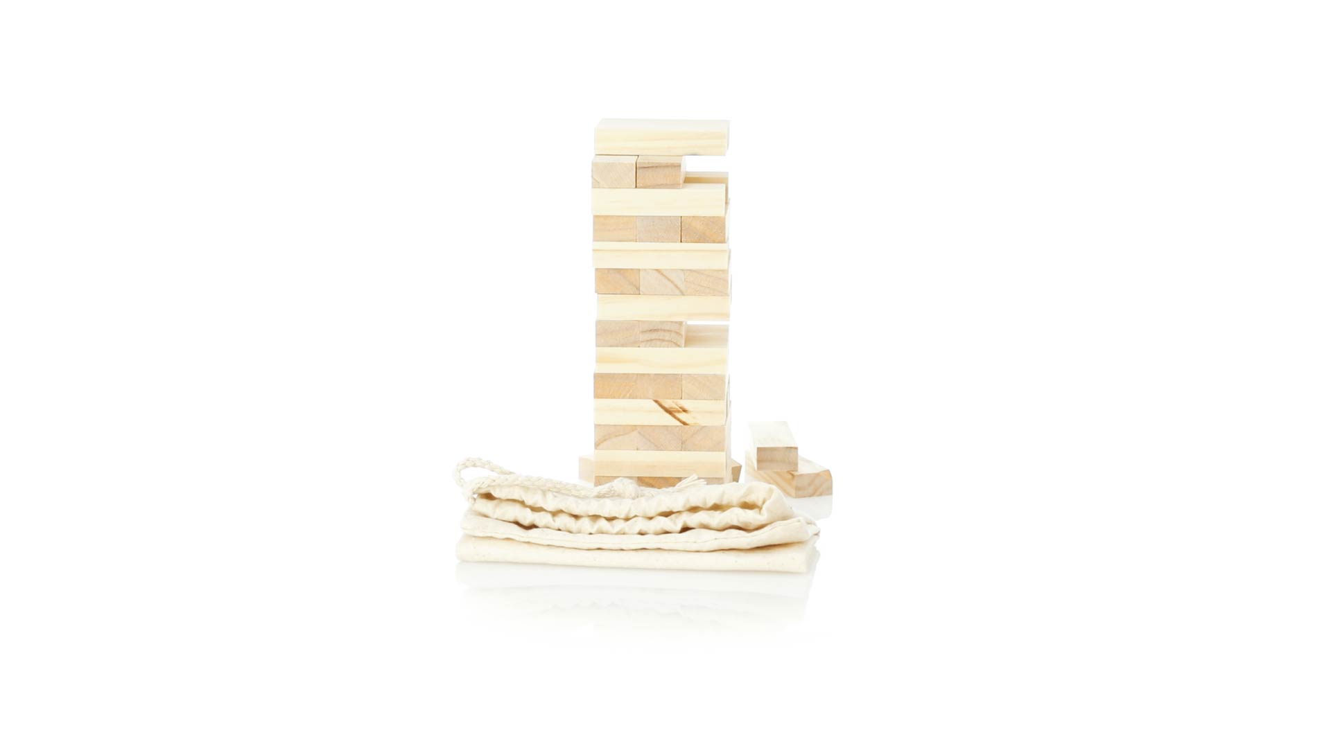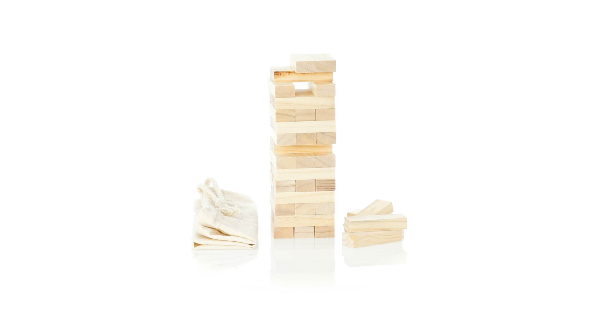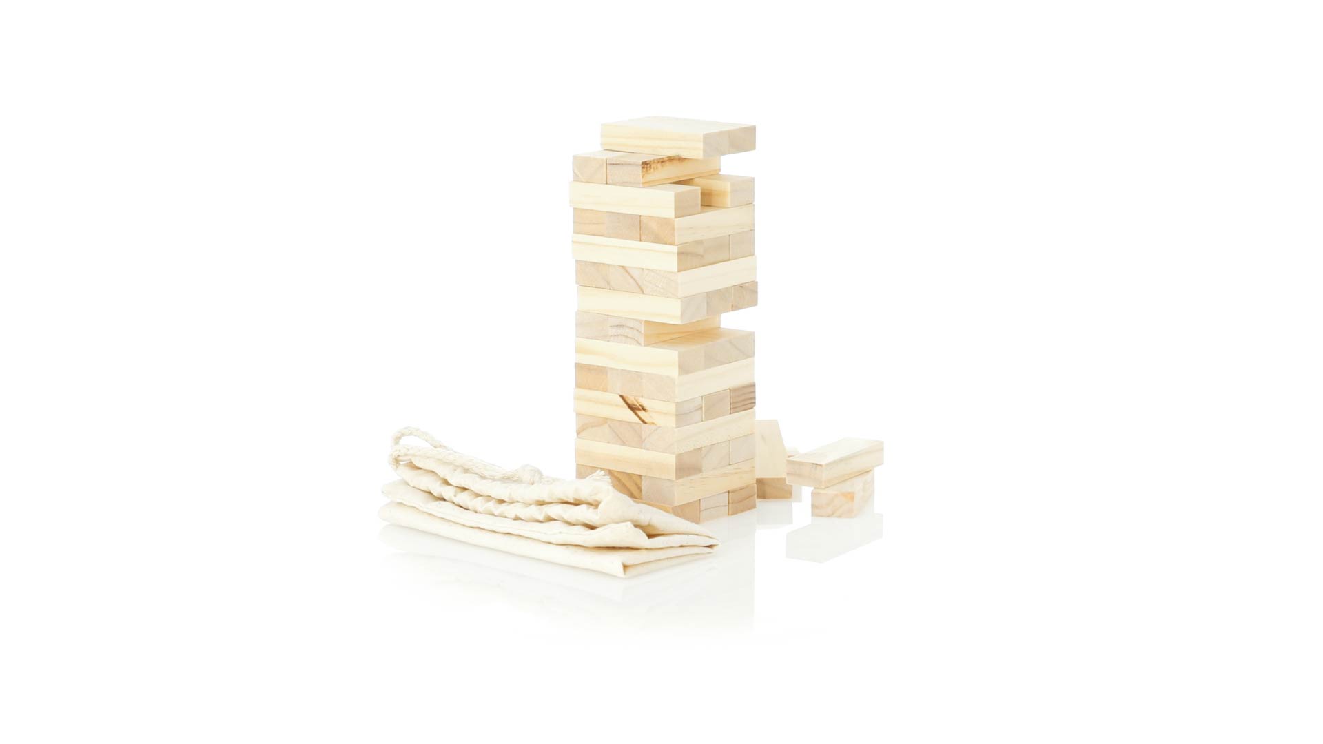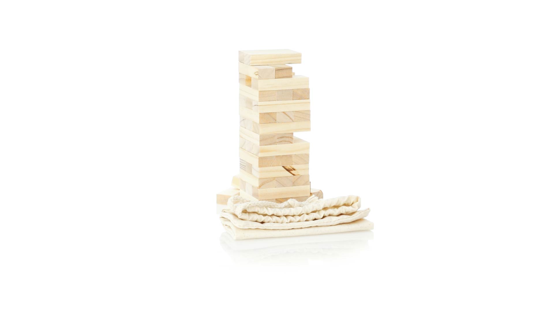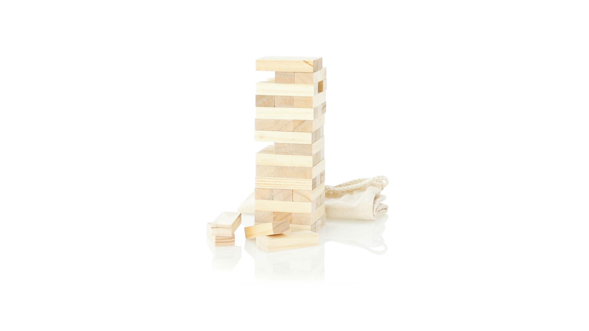 Geschicklichkeitsspiel für gerissene Spieler. Inklusive 45 Holzstücken, inklusive einem haltbaren Baumwollbeutel mit Schnurverschluss.