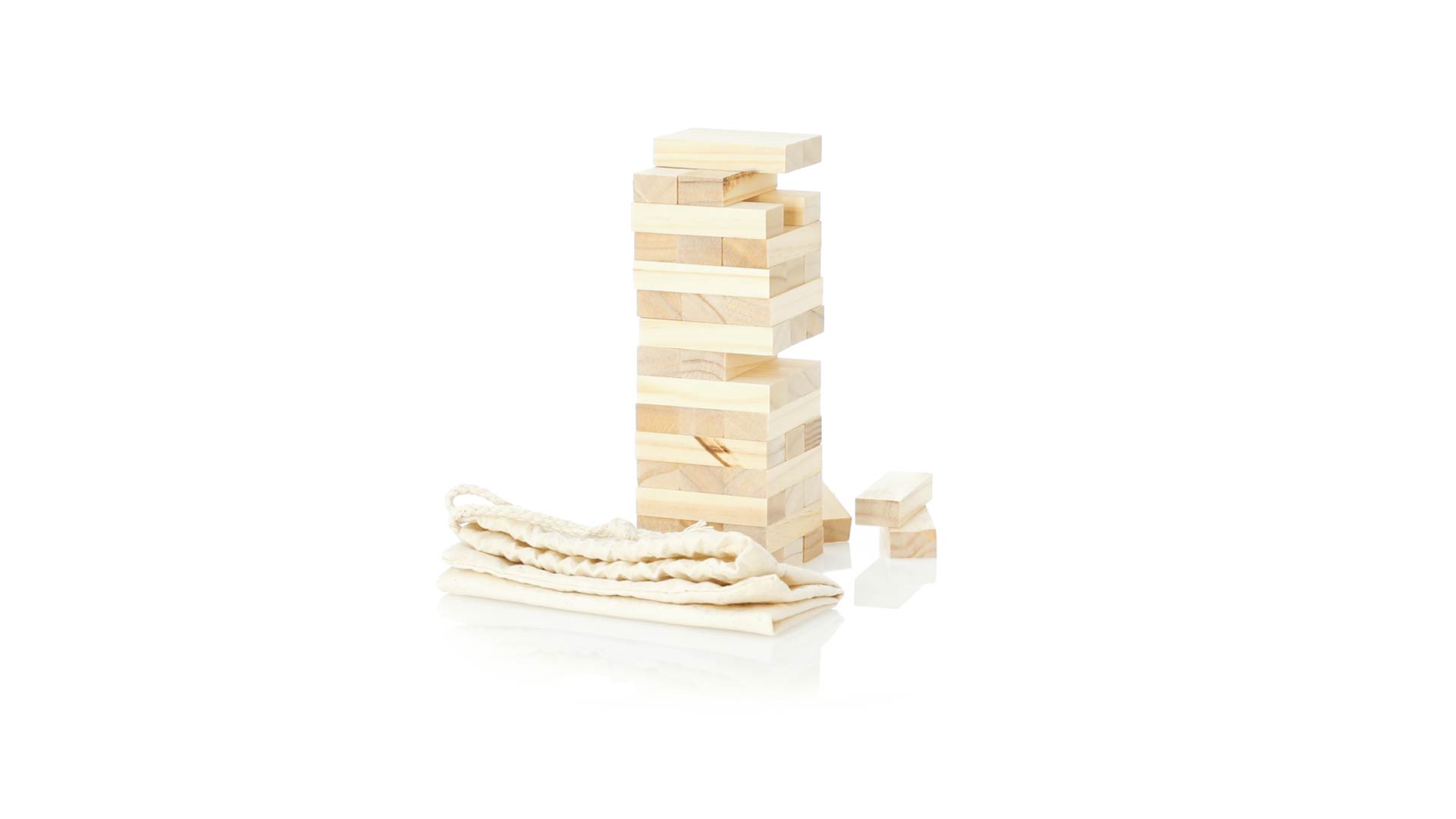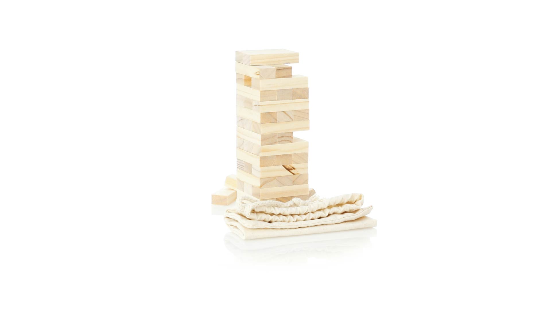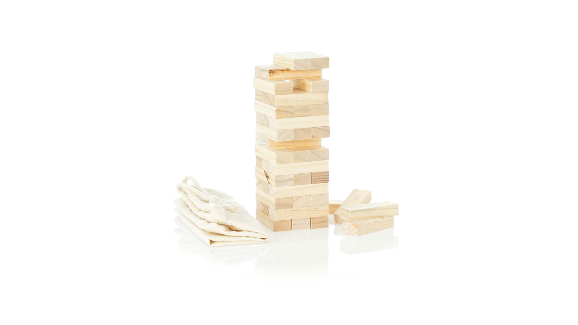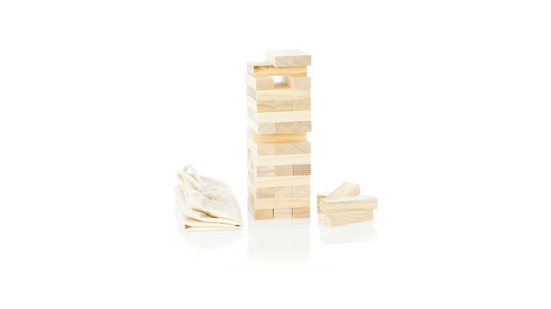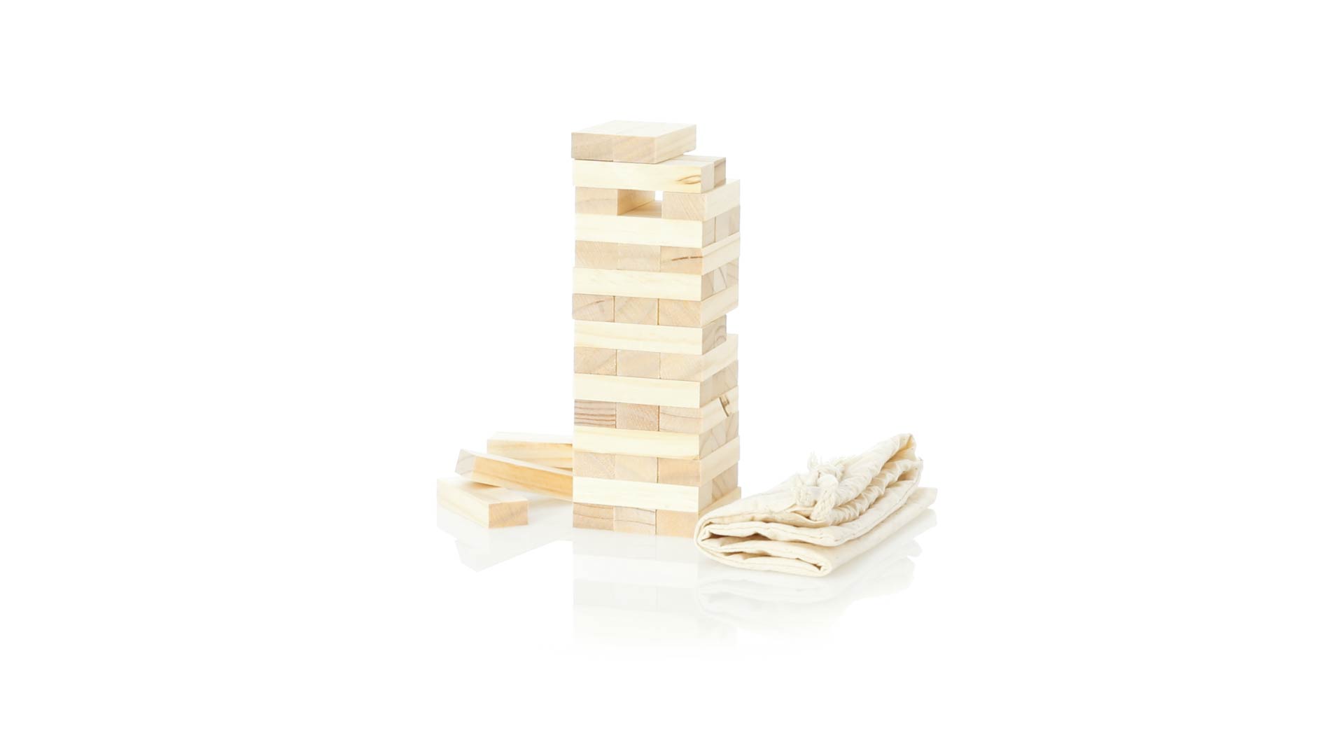 Geschicklichkeitsspiel für gerissene Spieler. Inklusive 45 Holzstücken, inklusive einem haltbaren Baumwollbeutel mit Schnurverschluss.