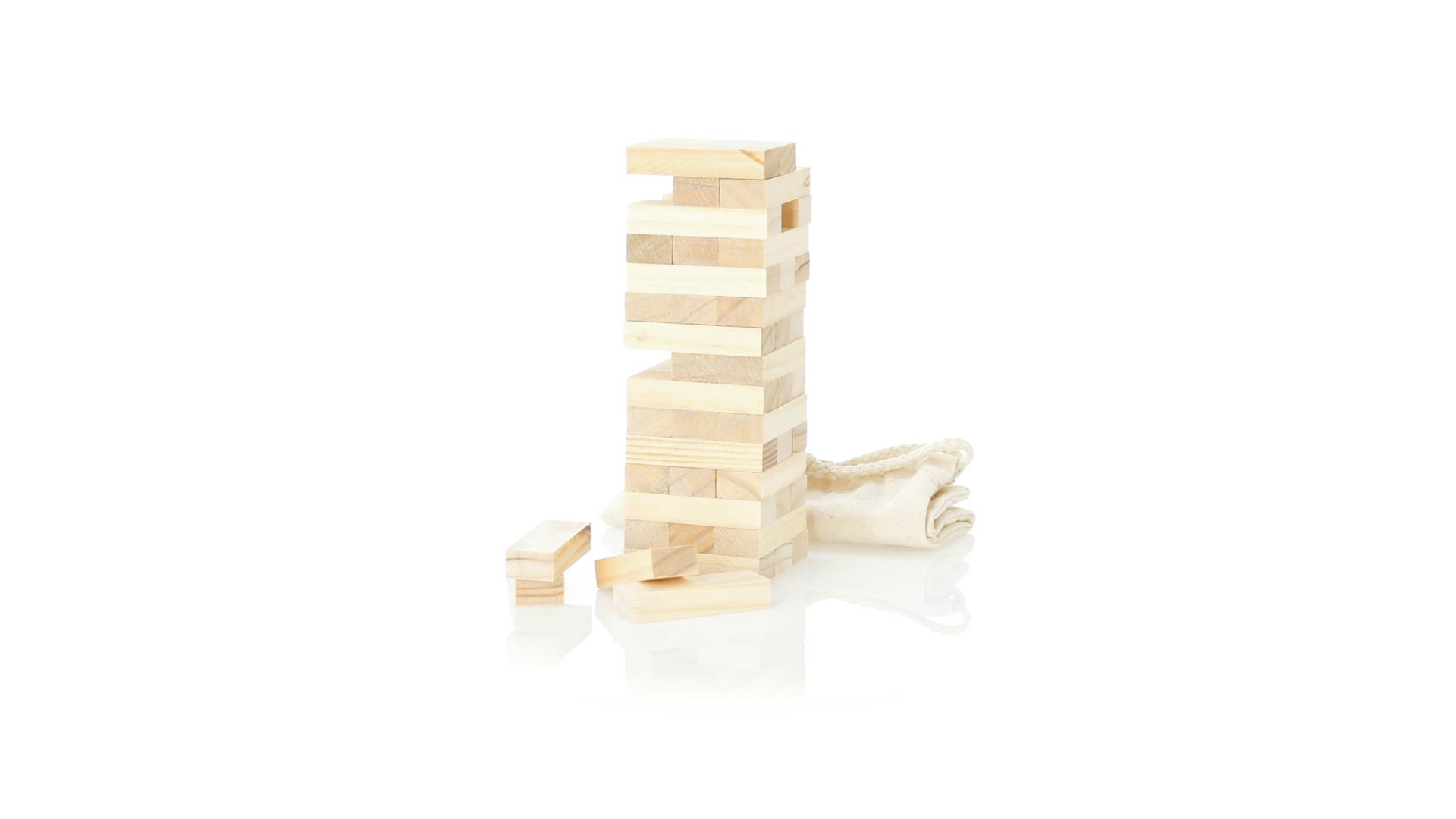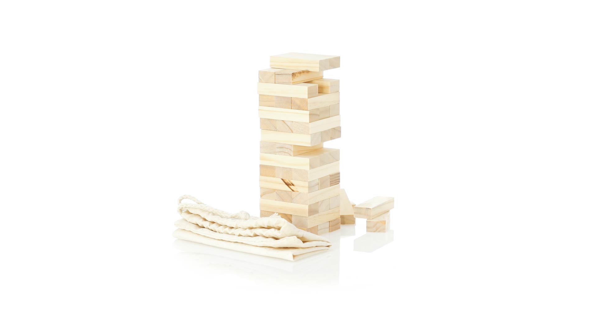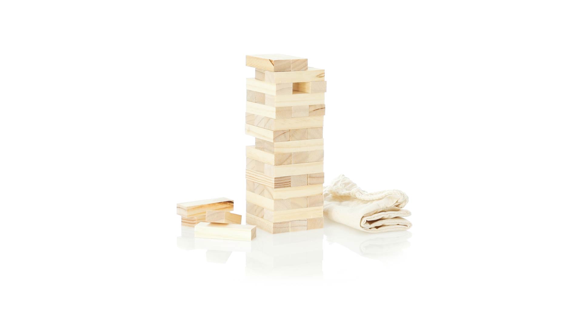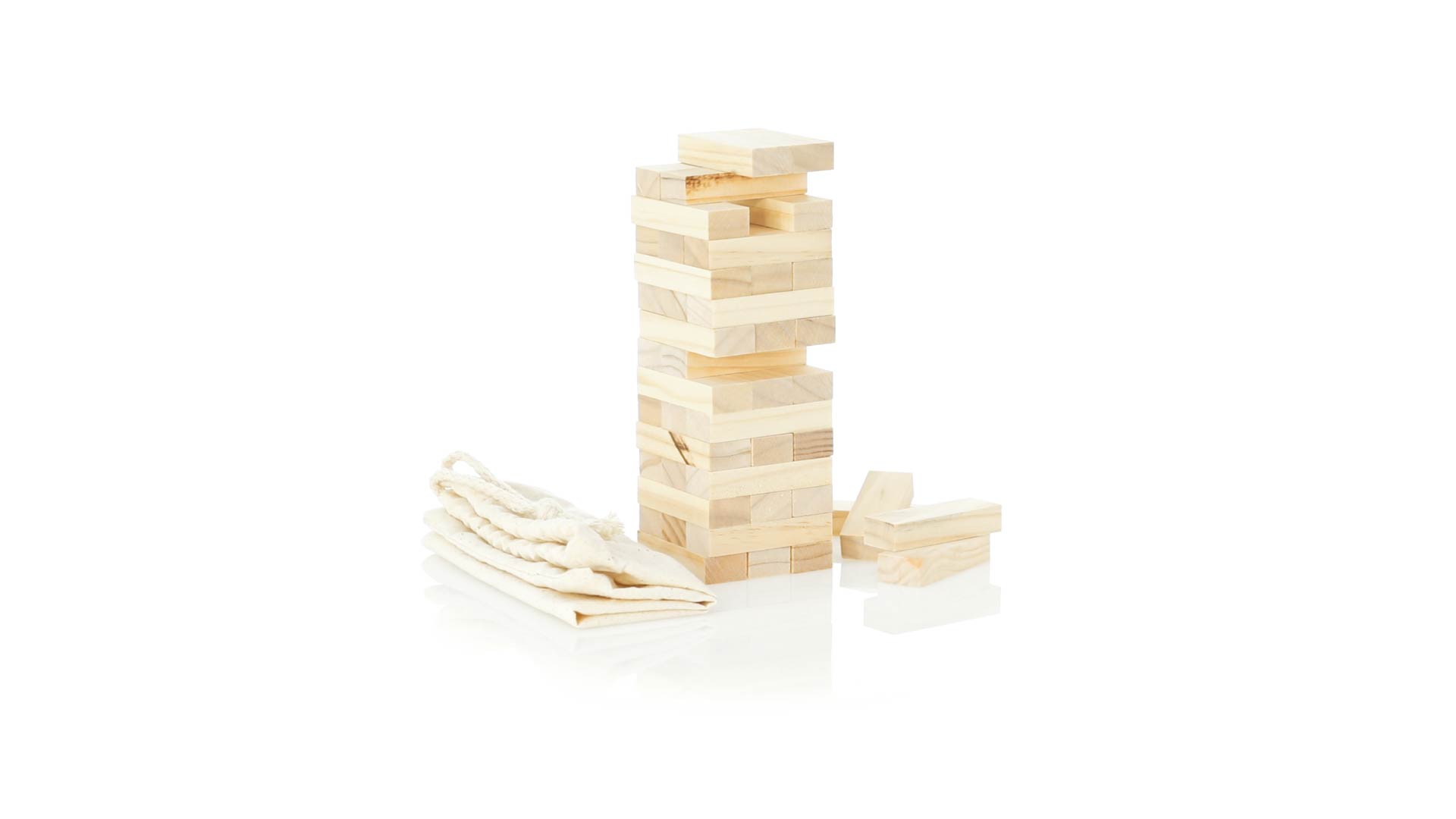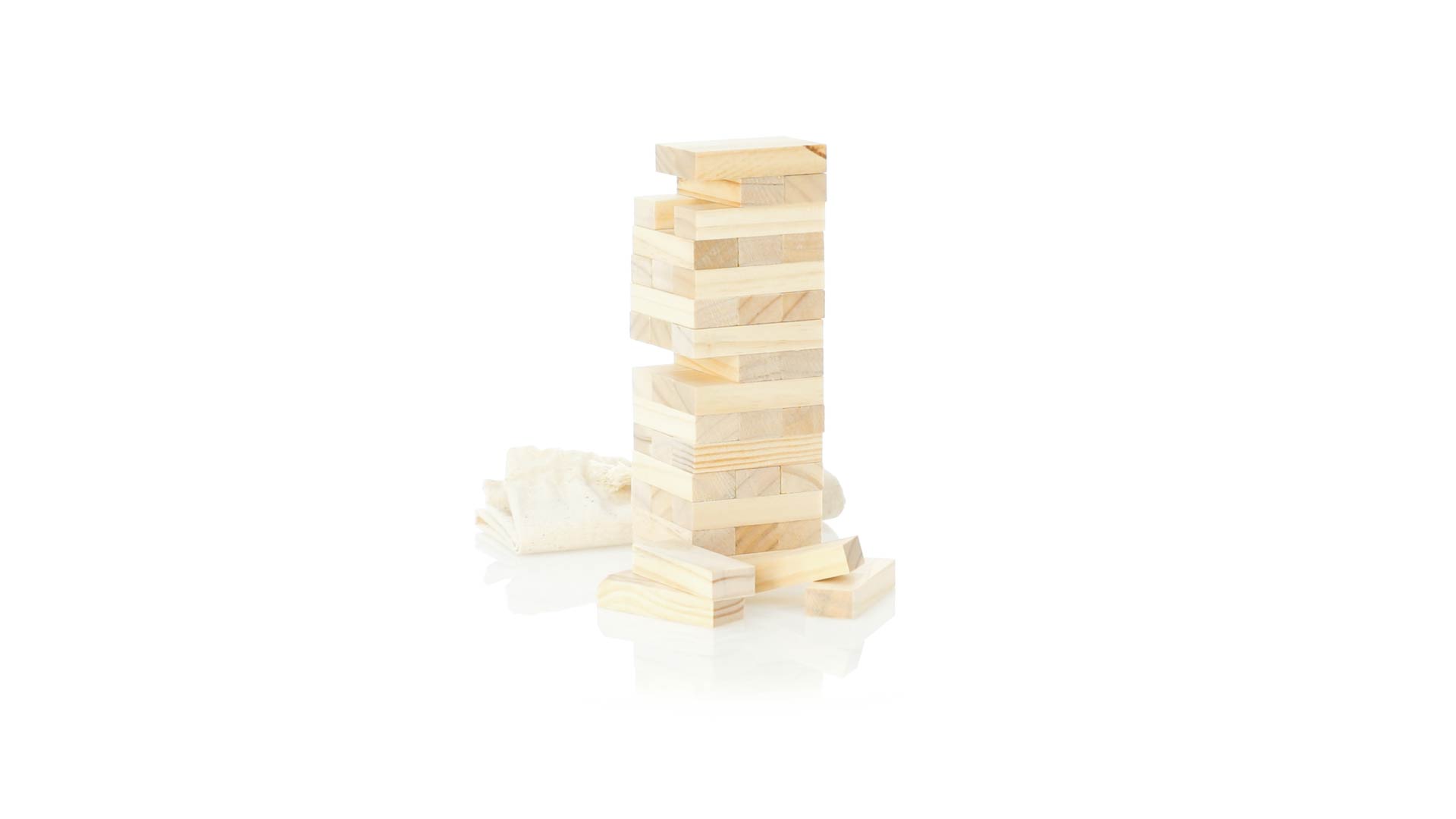 Geschicklichkeitsspiel für gerissene Spieler. Inklusive 45 Holzstücken, inklusive einem haltbaren Baumwollbeutel mit Schnurverschluss.