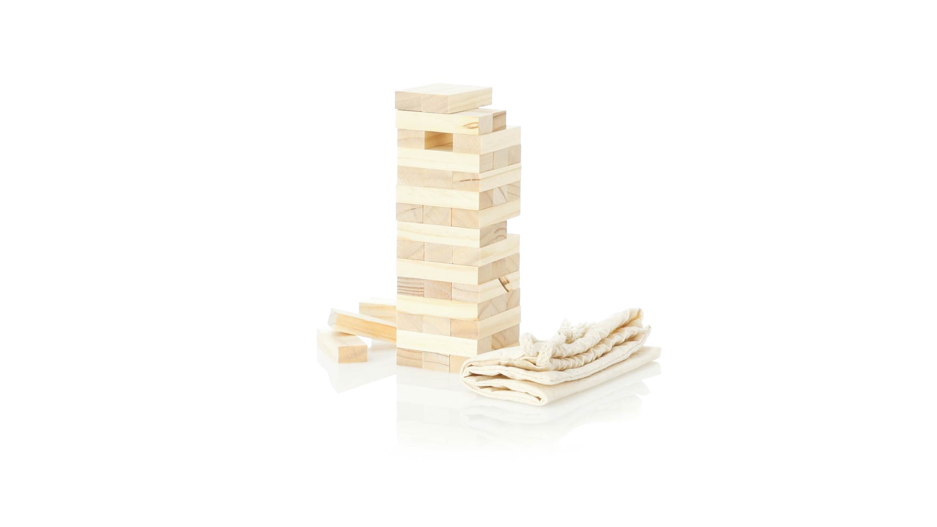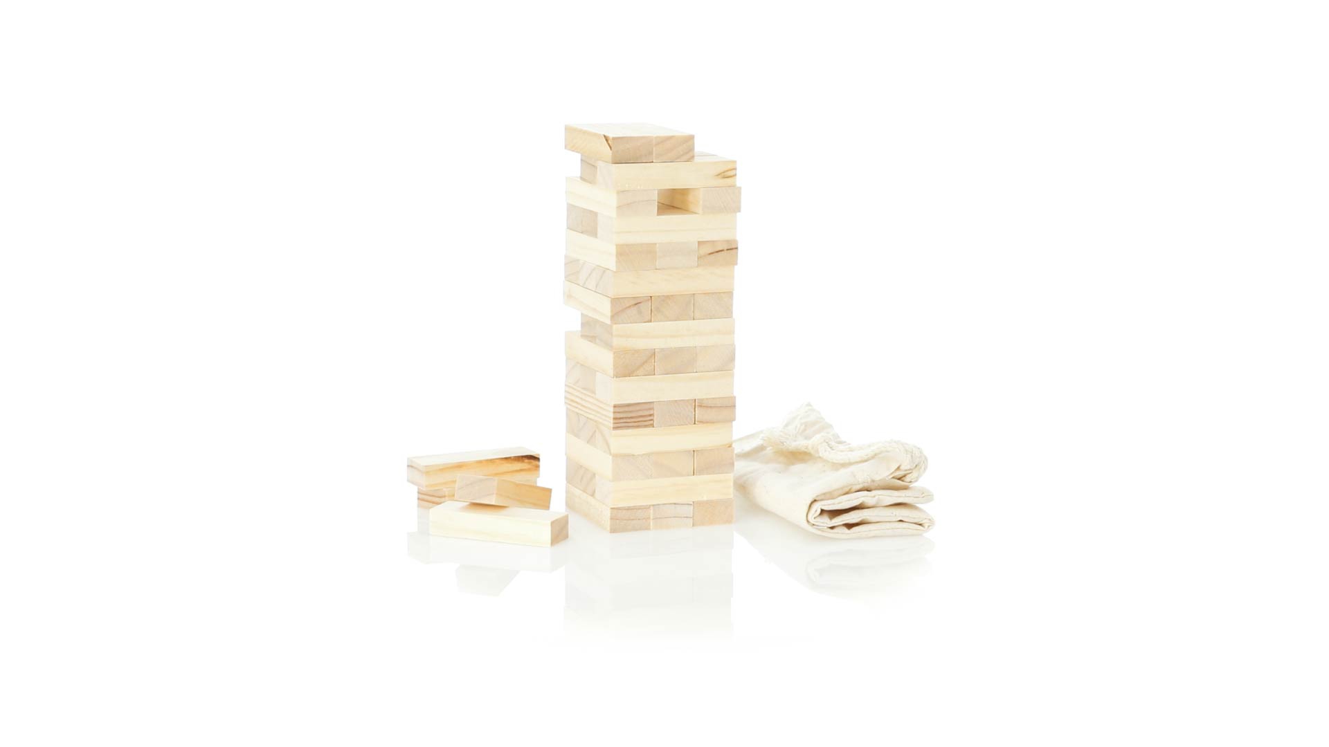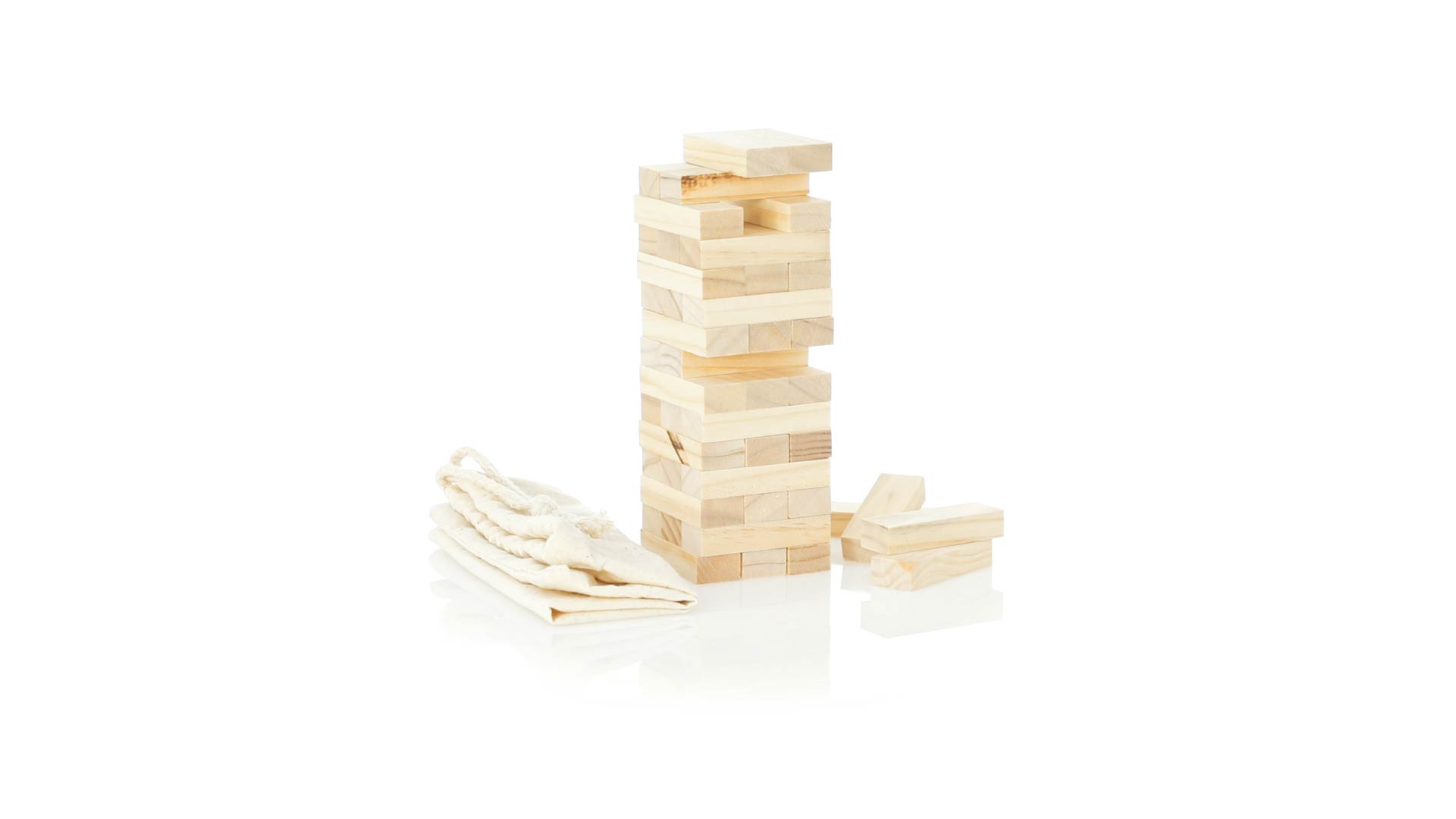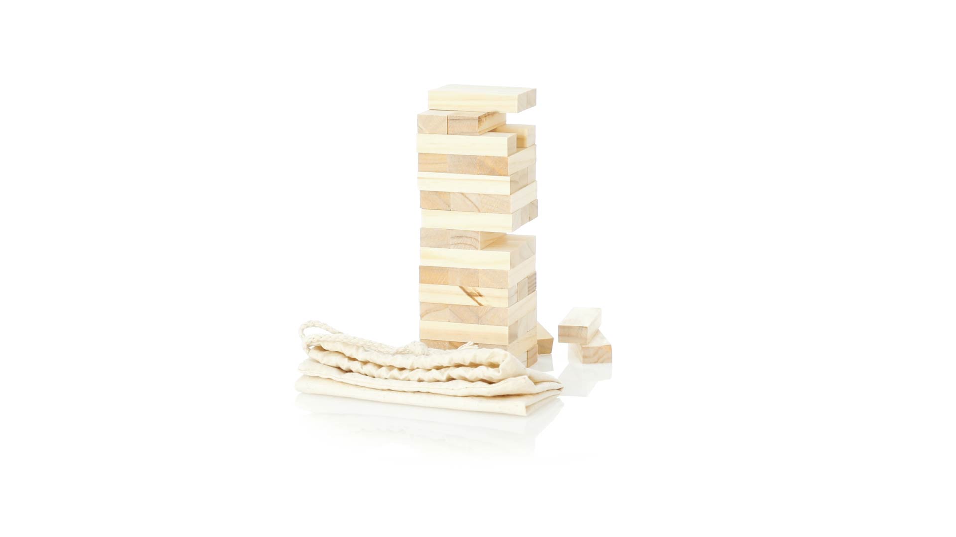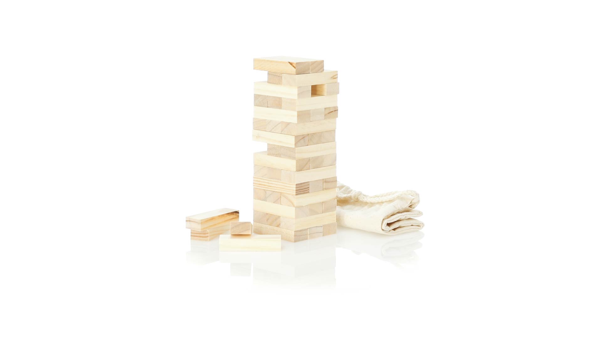 Geschicklichkeitsspiel für gerissene Spieler. Inklusive 45 Holzstücken, inklusive einem haltbaren Baumwollbeutel mit Schnurverschluss.