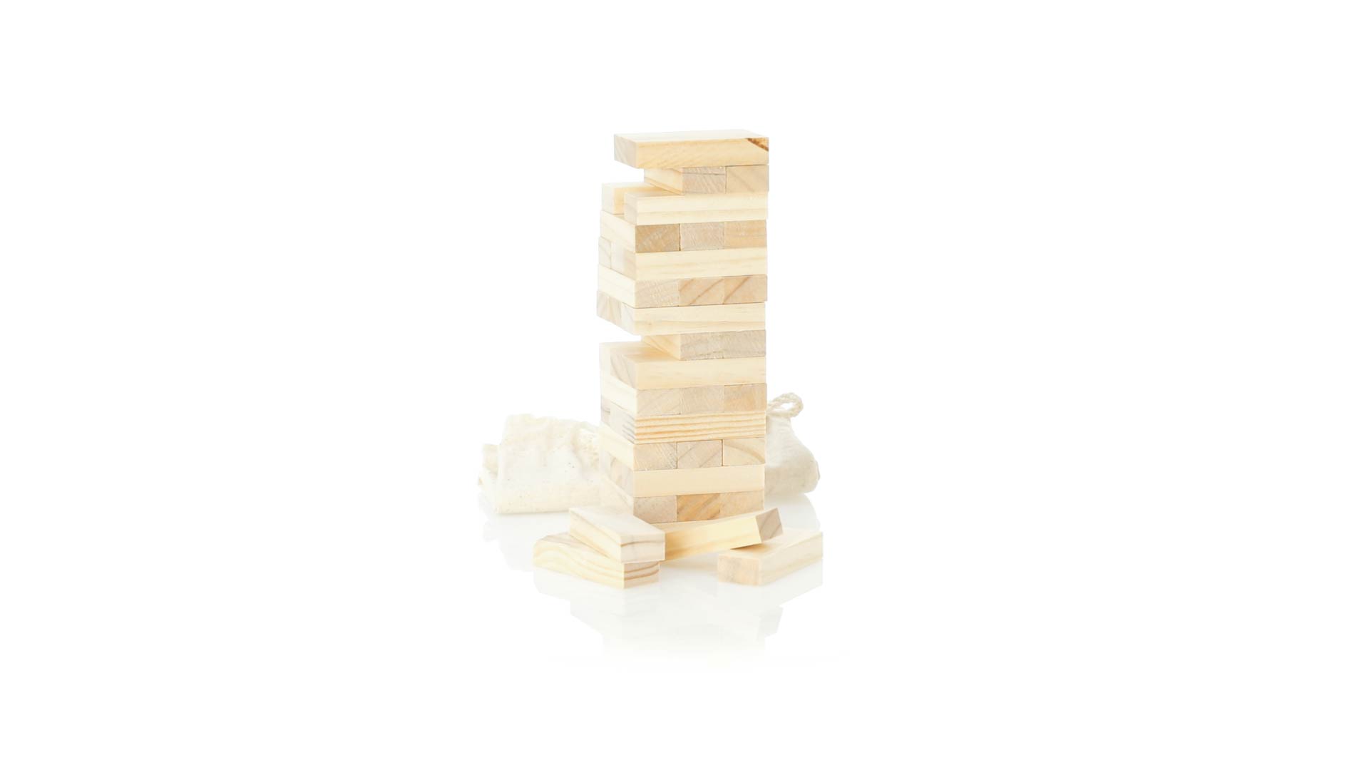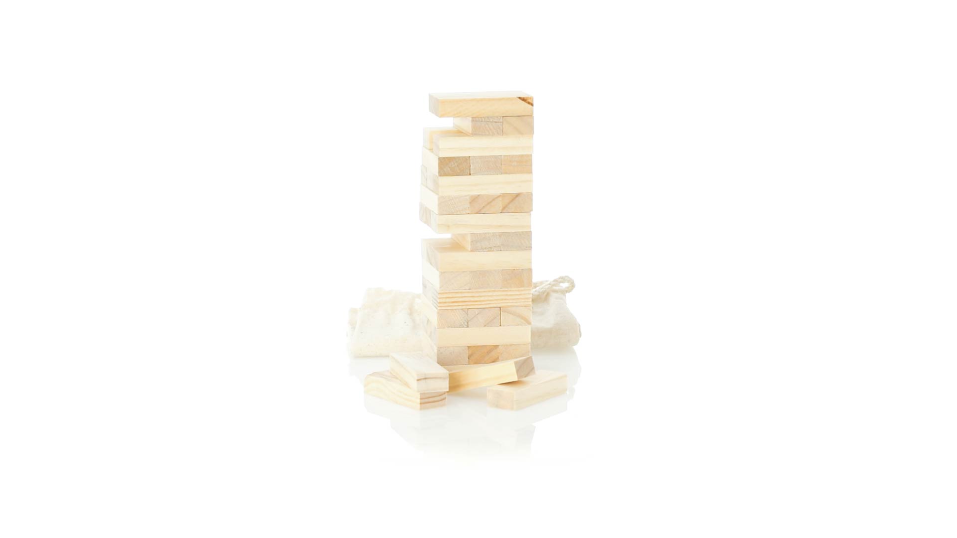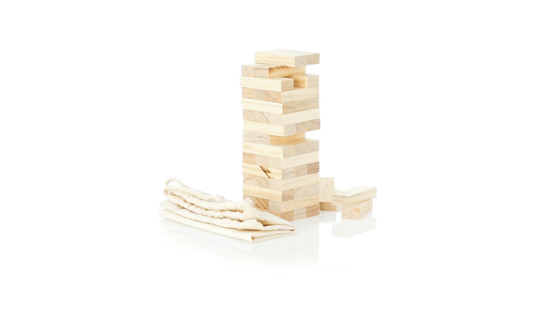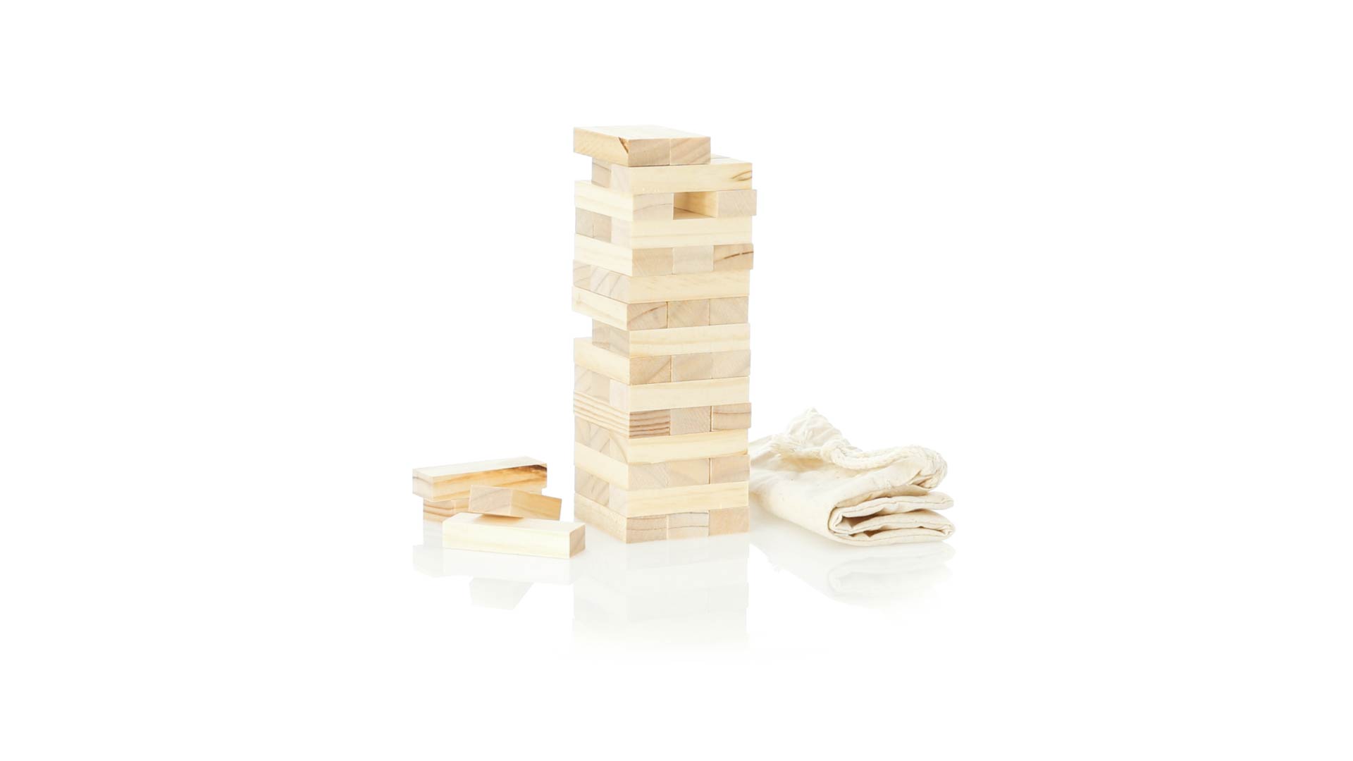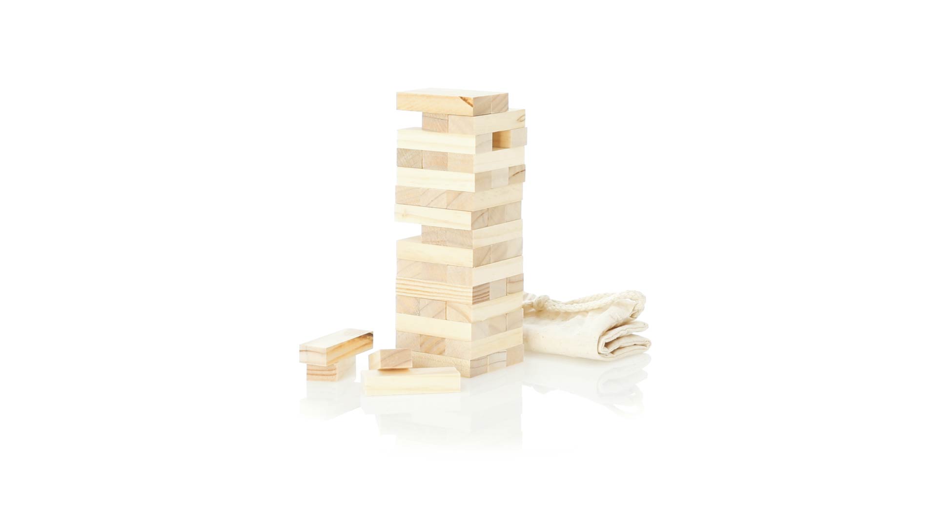 Geschicklichkeitsspiel für gerissene Spieler. Inklusive 45 Holzstücken, inklusive einem haltbaren Baumwollbeutel mit Schnurverschluss.