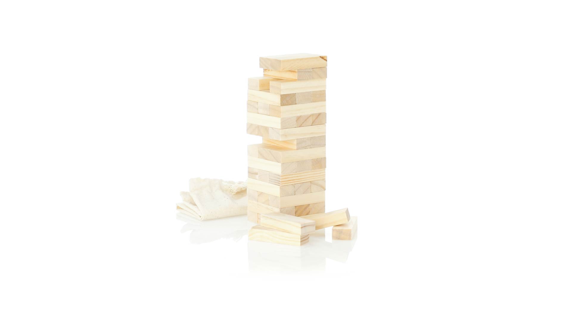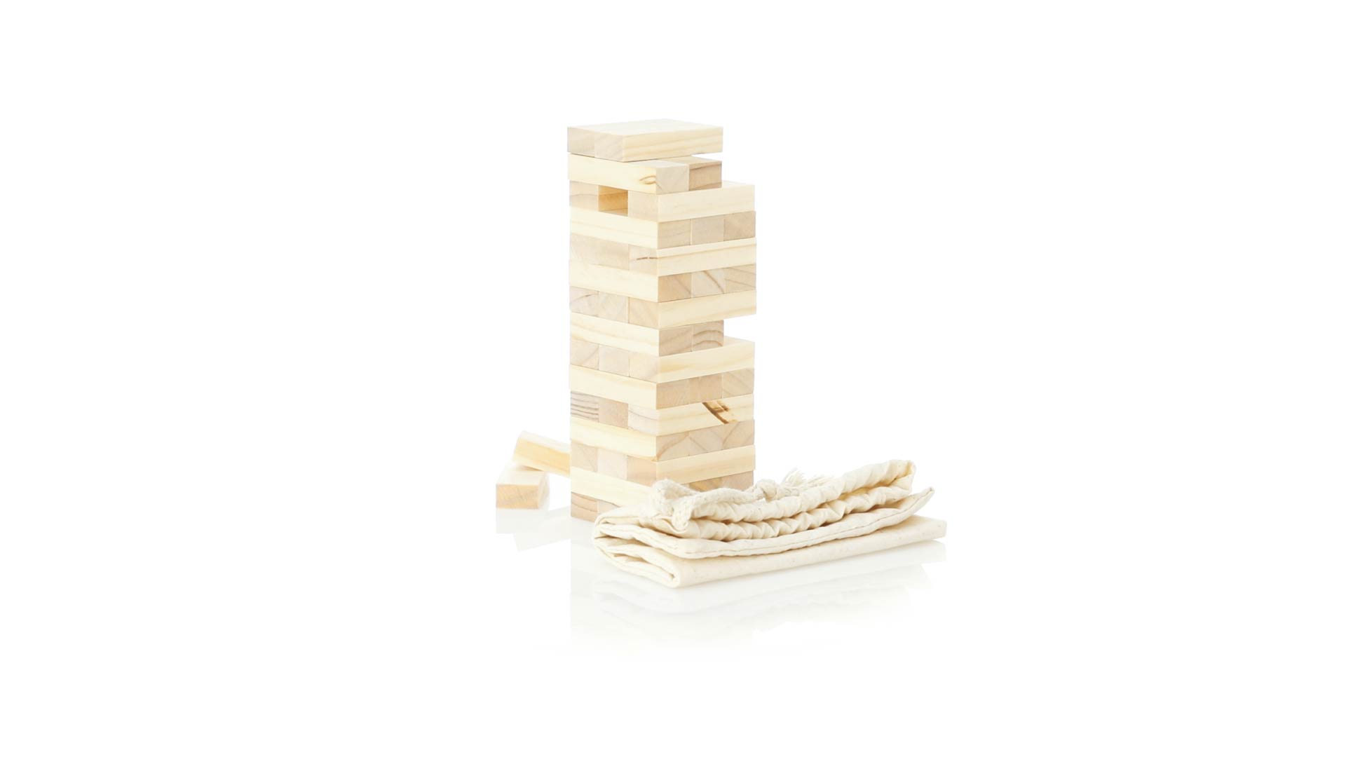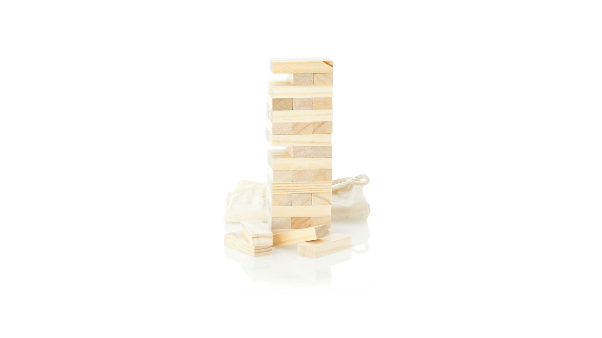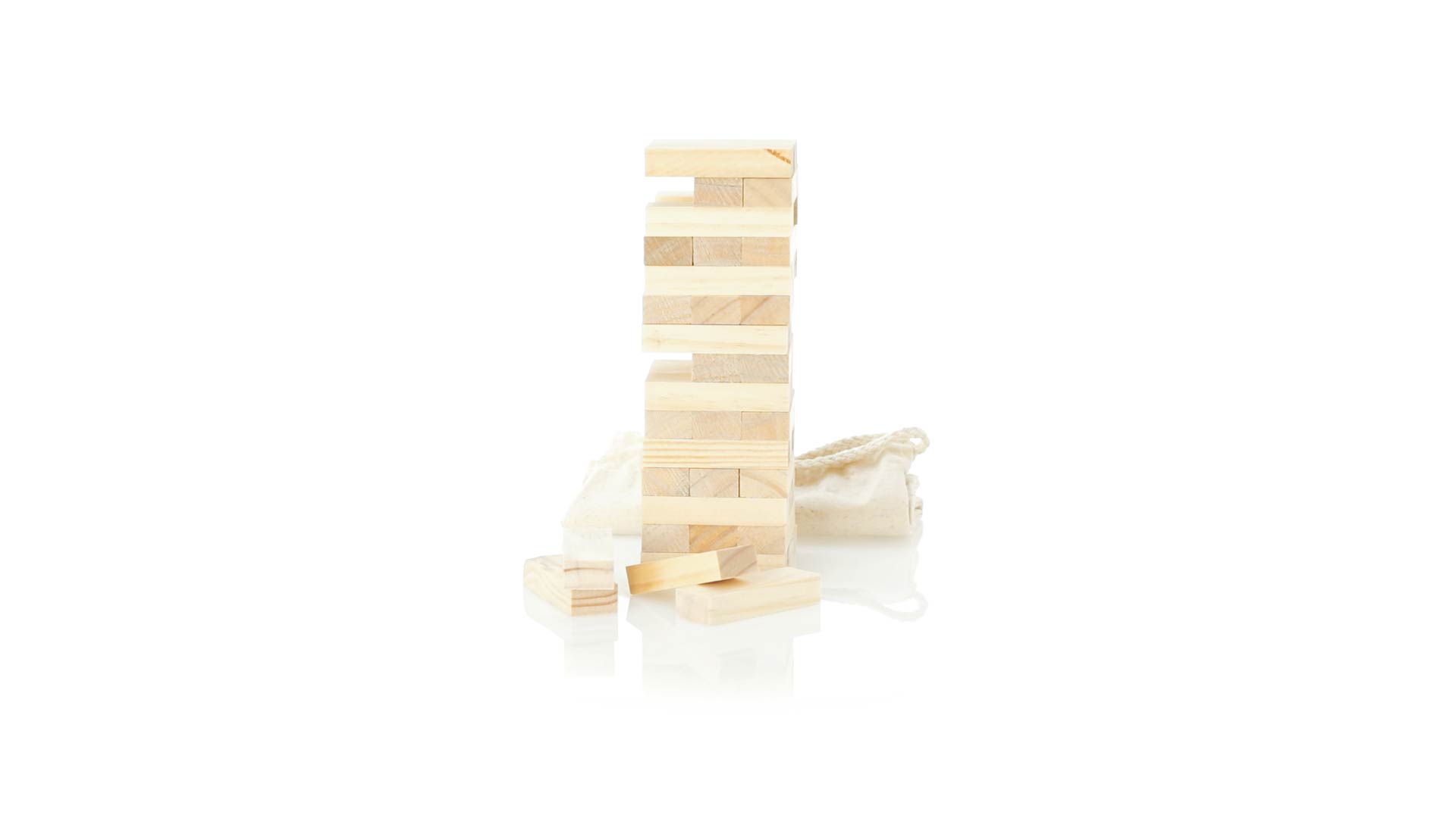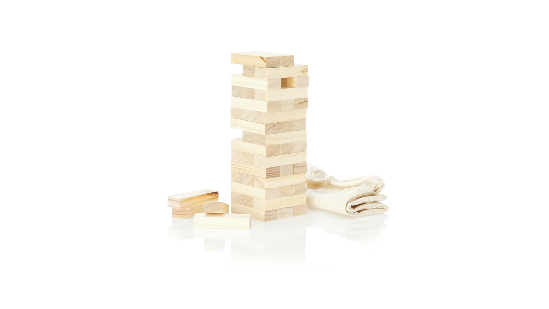 Geschicklichkeitsspiel für gerissene Spieler. Inklusive 45 Holzstücken, inklusive einem haltbaren Baumwollbeutel mit Schnurverschluss.
