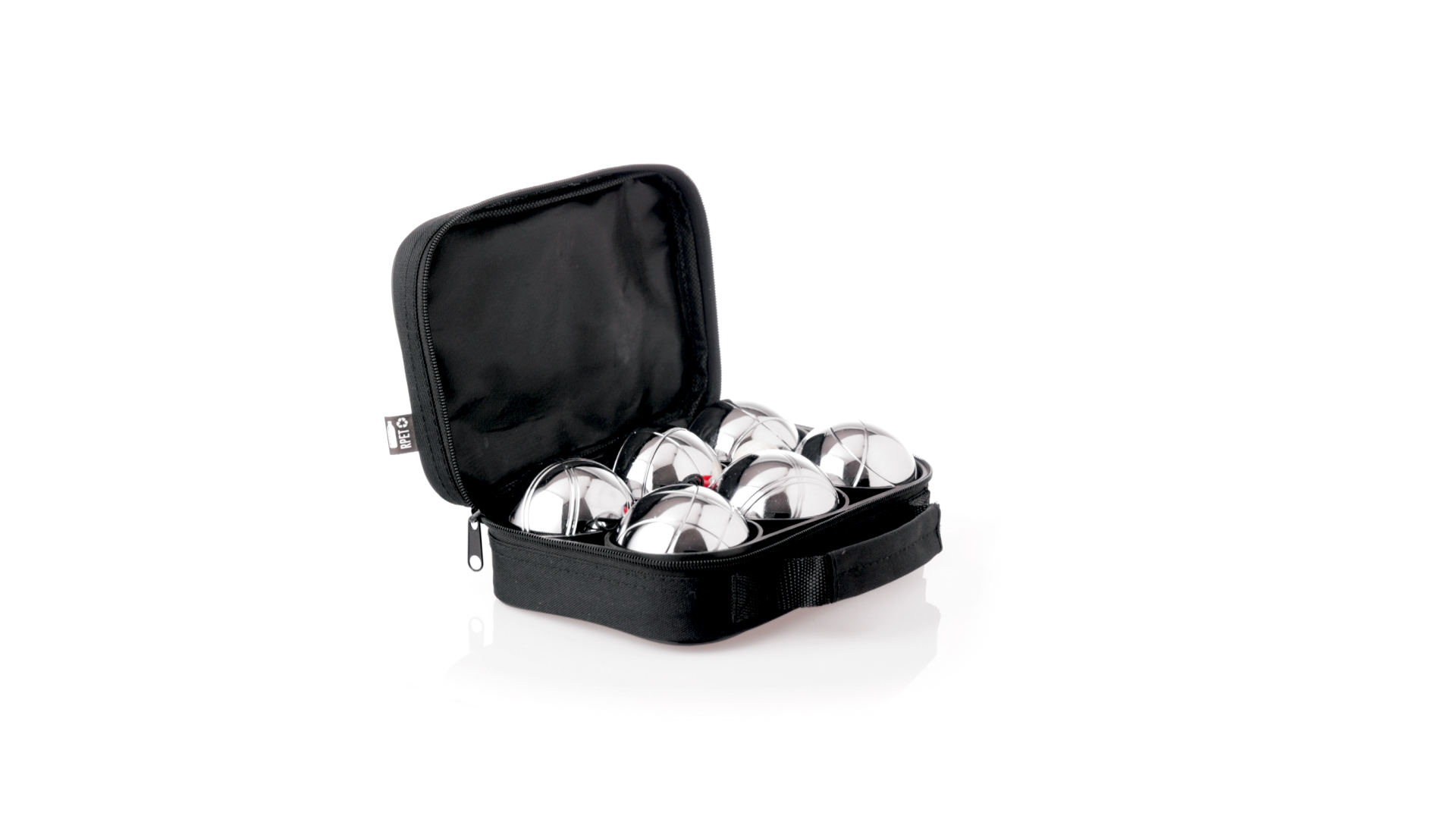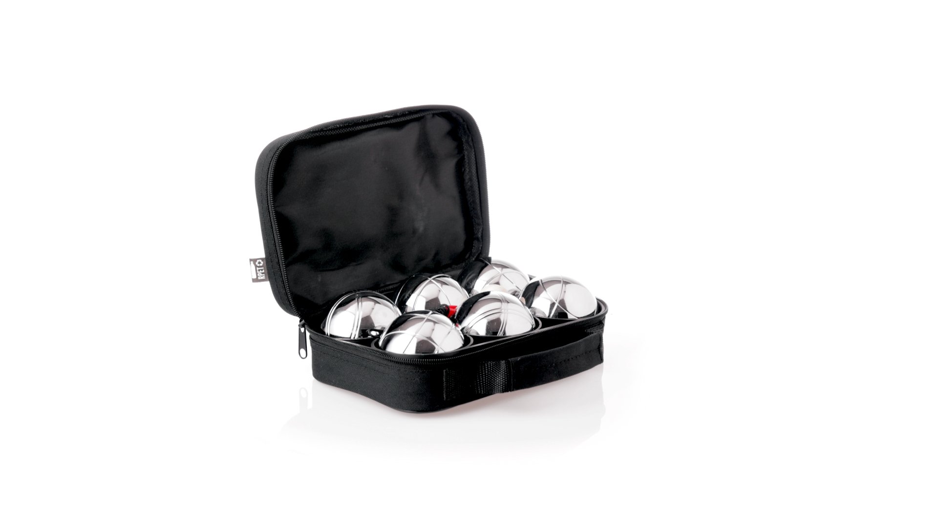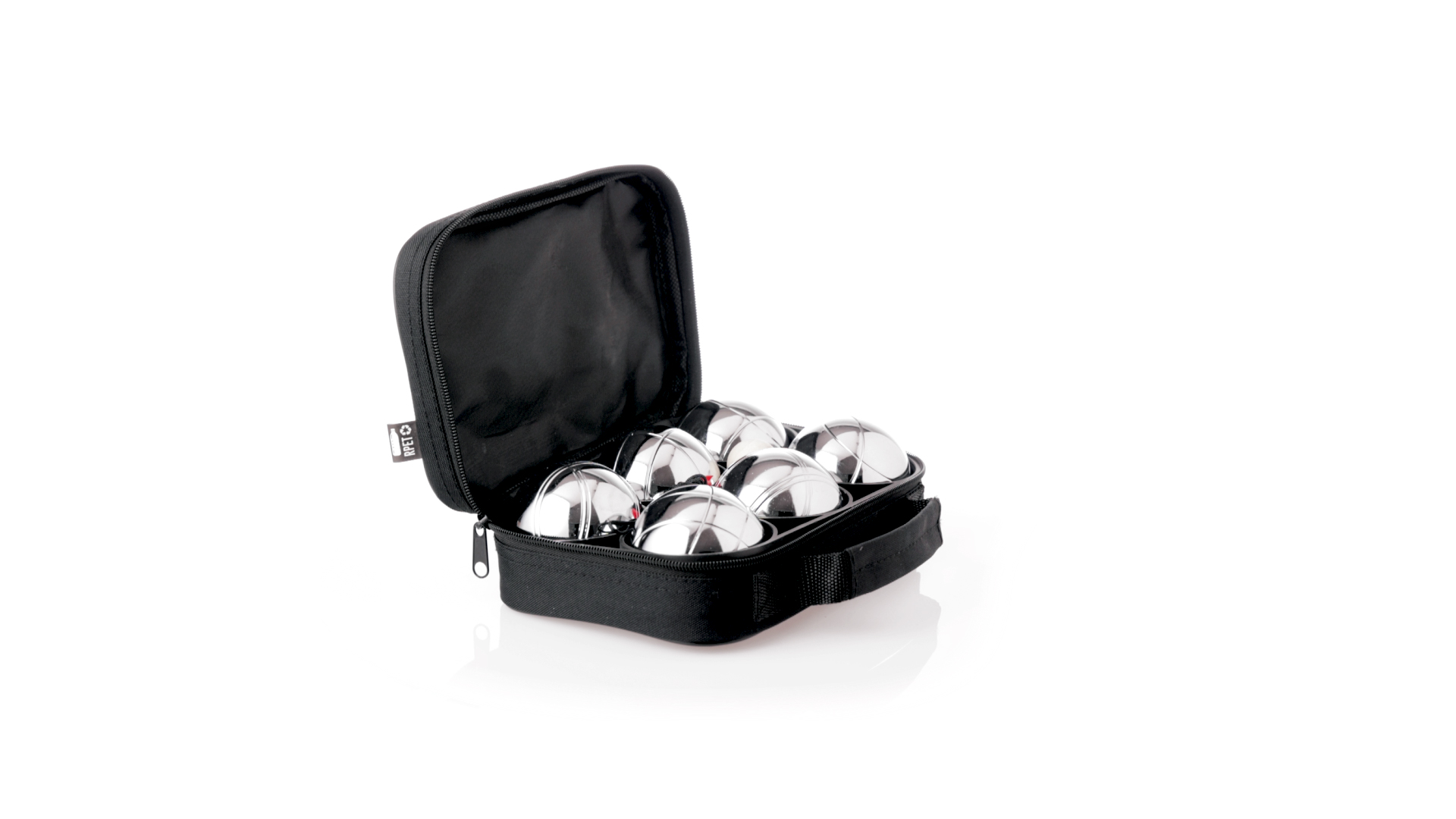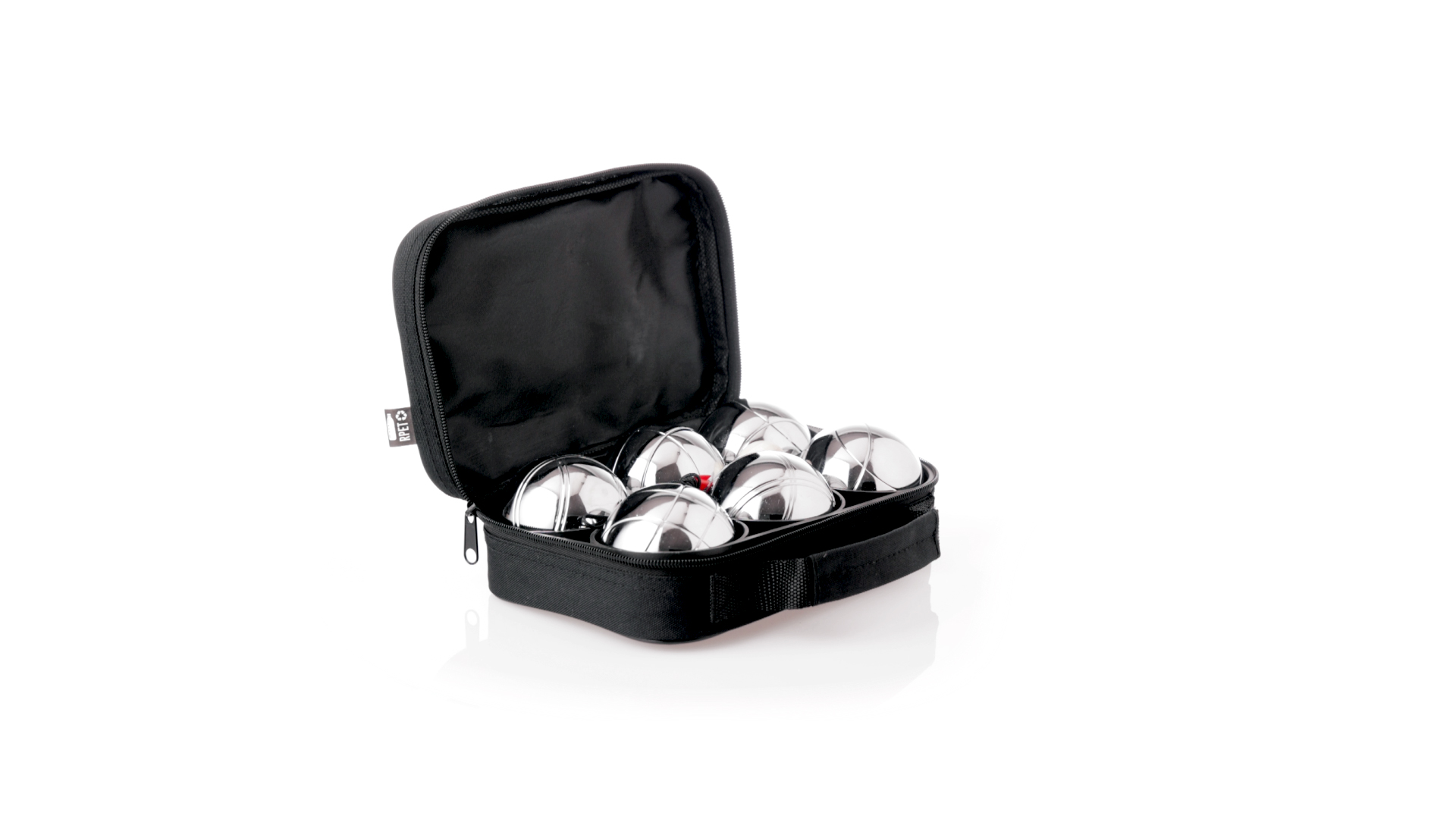 Hochwertiges Petanque-Spiel. Inklusive 6 Metallkugeln, 1 kleine Holzkugel und Messschnur. Das Set wird in einem widerstandsfähigen RPET-Koffer in schwarzer Farbe präsentiert, mit Tragegriff und passendem Reissverschluss. RPET-Material ist aus recyceltem Kunststoff hergestellt, um die Wiederverwendung von Kunststoffabfällen zu fördern und die Nachhaltigkeit des Planeten zu unterstützen.