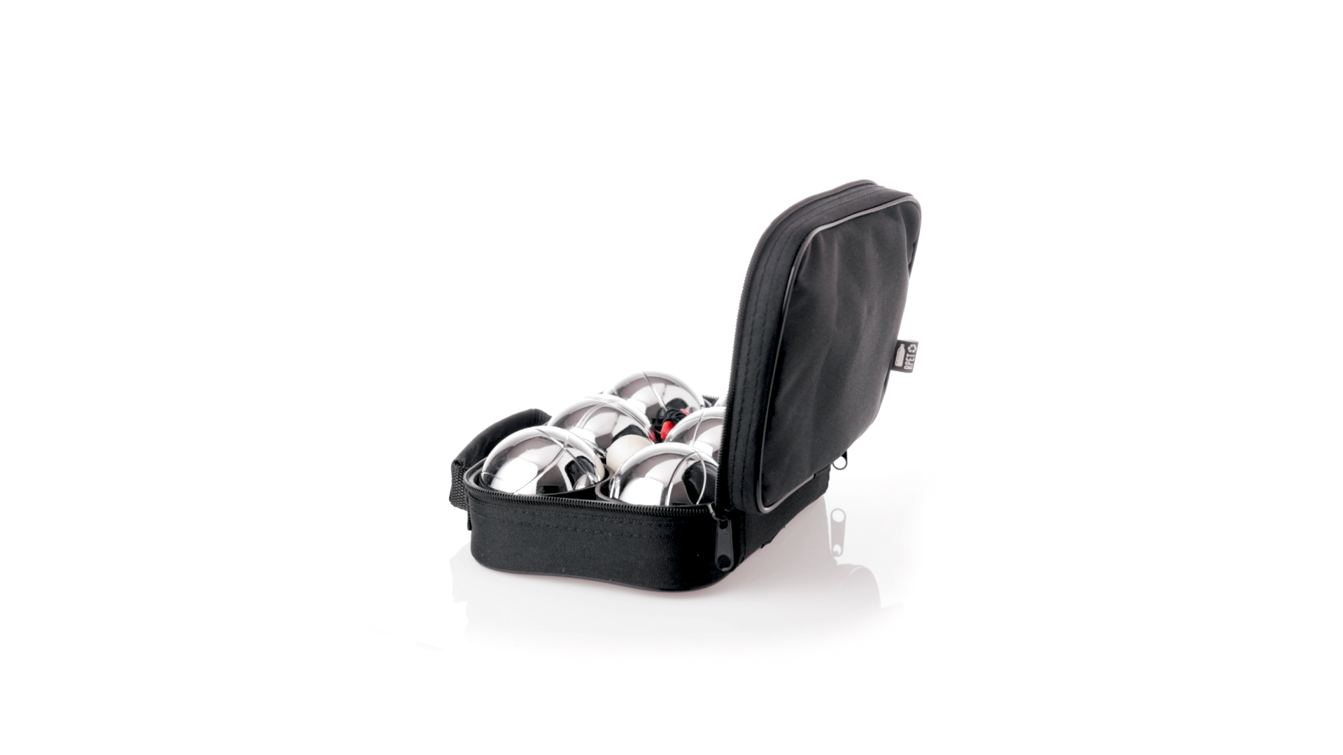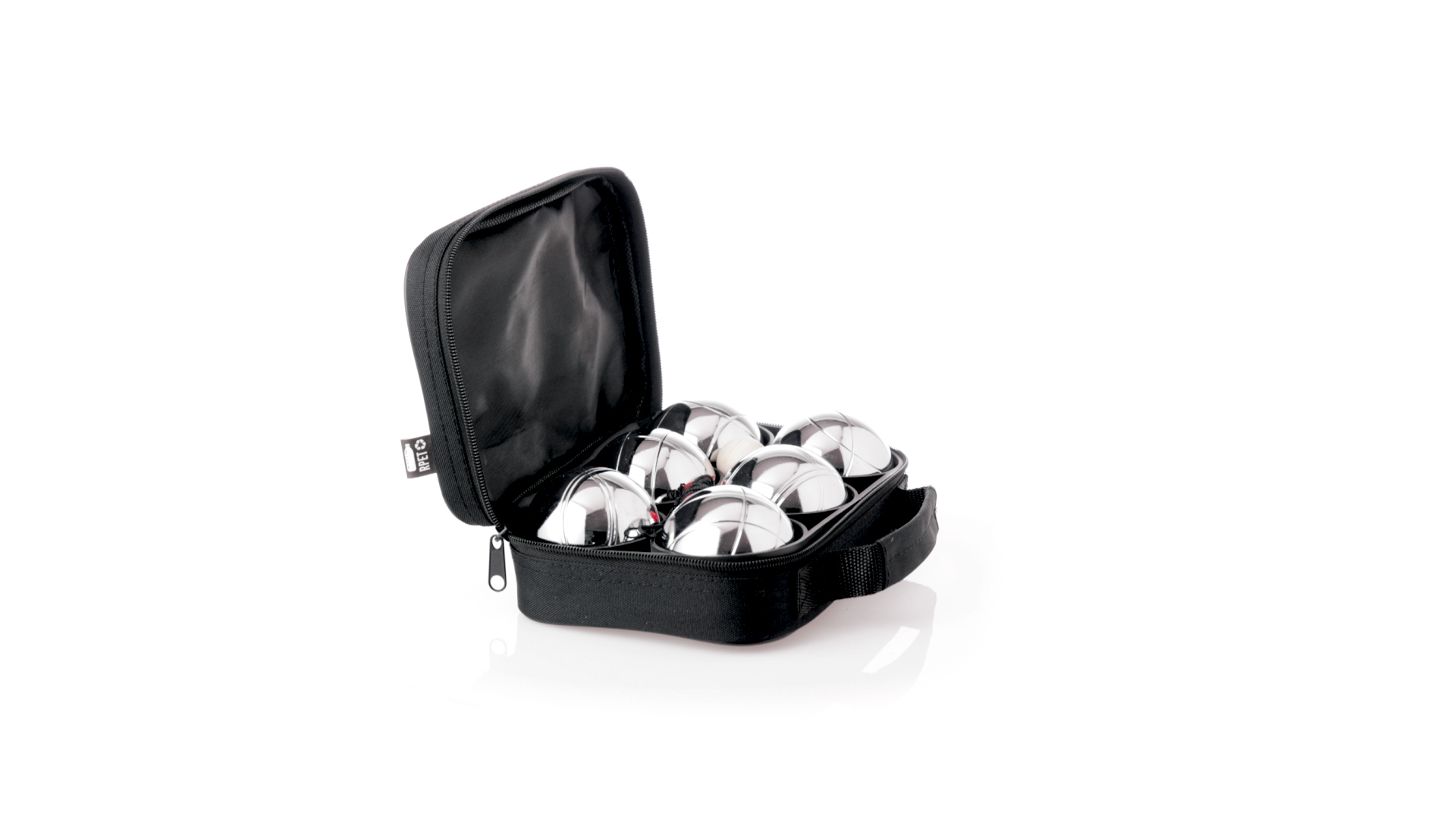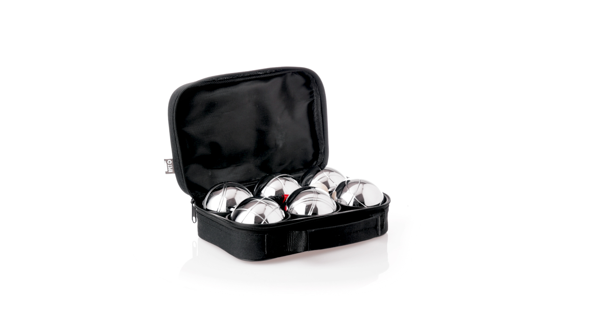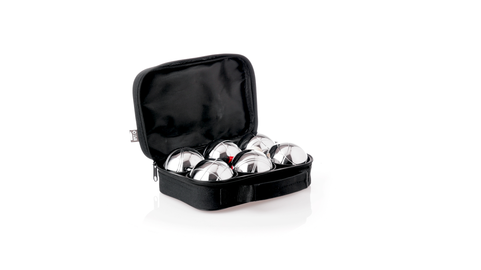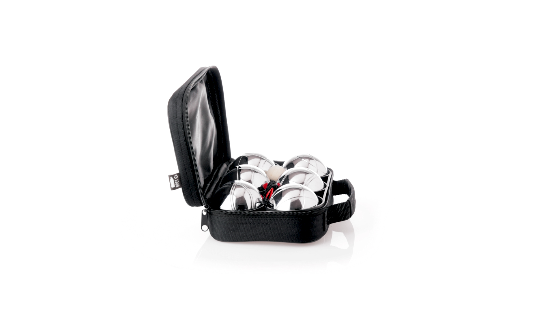 Hochwertiges Petanque-Spiel. Inklusive 6 Metallkugeln, 1 kleine Holzkugel und Messschnur. Das Set wird in einem widerstandsfähigen RPET-Koffer in schwarzer Farbe präsentiert, mit Tragegriff und passendem Reissverschluss. RPET-Material ist aus recyceltem Kunststoff hergestellt, um die Wiederverwendung von Kunststoffabfällen zu fördern und die Nachhaltigkeit des Planeten zu unterstützen.