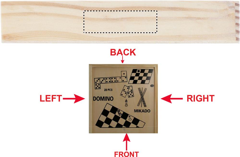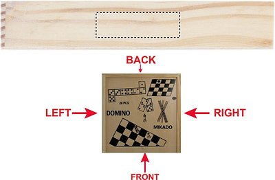 Spielesammlung in Holzbox. Beinhaltet 4 Spiele: Mikado, Domino, Schach und Dame.