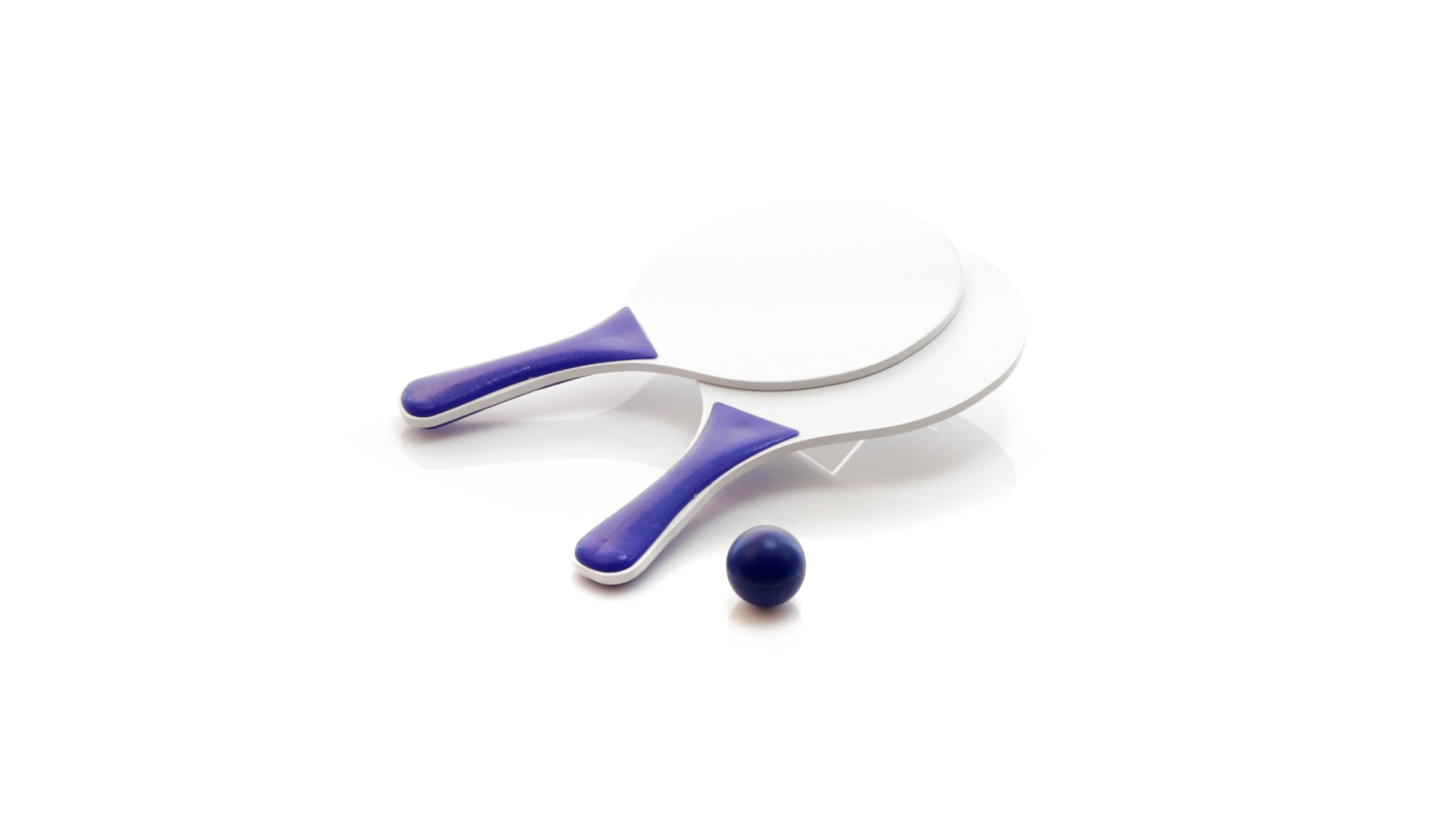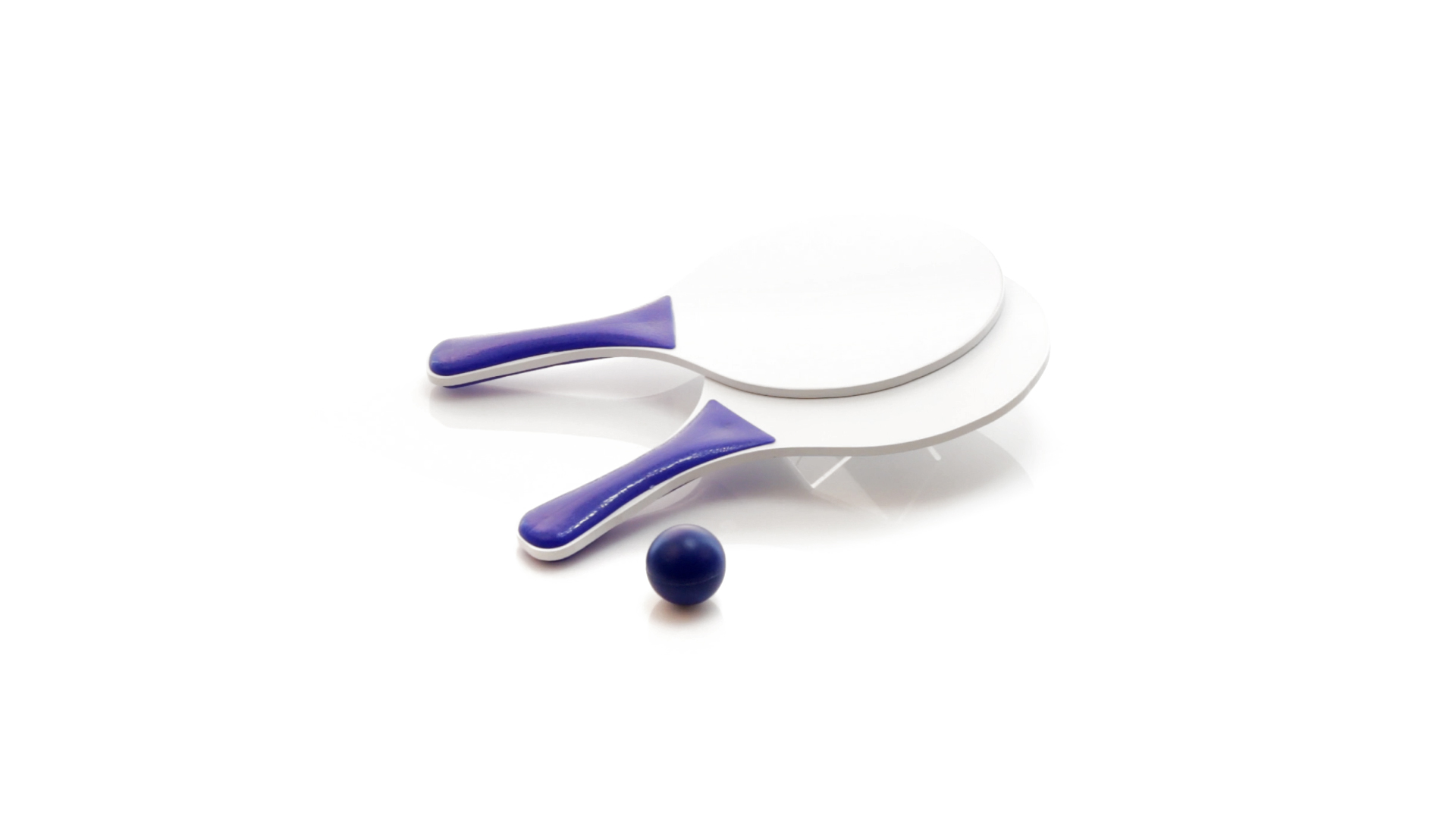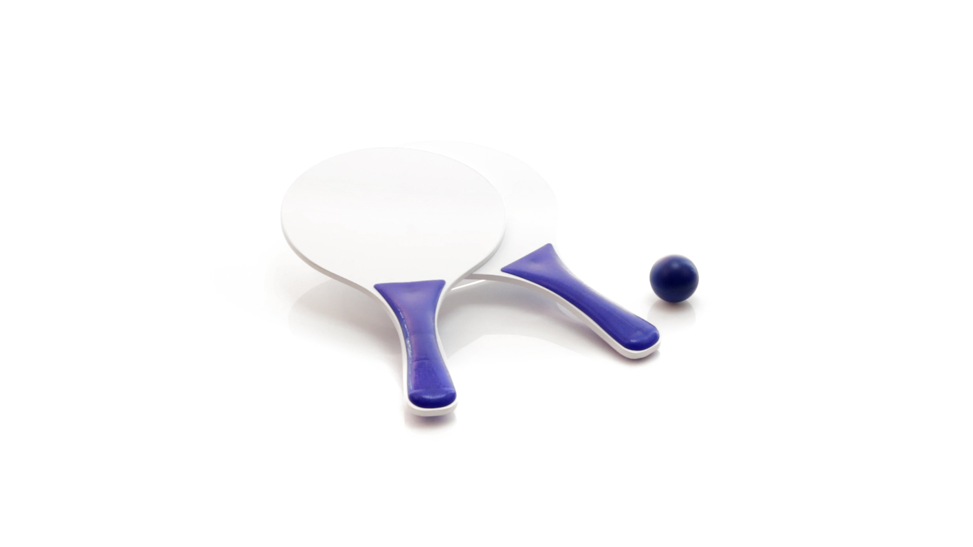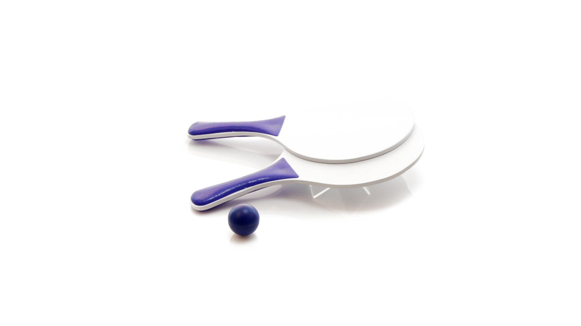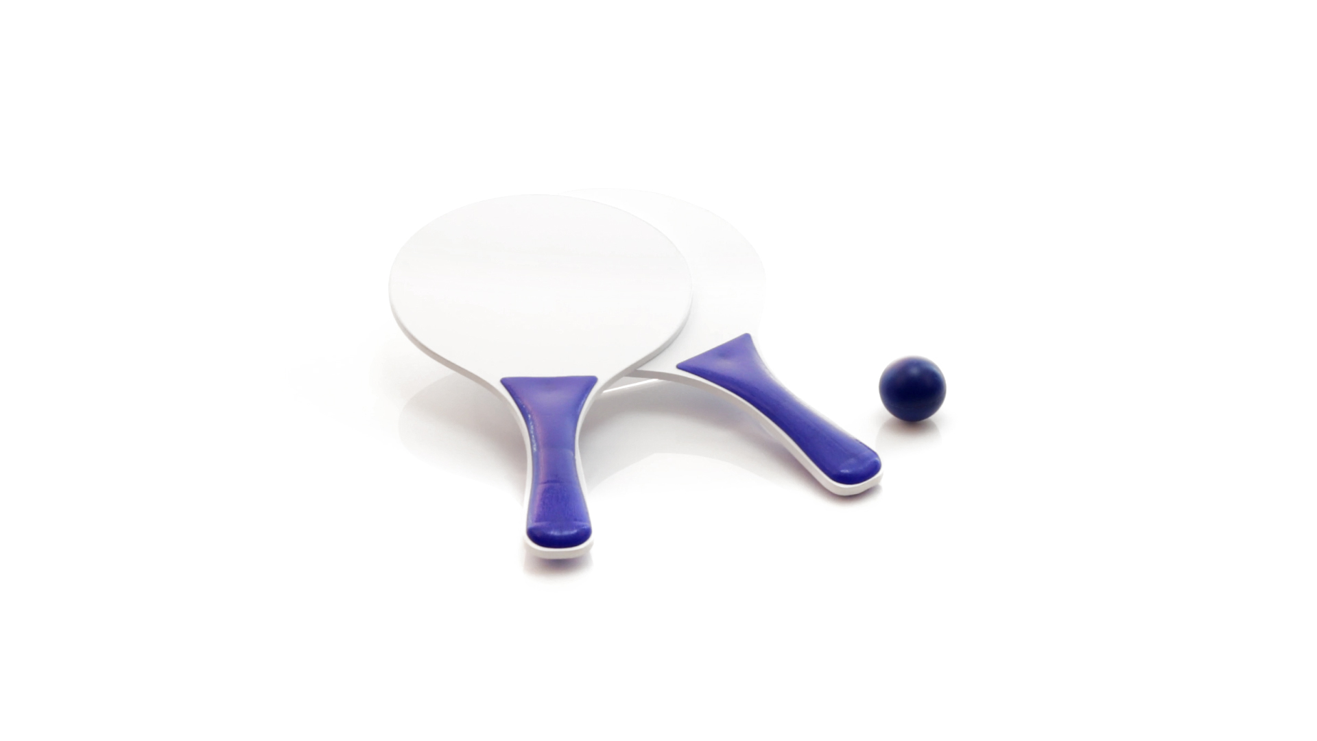 Beachball-Set mit zwei Schlägern aus Naturholz. Mit verstärkten Griffen in einer Vielzahl von lebendigen Farben. Präsentiert in einer Netztasche mit farblich passendem Ball.