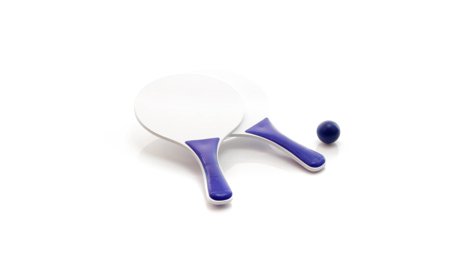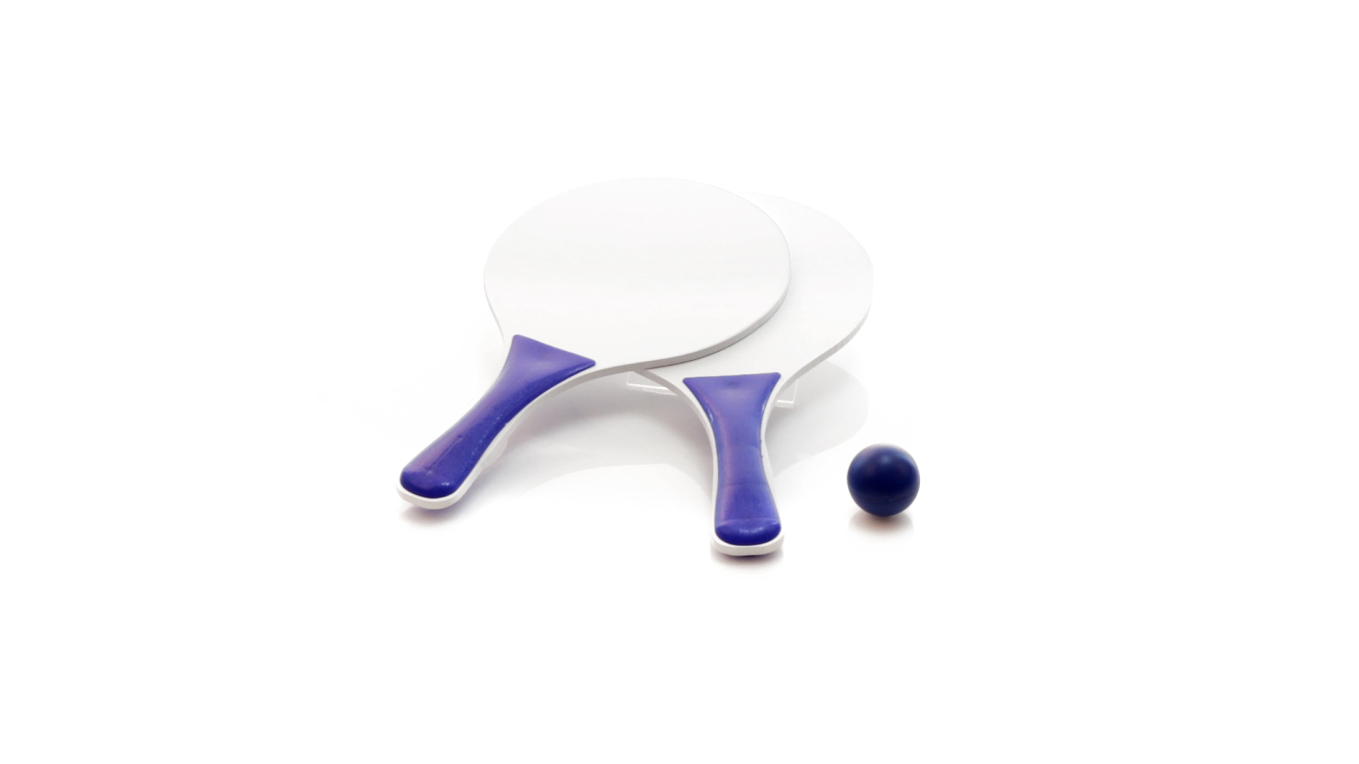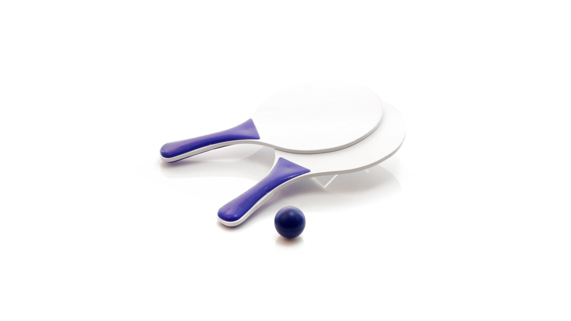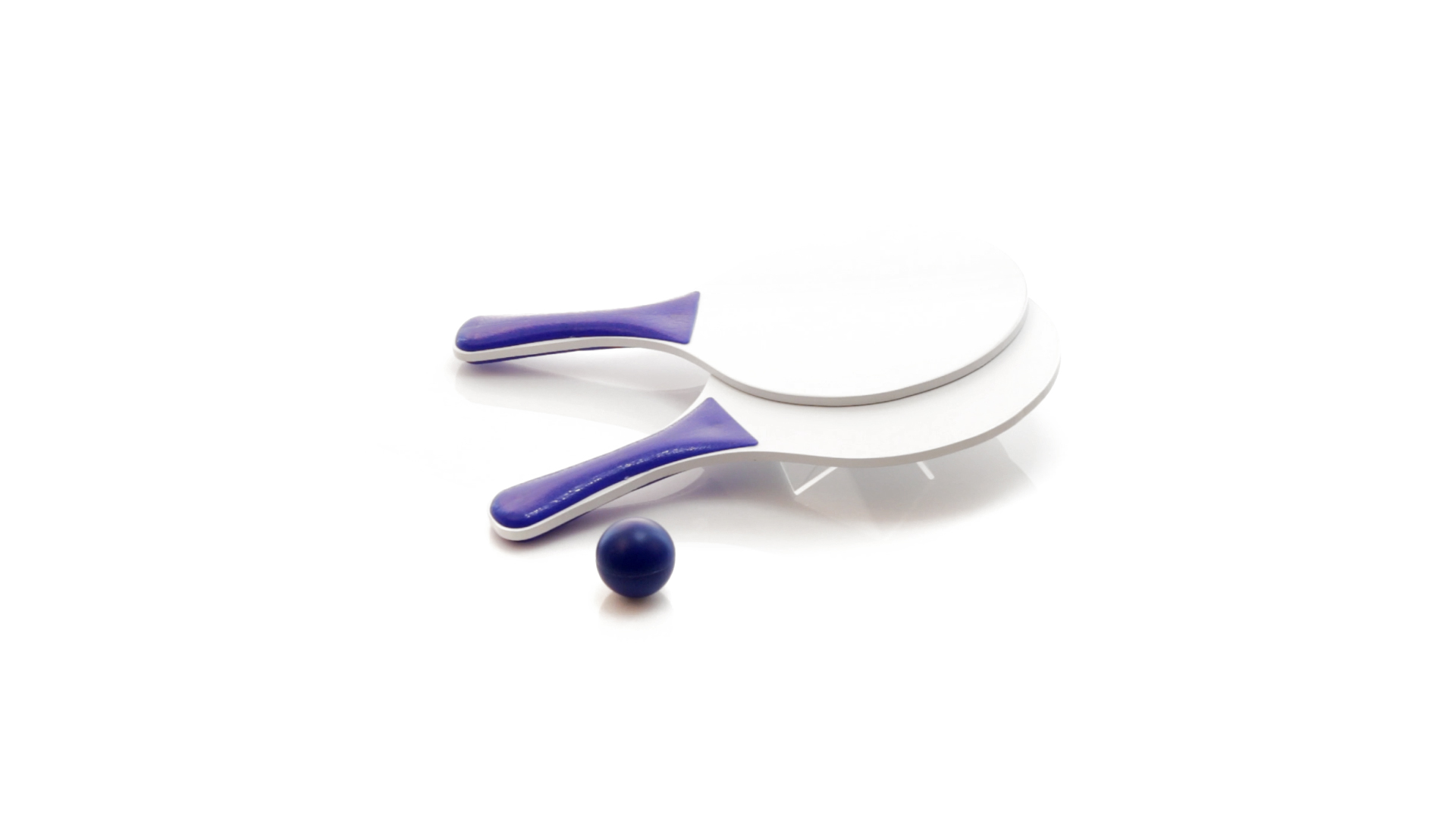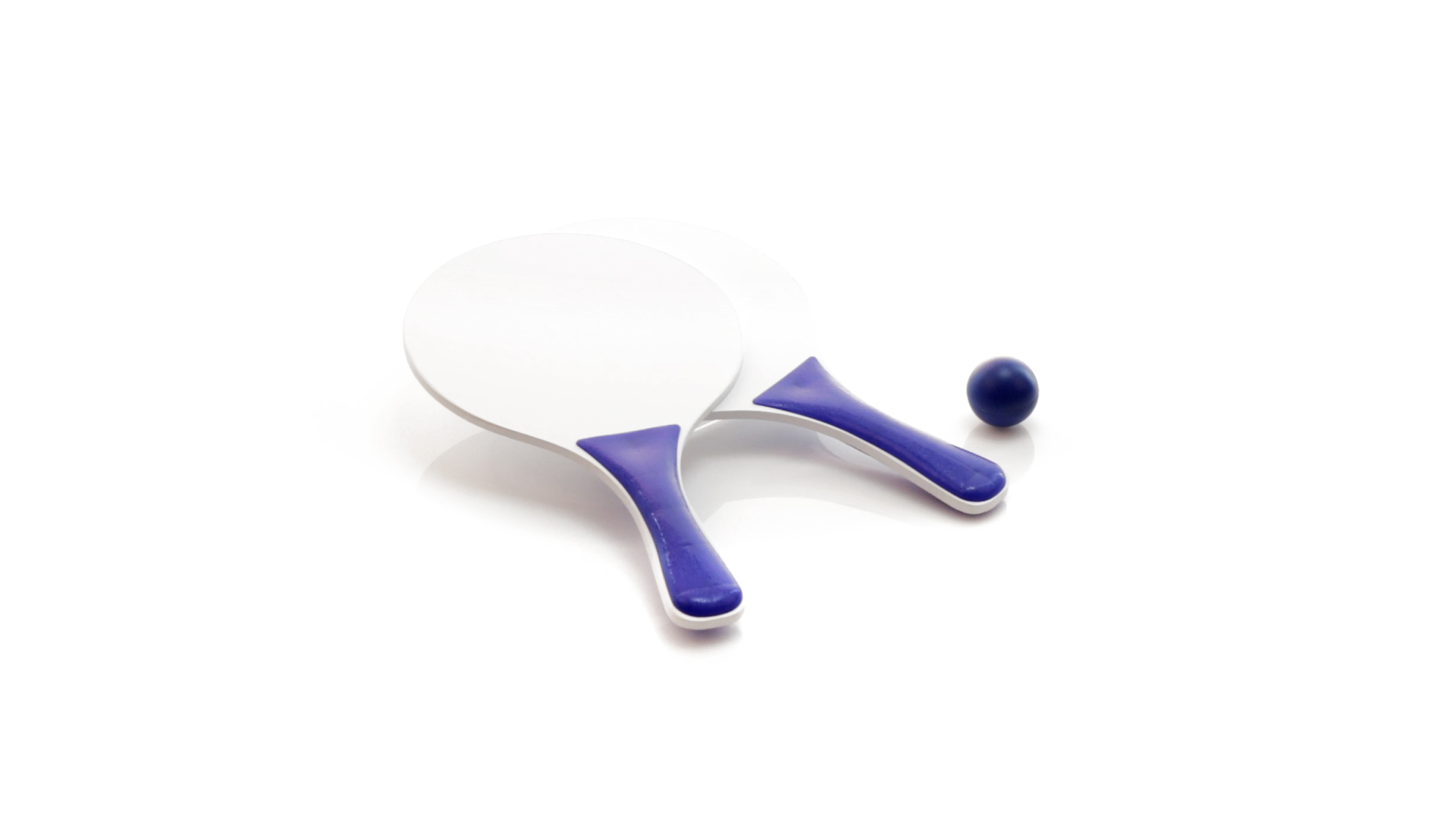 Beachball-Set mit zwei Schlägern aus Naturholz. Mit verstärkten Griffen in einer Vielzahl von lebendigen Farben. Präsentiert in einer Netztasche mit farblich passendem Ball.