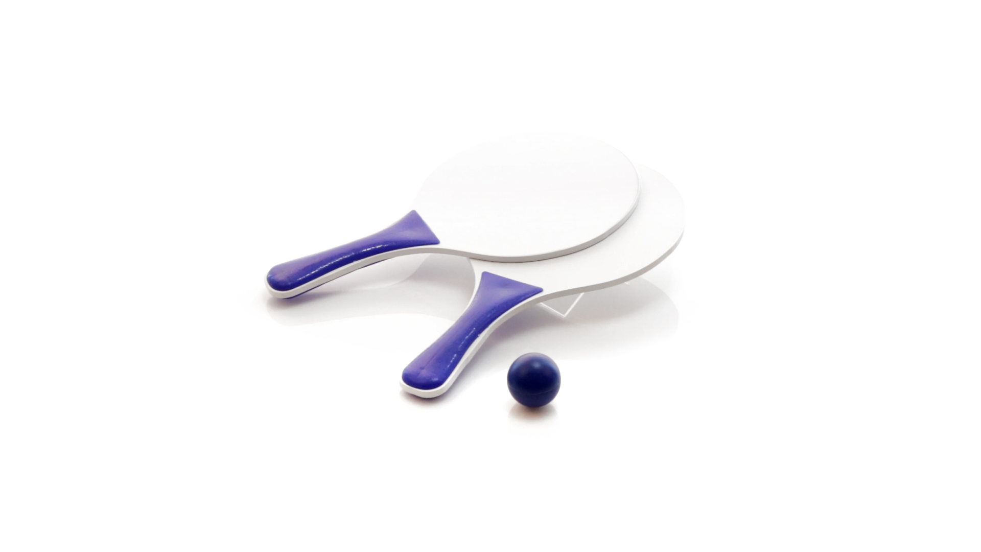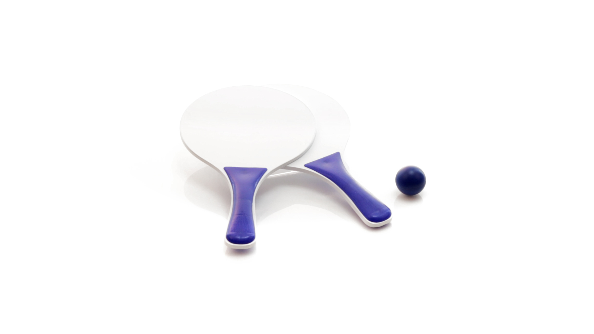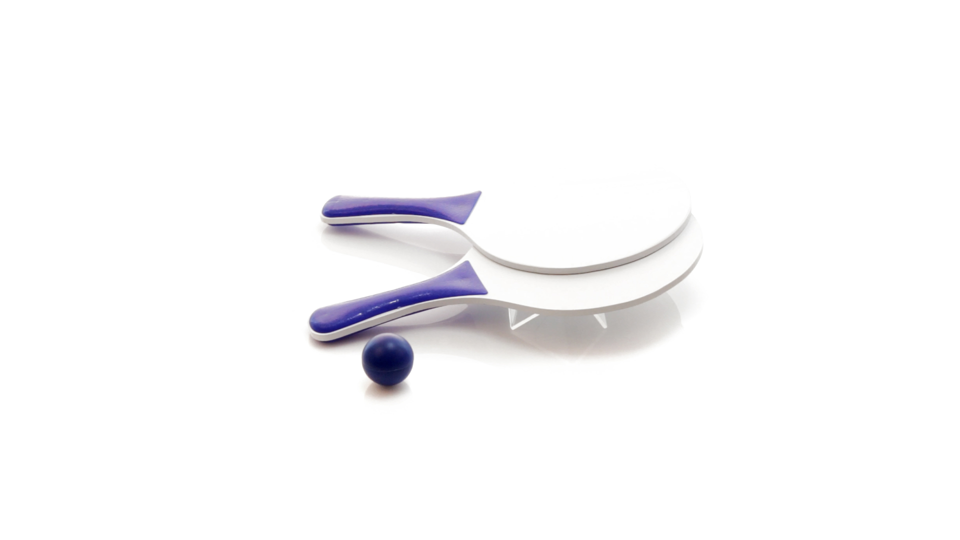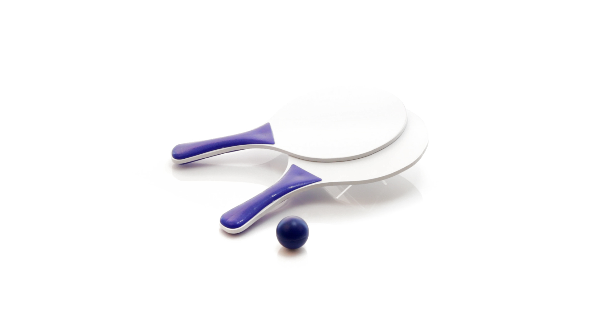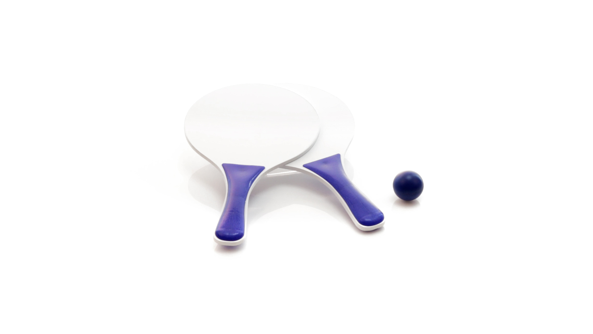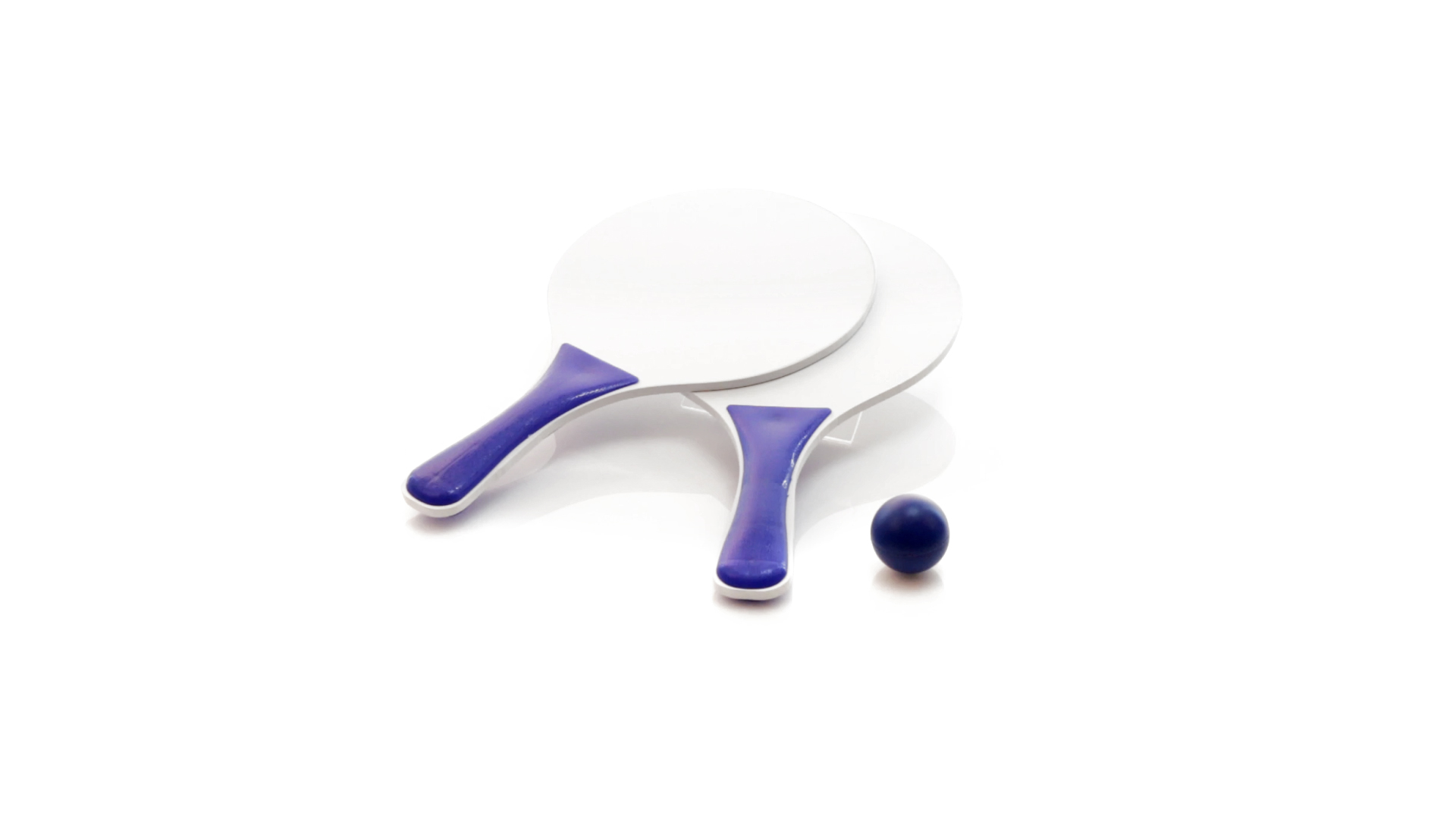 Beachball-Set mit zwei Schlägern aus Naturholz. Mit verstärkten Griffen in einer Vielzahl von lebendigen Farben. Präsentiert in einer Netztasche mit farblich passendem Ball.