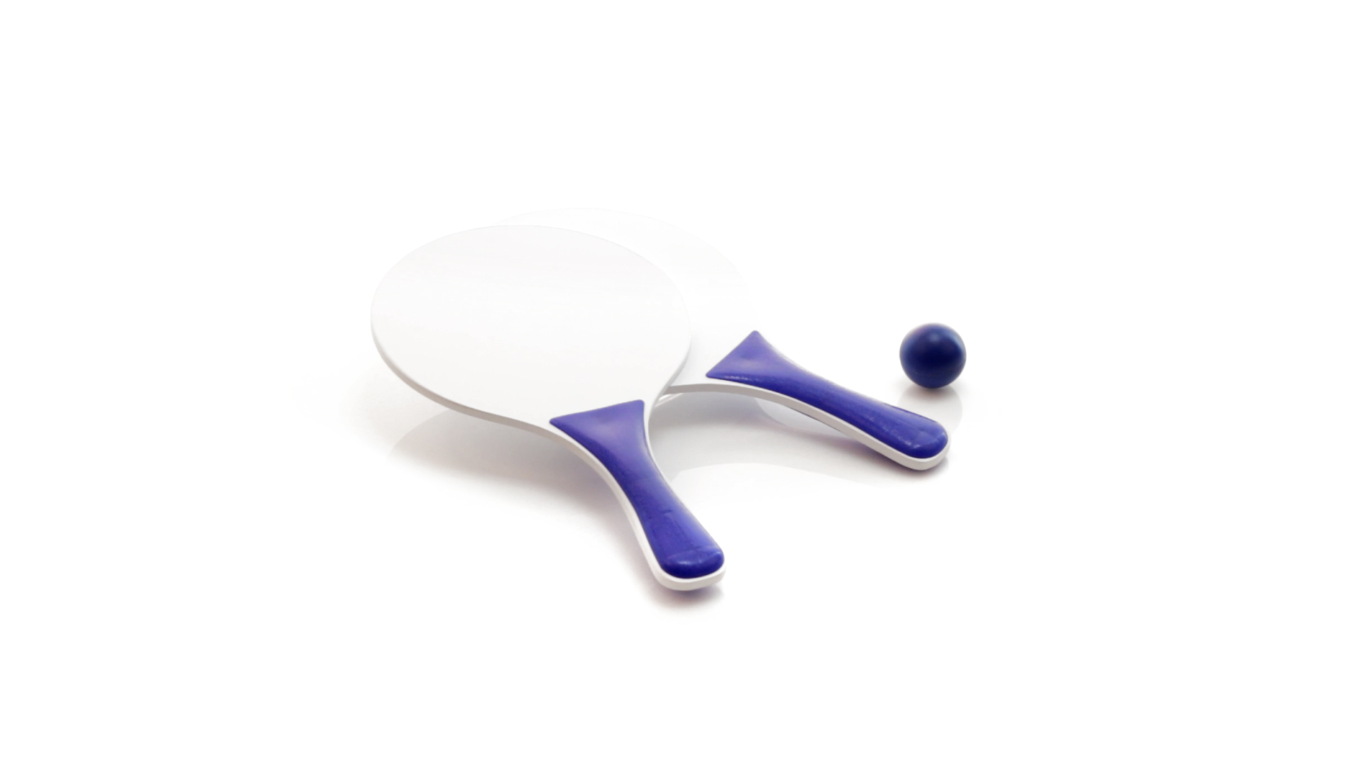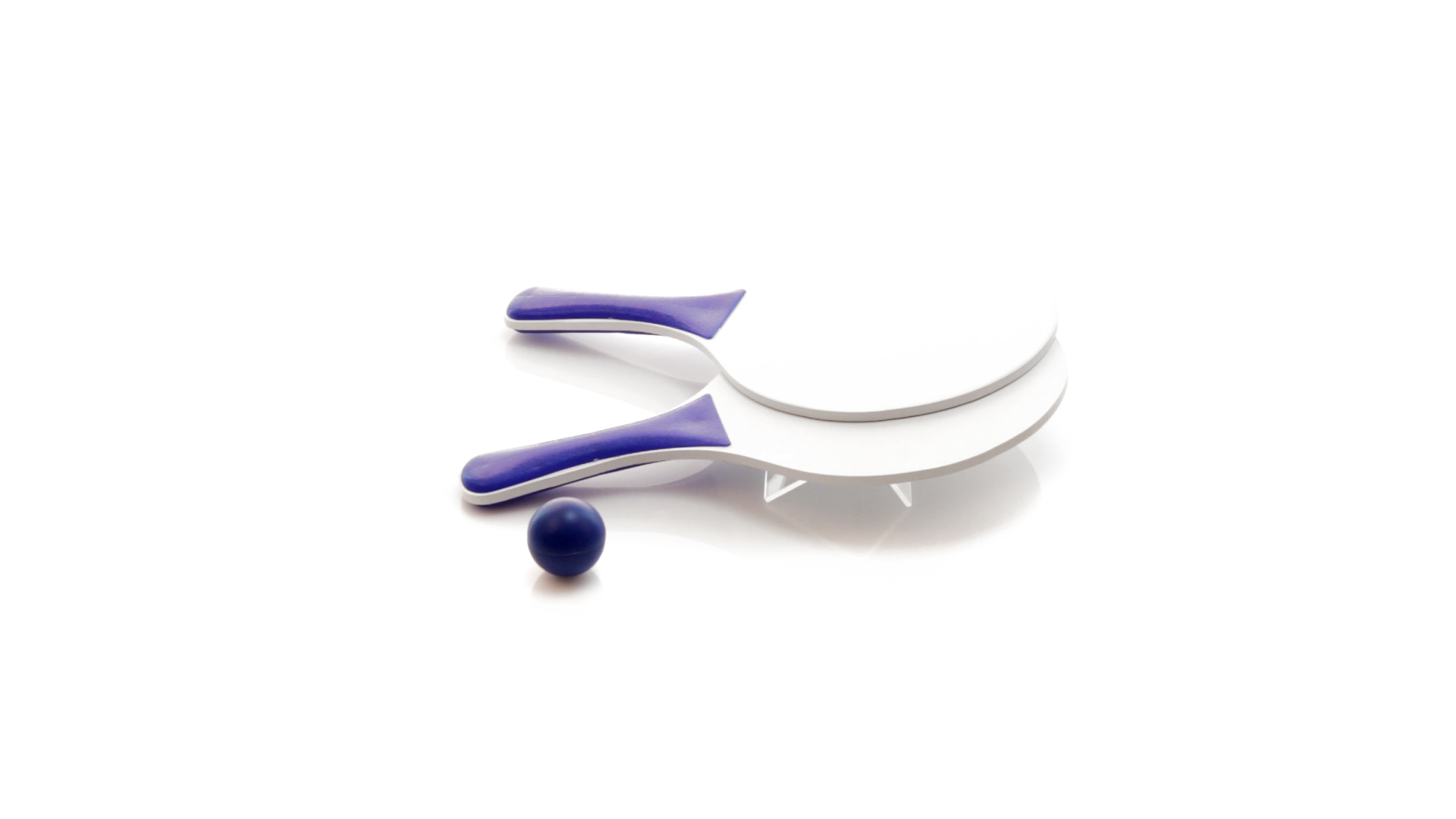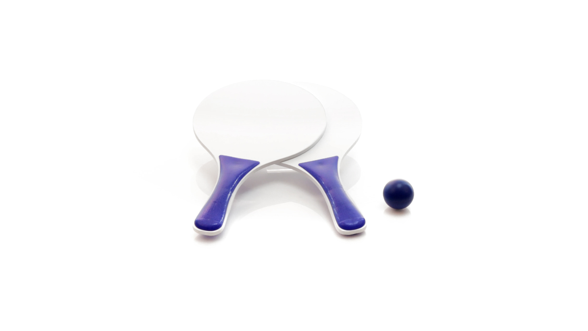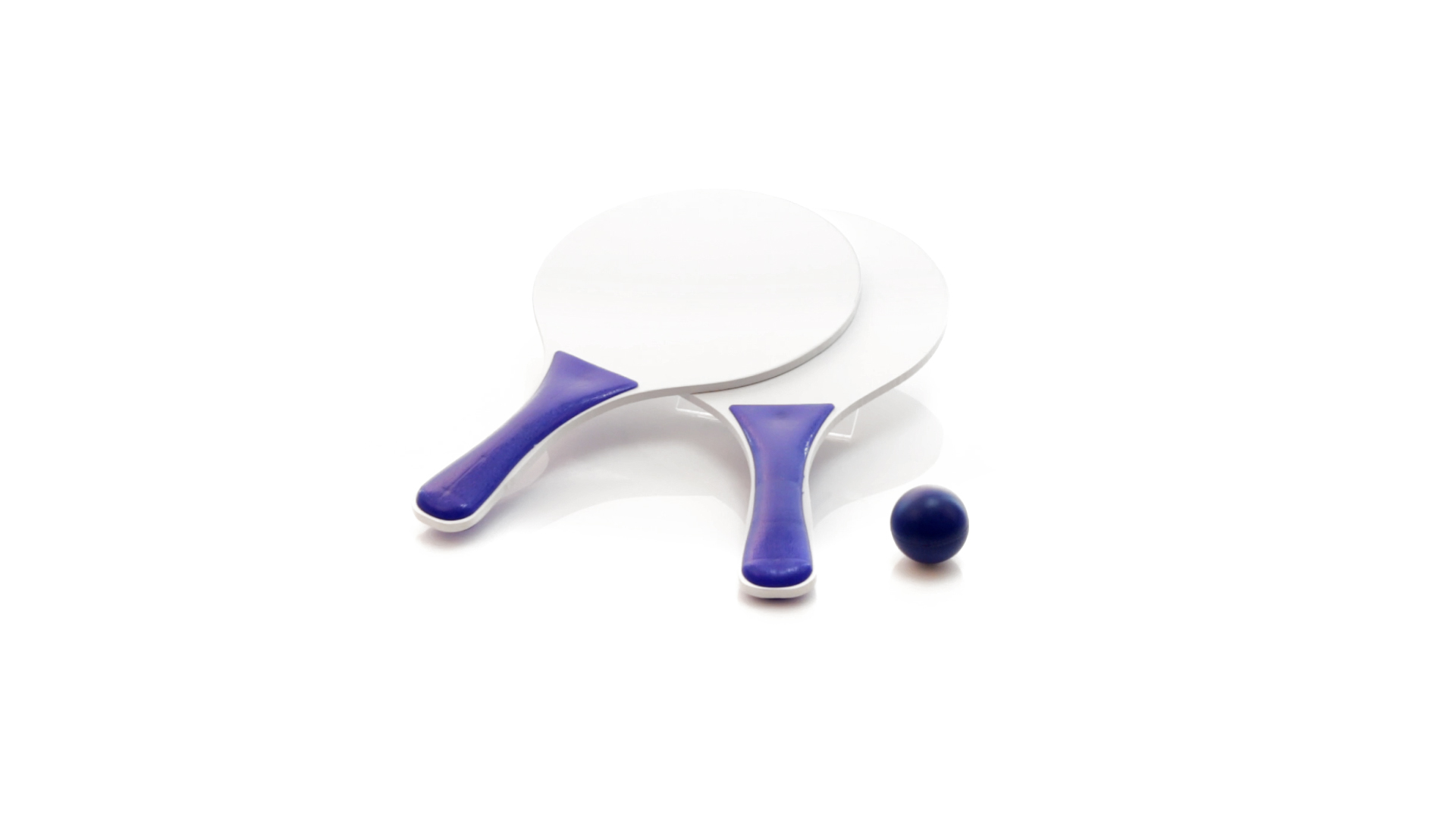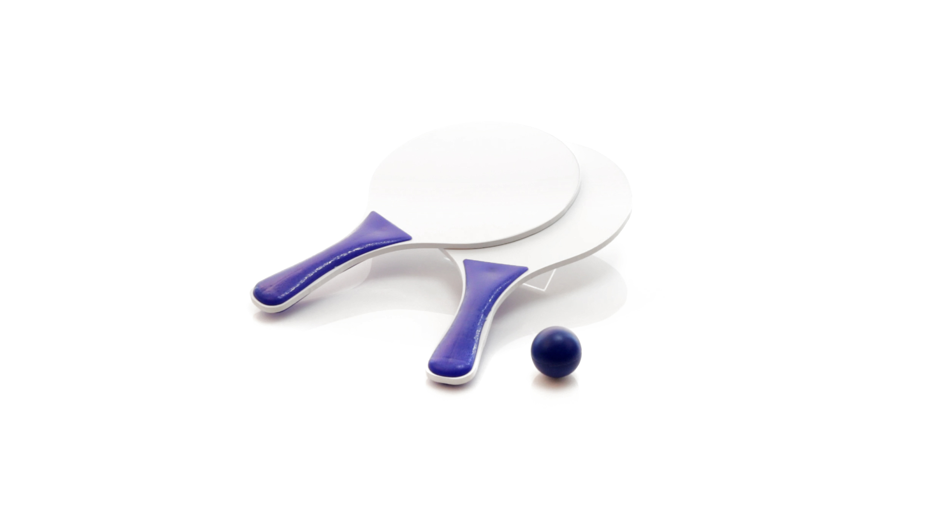 Beachball-Set mit zwei Schlägern aus Naturholz. Mit verstärkten Griffen in einer Vielzahl von lebendigen Farben. Präsentiert in einer Netztasche mit farblich passendem Ball.