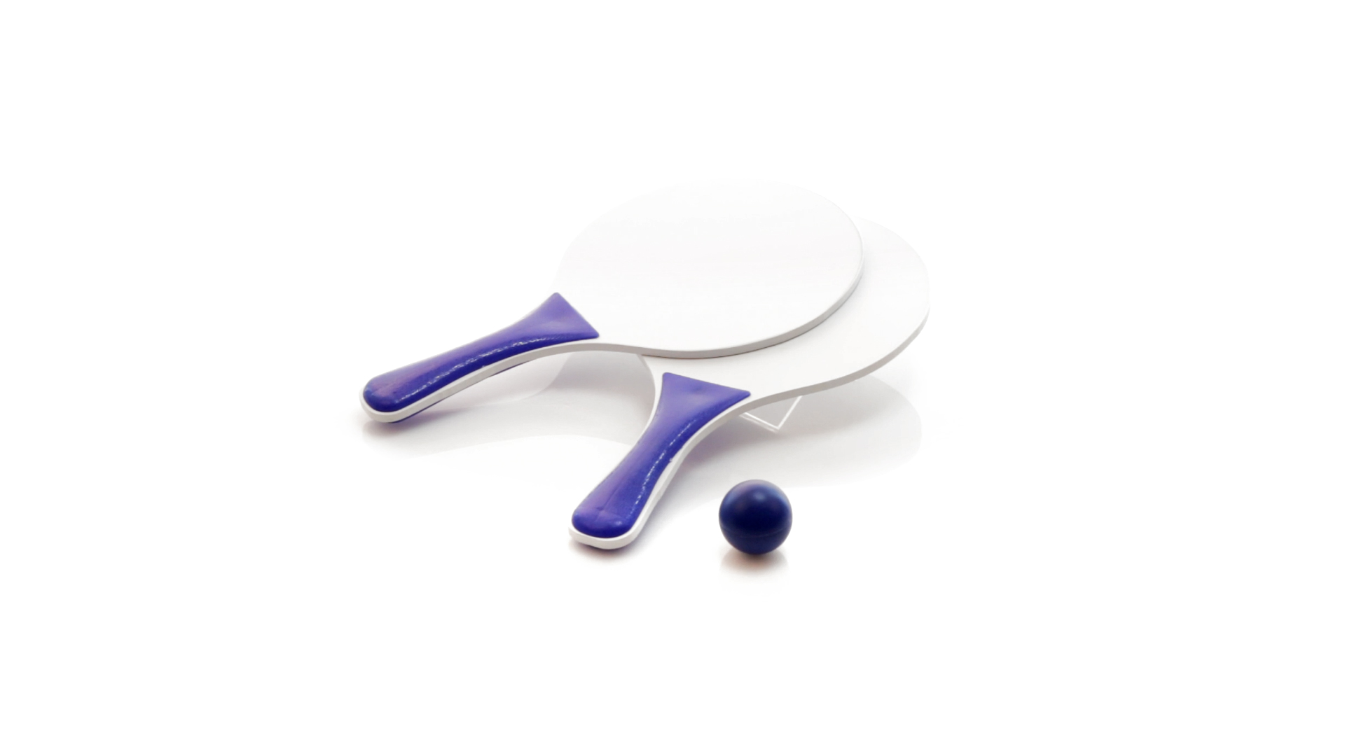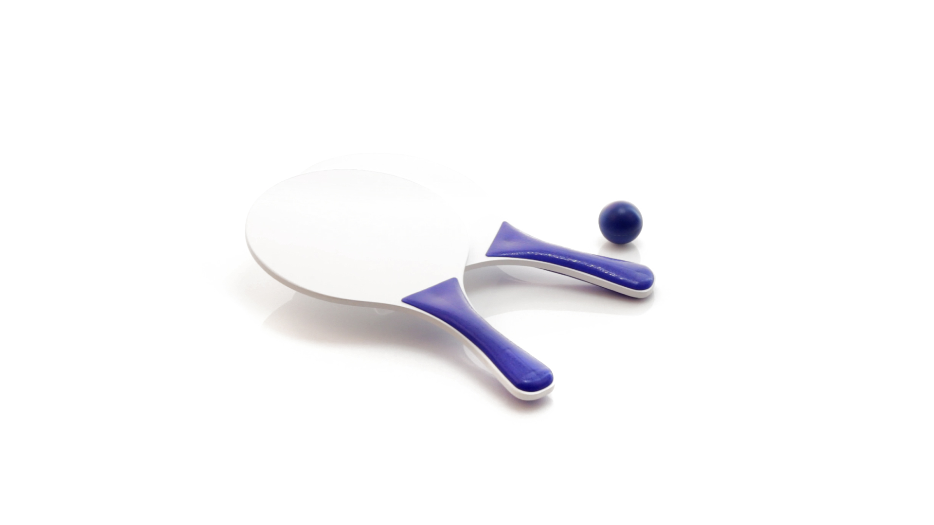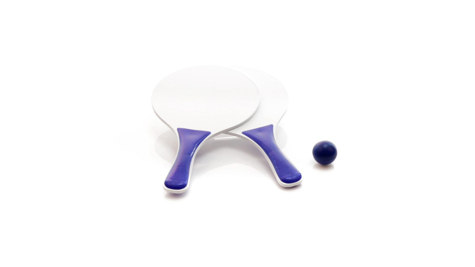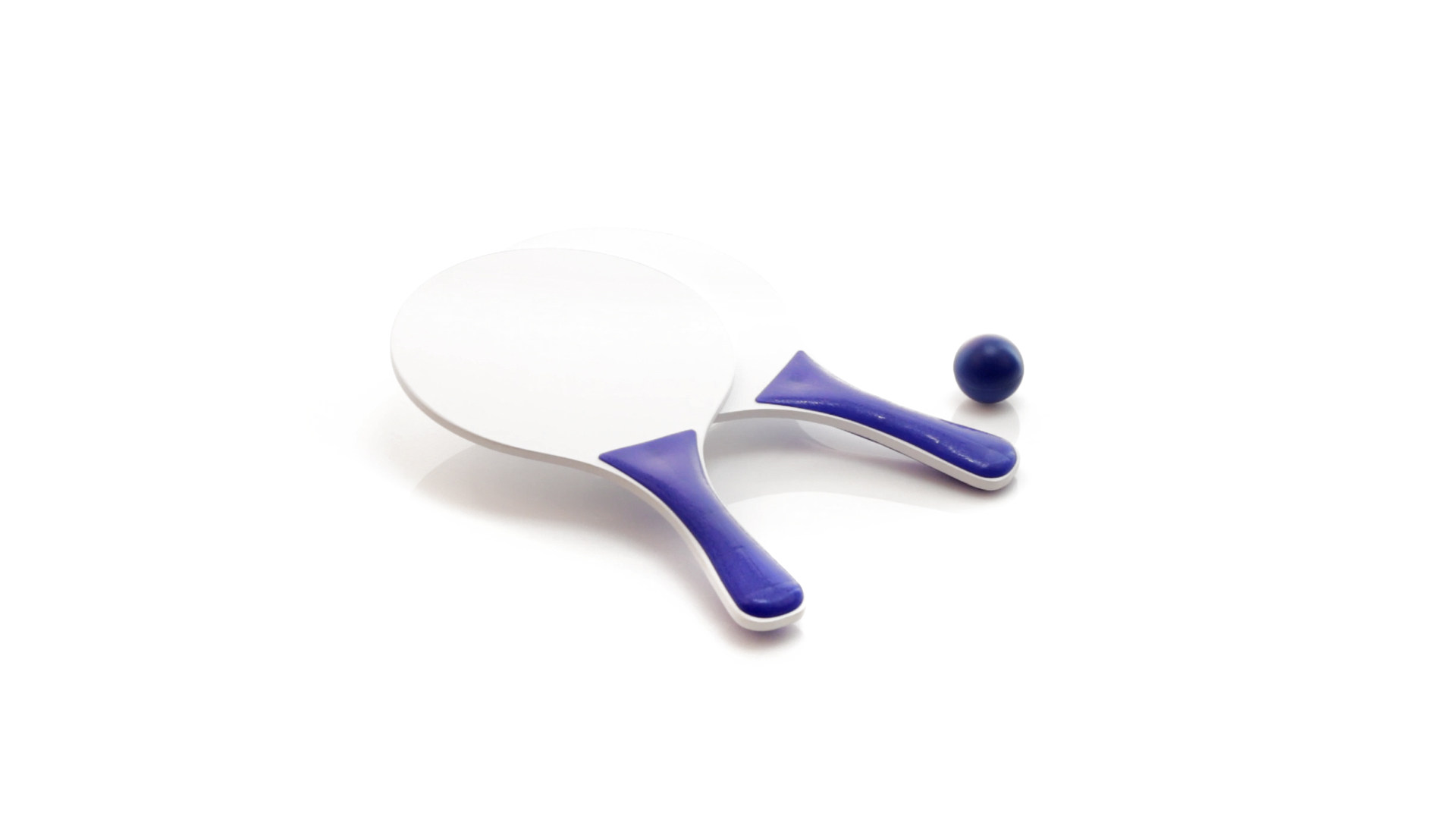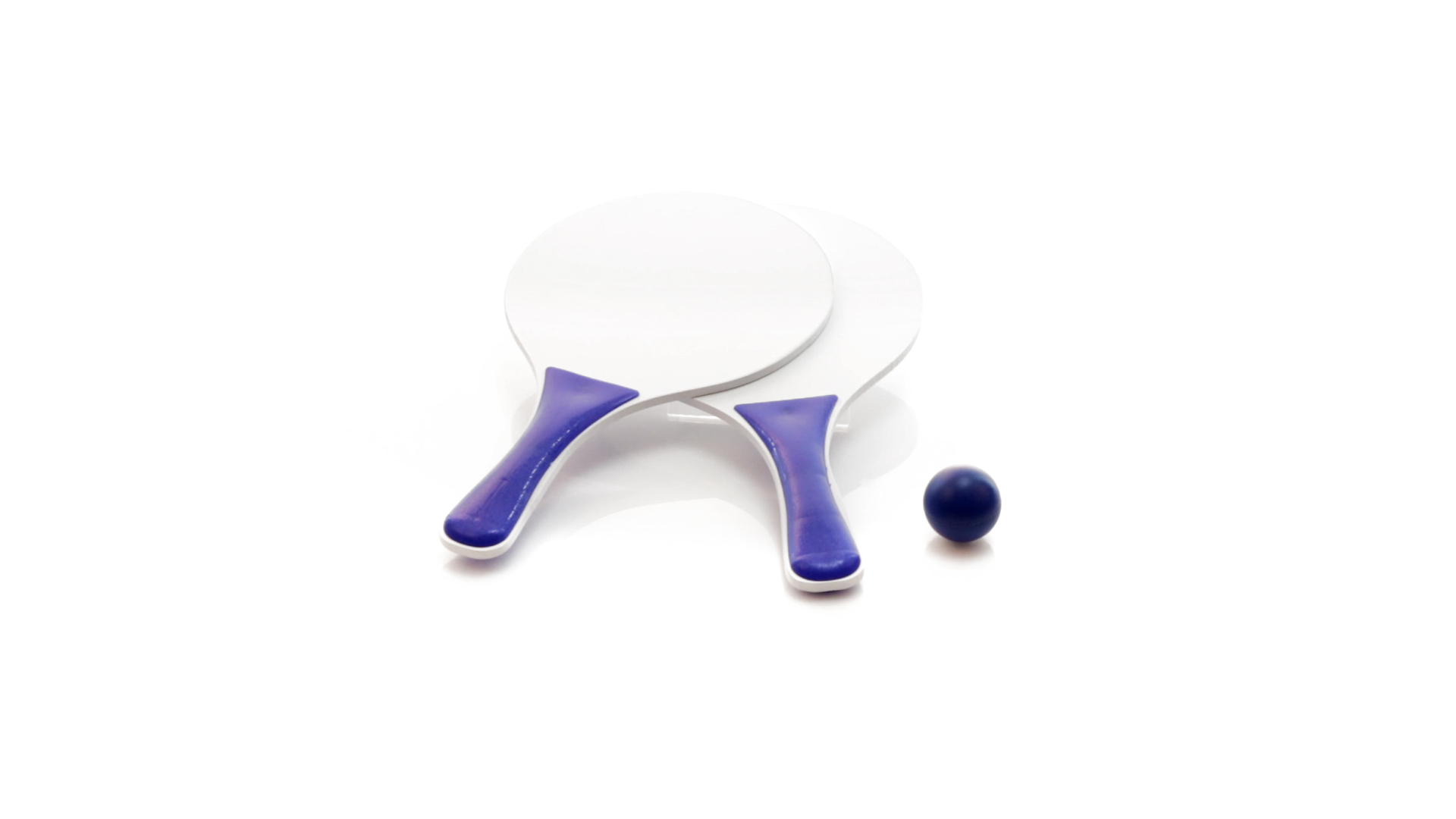 Beachball-Set mit zwei Schlägern aus Naturholz. Mit verstärkten Griffen in einer Vielzahl von lebendigen Farben. Präsentiert in einer Netztasche mit farblich passendem Ball.