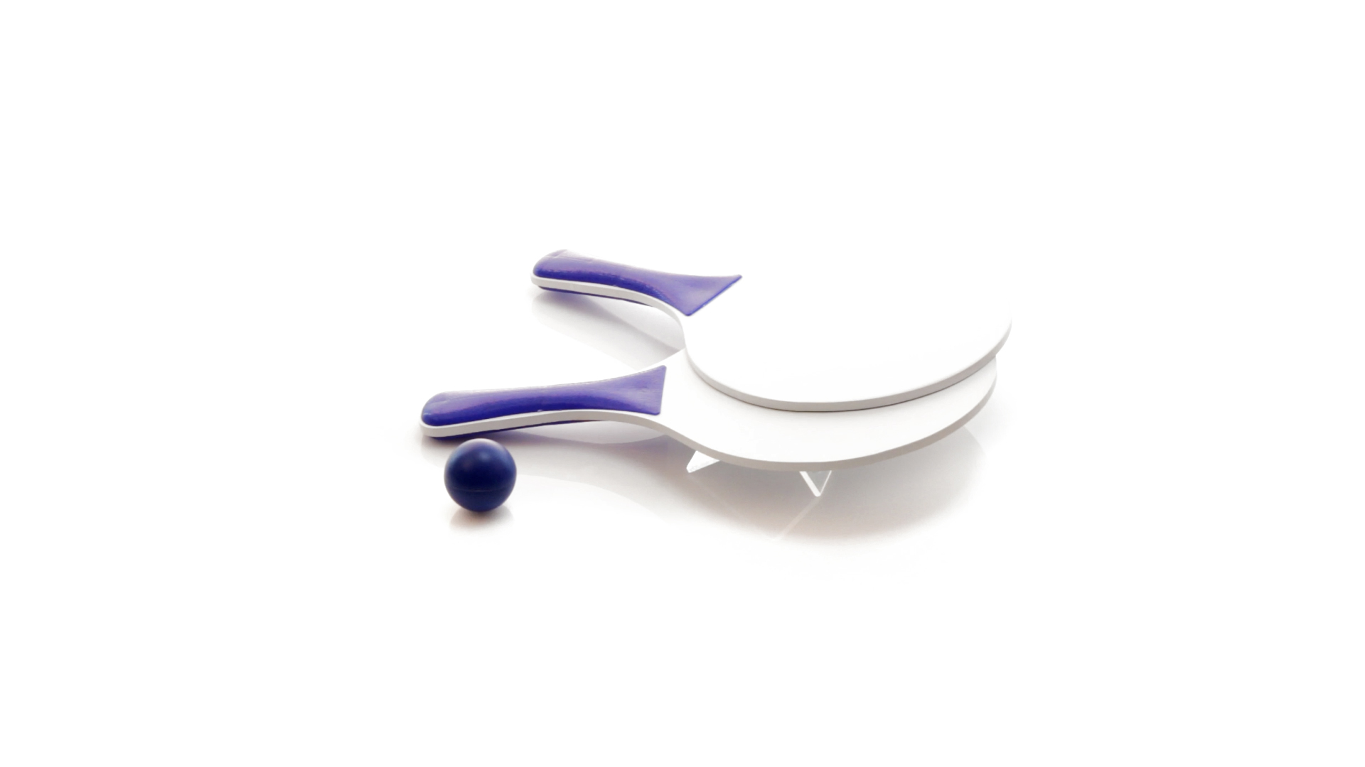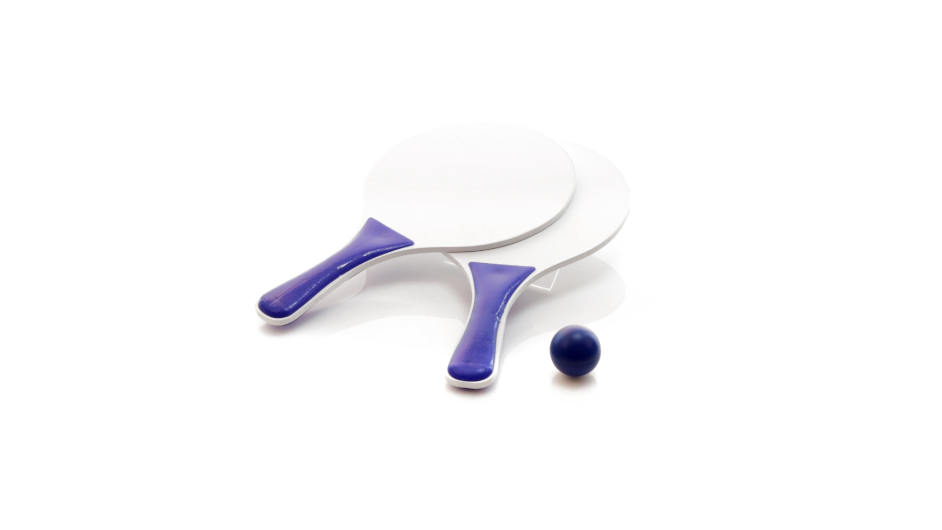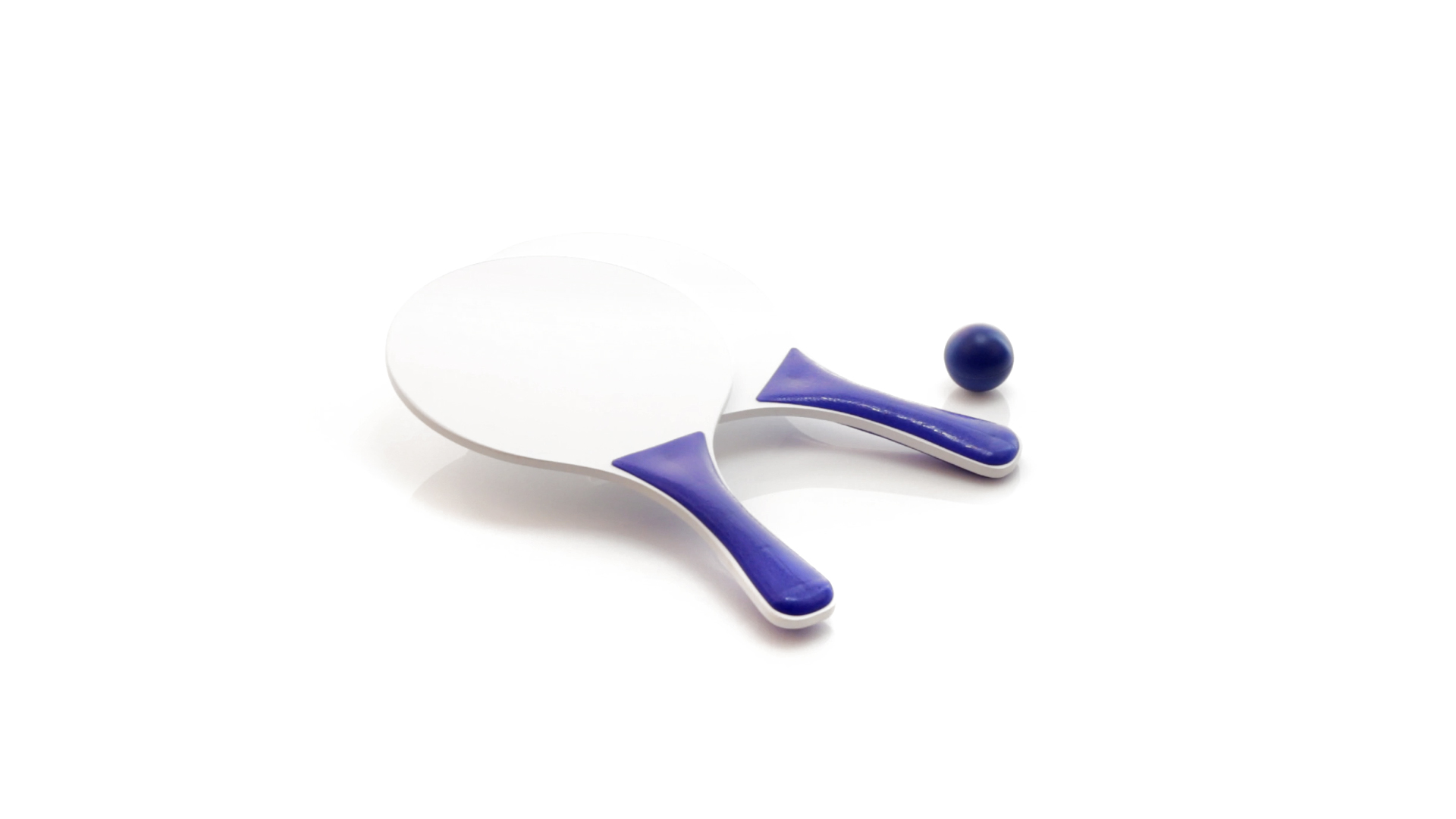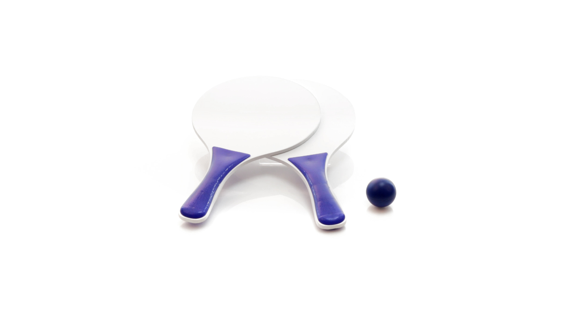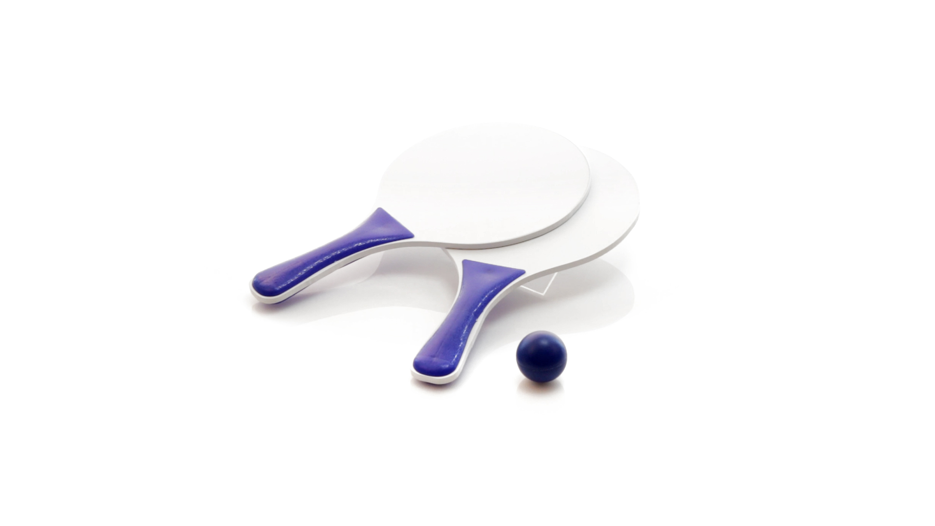 Beachball-Set mit zwei Schlägern aus Naturholz. Mit verstärkten Griffen in einer Vielzahl von lebendigen Farben. Präsentiert in einer Netztasche mit farblich passendem Ball.