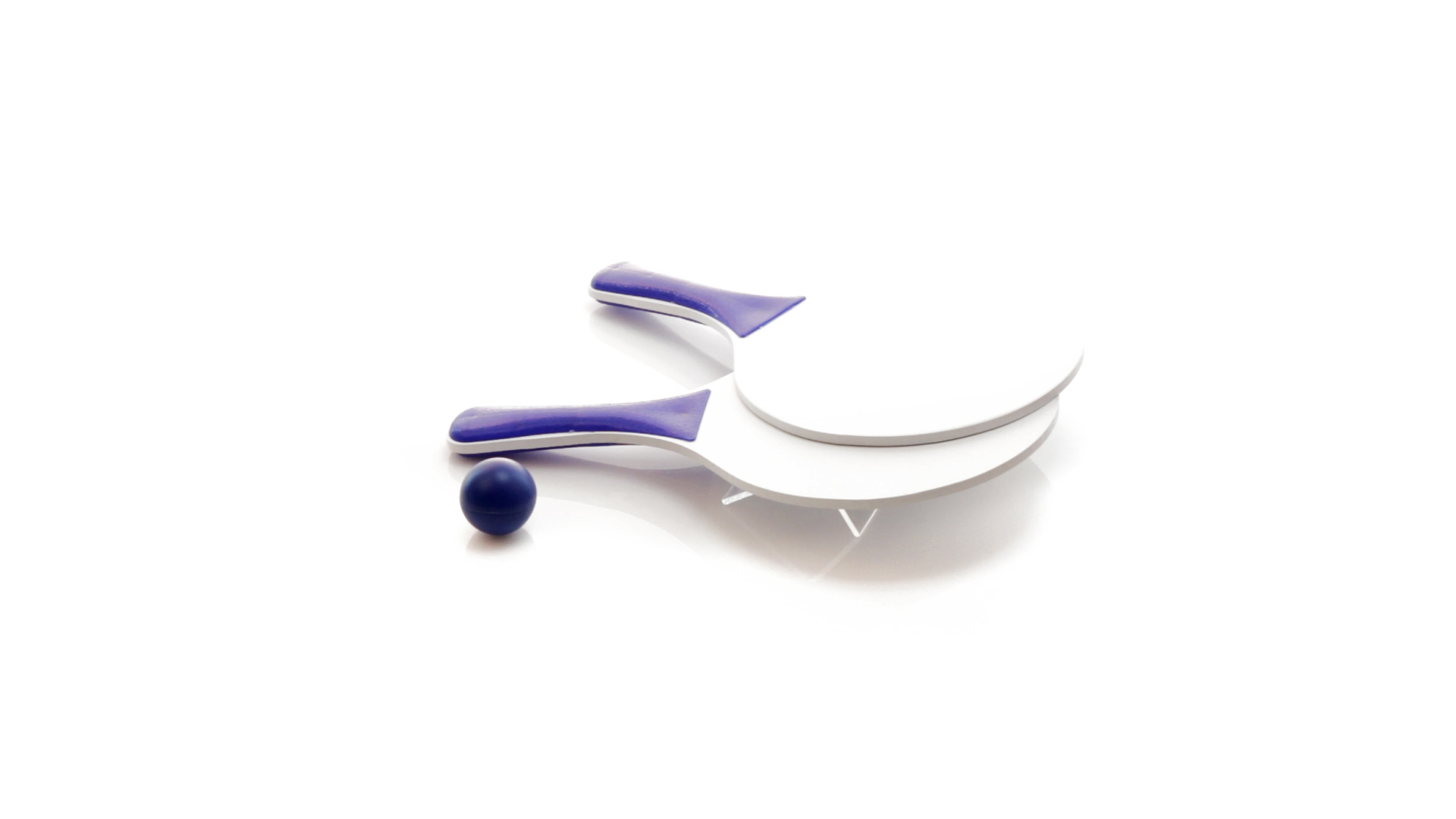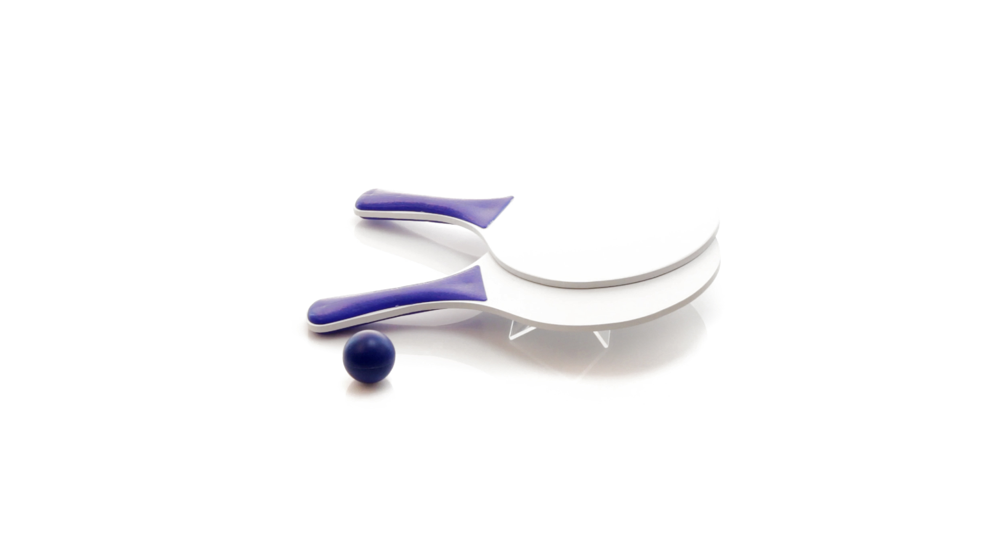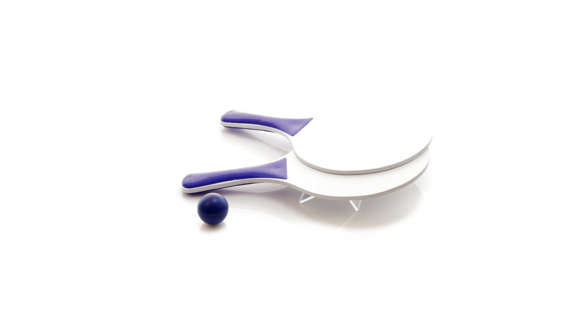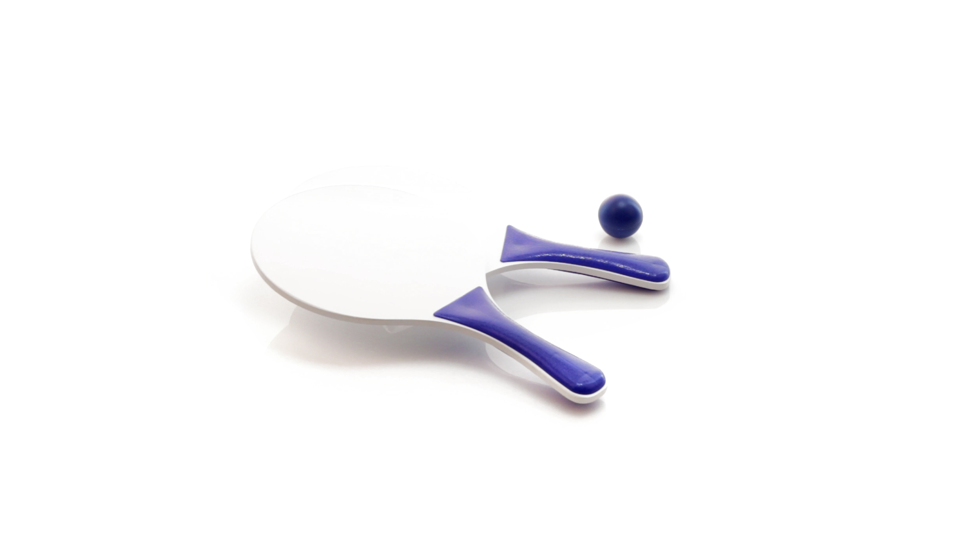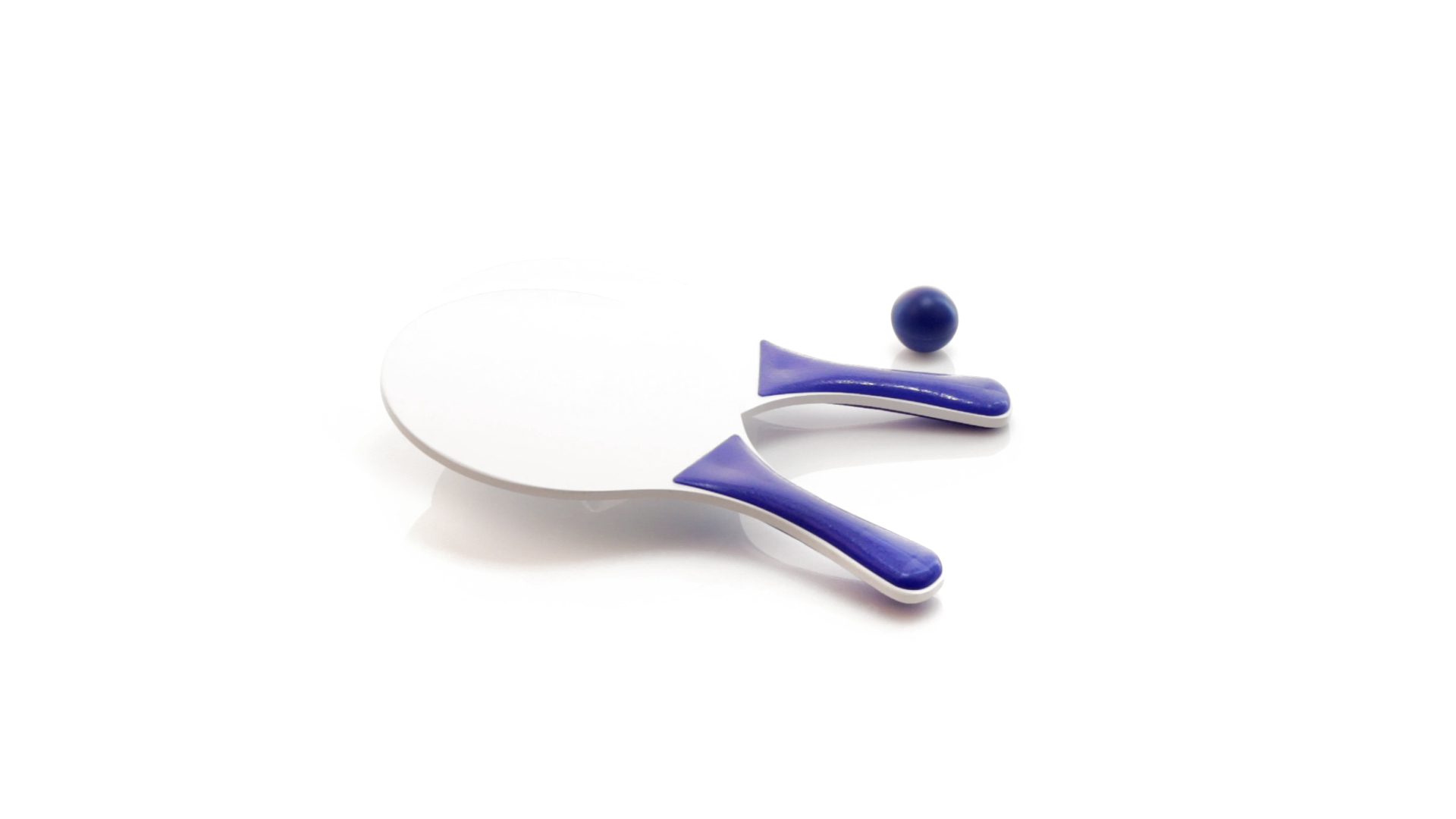 Beachball-Set mit zwei Schlägern aus Naturholz. Mit verstärkten Griffen in einer Vielzahl von lebendigen Farben. Präsentiert in einer Netztasche mit farblich passendem Ball.