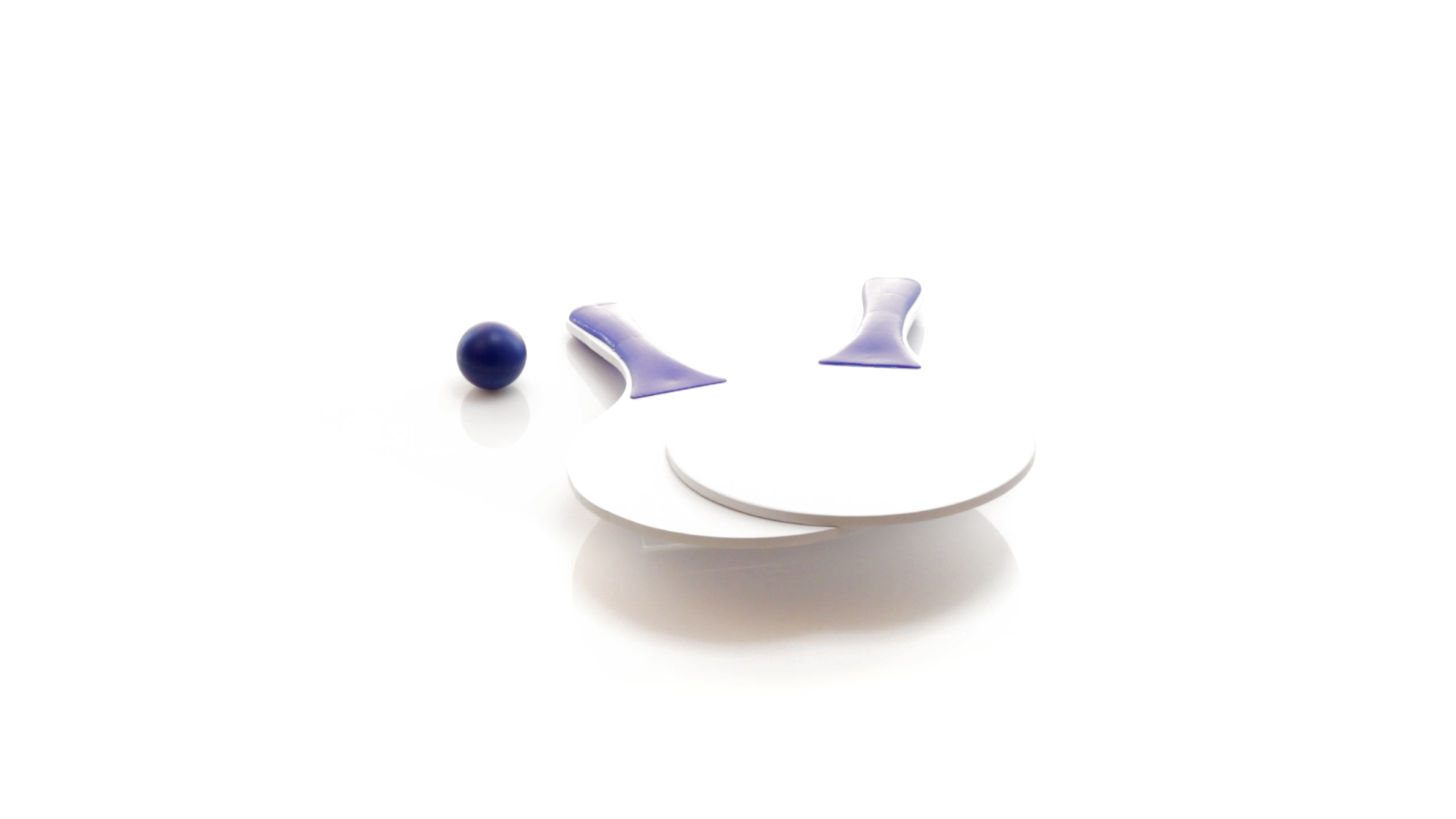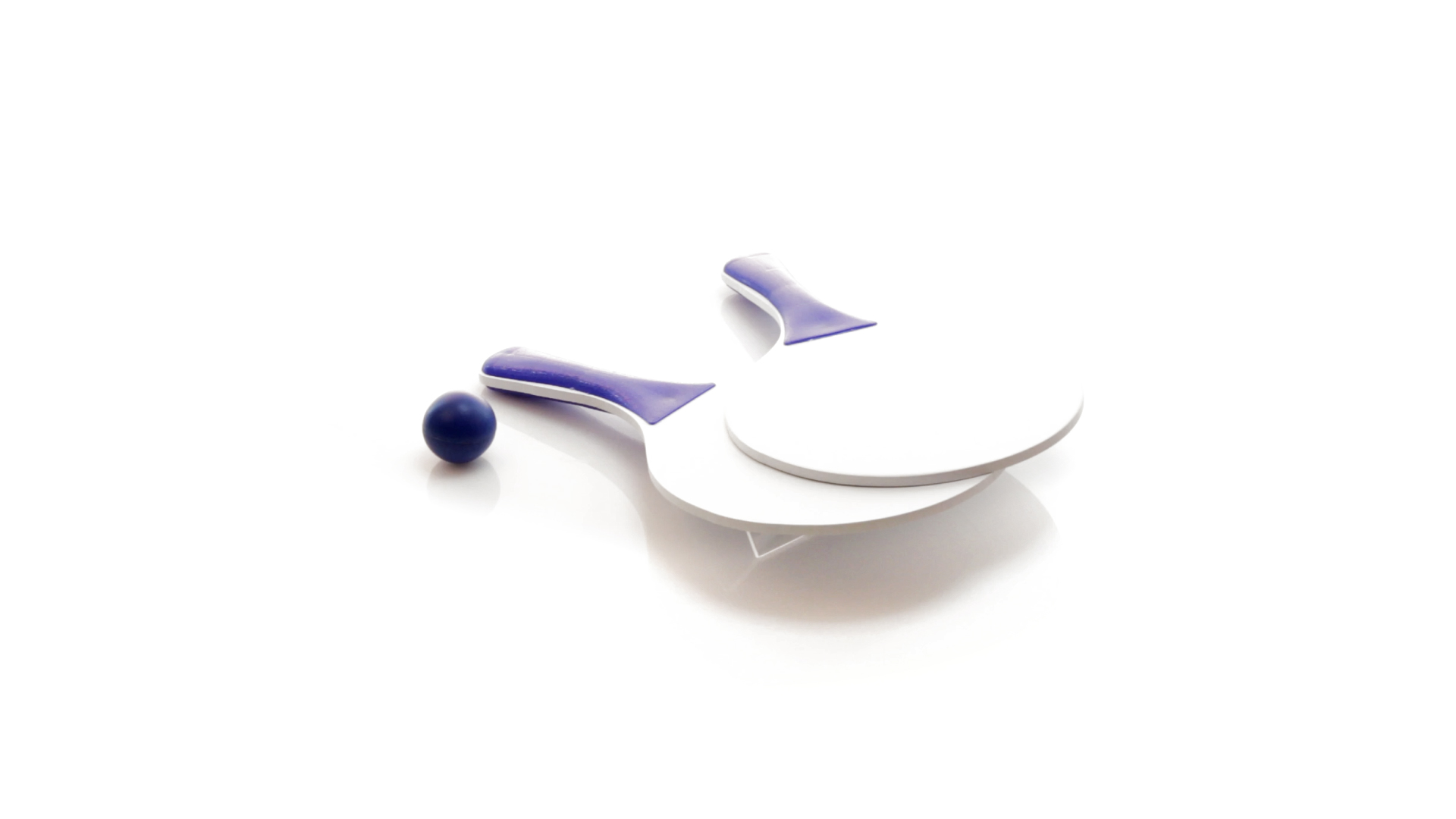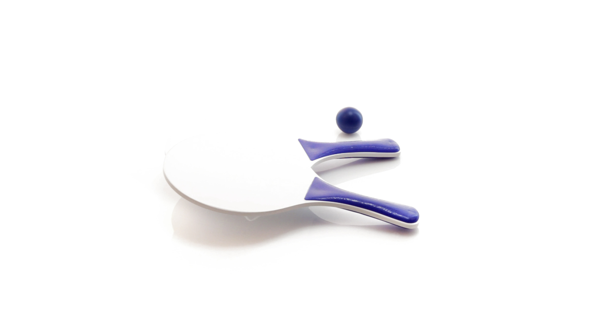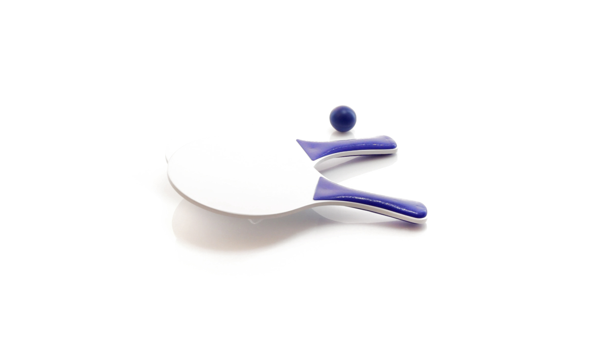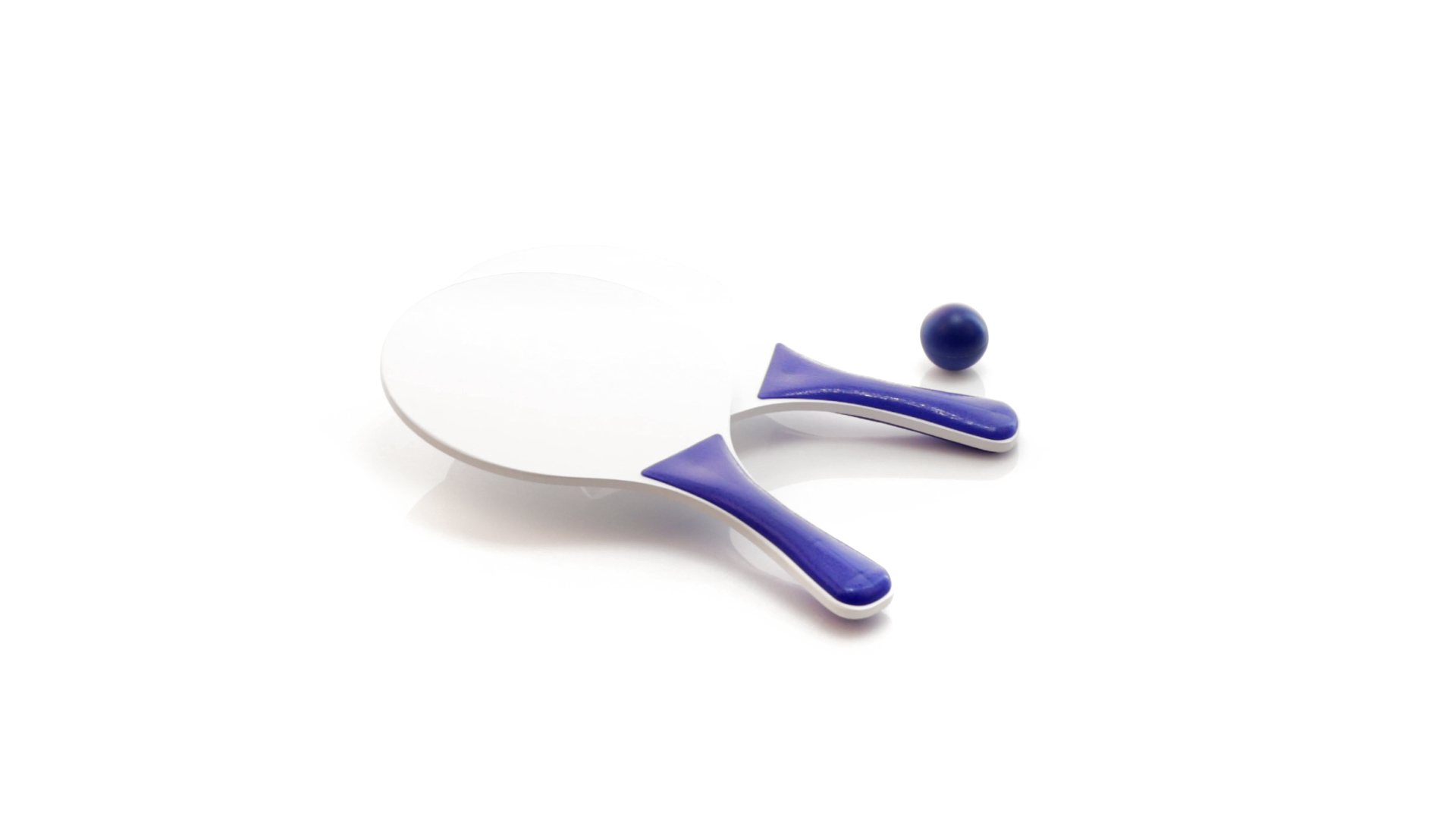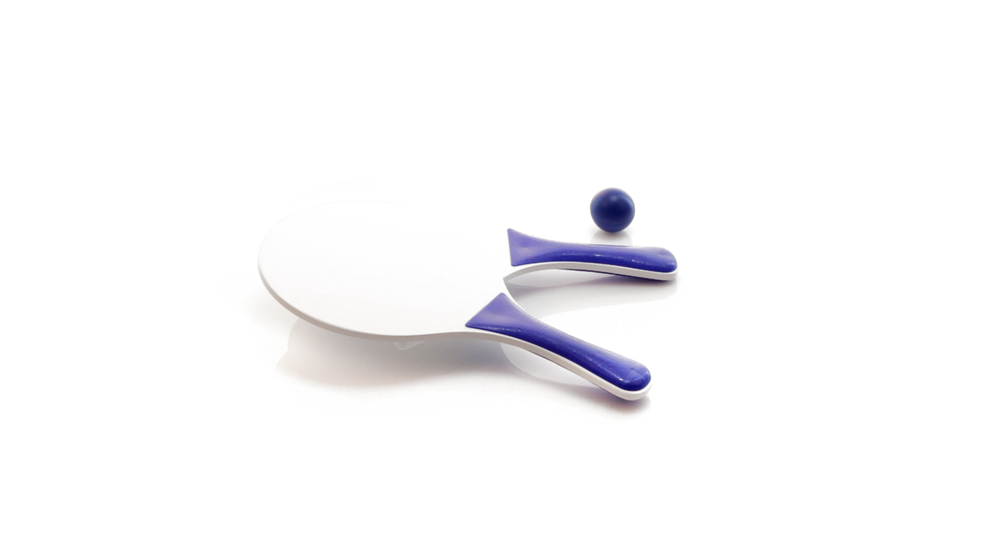 Beachball-Set mit zwei Schlägern aus Naturholz. Mit verstärkten Griffen in einer Vielzahl von lebendigen Farben. Präsentiert in einer Netztasche mit farblich passendem Ball.