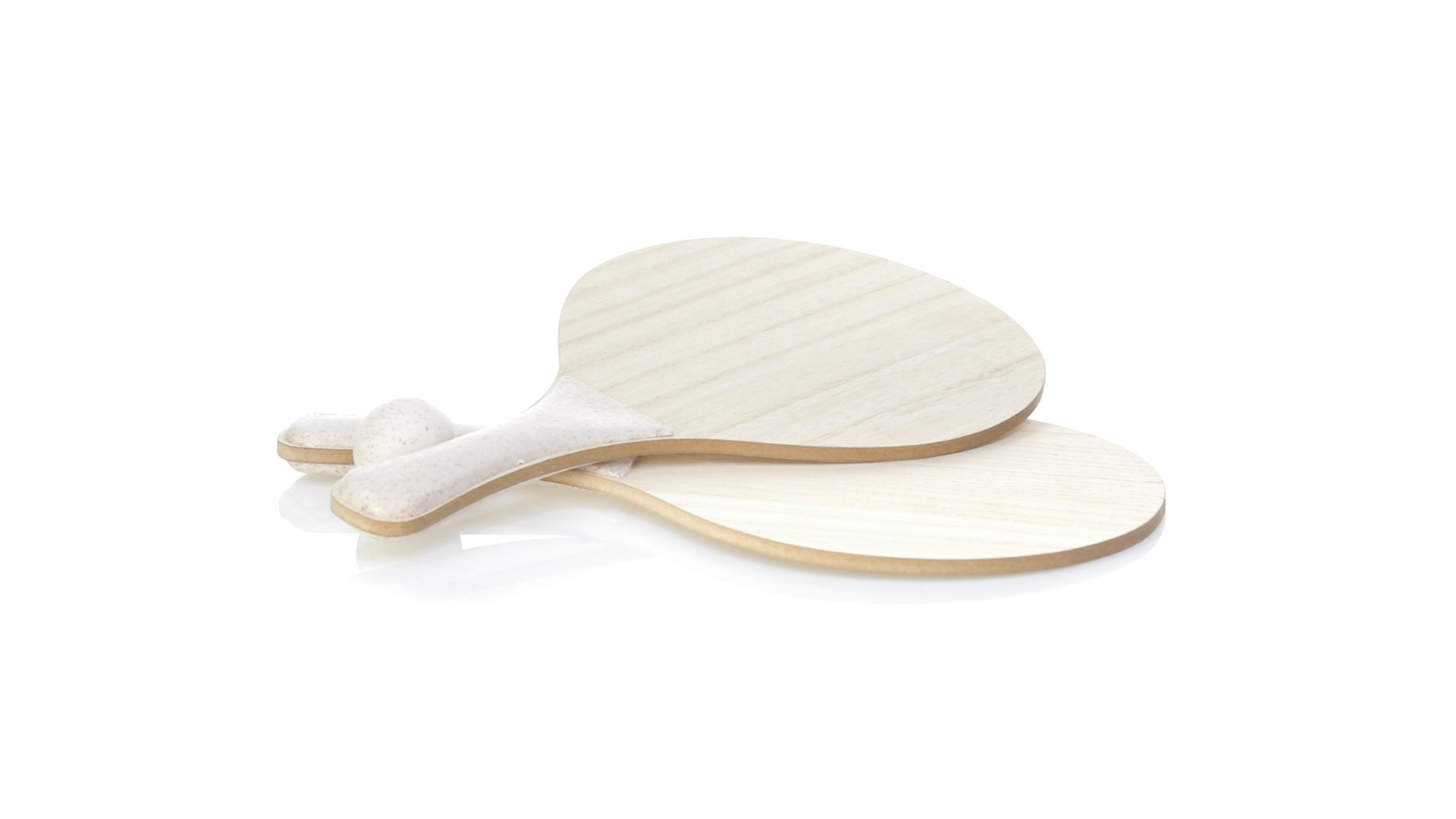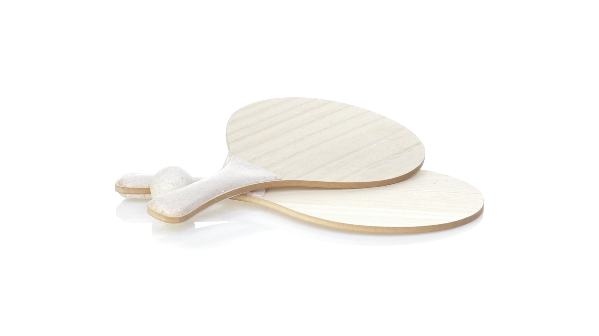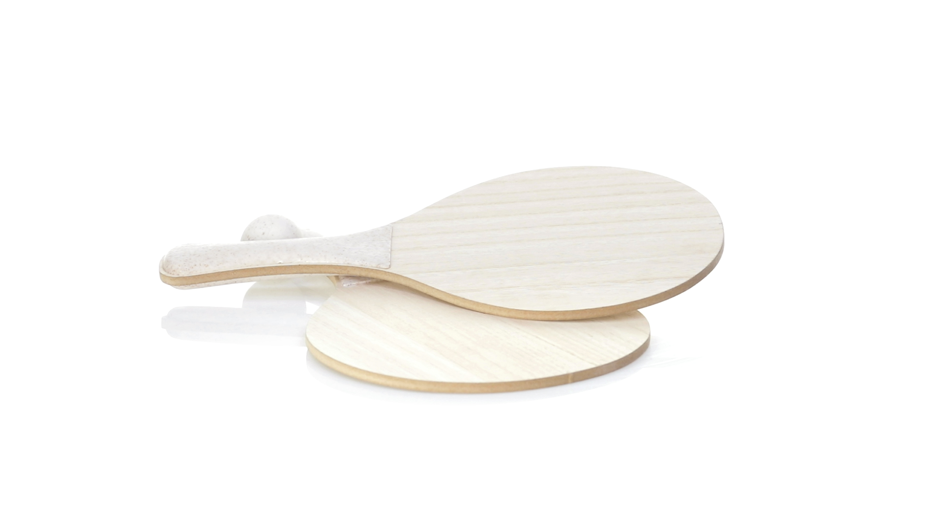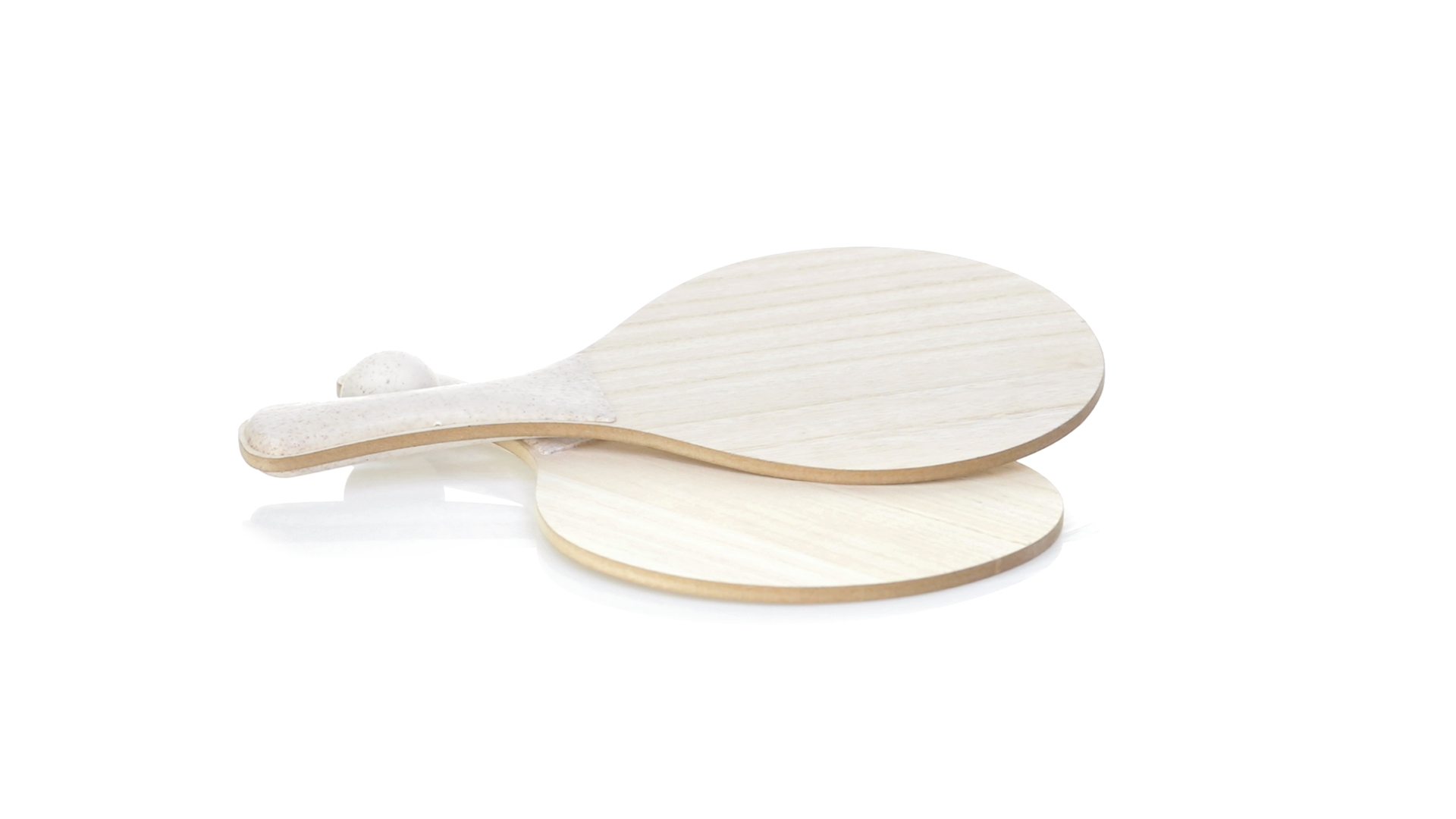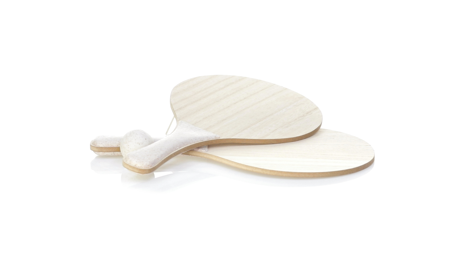 Linie "Natur" Ein Paar Beachschläger. Hergestellt aus Holz, mit verstärktem Weizenstrohgriff. Präsentiert in einer Netztasche, inkl. eines Weizenstrohballs. Emblem auf dem Griff.