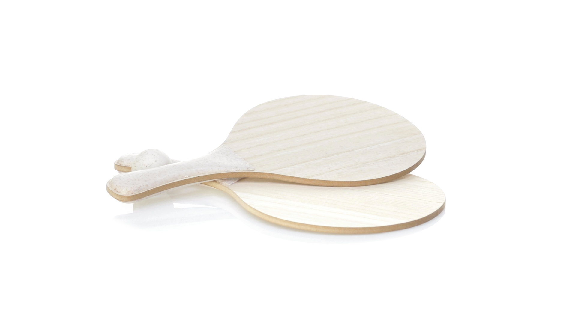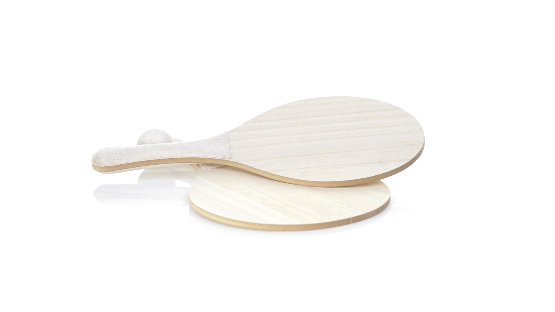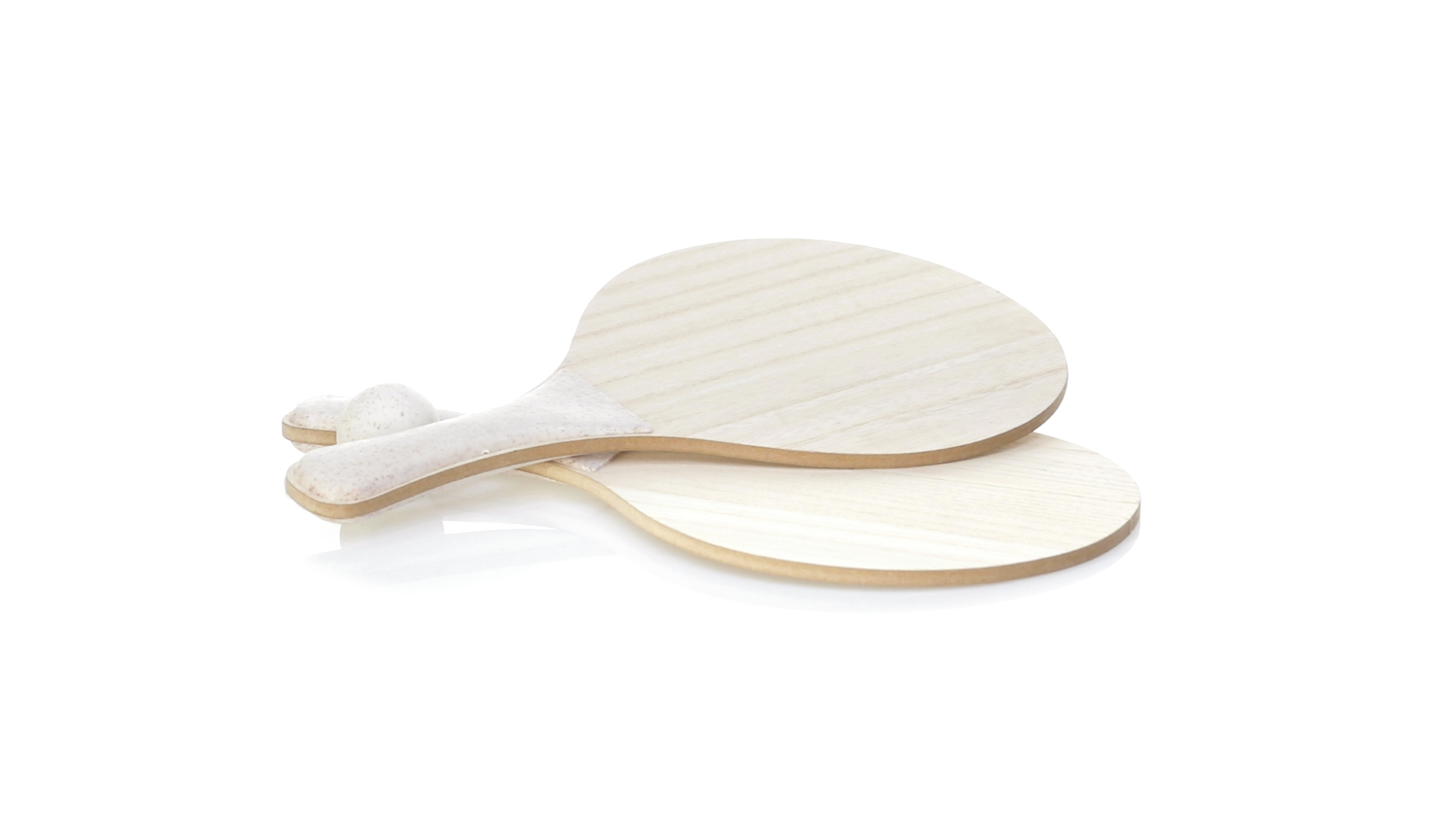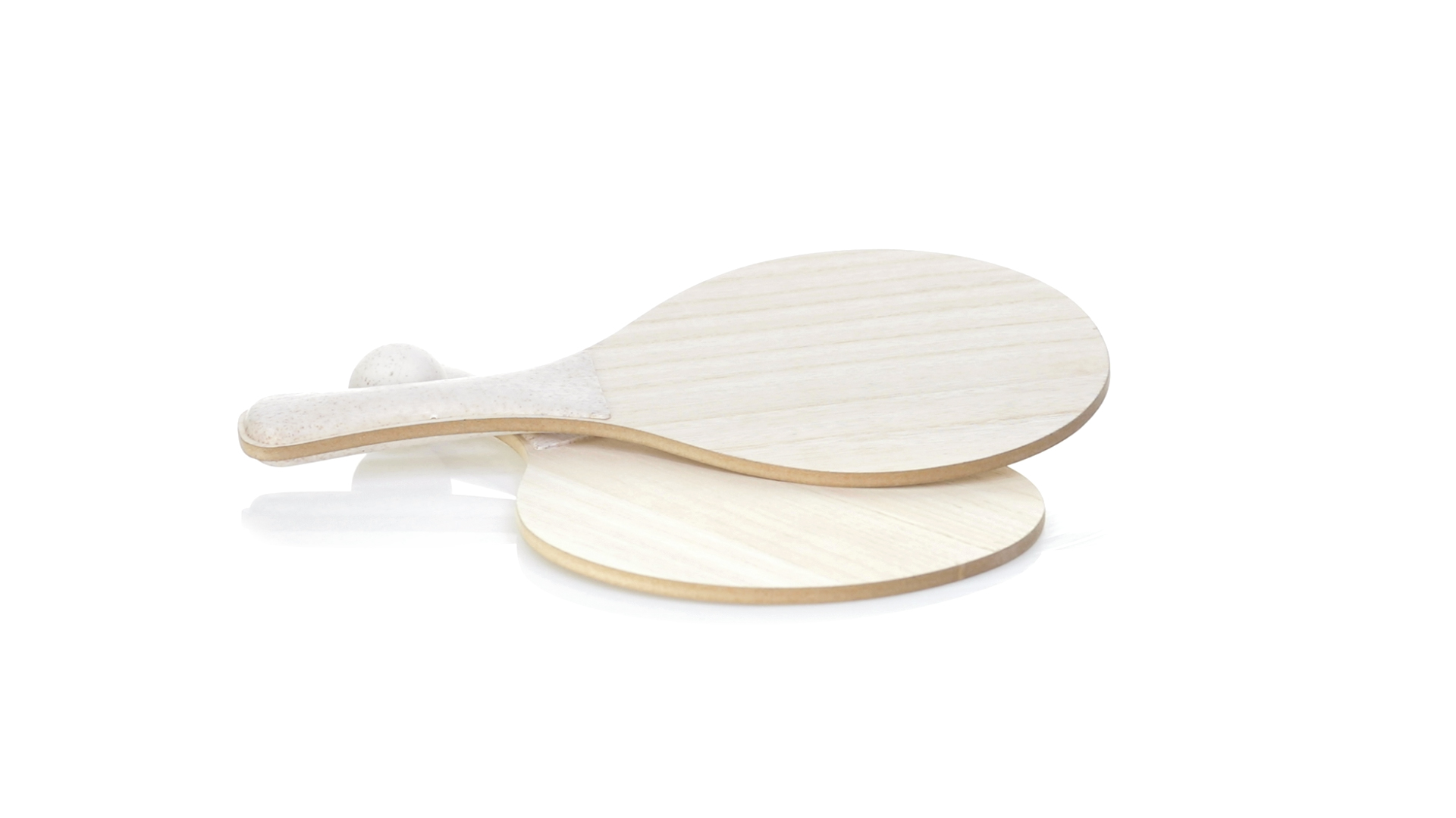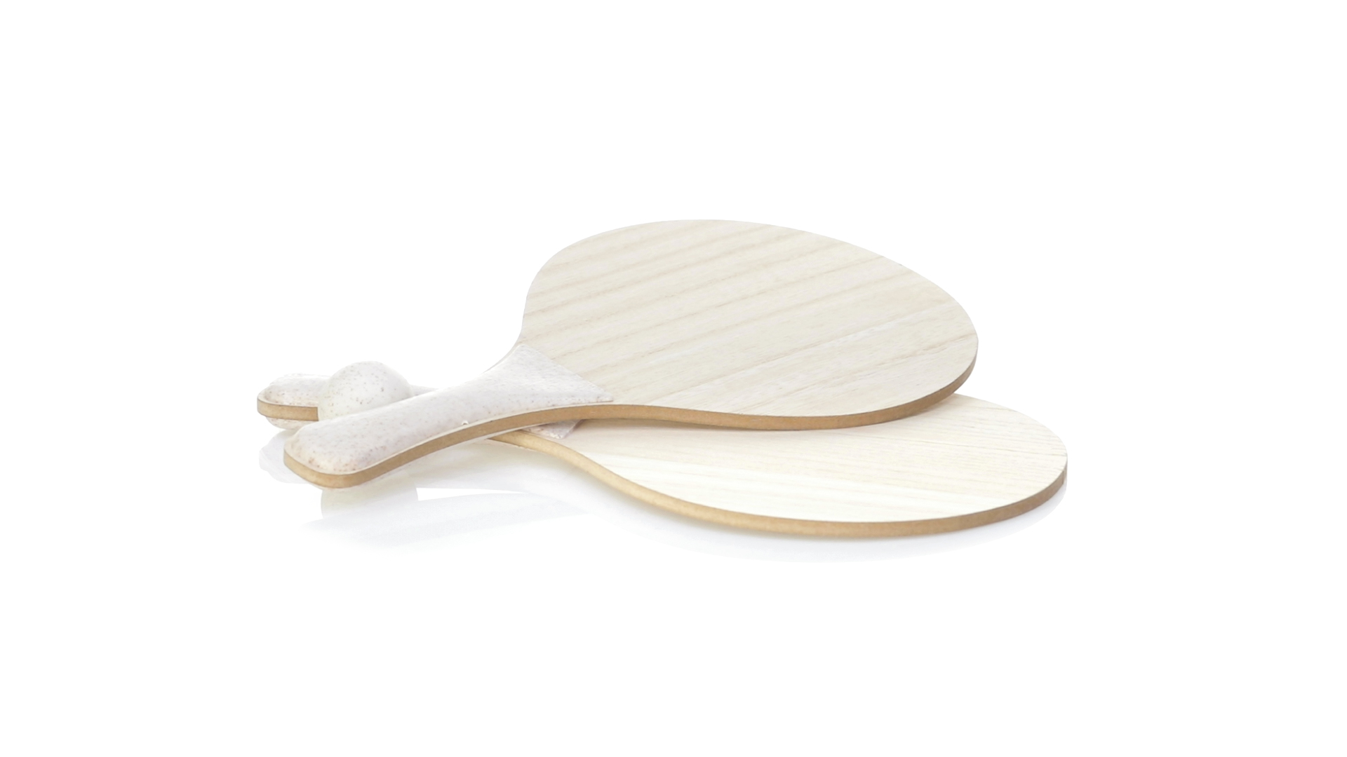 Linie "Natur" Ein Paar Beachschläger. Hergestellt aus Holz, mit verstärktem Weizenstrohgriff. Präsentiert in einer Netztasche, inkl. eines Weizenstrohballs. Emblem auf dem Griff.