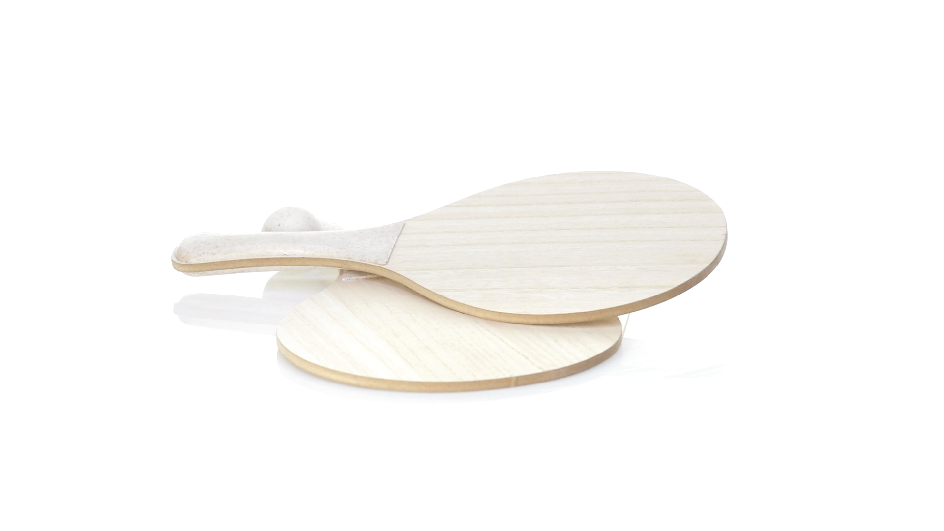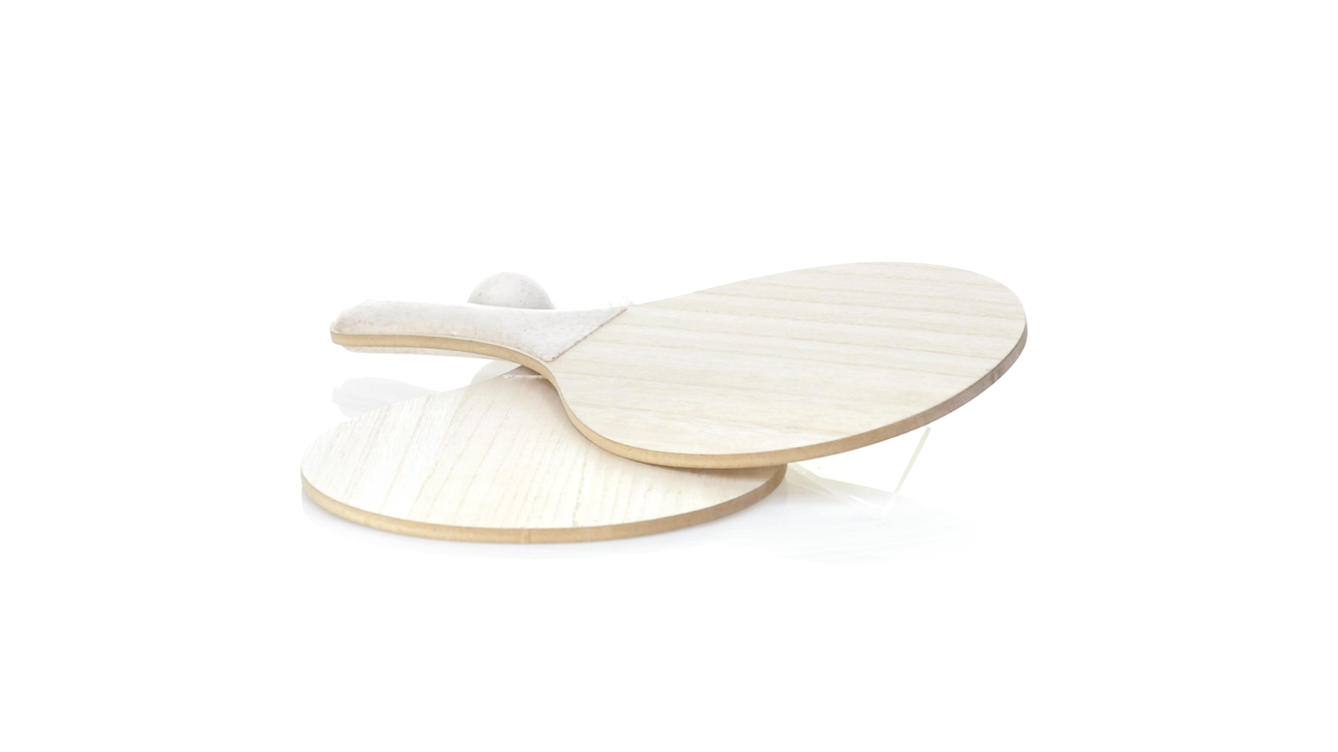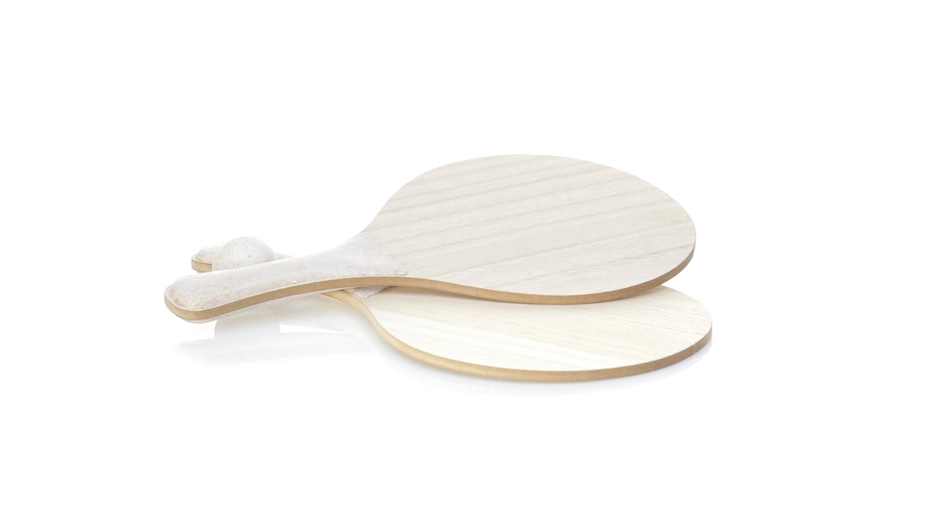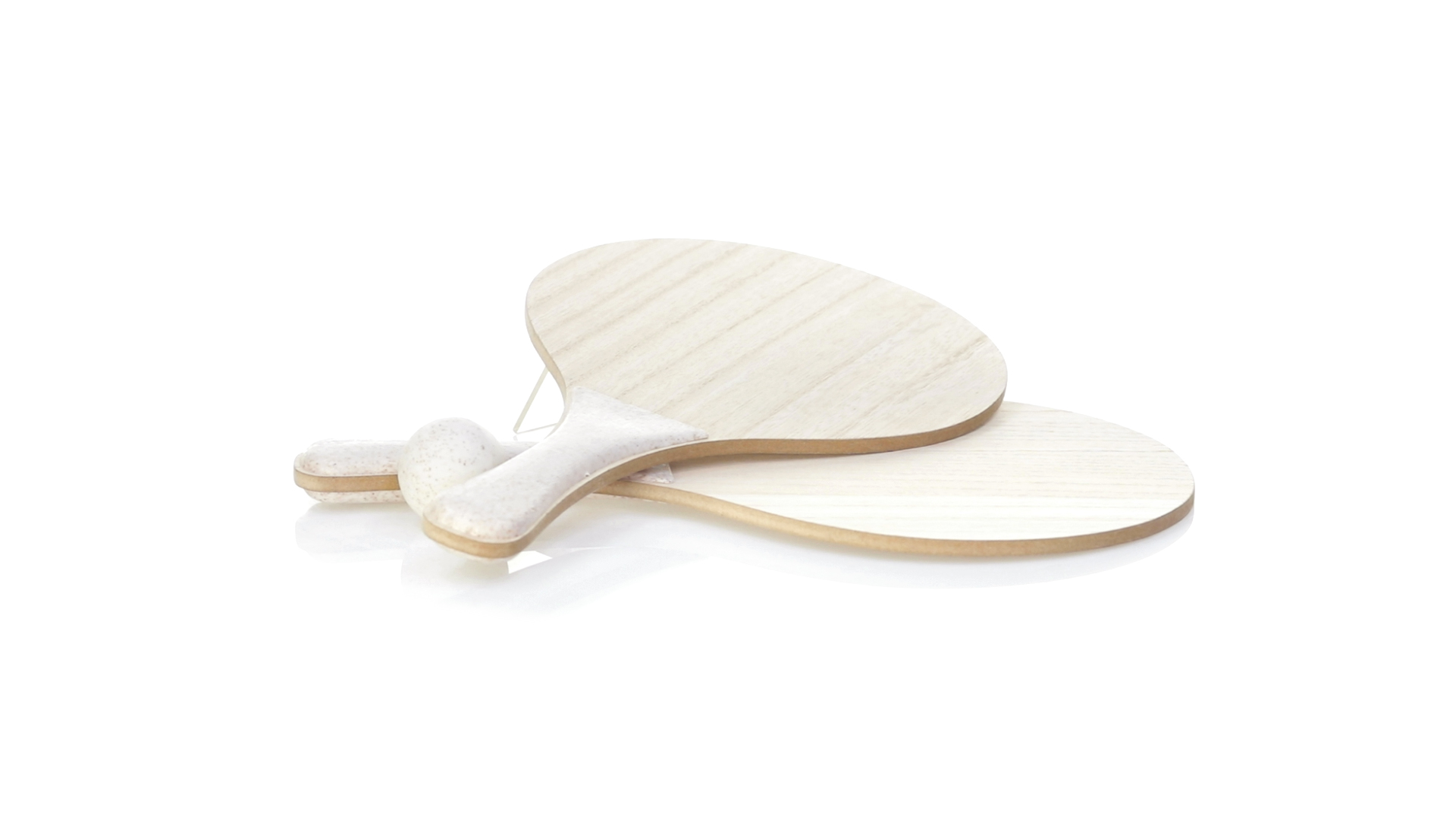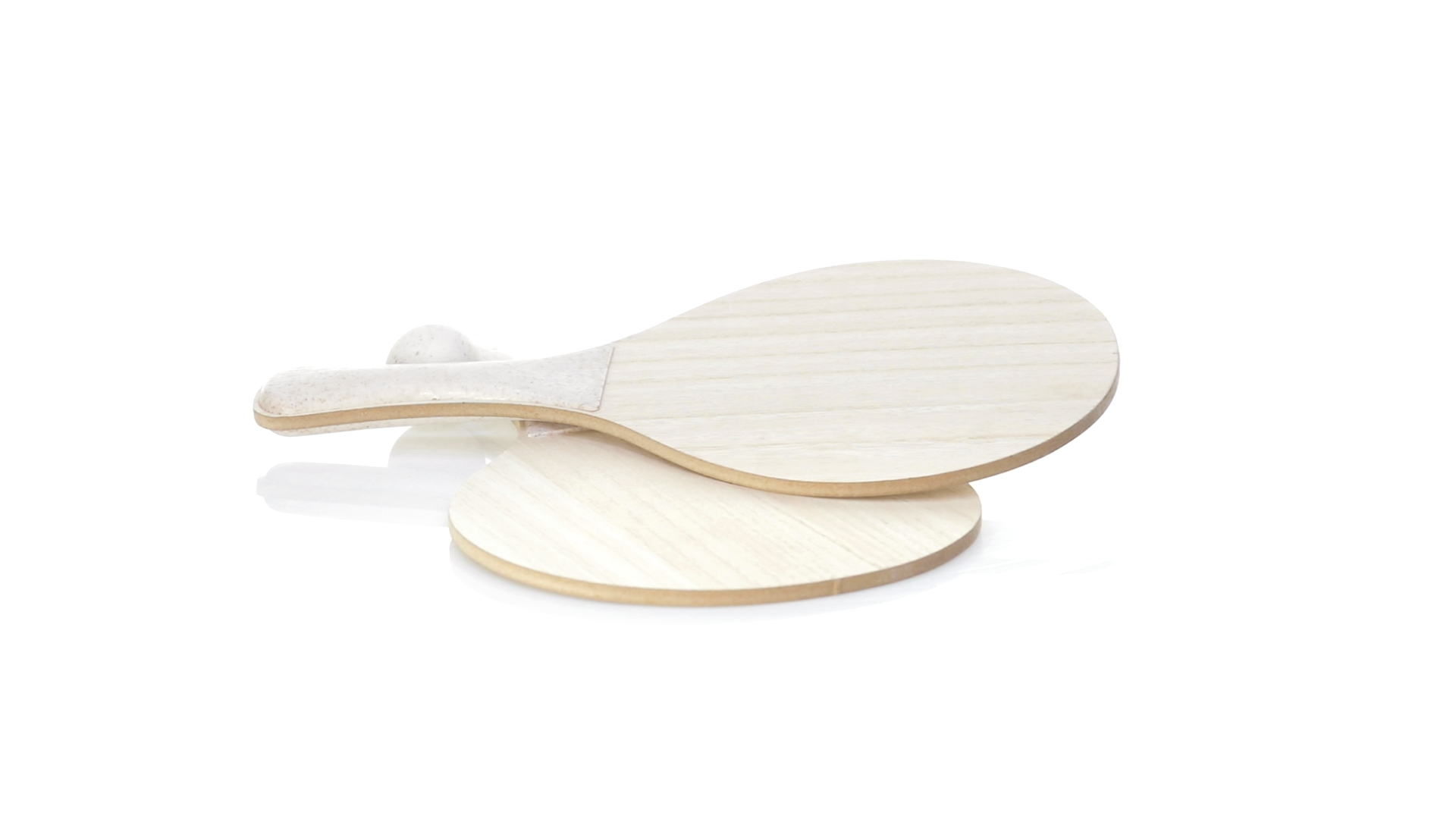 Linie "Natur" Ein Paar Beachschläger. Hergestellt aus Holz, mit verstärktem Weizenstrohgriff. Präsentiert in einer Netztasche, inkl. eines Weizenstrohballs. Emblem auf dem Griff.