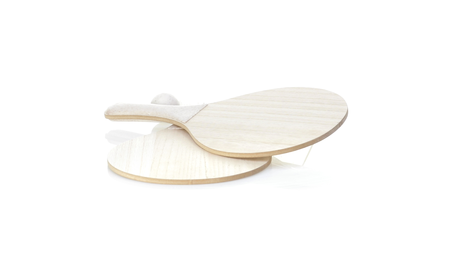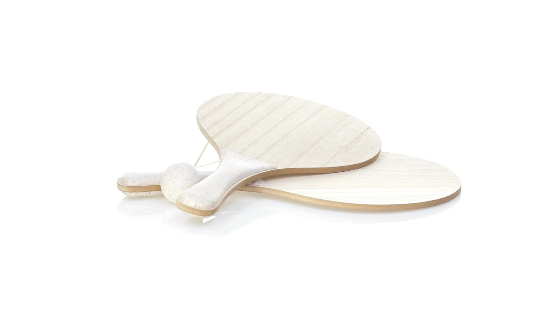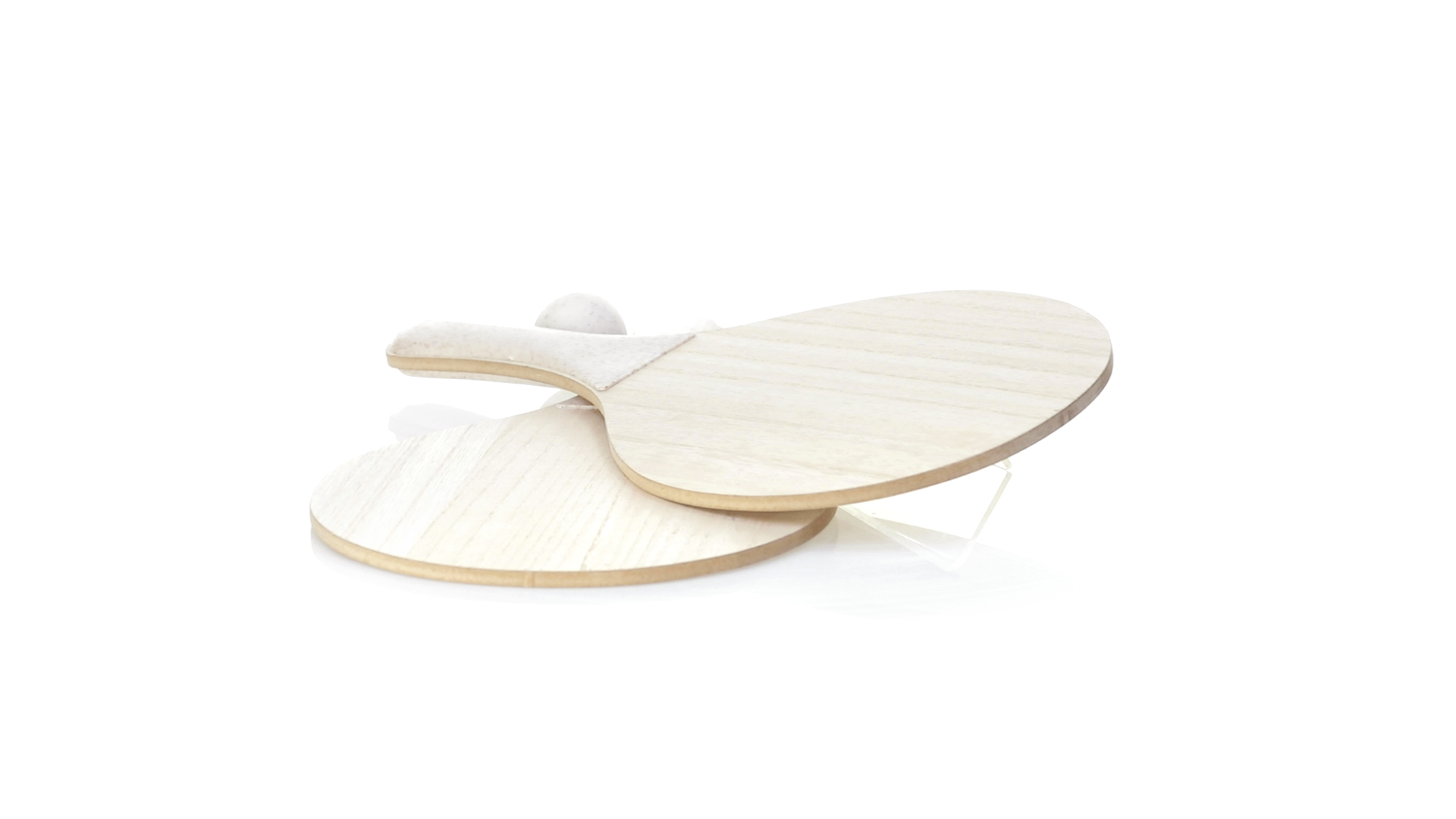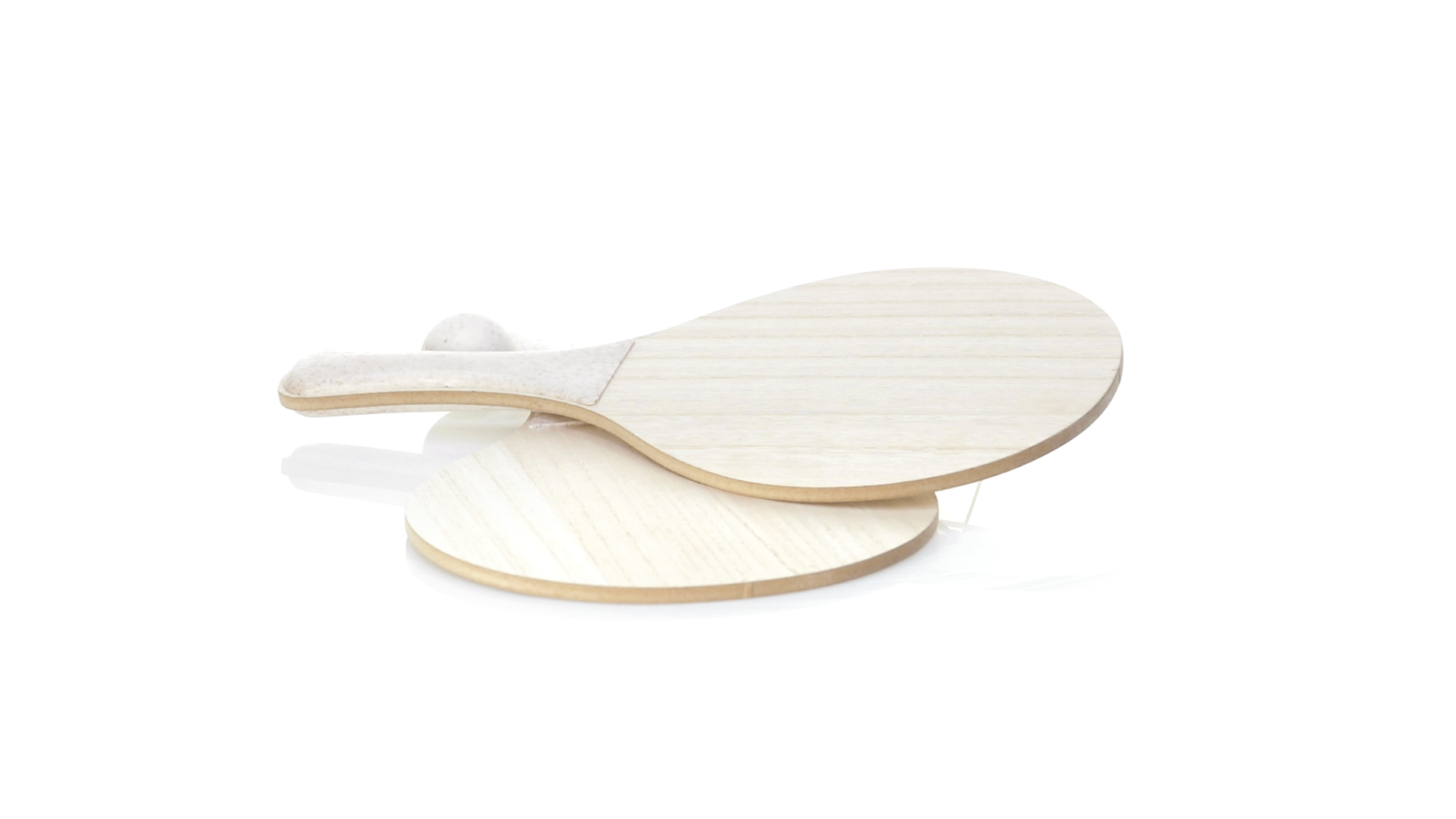 Linie "Natur" Ein Paar Beachschläger. Hergestellt aus Holz, mit verstärktem Weizenstrohgriff. Präsentiert in einer Netztasche, inkl. eines Weizenstrohballs. Emblem auf dem Griff.