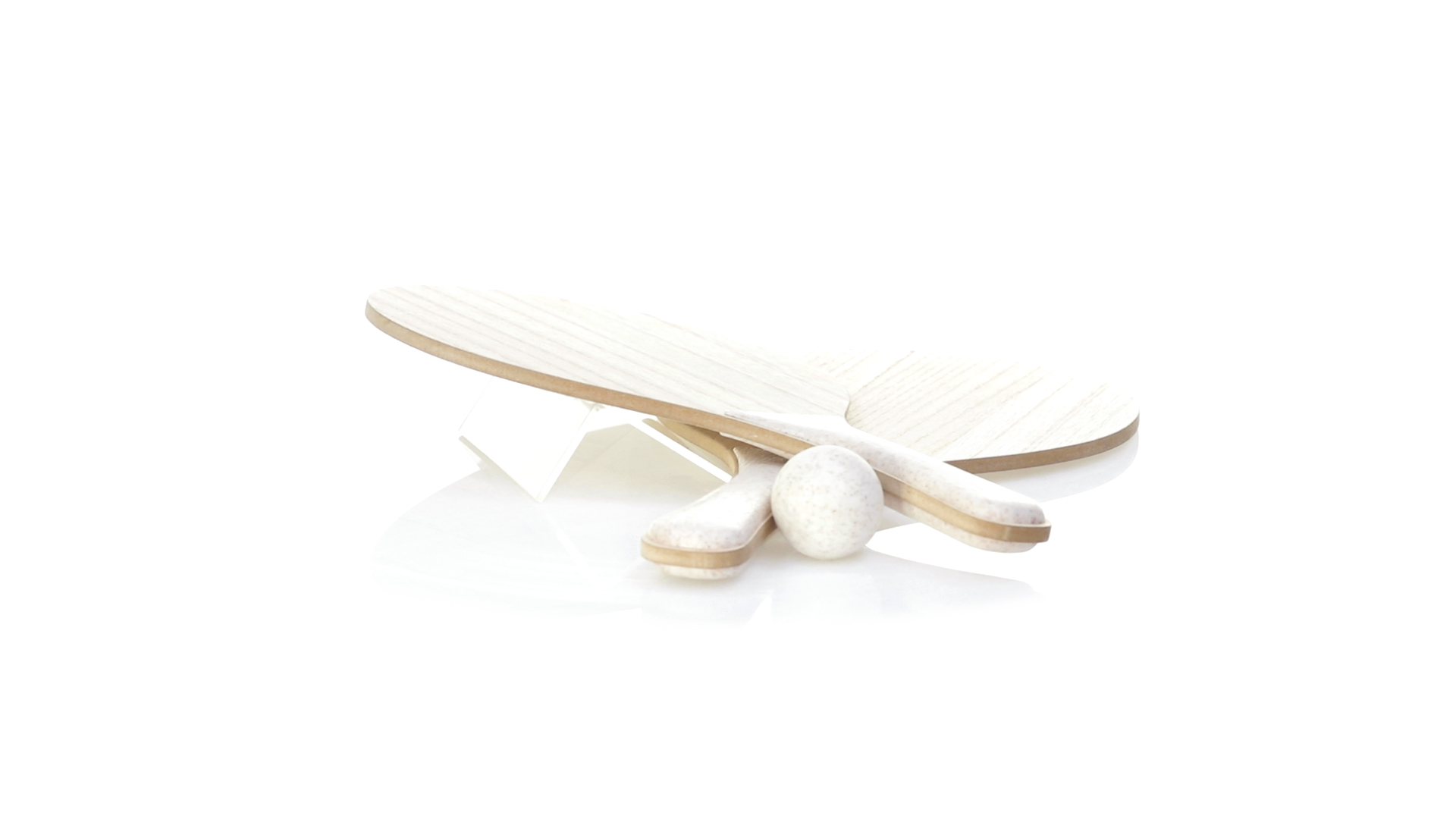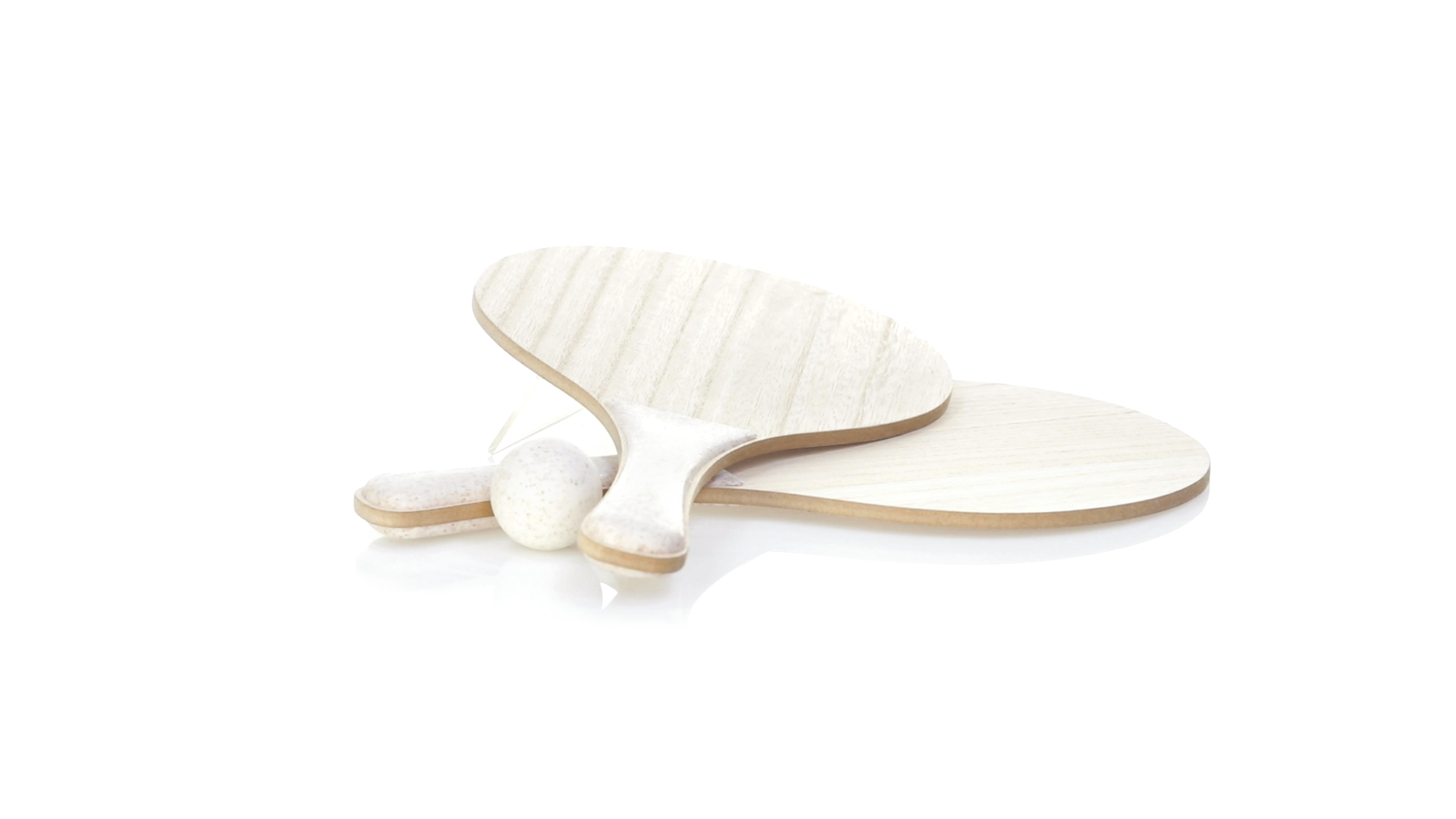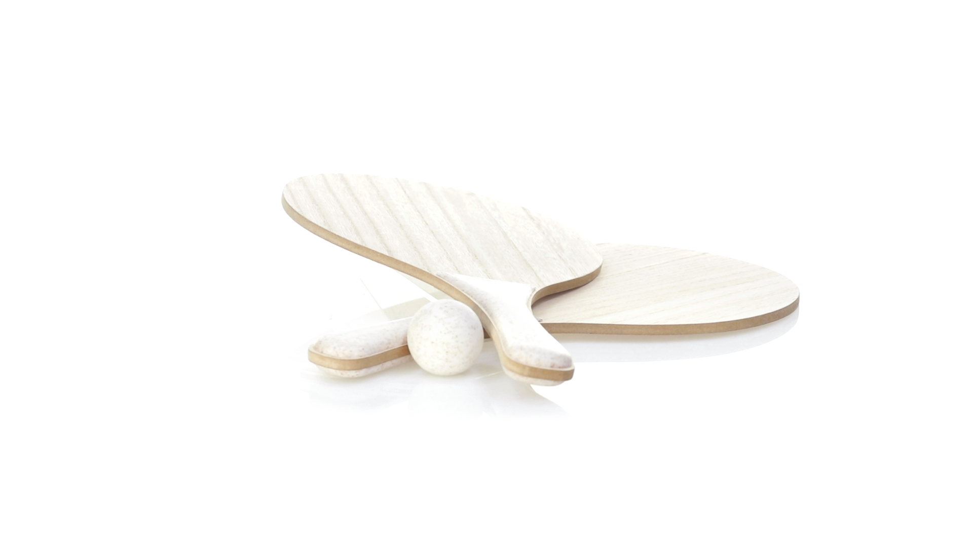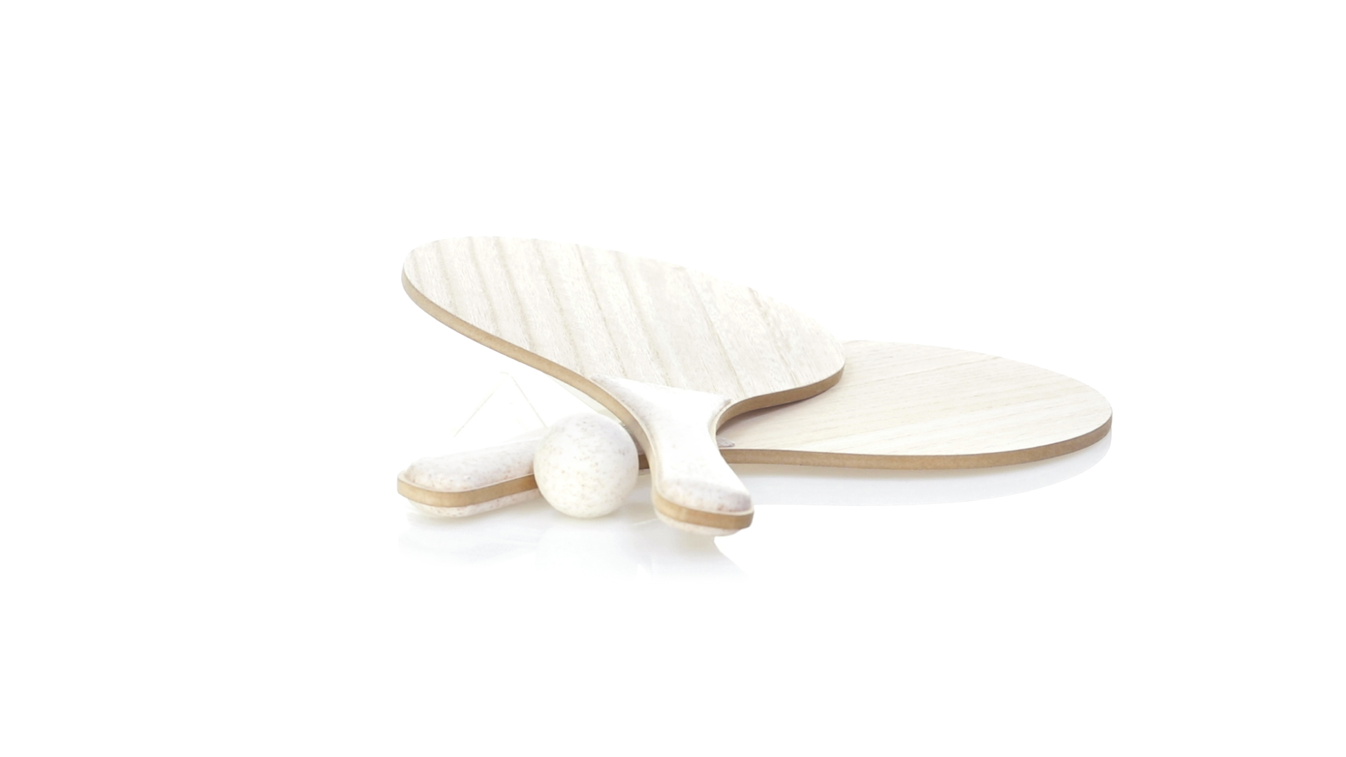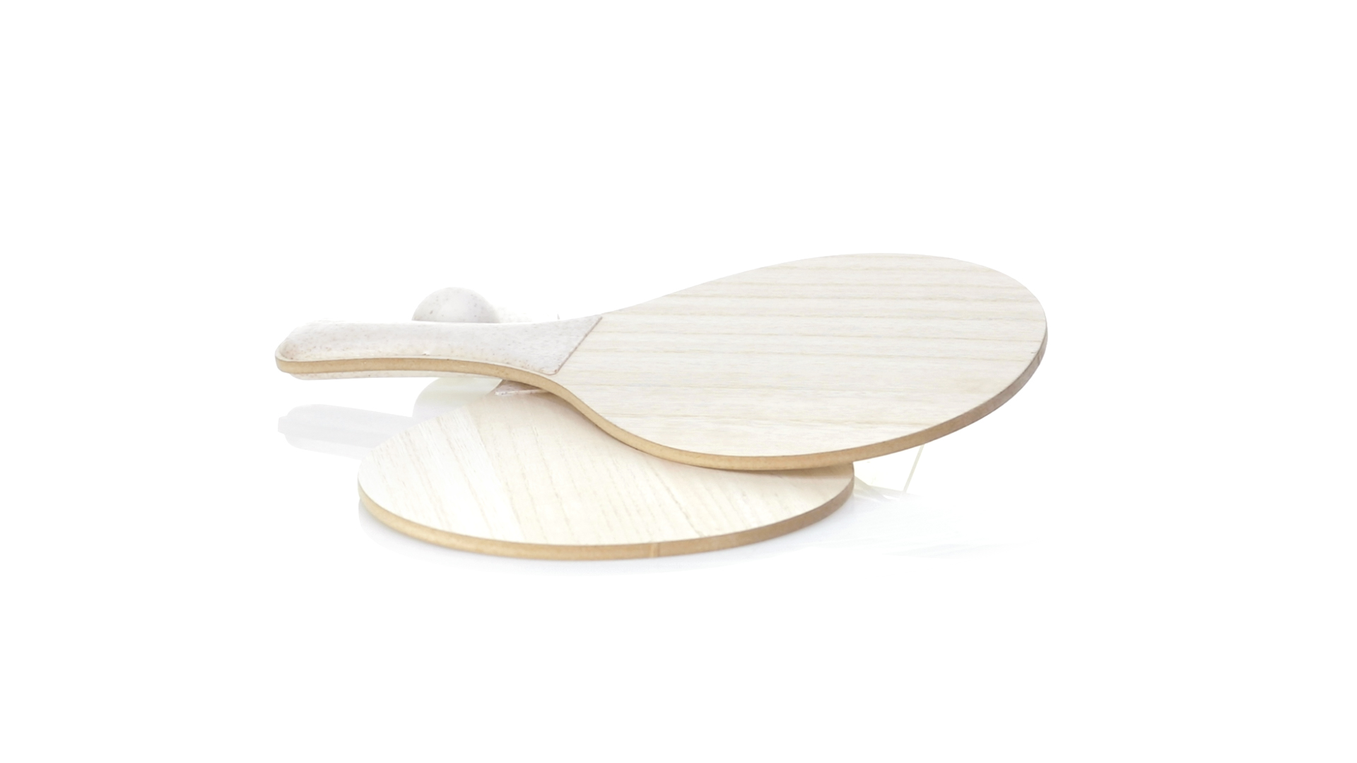 Linie "Natur" Ein Paar Beachschläger. Hergestellt aus Holz, mit verstärktem Weizenstrohgriff. Präsentiert in einer Netztasche, inkl. eines Weizenstrohballs. Emblem auf dem Griff.