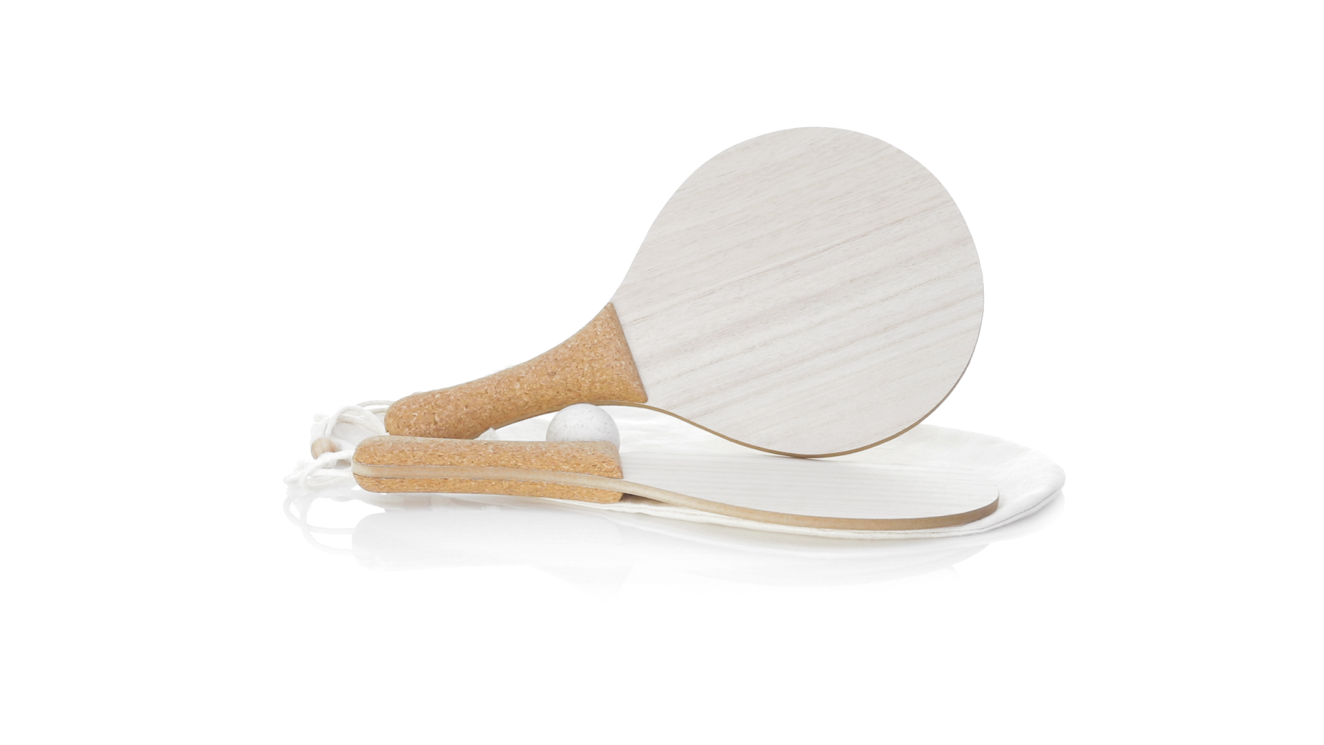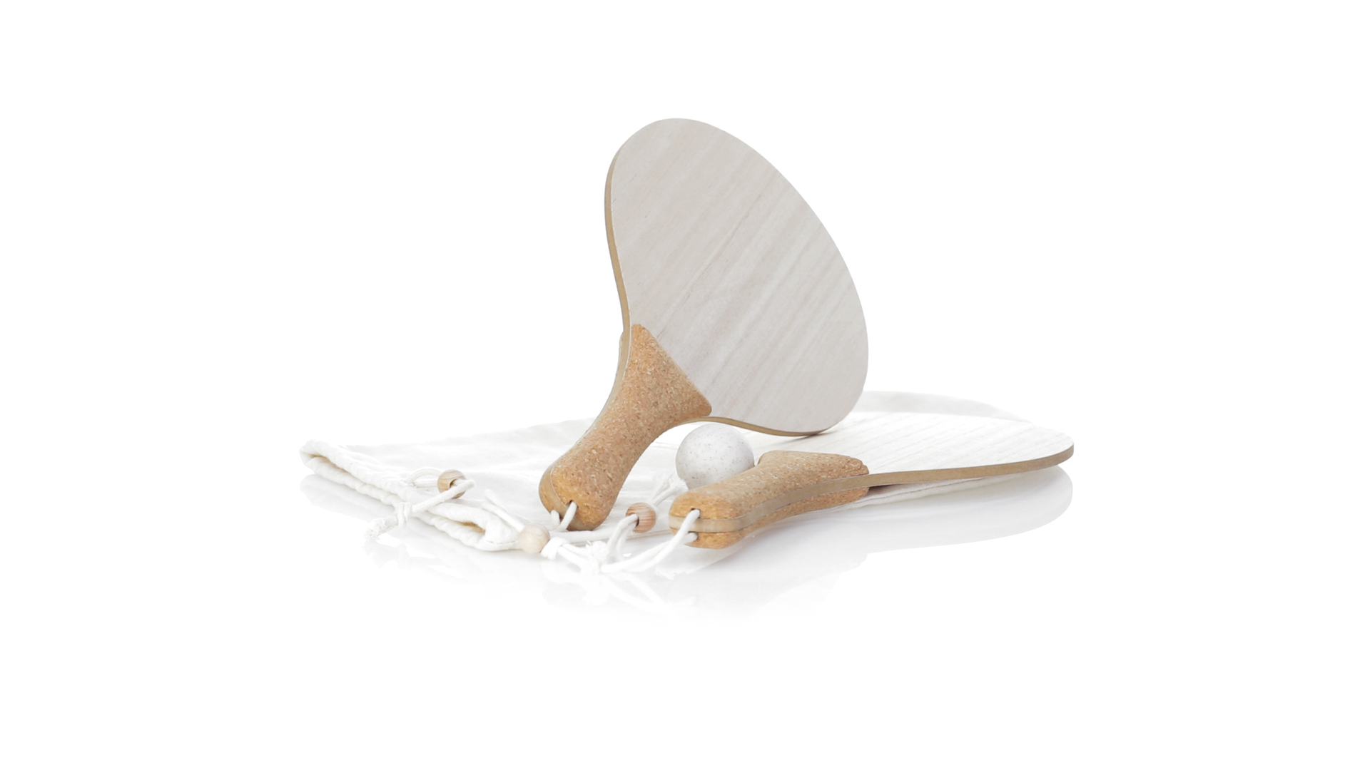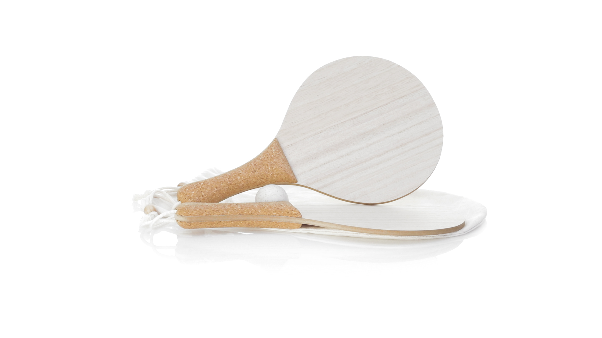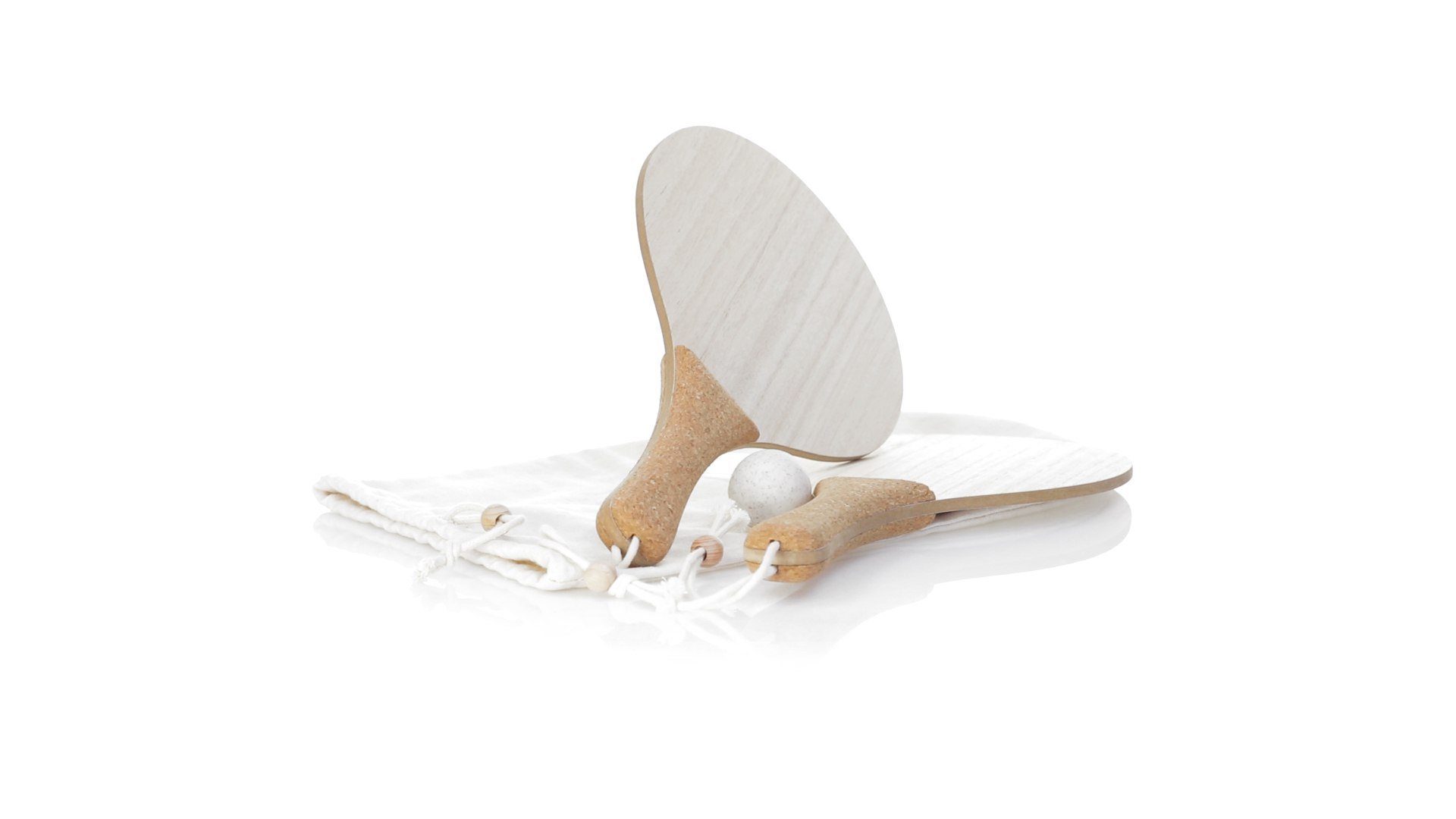 Para der Natur-Strandschaufeln. Aus Holz, mit verstärktem Naturkorkgriff und Handschlaufen mit Versteller. Präsentiert in einem natürlichen Baumwollbeutel mit Kordelzug und Weizenrohrkugel.