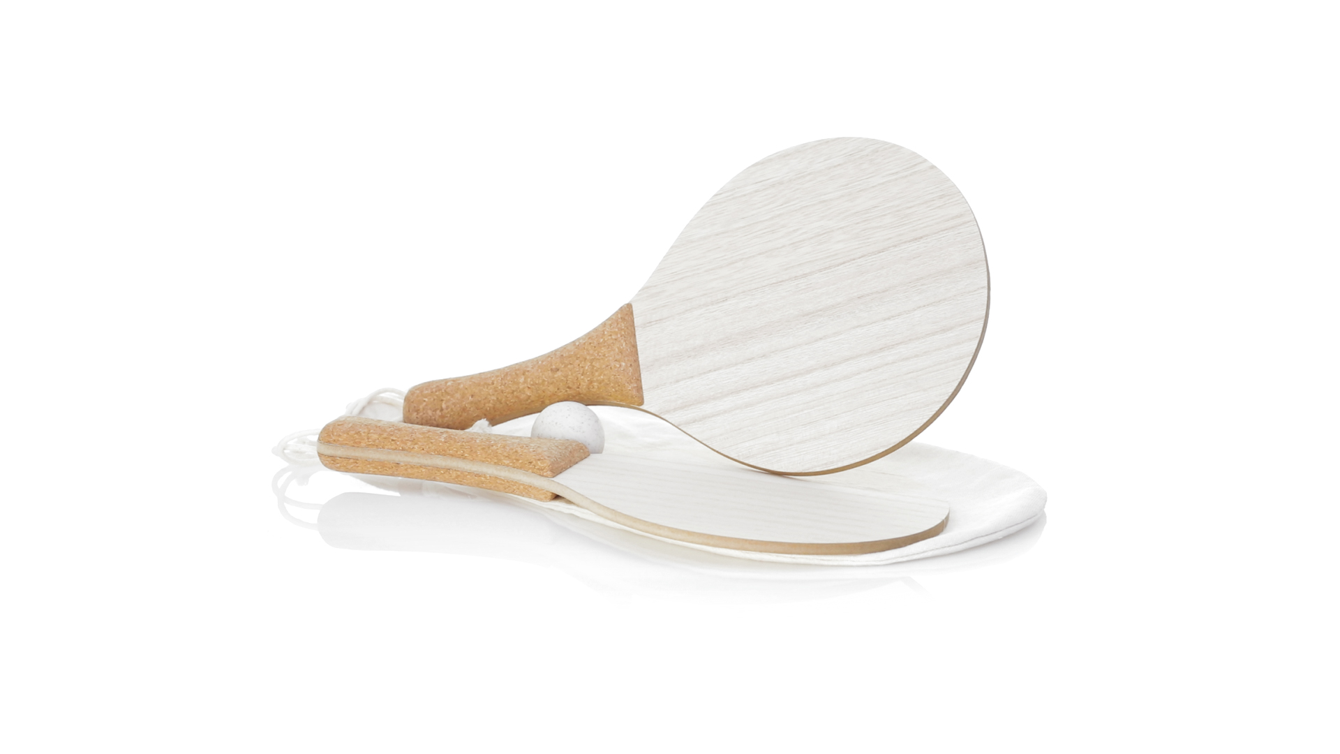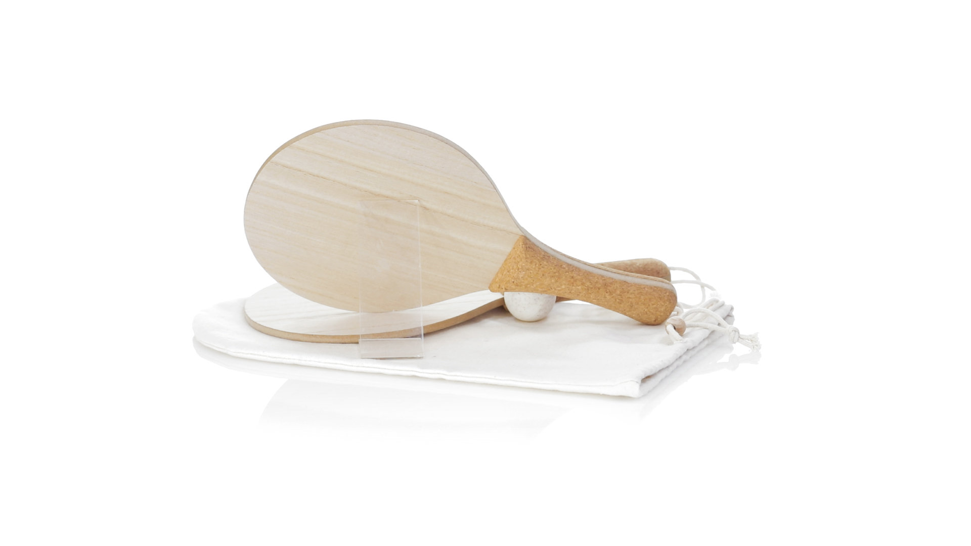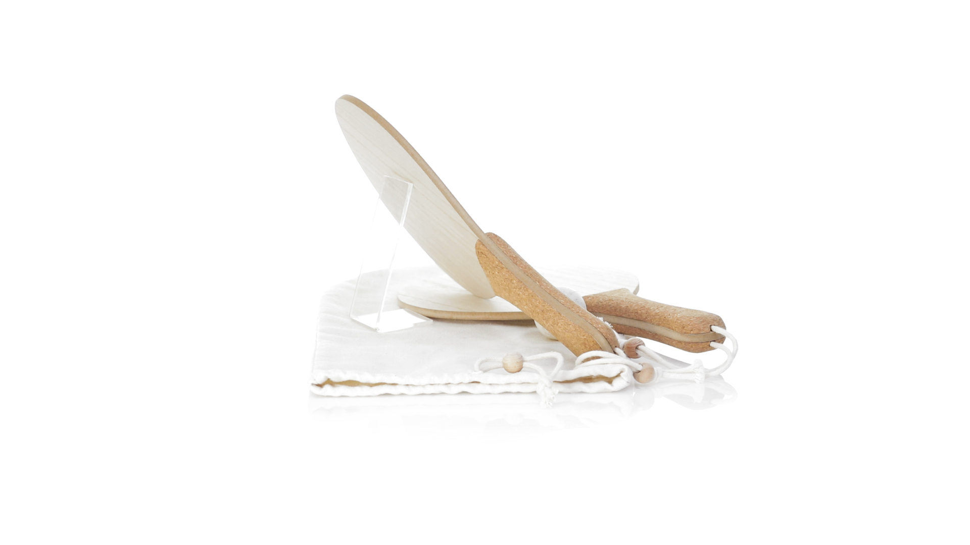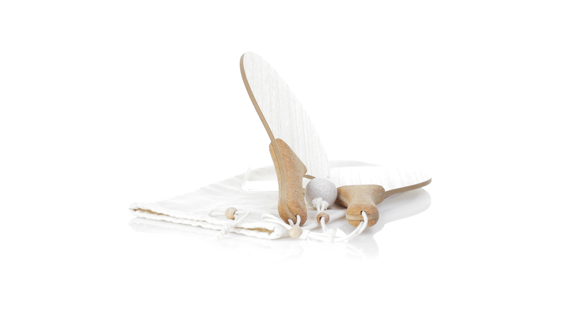 Para der Natur-Strandschaufeln. Aus Holz, mit verstärktem Naturkorkgriff und Handschlaufen mit Versteller. Präsentiert in einem natürlichen Baumwollbeutel mit Kordelzug und Weizenrohrkugel.