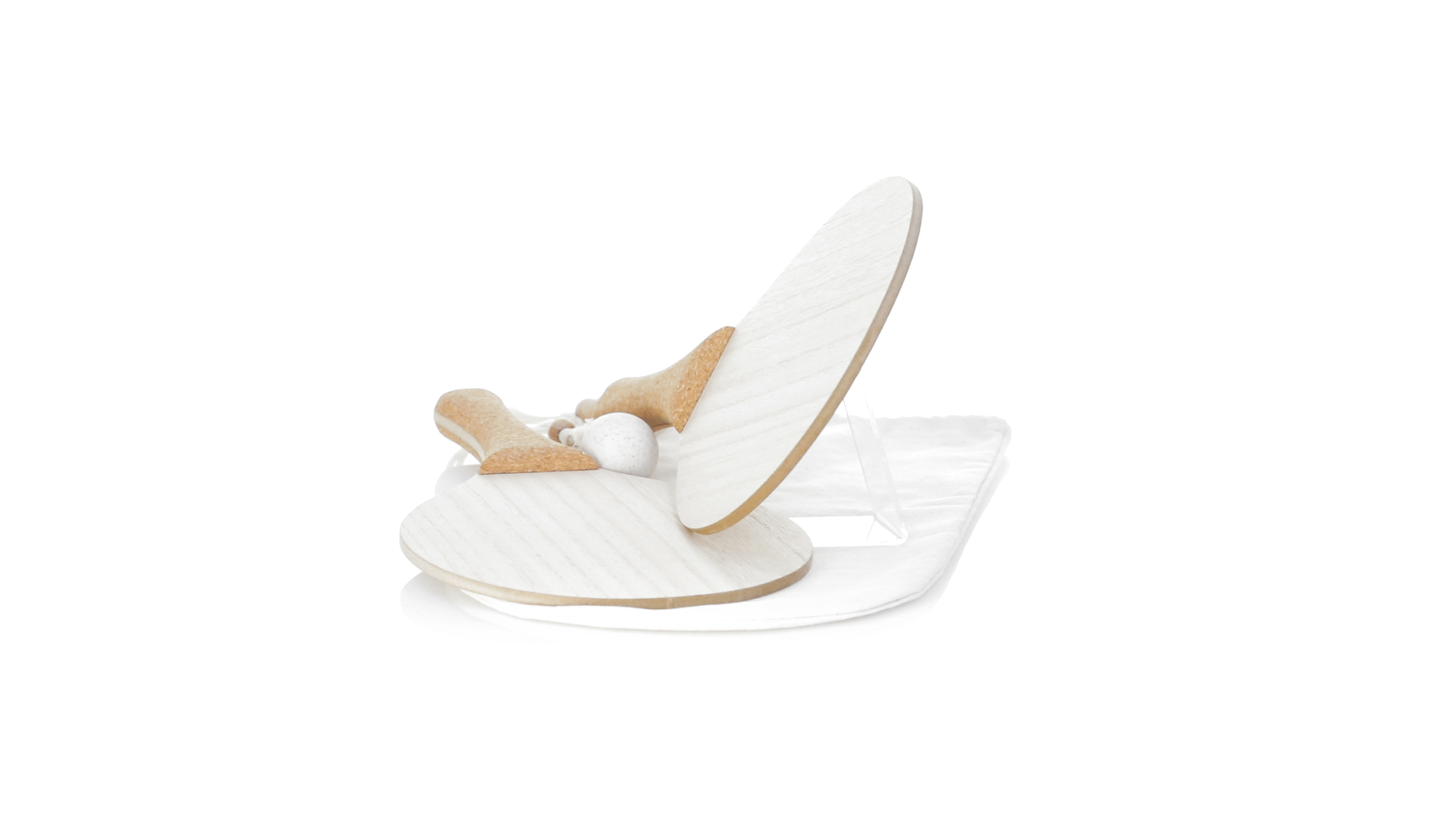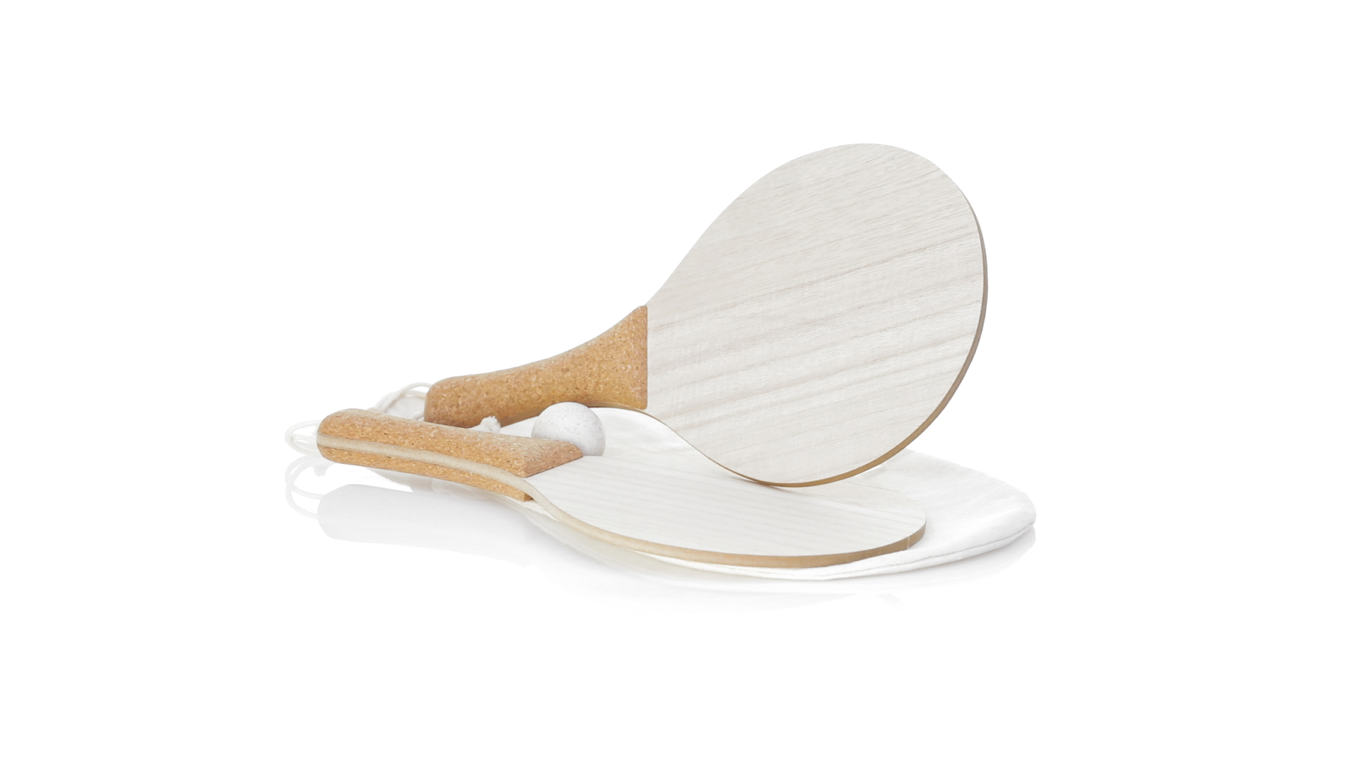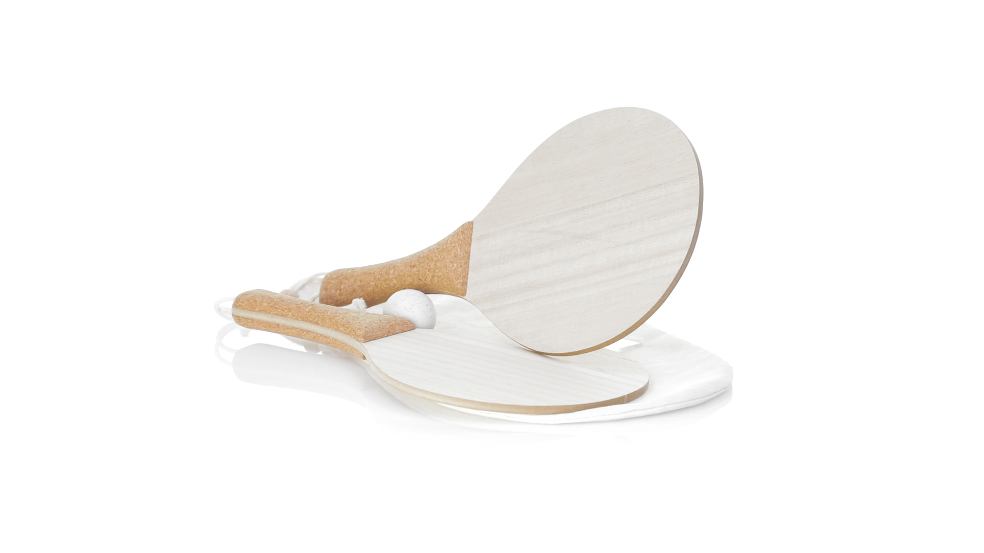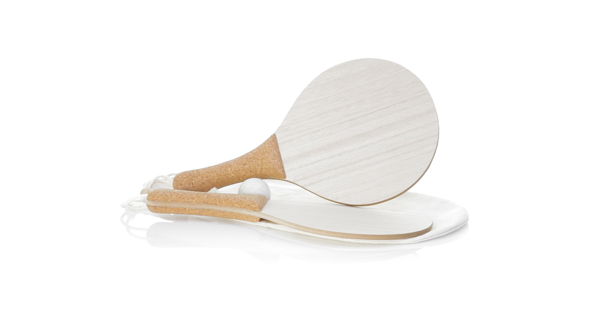 Para der Natur-Strandschaufeln. Aus Holz, mit verstärktem Naturkorkgriff und Handschlaufen mit Versteller. Präsentiert in einem natürlichen Baumwollbeutel mit Kordelzug und Weizenrohrkugel.