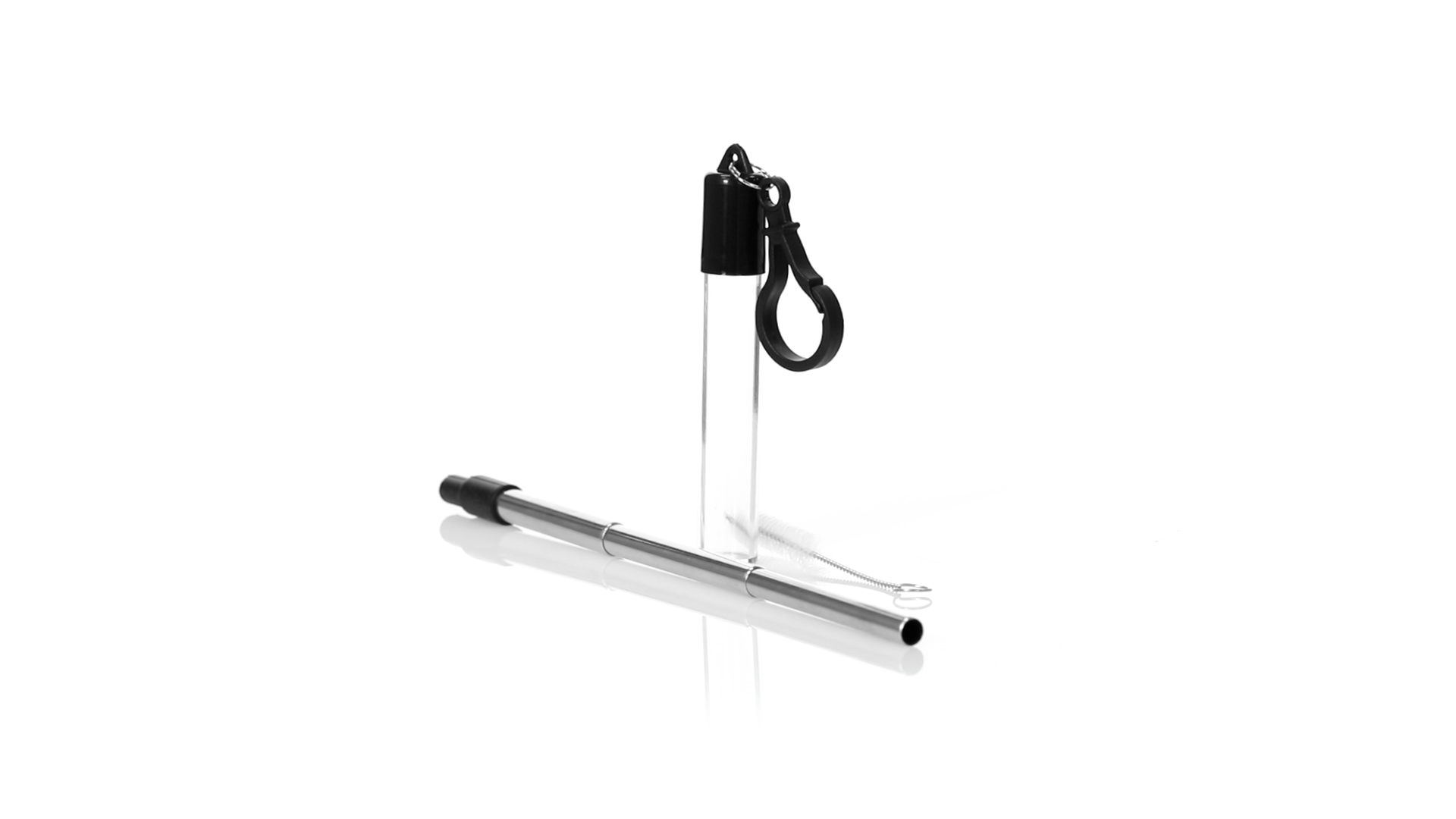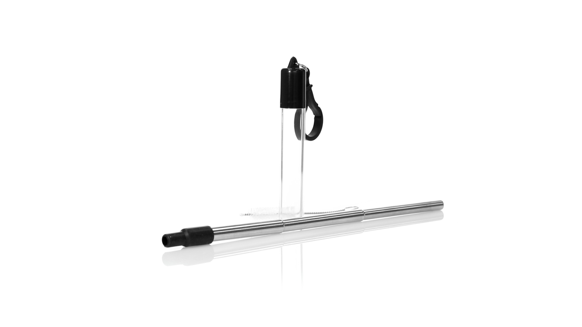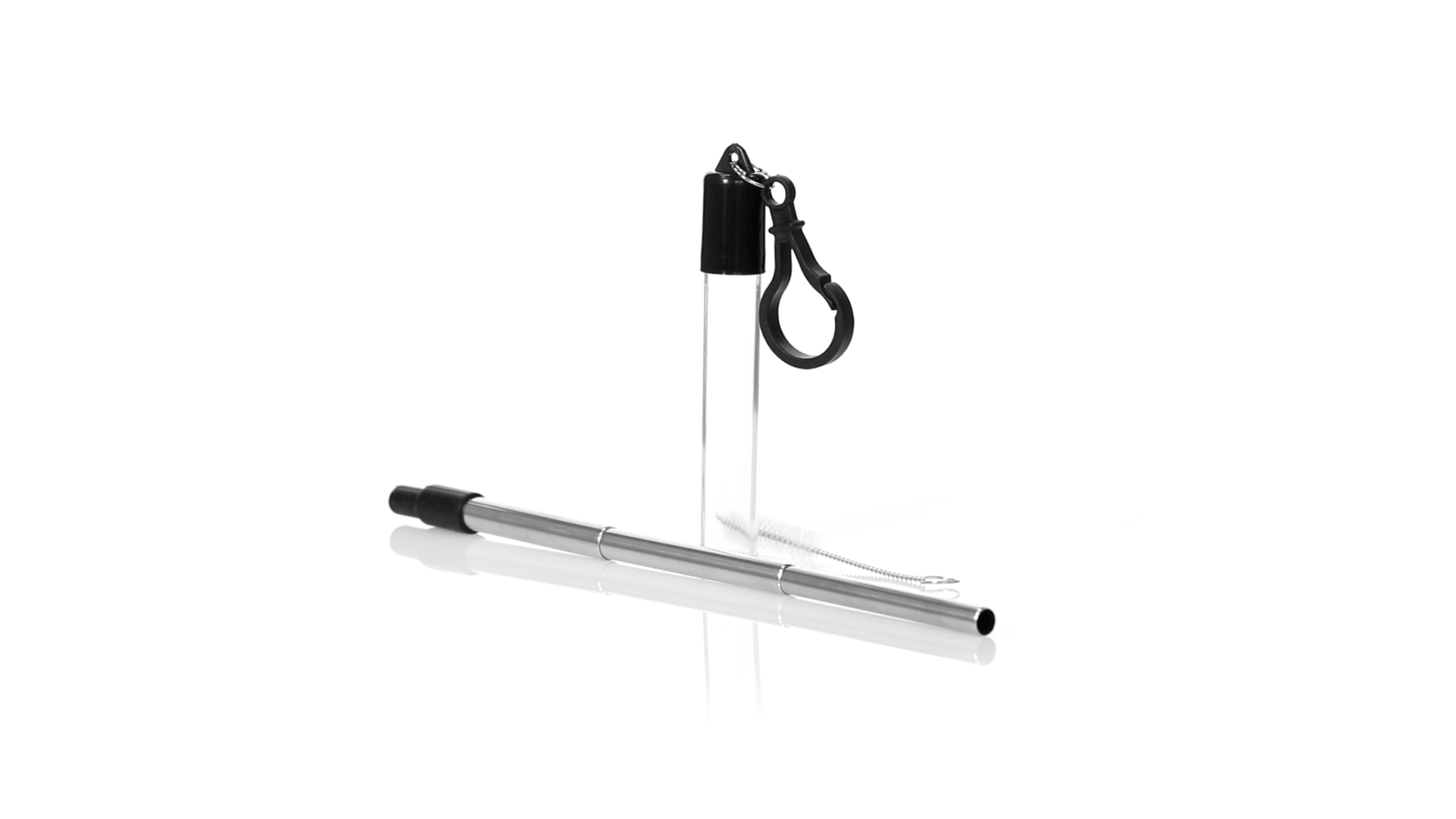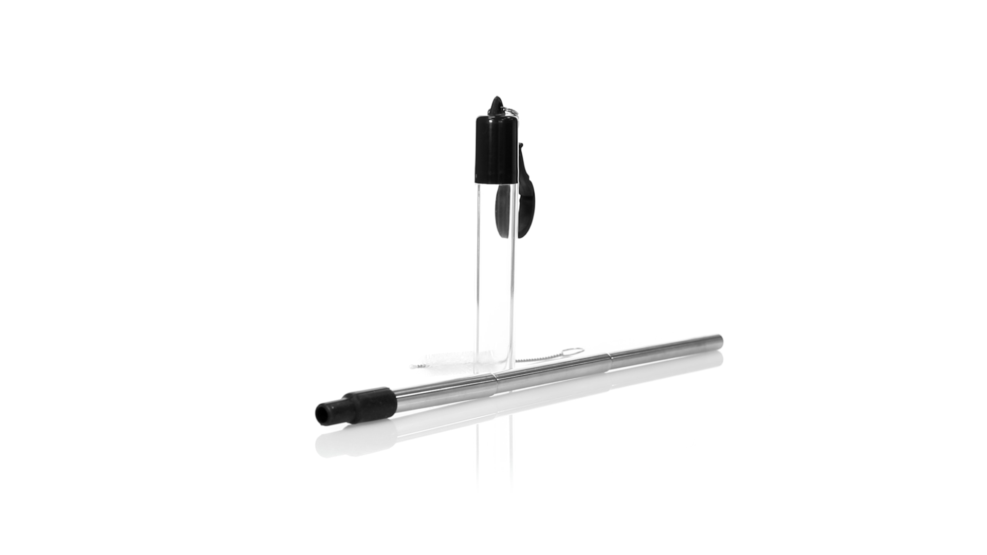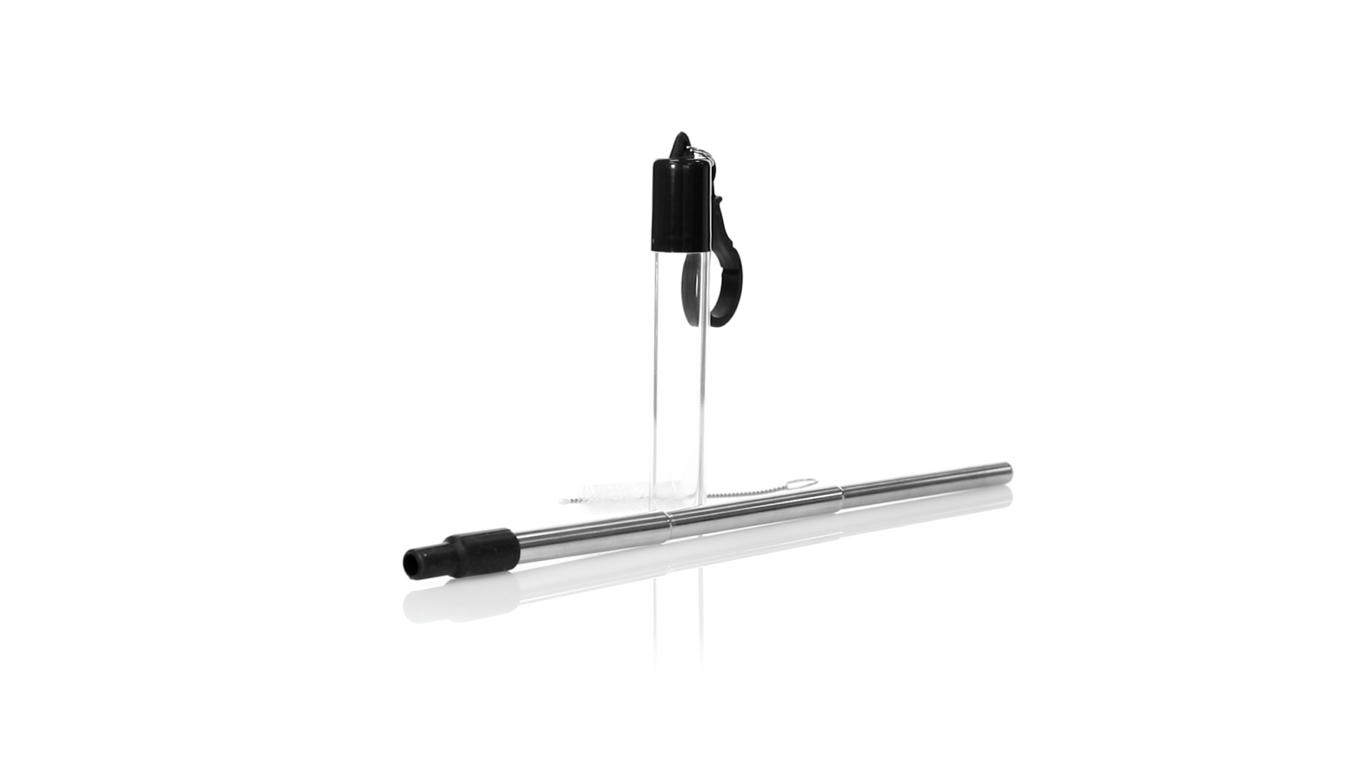 Wiederverwendbarer und ausziehbarer Strohhalm aus Edelstahl mit Silikonspitze. Inklusive Reinigungszubehör und präsentiert in einem transparenten Koffer mit Tragezubehör.
