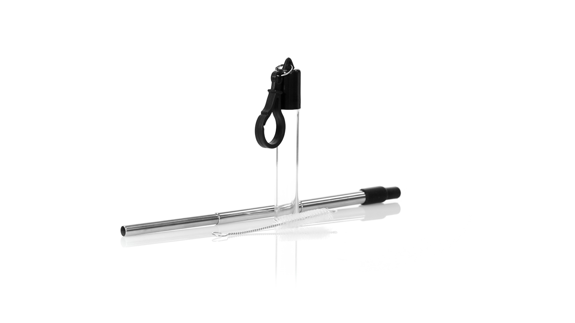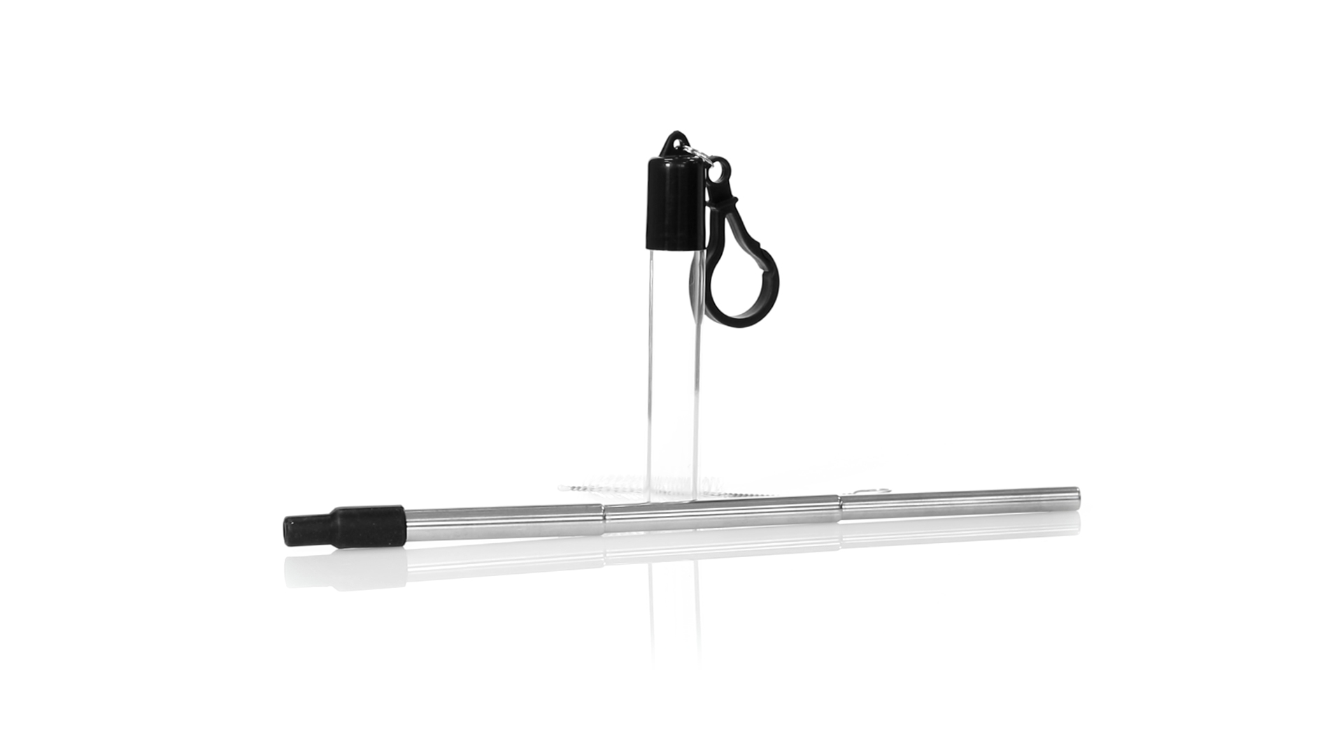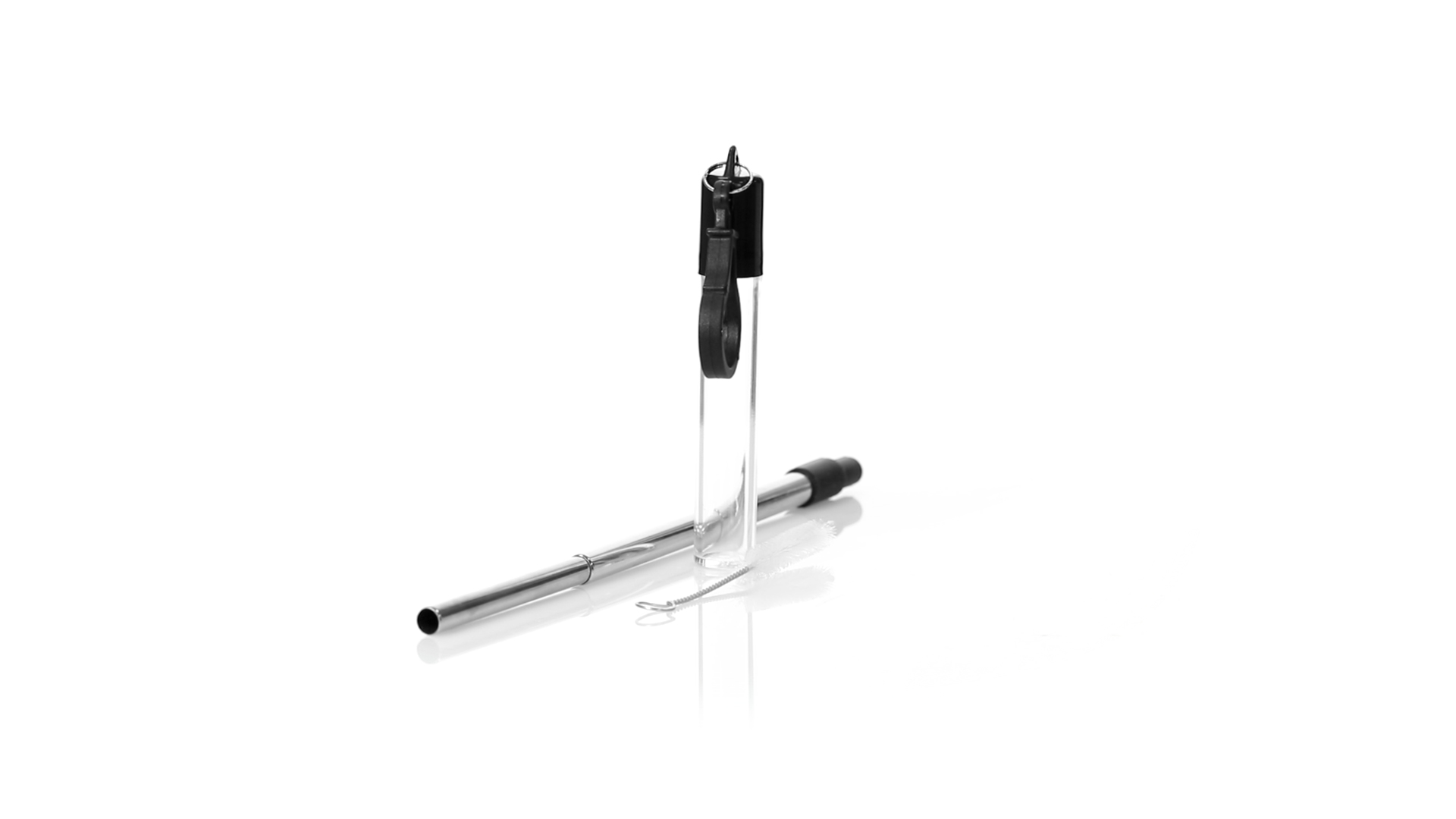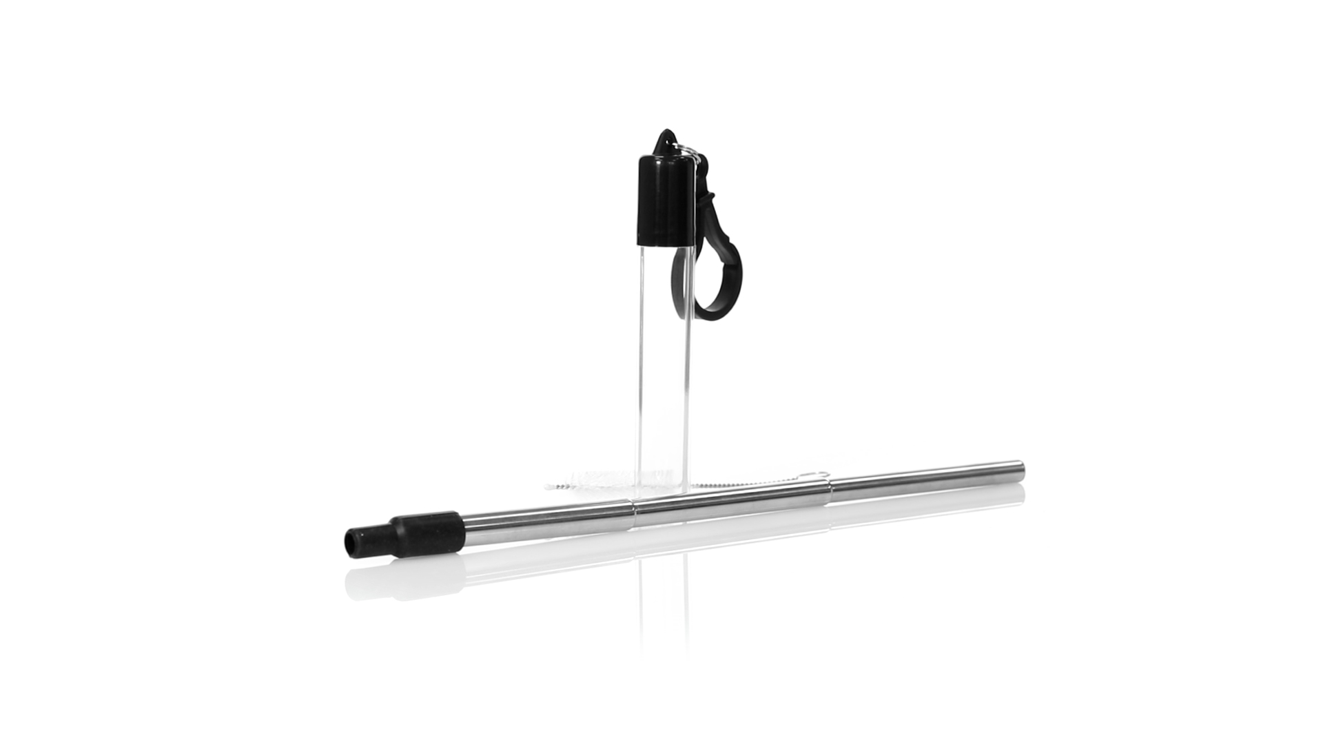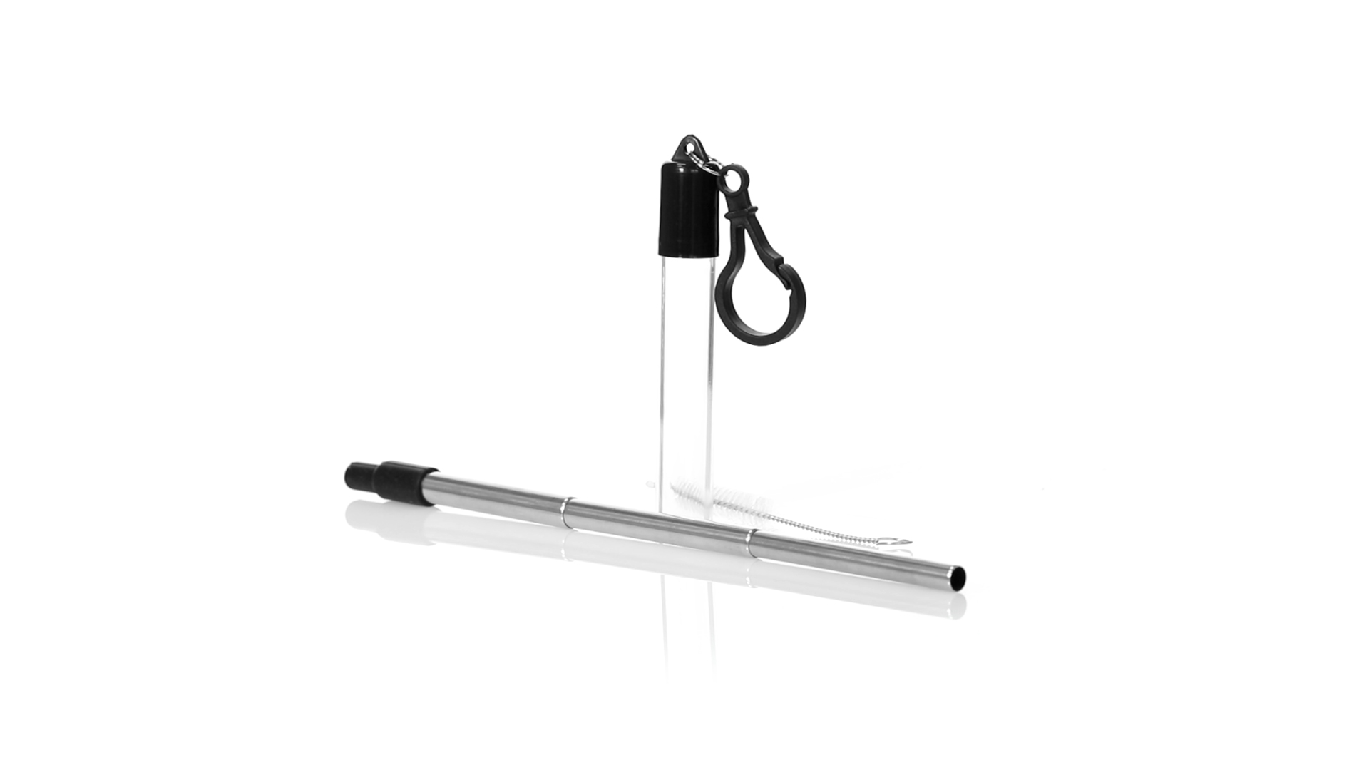 Wiederverwendbarer und ausziehbarer Strohhalm aus Edelstahl mit Silikonspitze. Inklusive Reinigungszubehör und präsentiert in einem transparenten Koffer mit Tragezubehör.