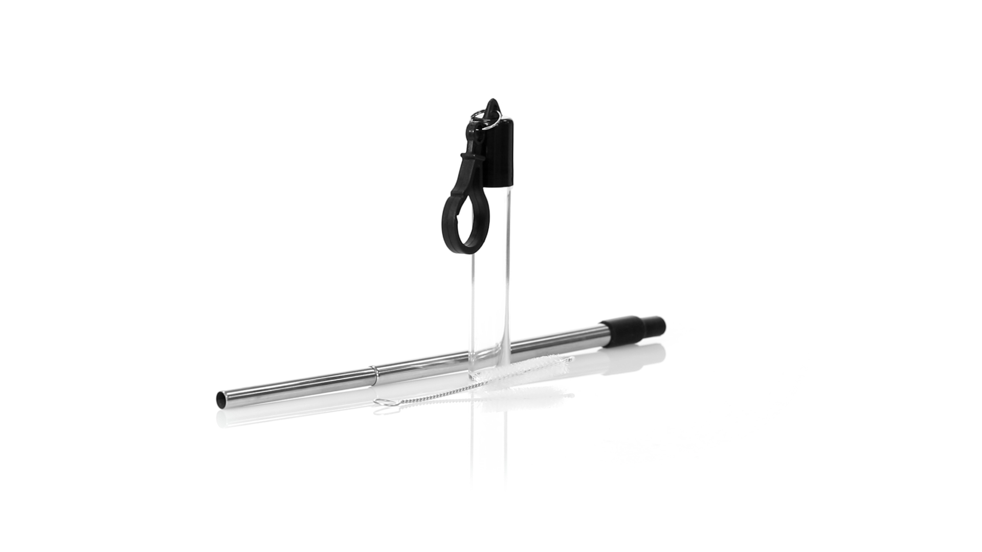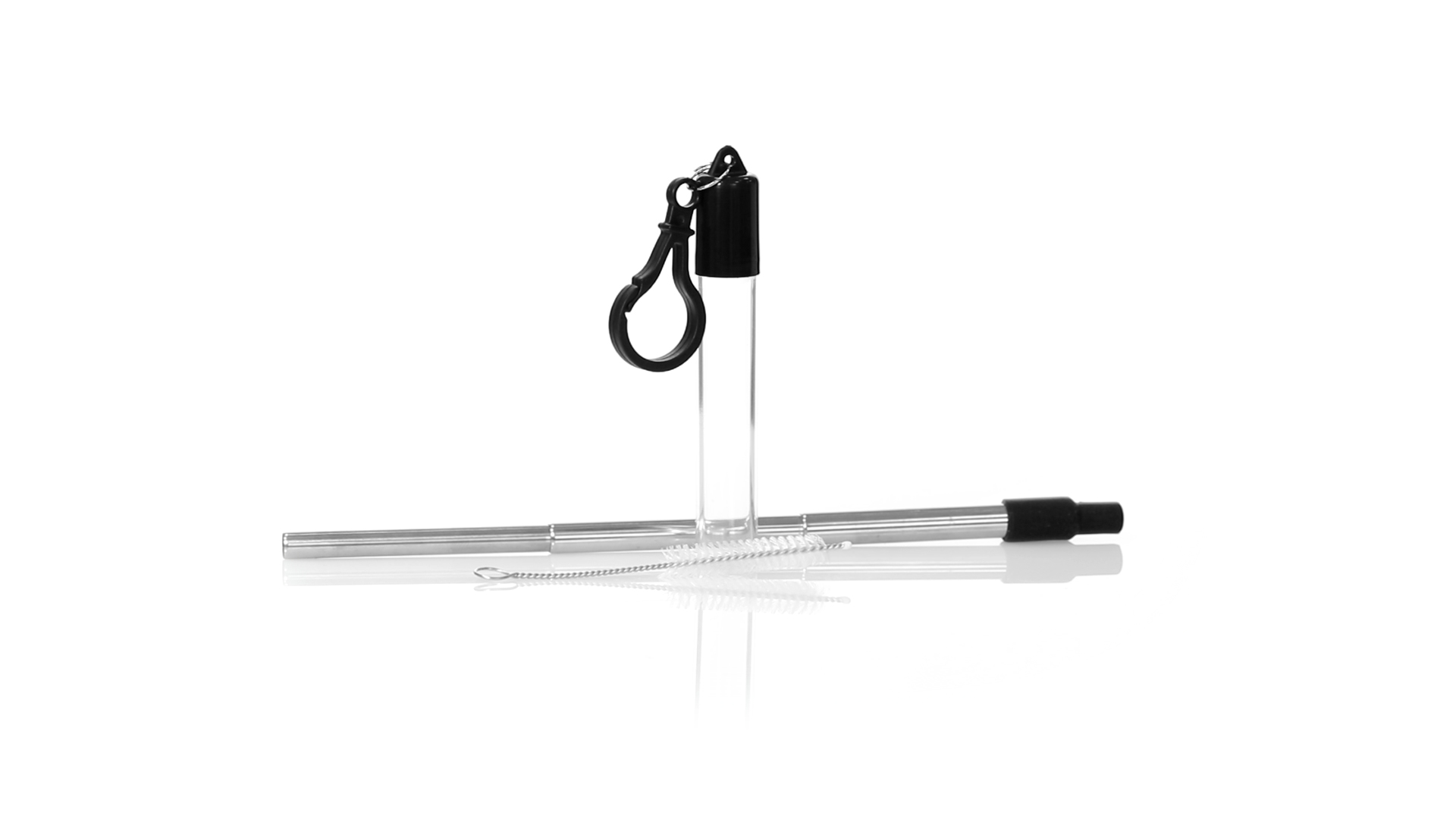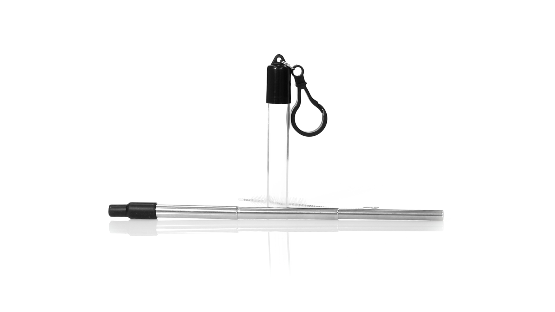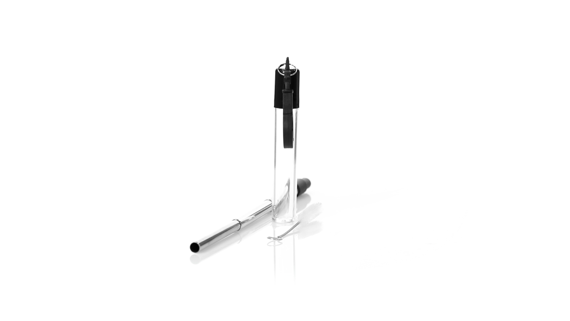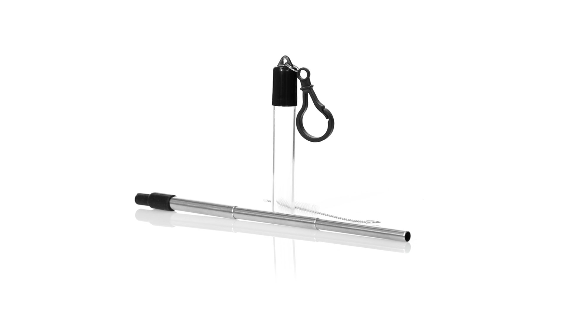 Wiederverwendbarer und ausziehbarer Strohhalm aus Edelstahl mit Silikonspitze. Inklusive Reinigungszubehör und präsentiert in einem transparenten Koffer mit Tragezubehör.