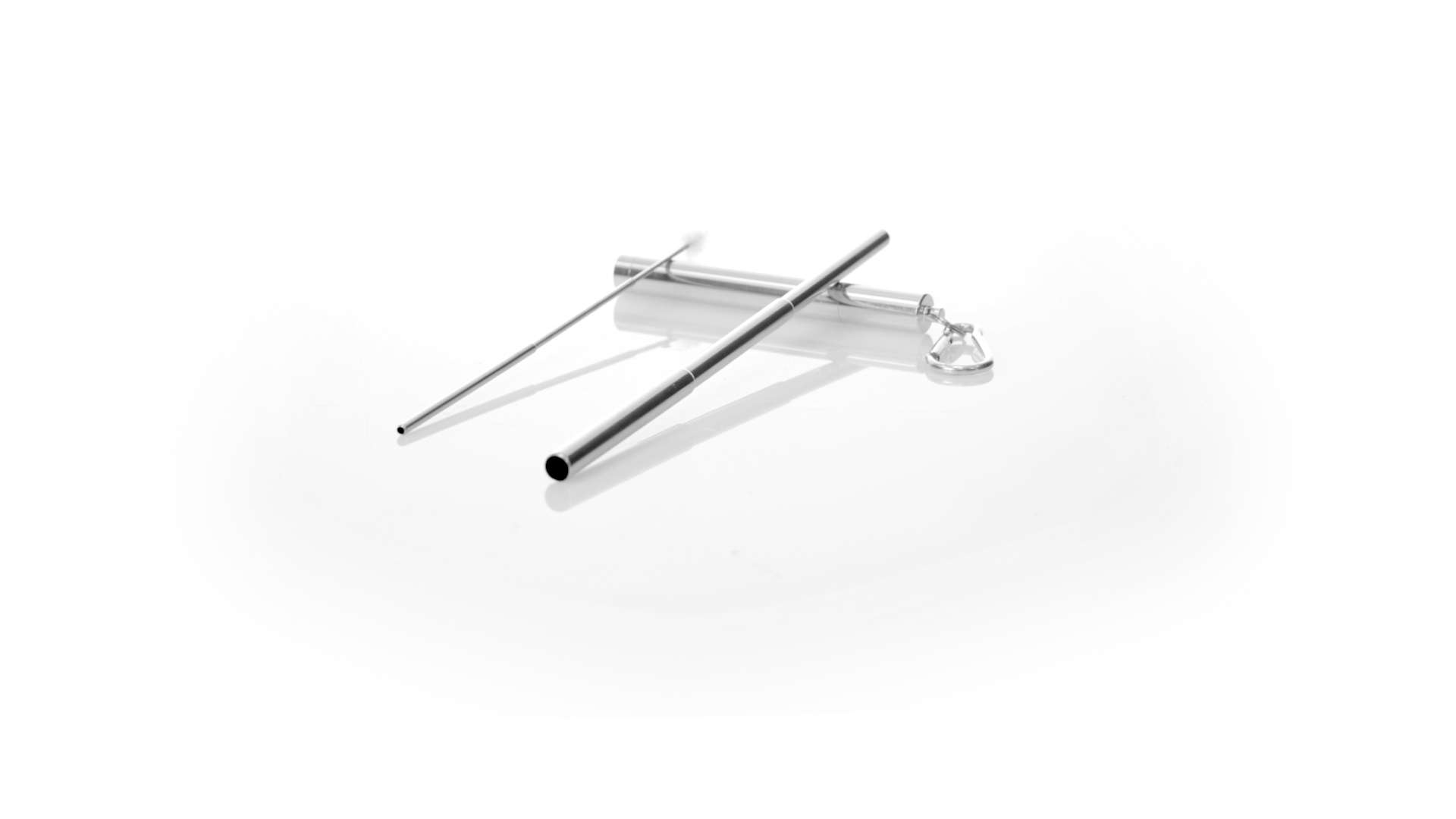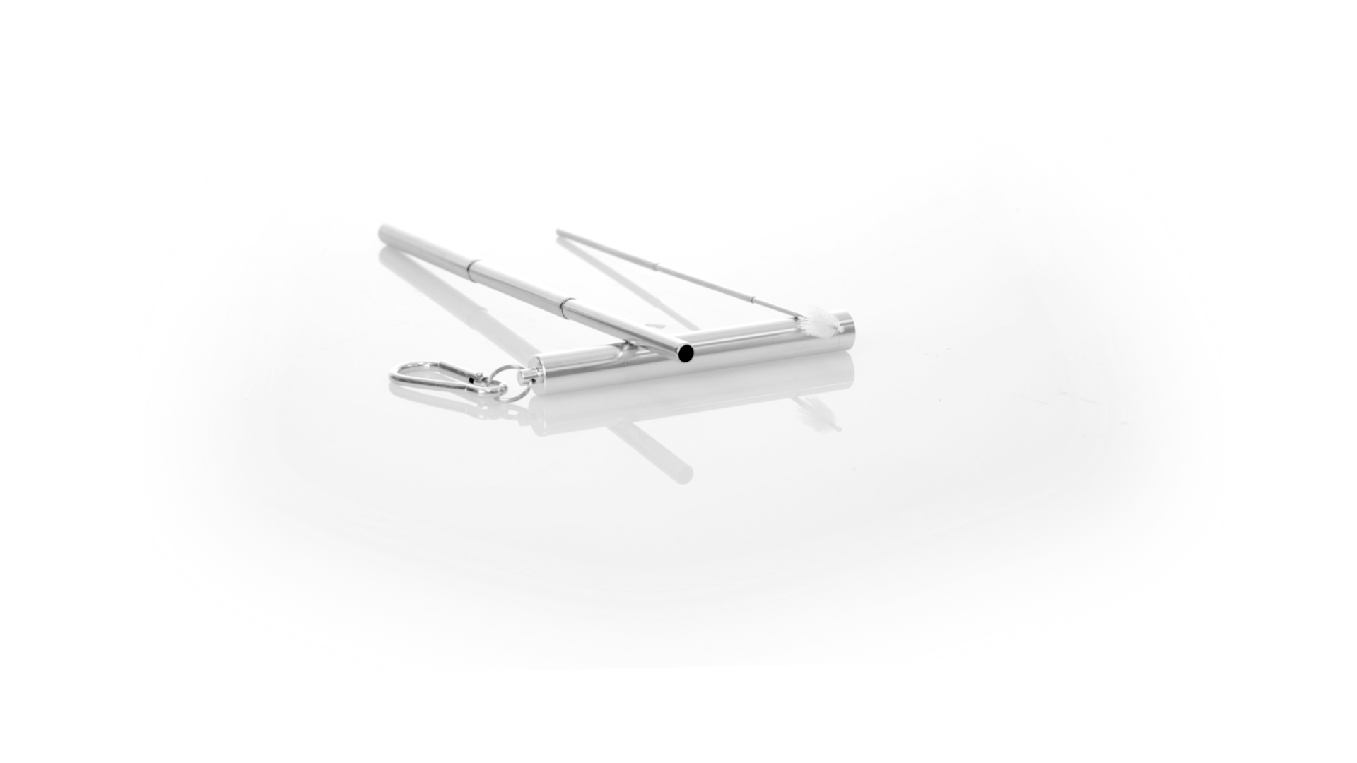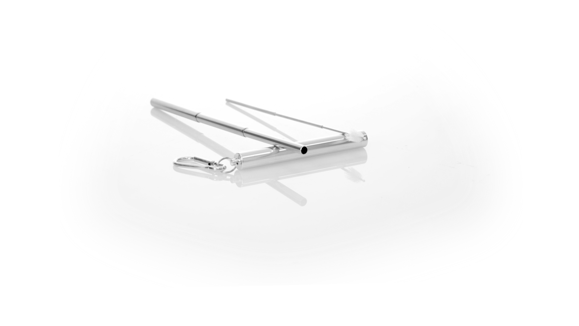 Wiederverwendbarer und ausziehbarer Edelstahlstrohhalm mit Silikonmundstück. Mit Reinigungszubehör im Lieferumfang enthalten und im passenden Koffer mit Karabiner zum Transport präsentiert.