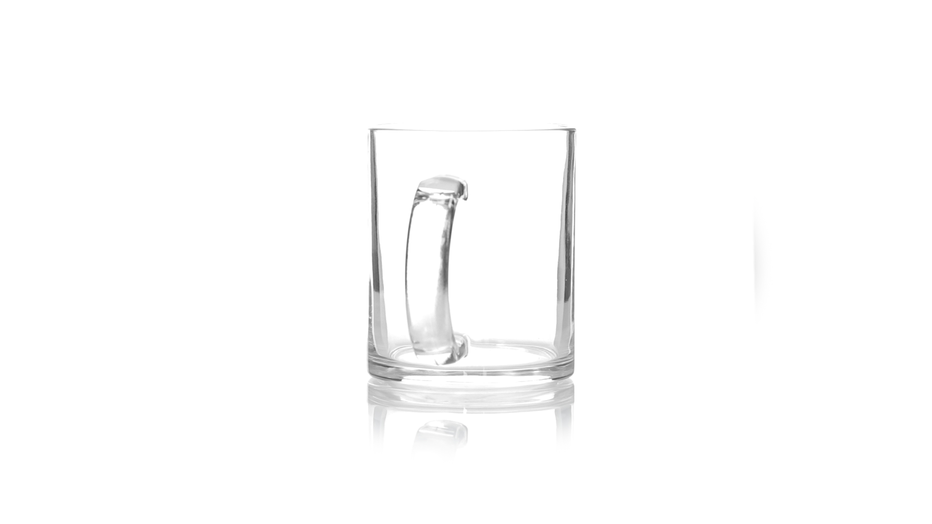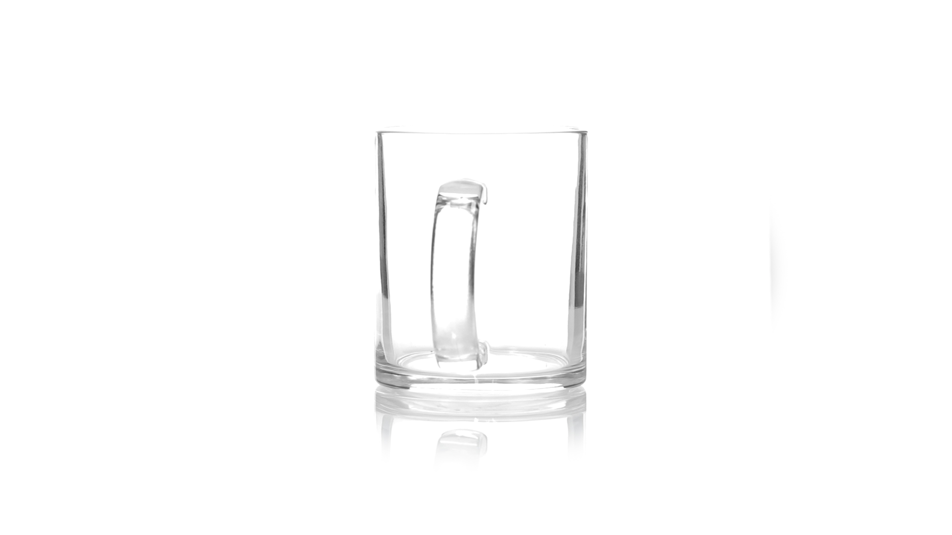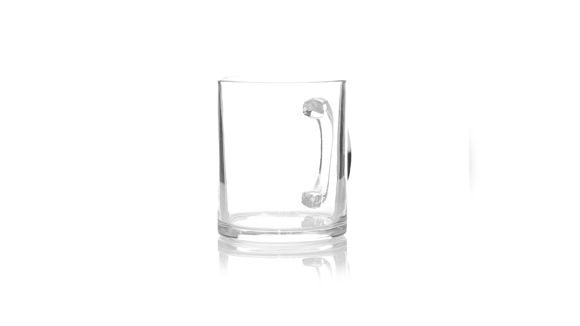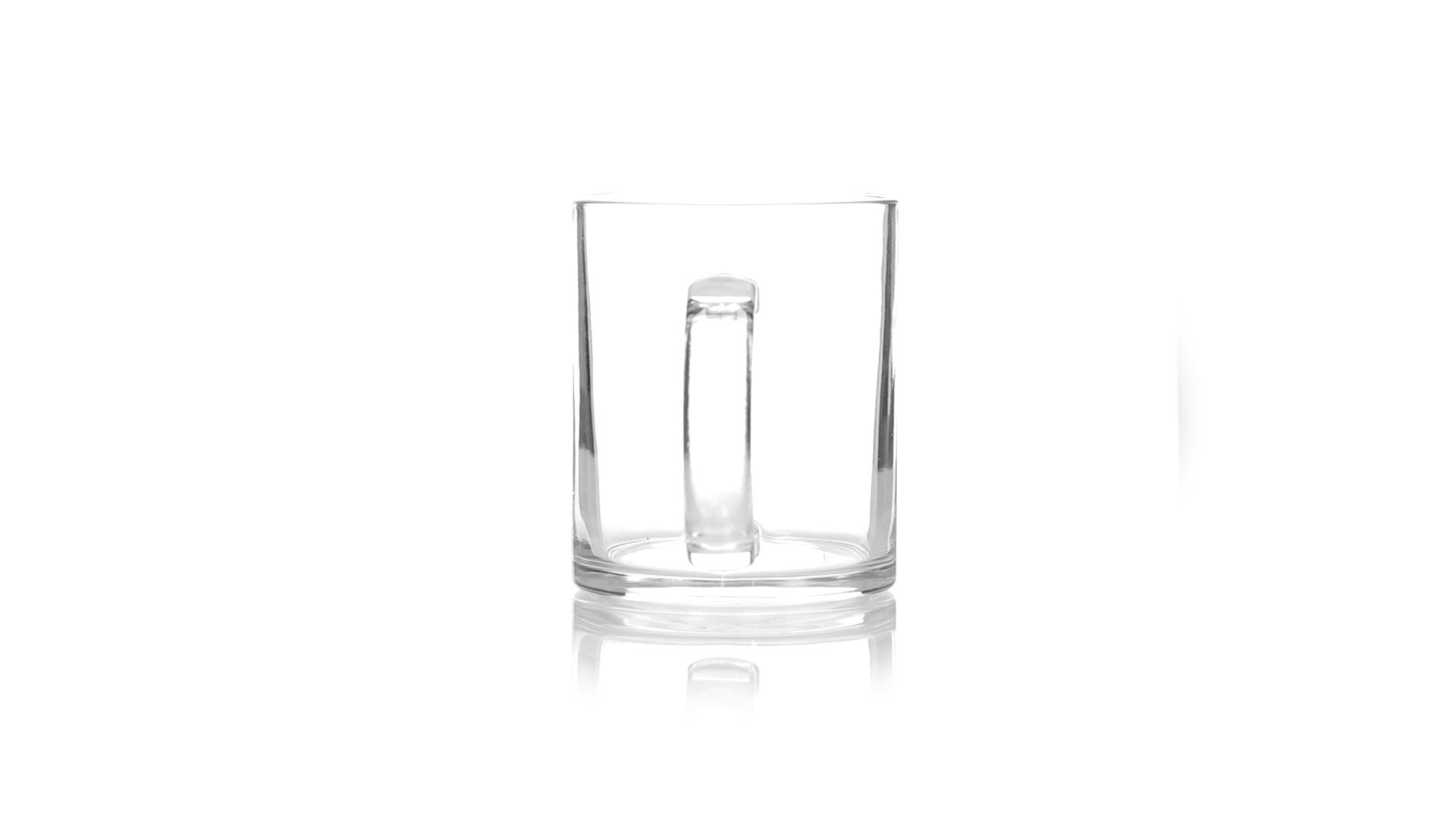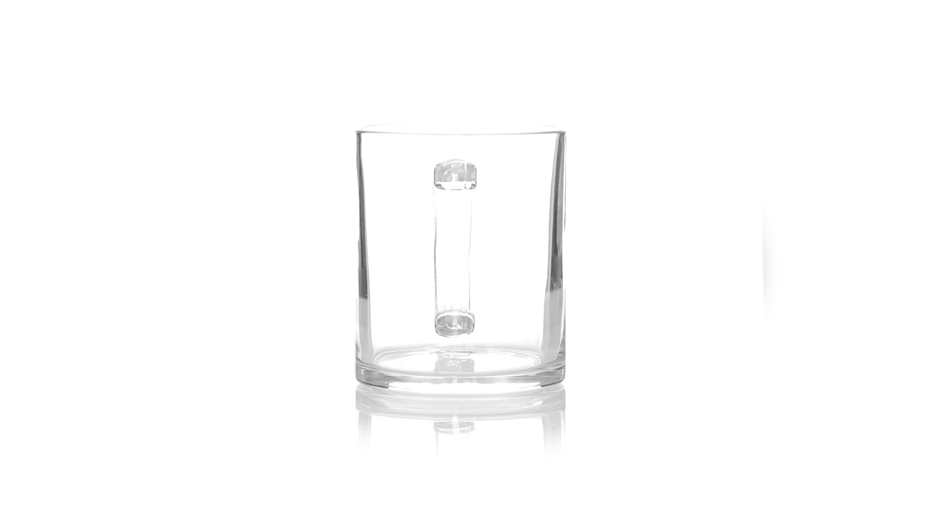 Transparenter Glasbecher mit 350 ml Fassungsvermögen und passendem Henkel. Präsentiert in einer individuellen Kraft-Design-Box.