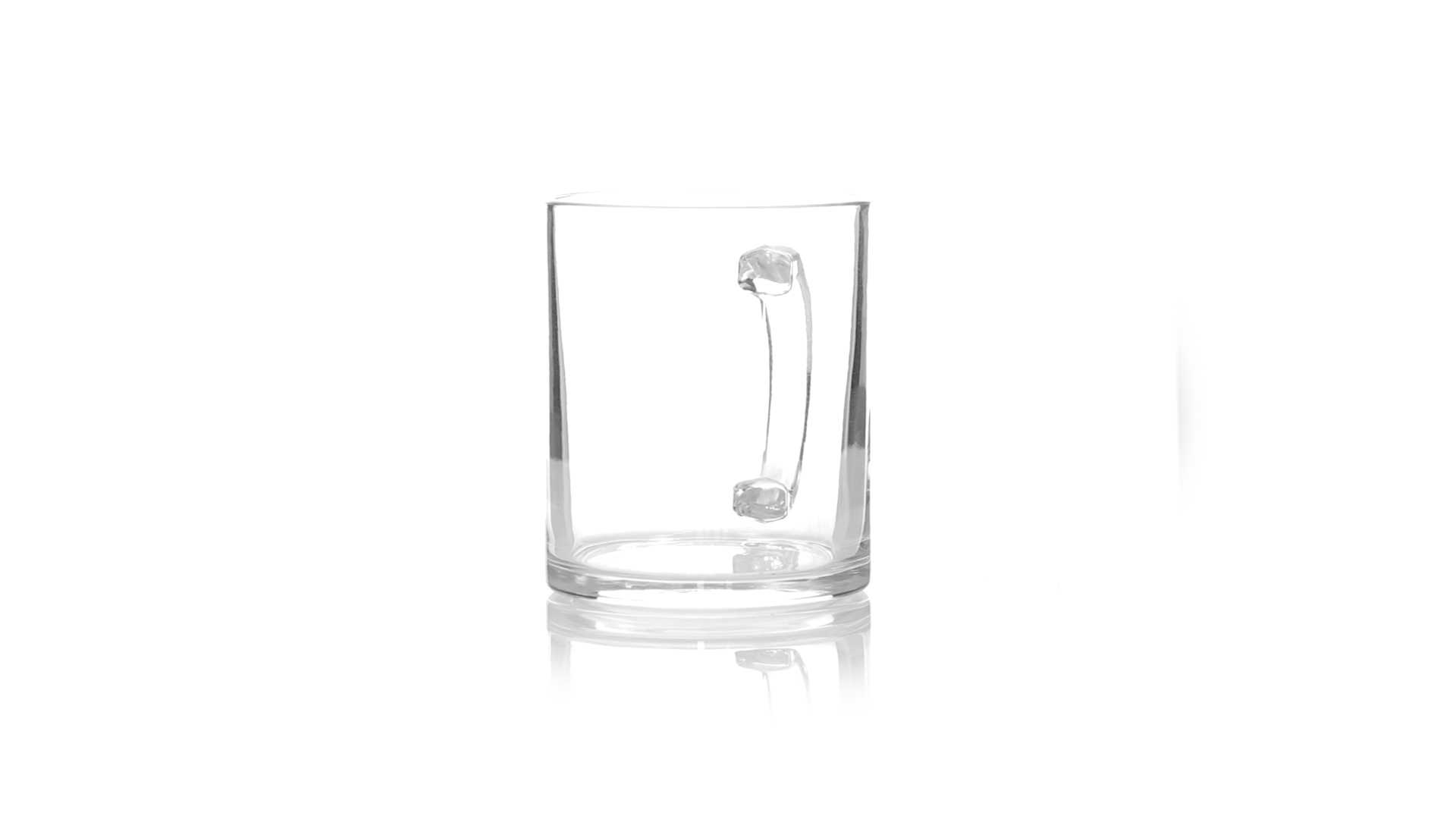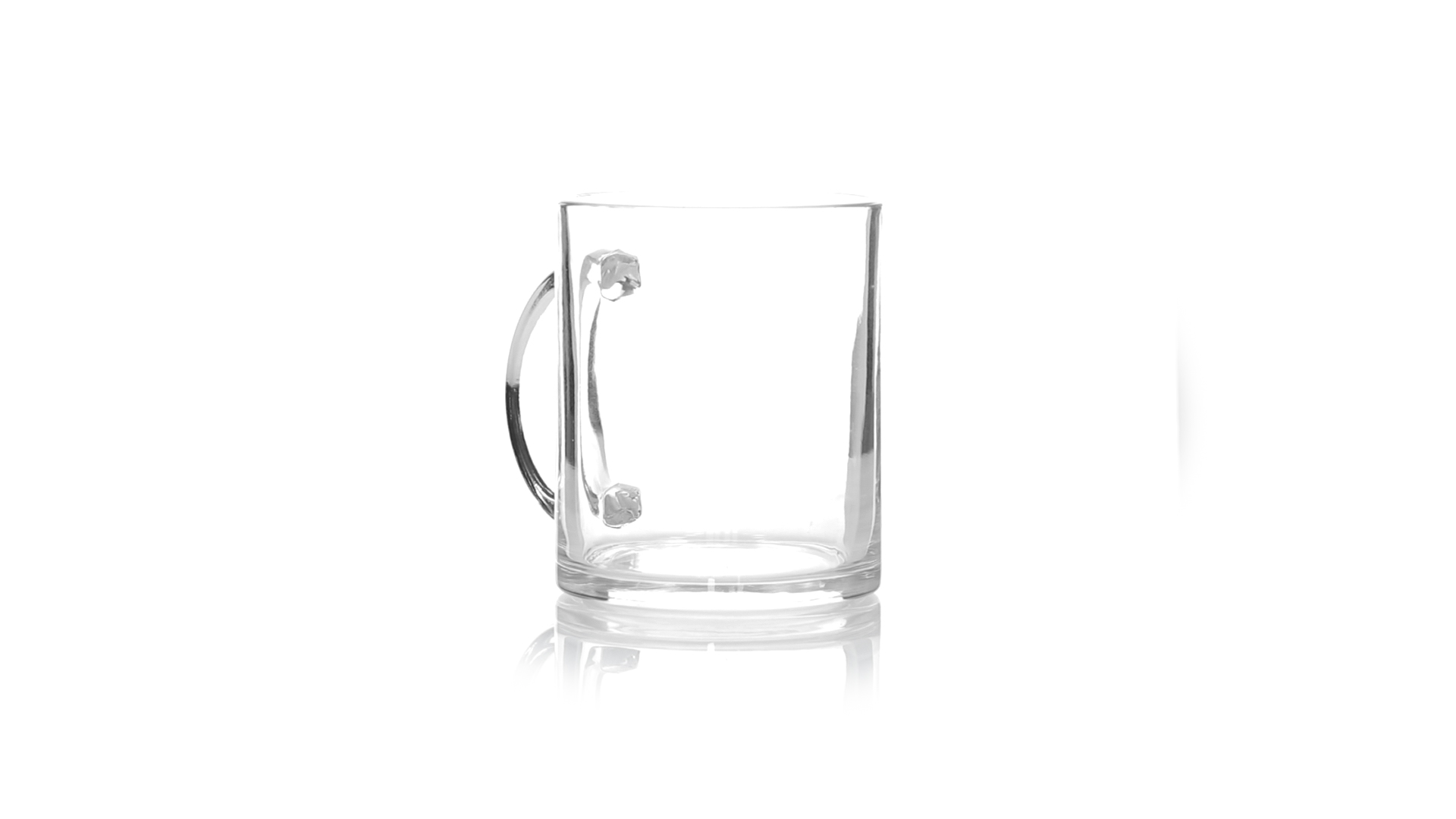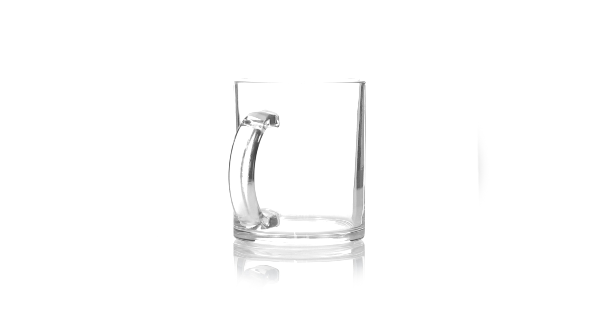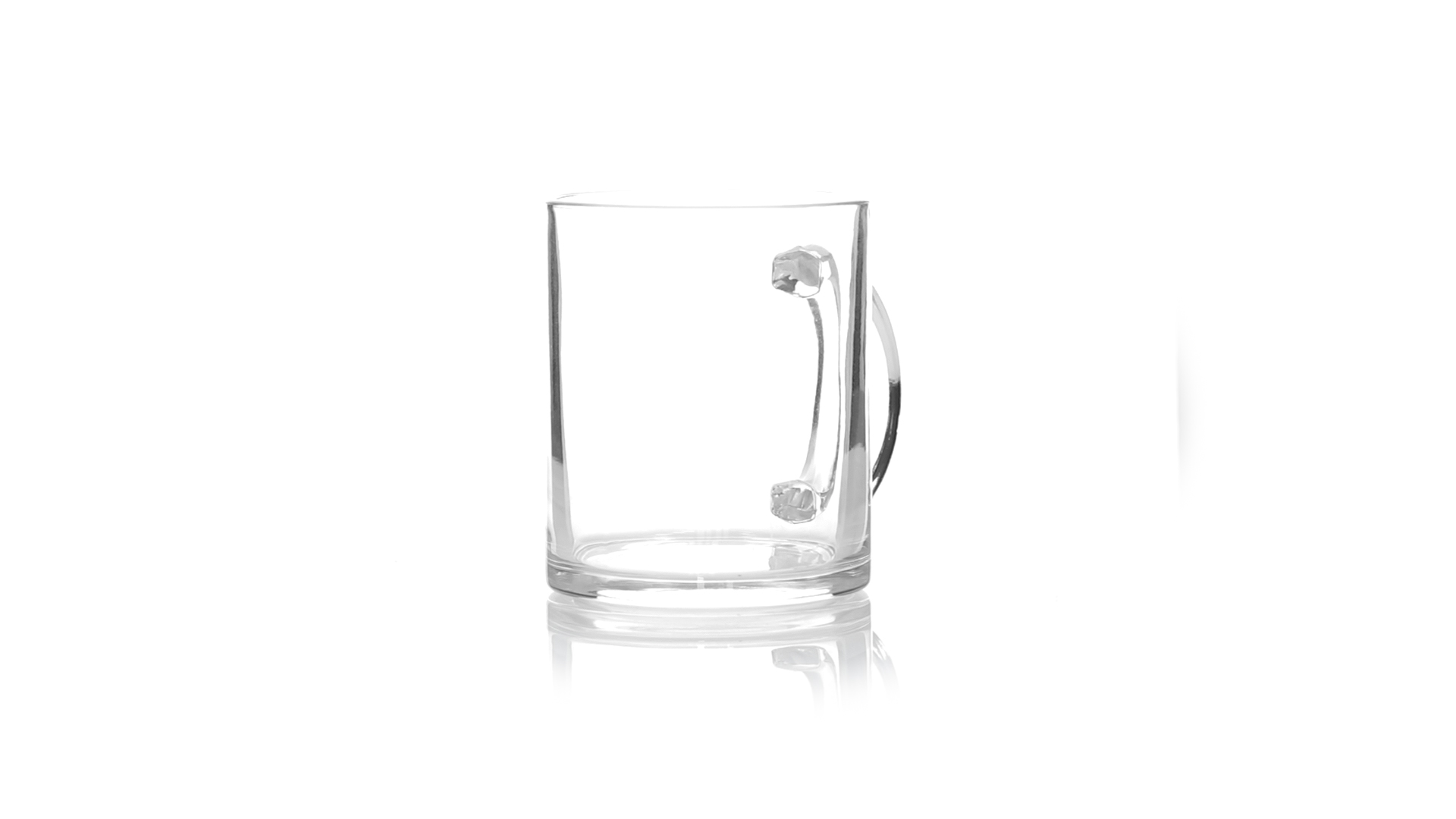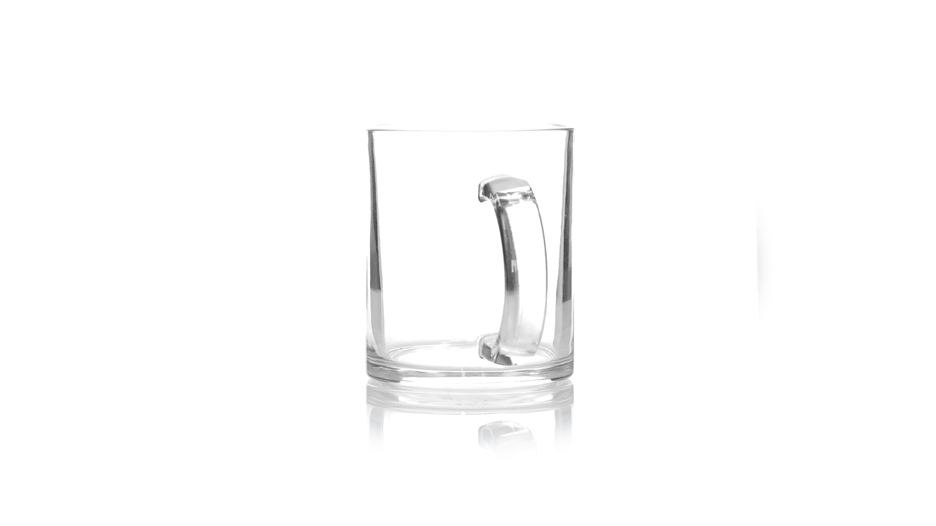 Transparenter Glasbecher mit 350 ml Fassungsvermögen und passendem Henkel. Präsentiert in einer individuellen Kraft-Design-Box.
