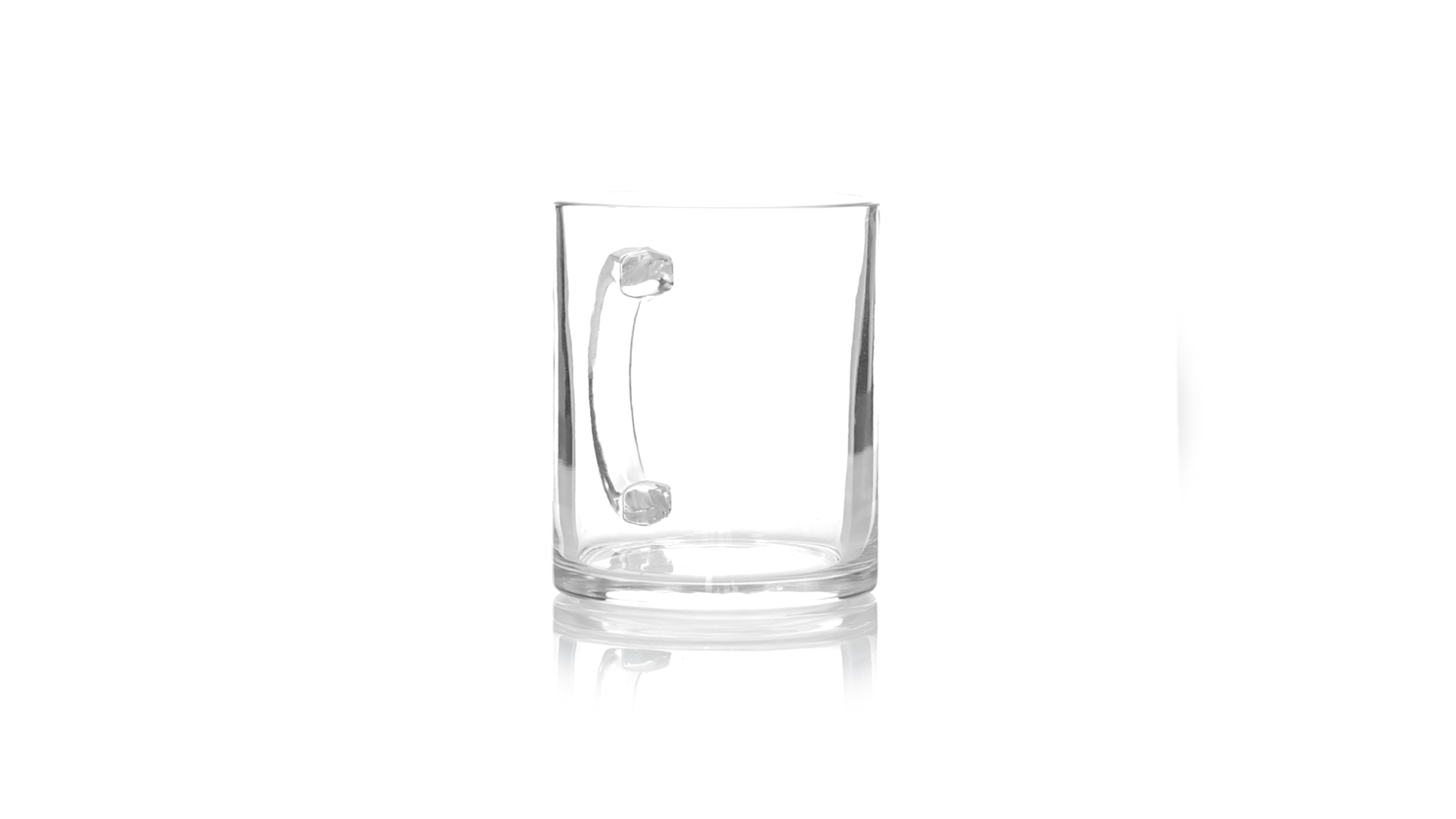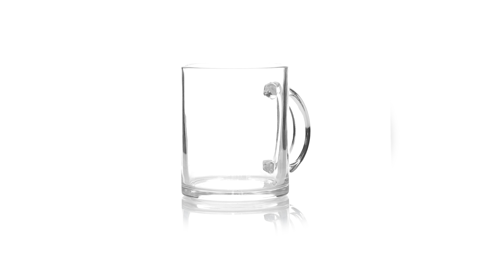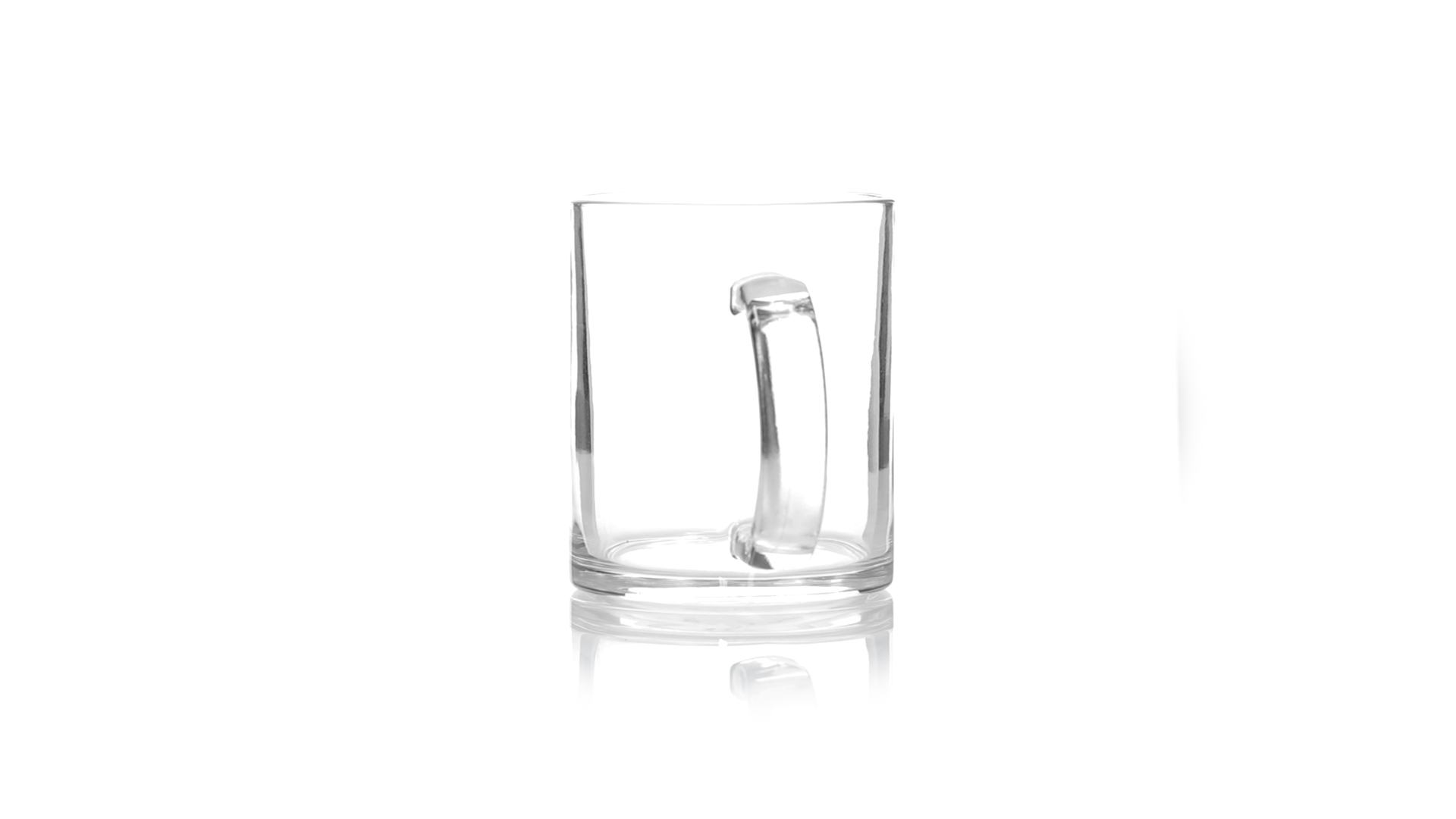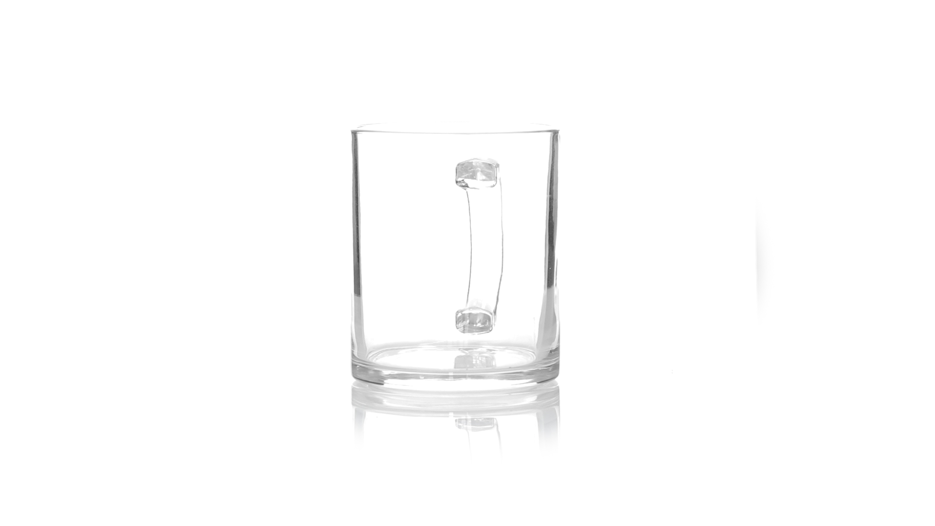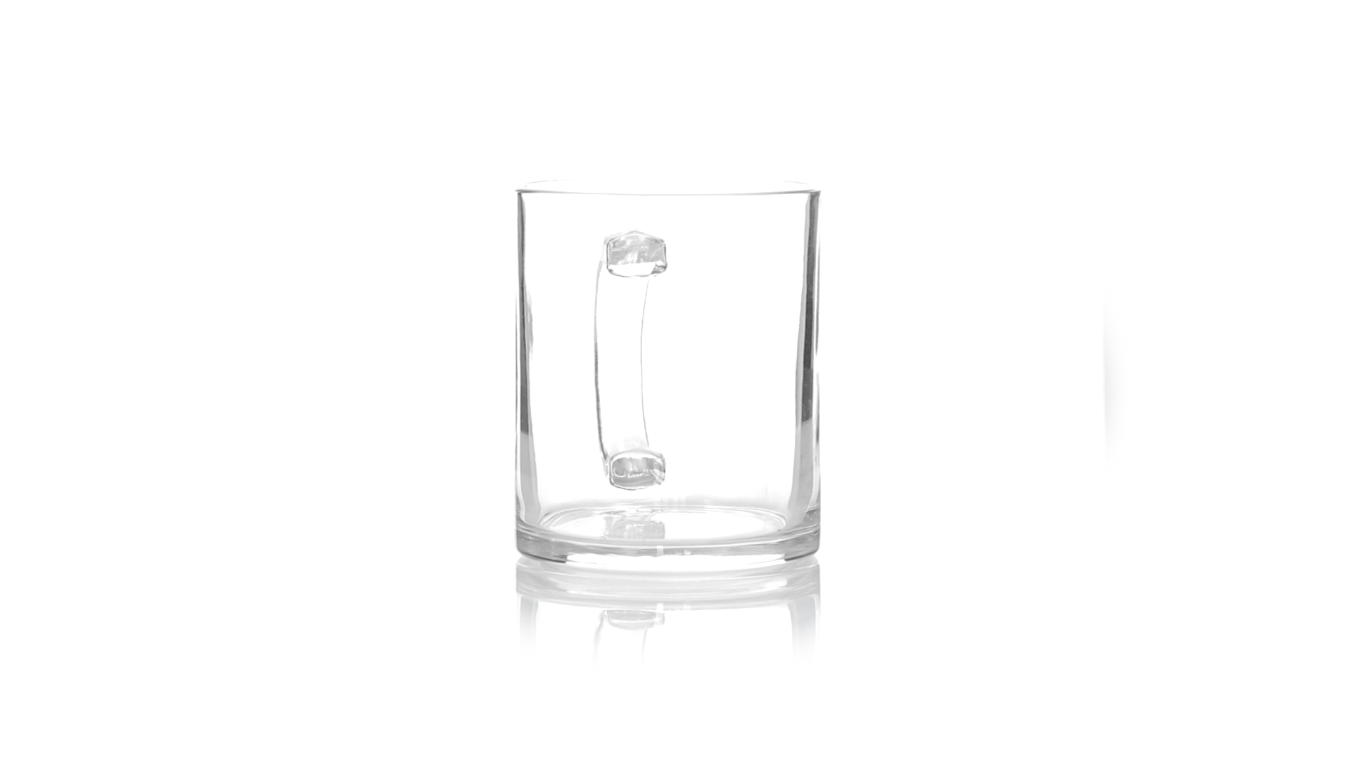 Transparenter Glasbecher mit 350 ml Fassungsvermögen und passendem Henkel. Präsentiert in einer individuellen Kraft-Design-Box.