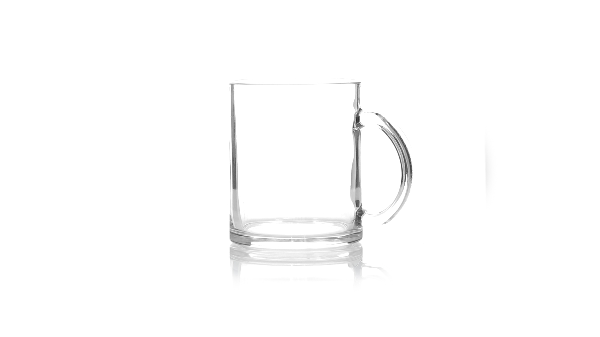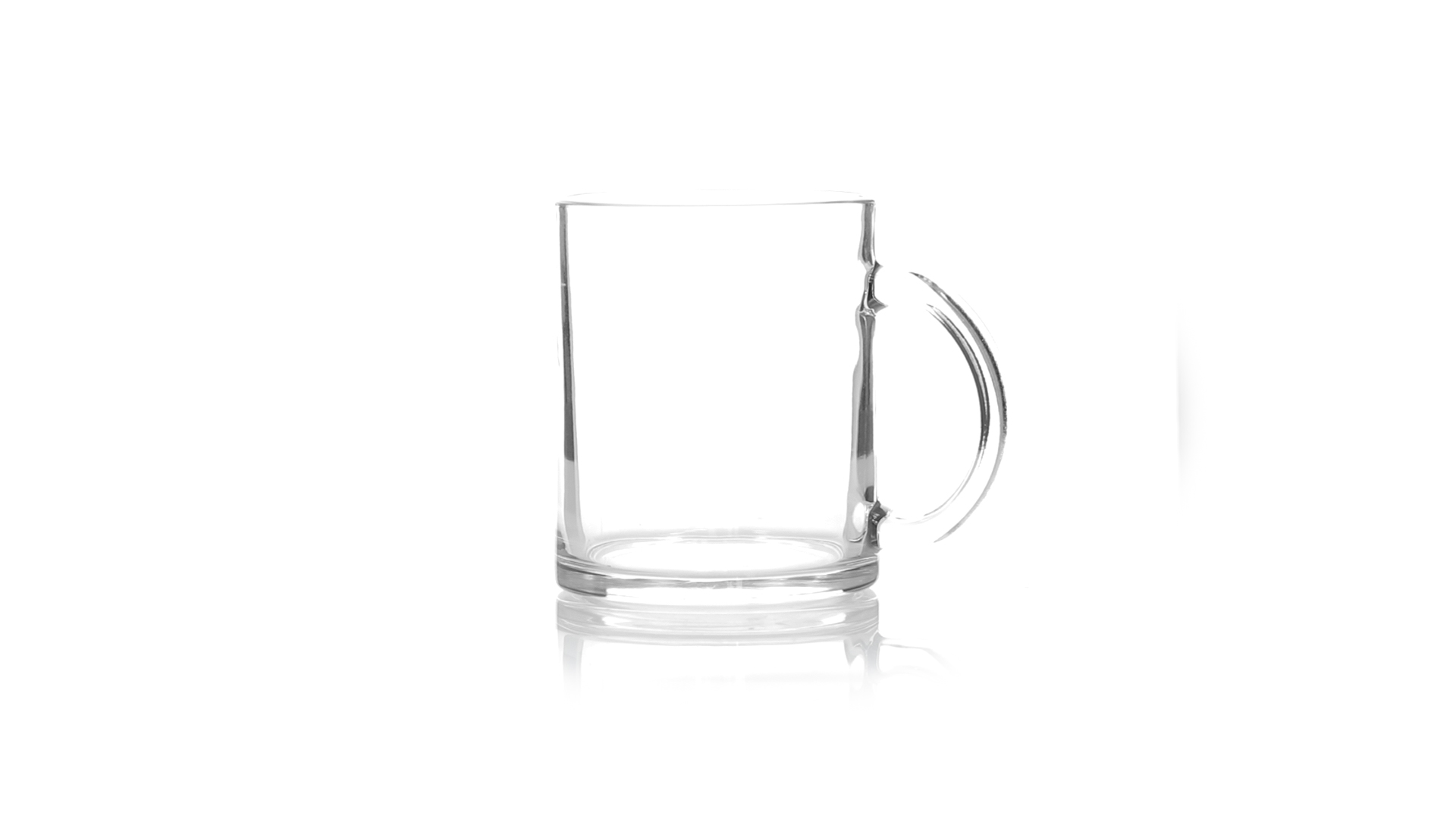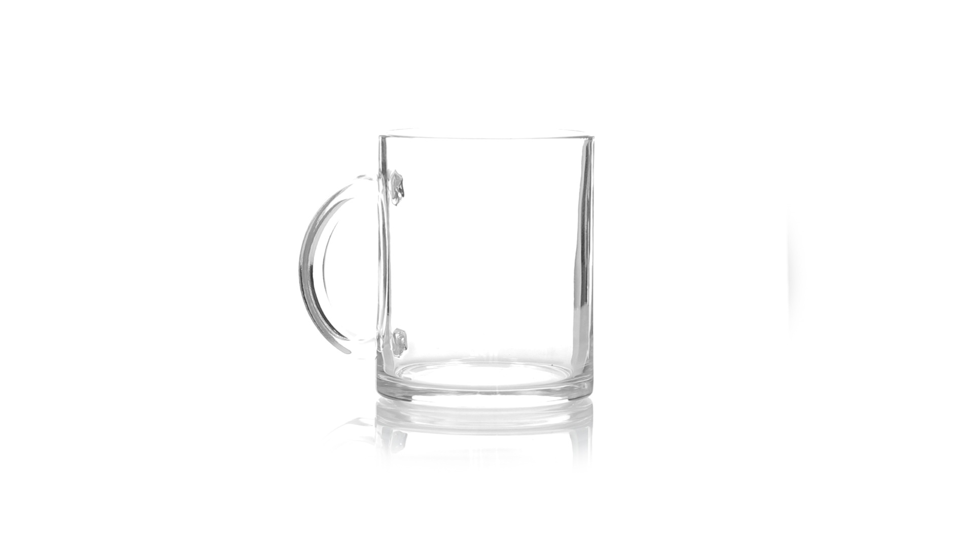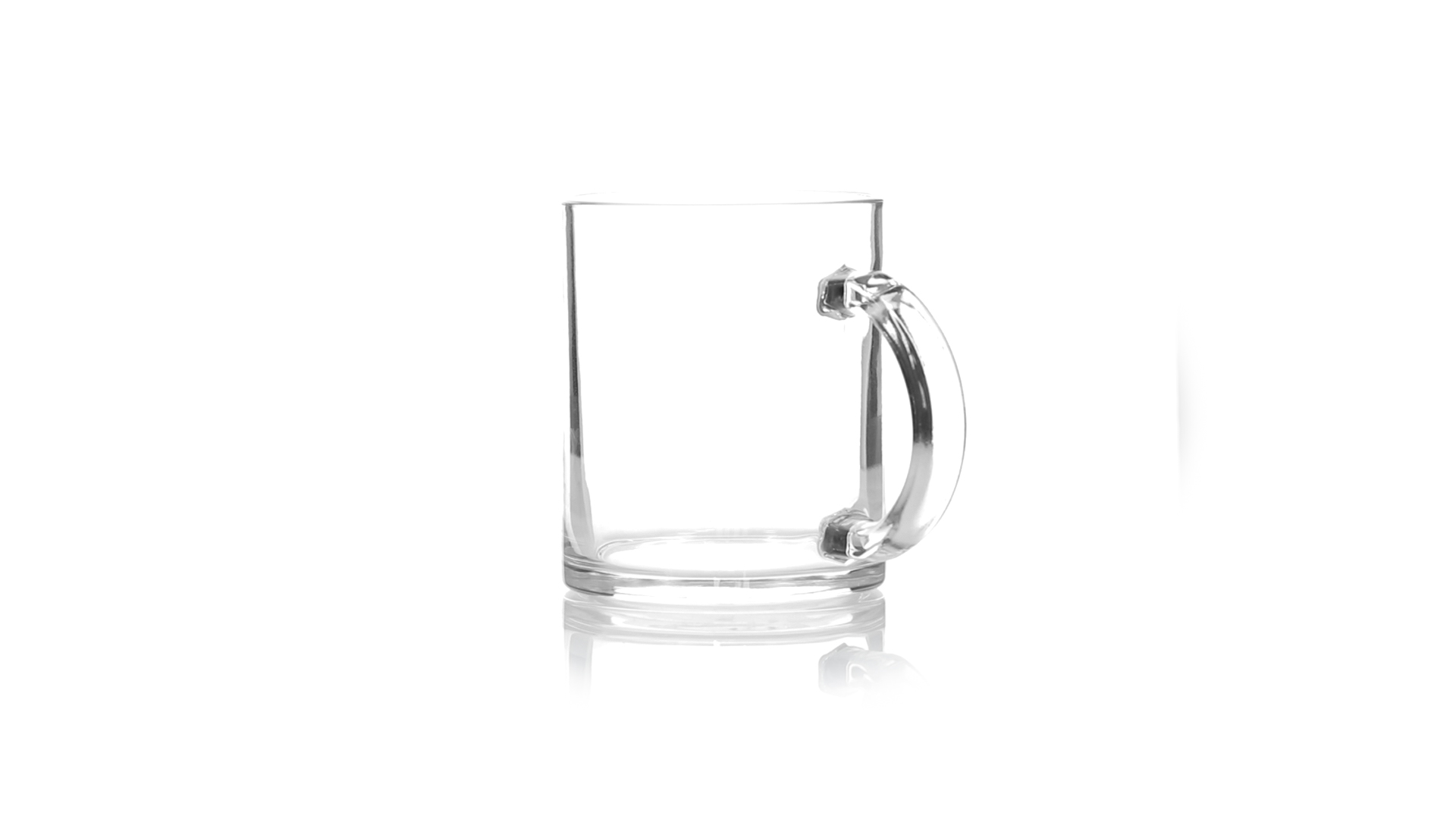 Transparenter Glasbecher mit 350 ml Fassungsvermögen und passendem Henkel. Präsentiert in einer individuellen Kraft-Design-Box.