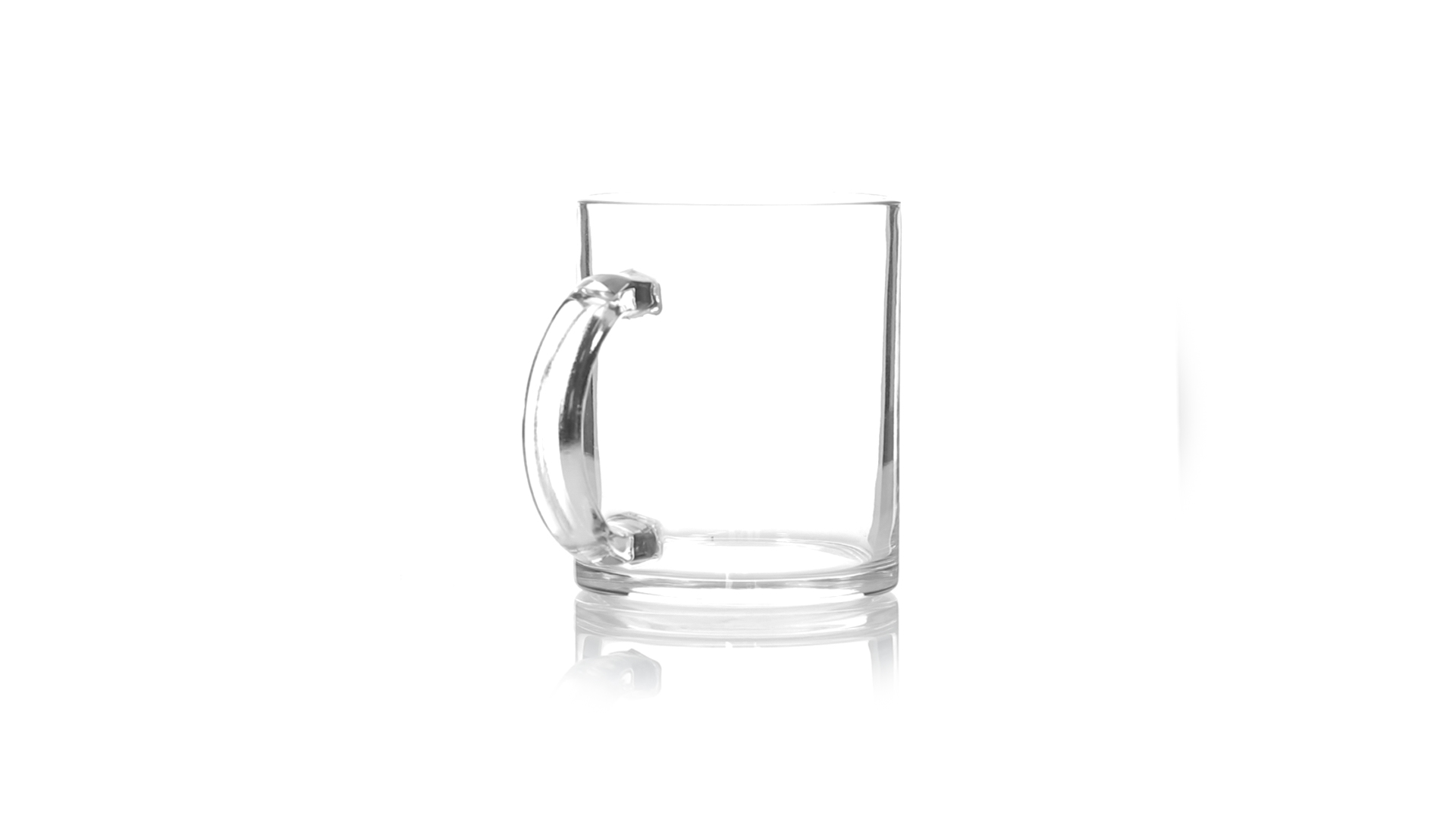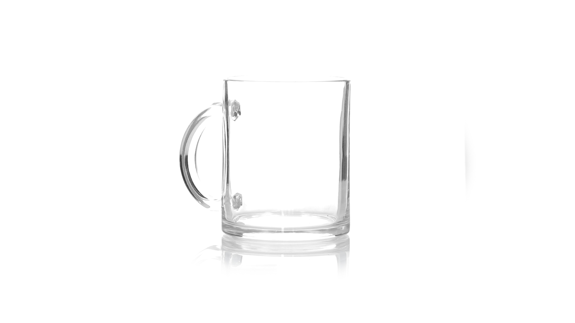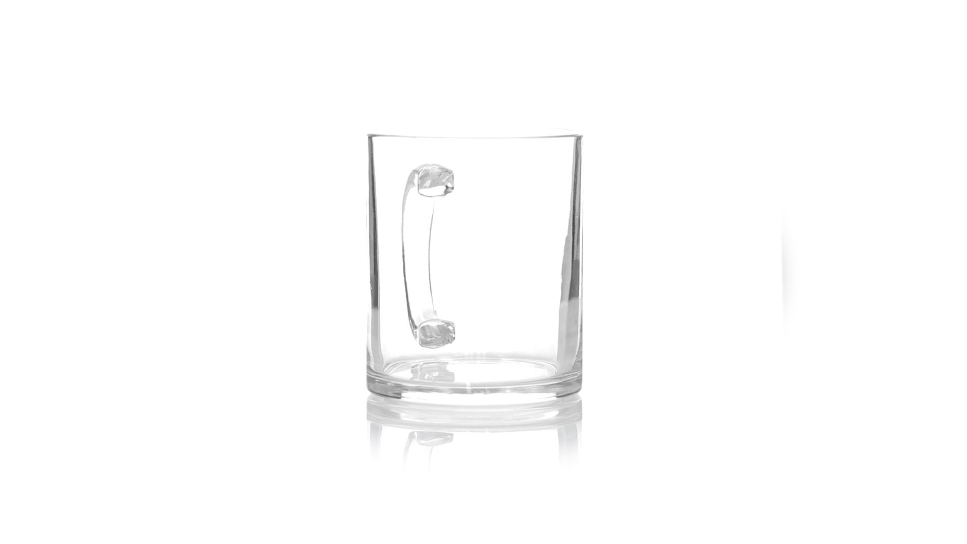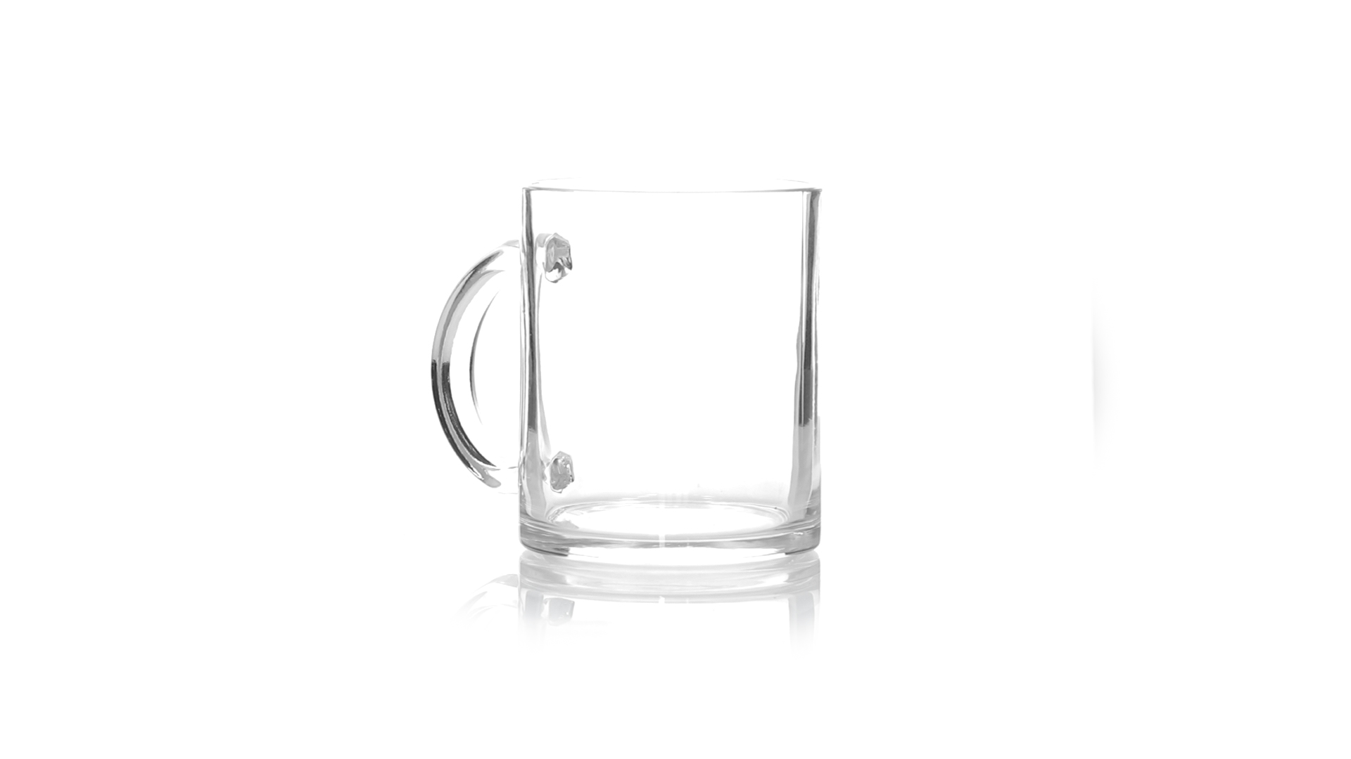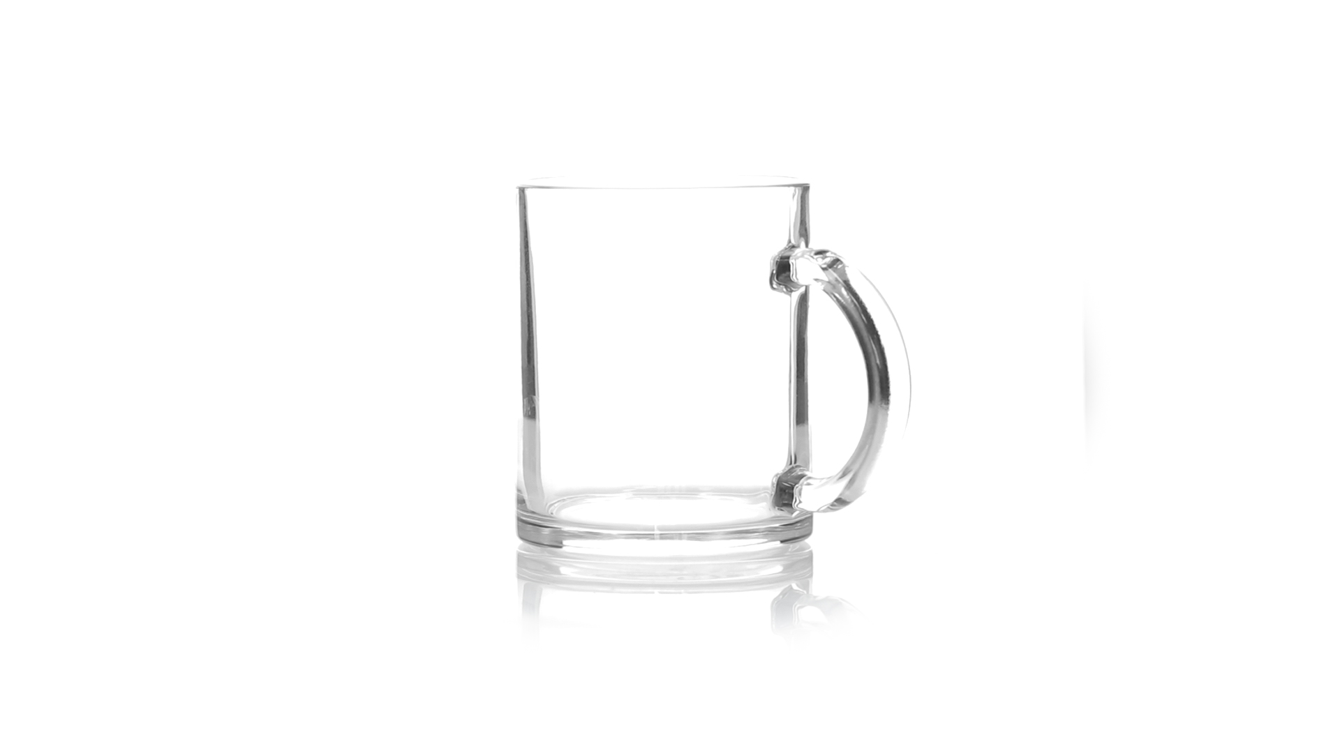 Transparenter Glasbecher mit 350 ml Fassungsvermögen und passendem Henkel. Präsentiert in einer individuellen Kraft-Design-Box.