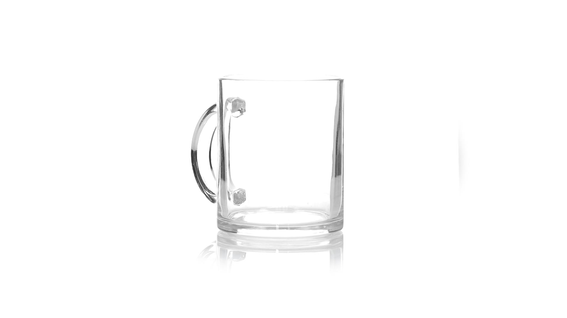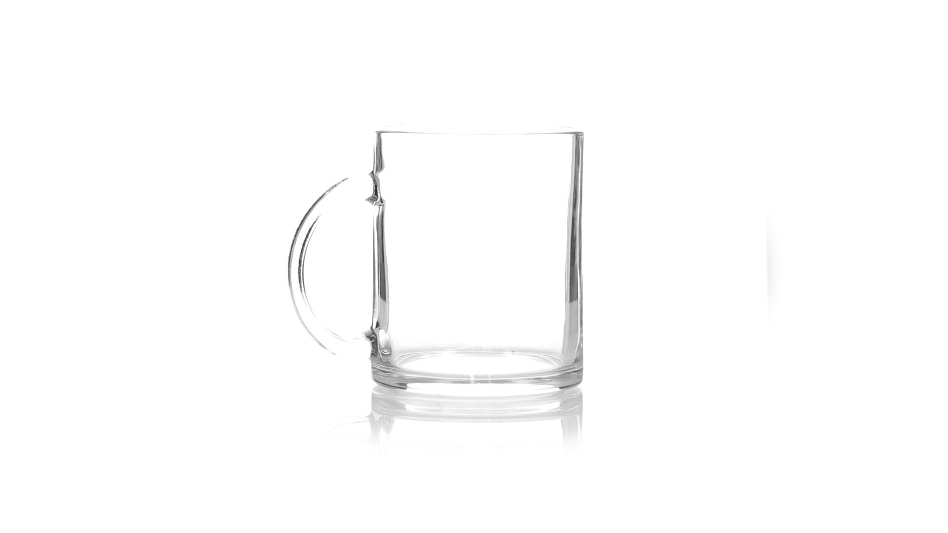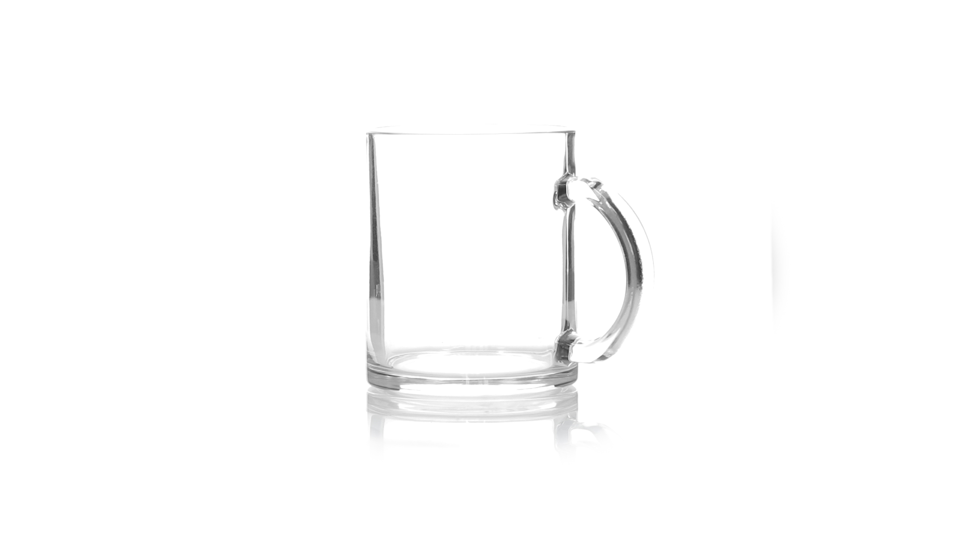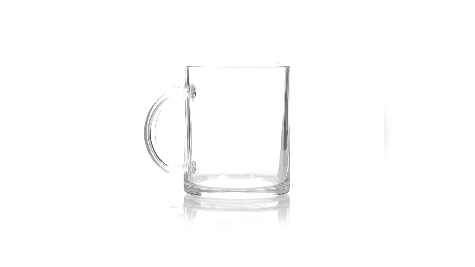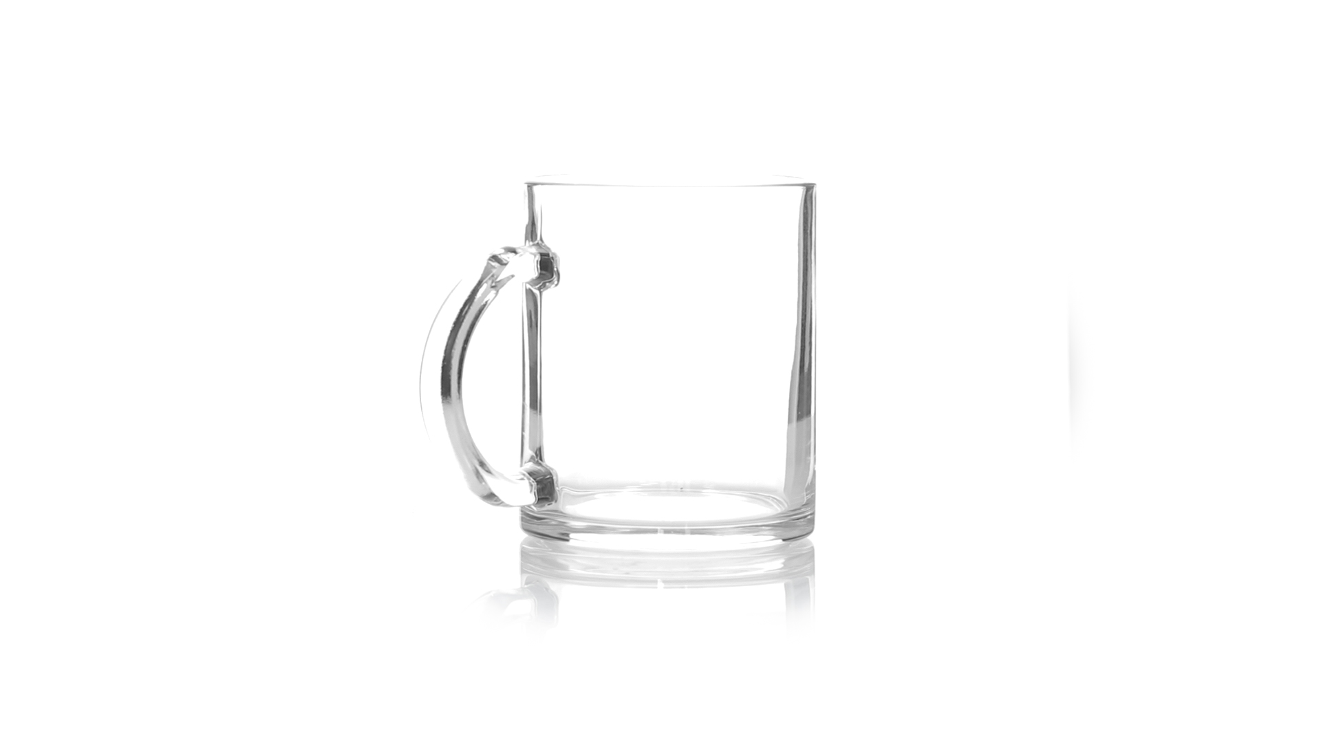 Transparenter Glasbecher mit 350 ml Fassungsvermögen und passendem Henkel. Präsentiert in einer individuellen Kraft-Design-Box.