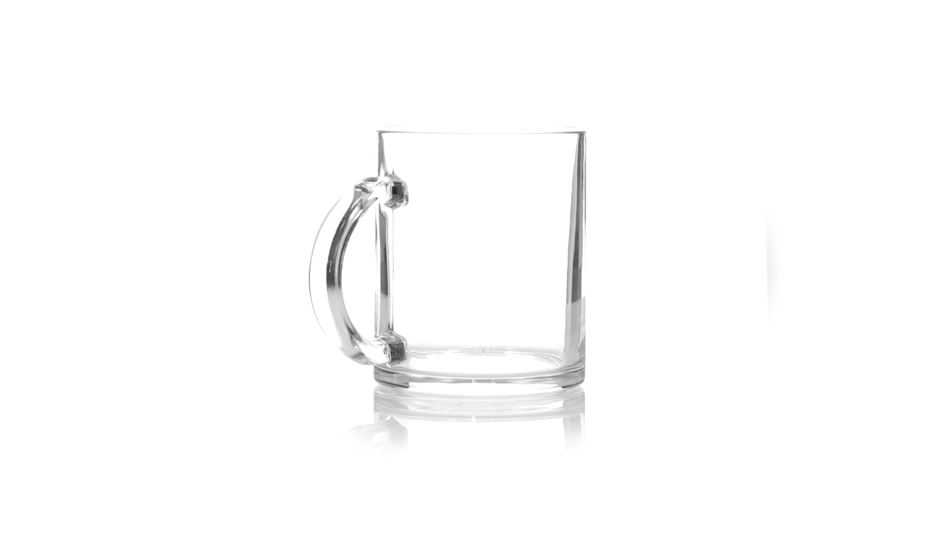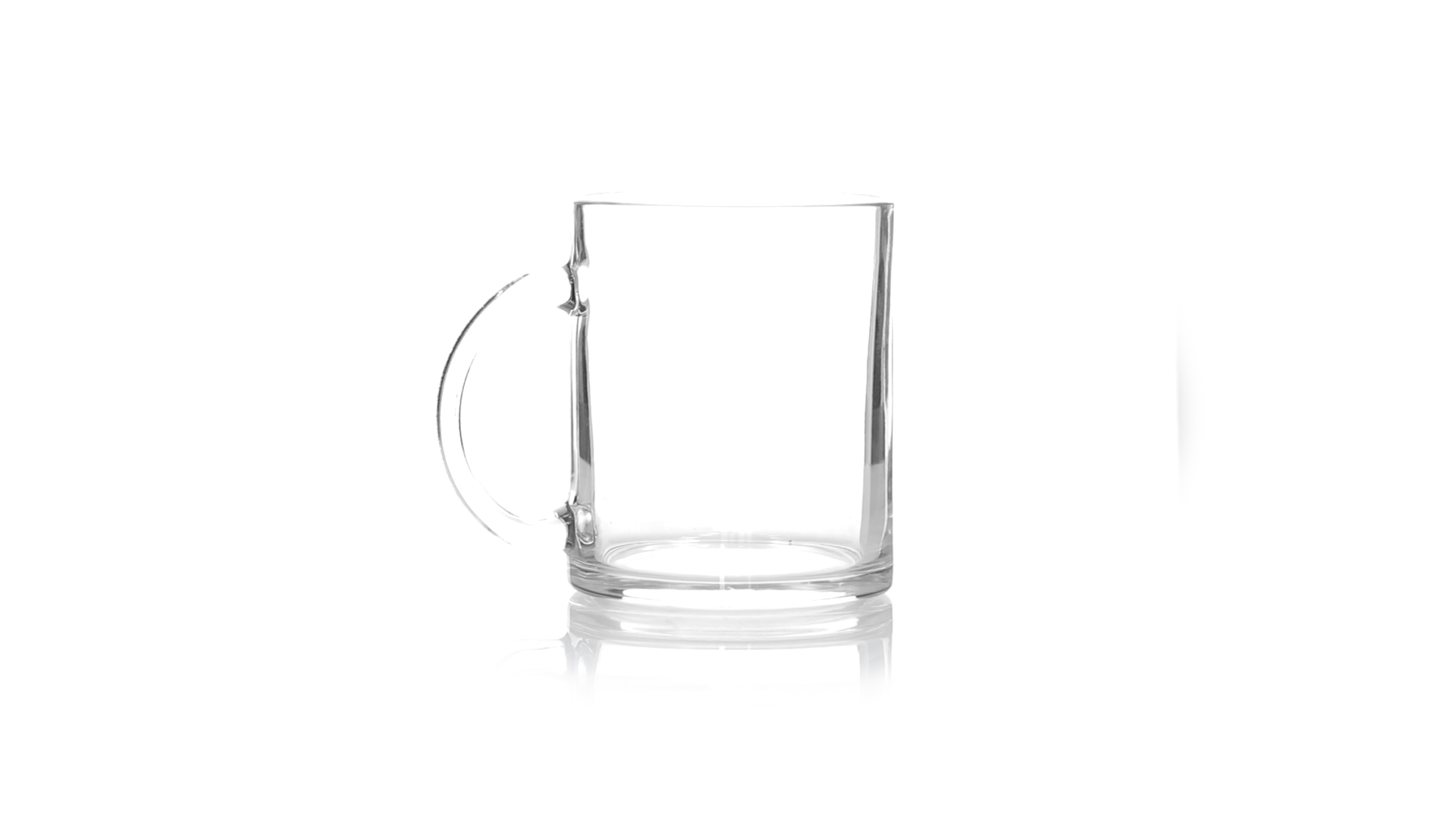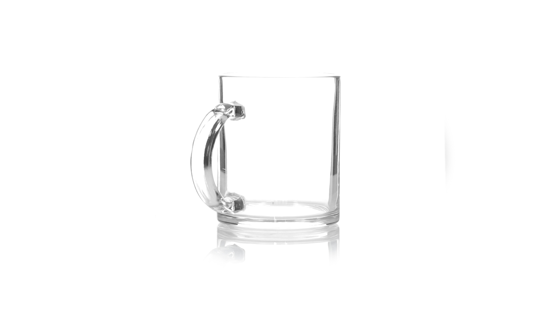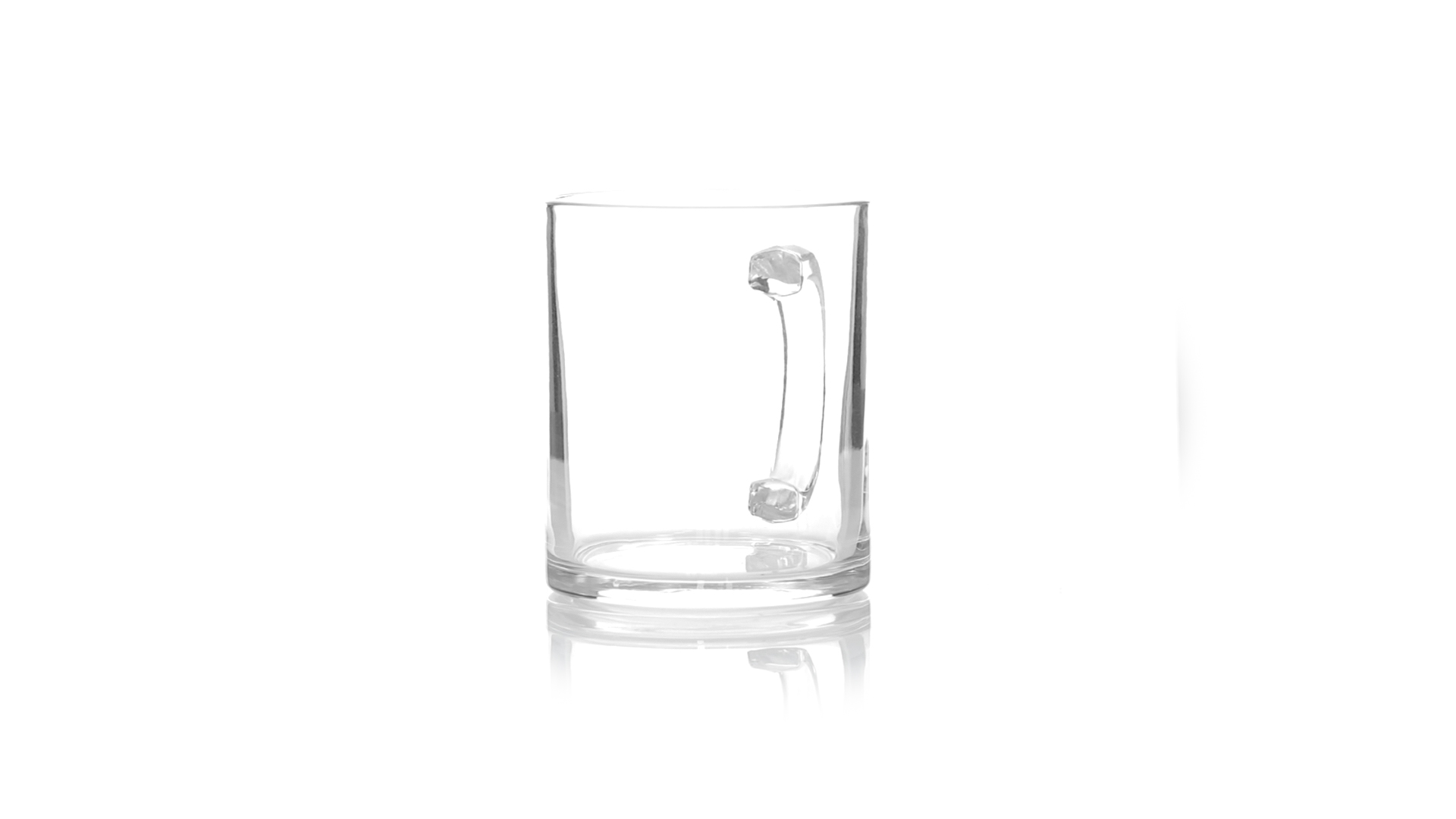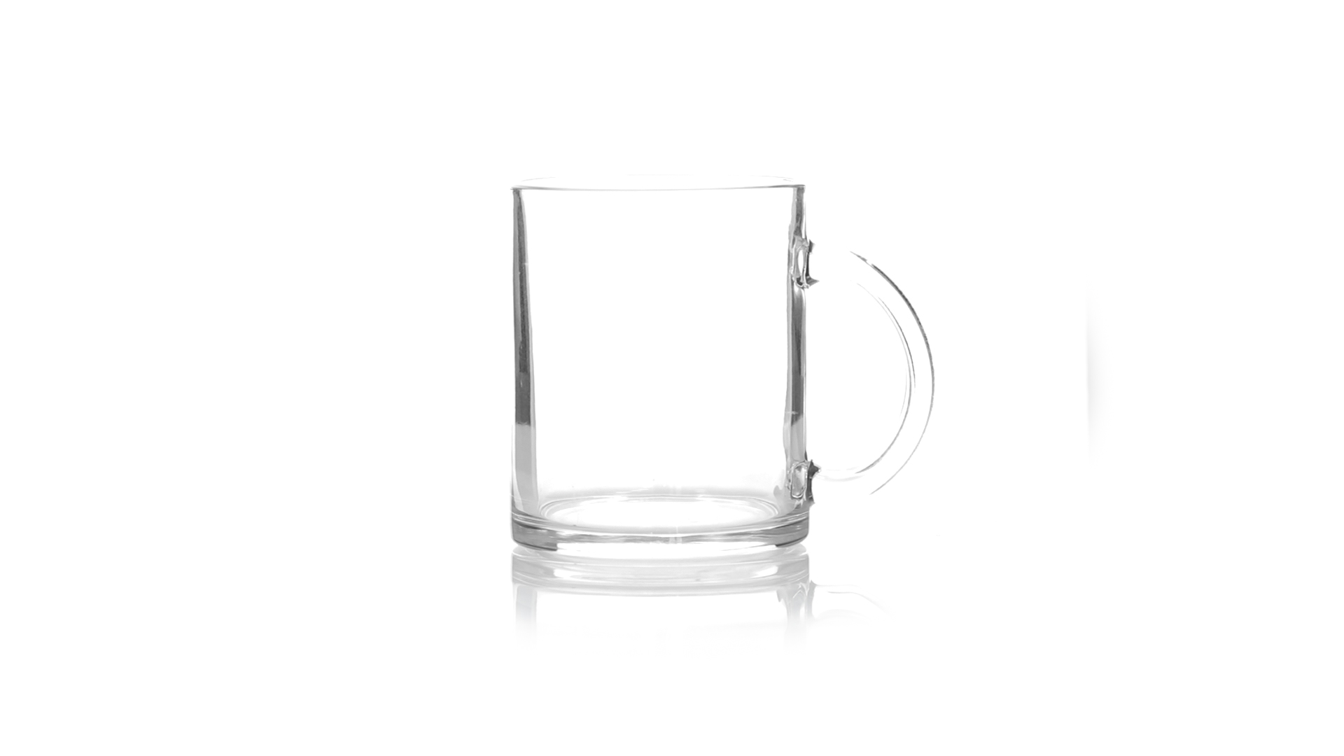 Transparenter Glasbecher mit 350 ml Fassungsvermögen und passendem Henkel. Präsentiert in einer individuellen Kraft-Design-Box.
