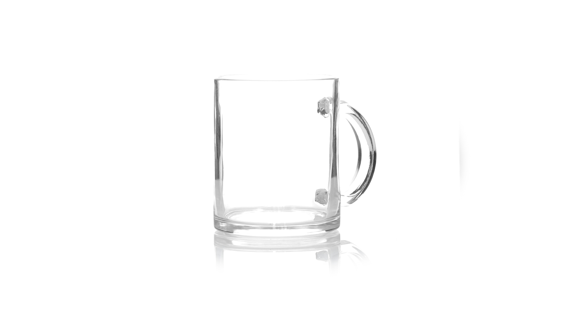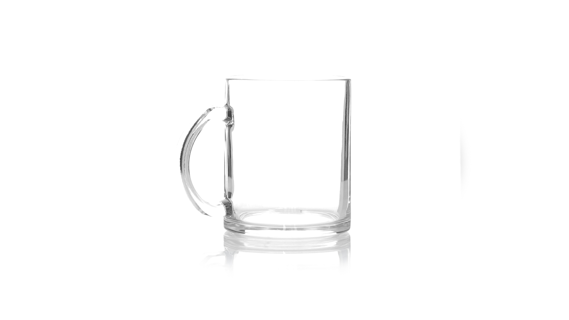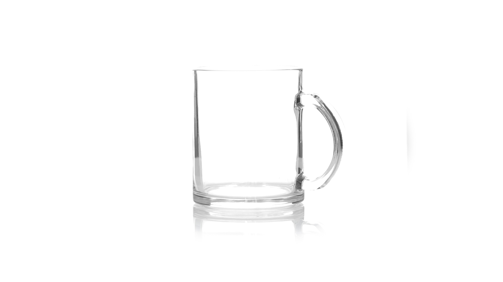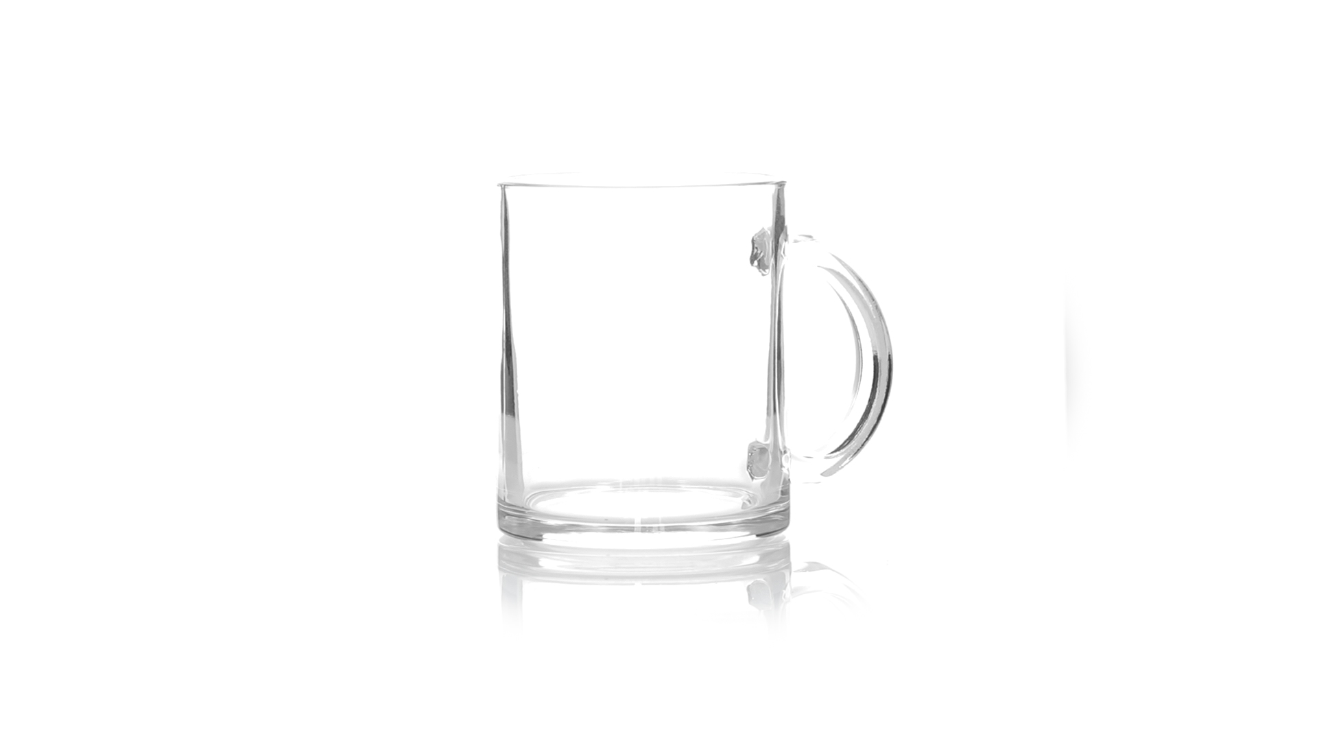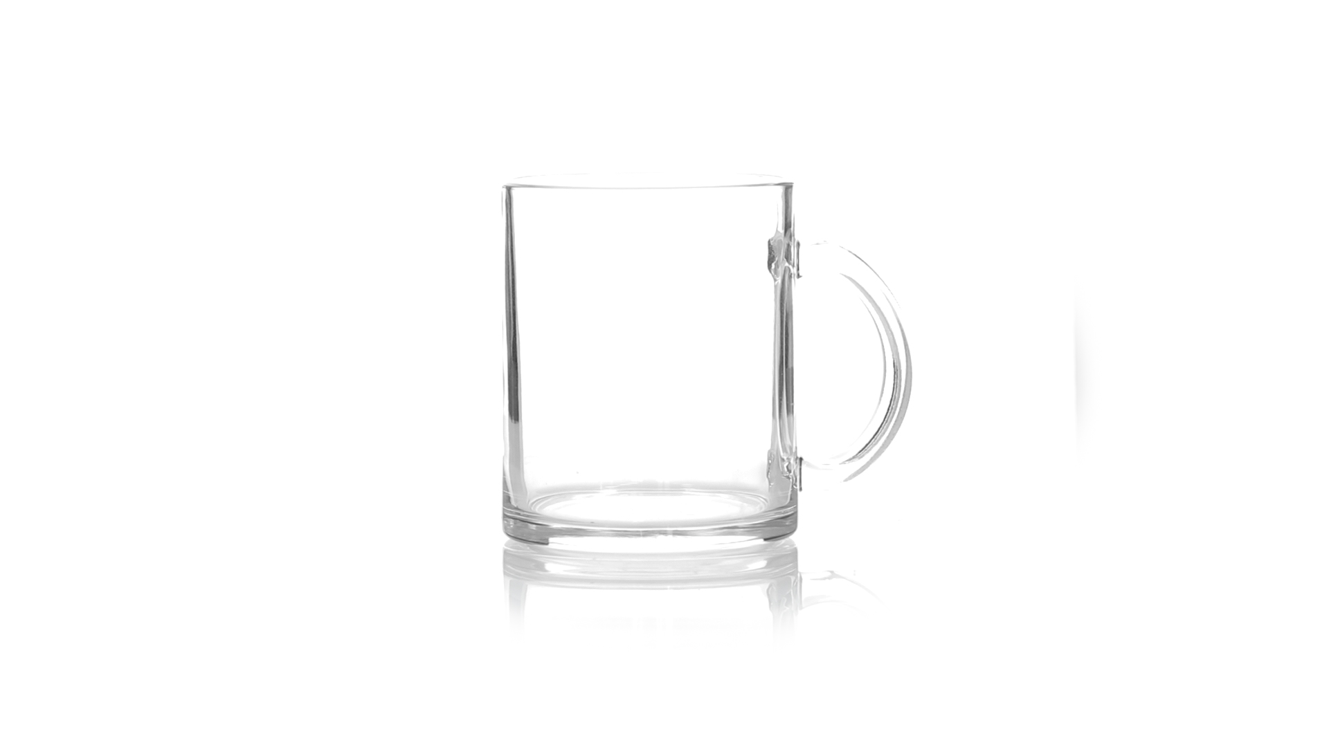 Transparenter Glasbecher mit 350 ml Fassungsvermögen und passendem Henkel. Präsentiert in einer individuellen Kraft-Design-Box.