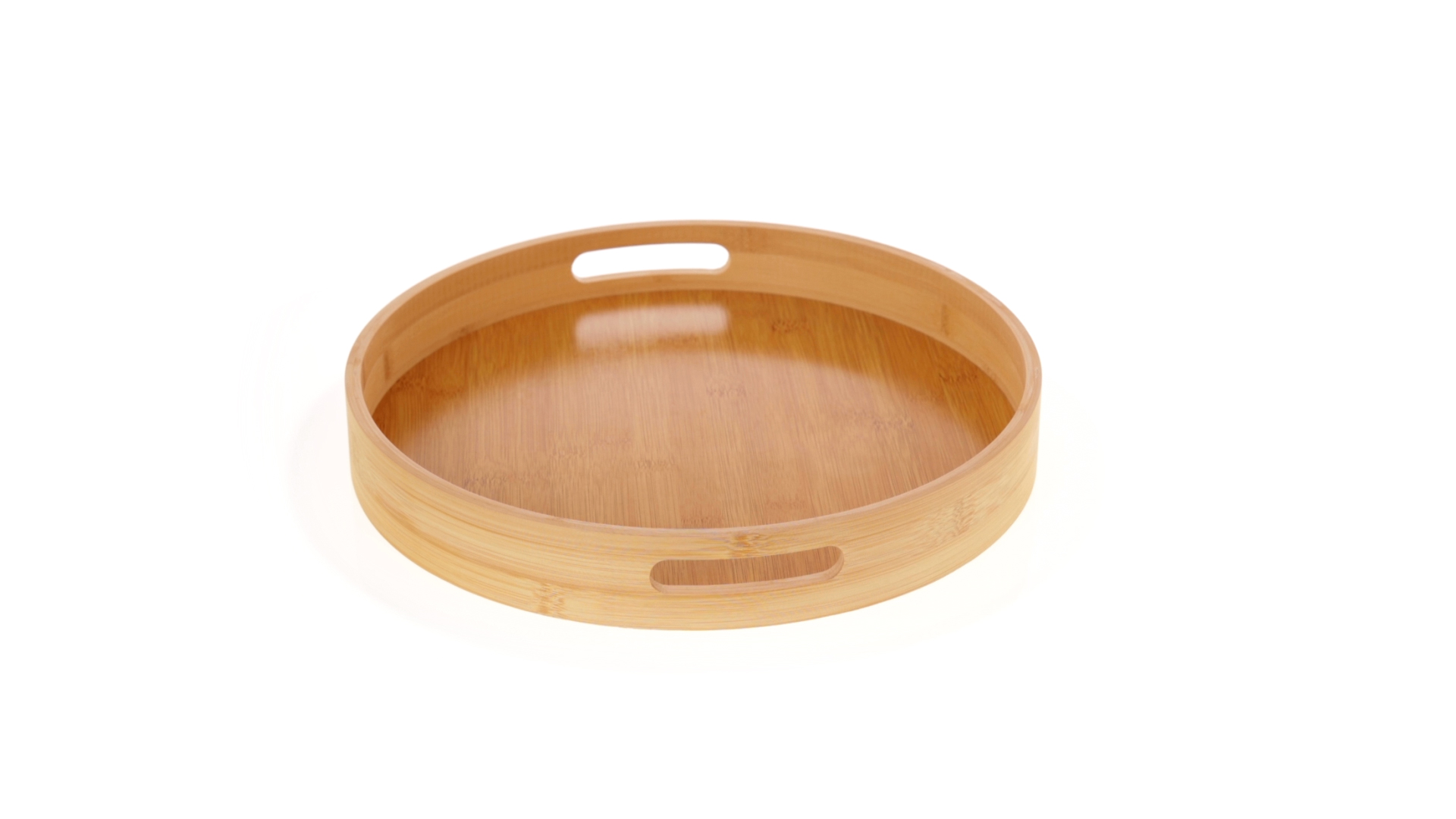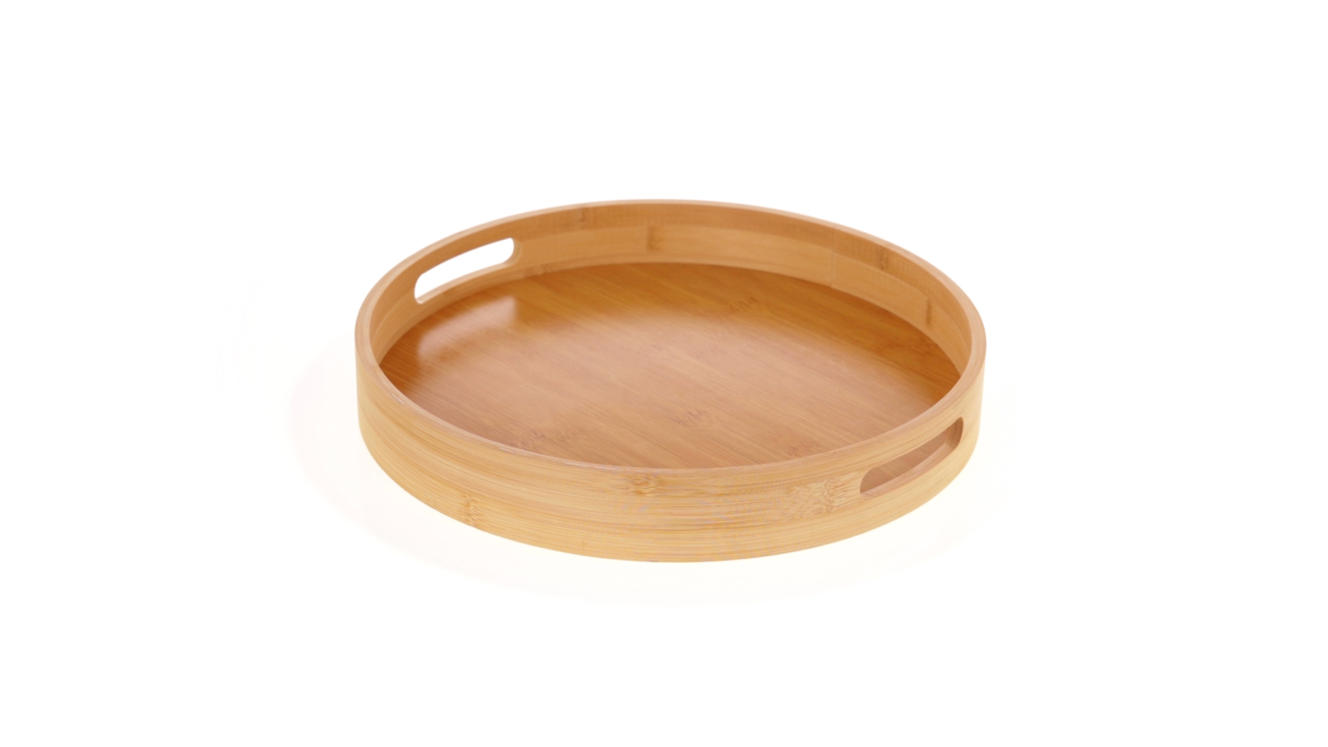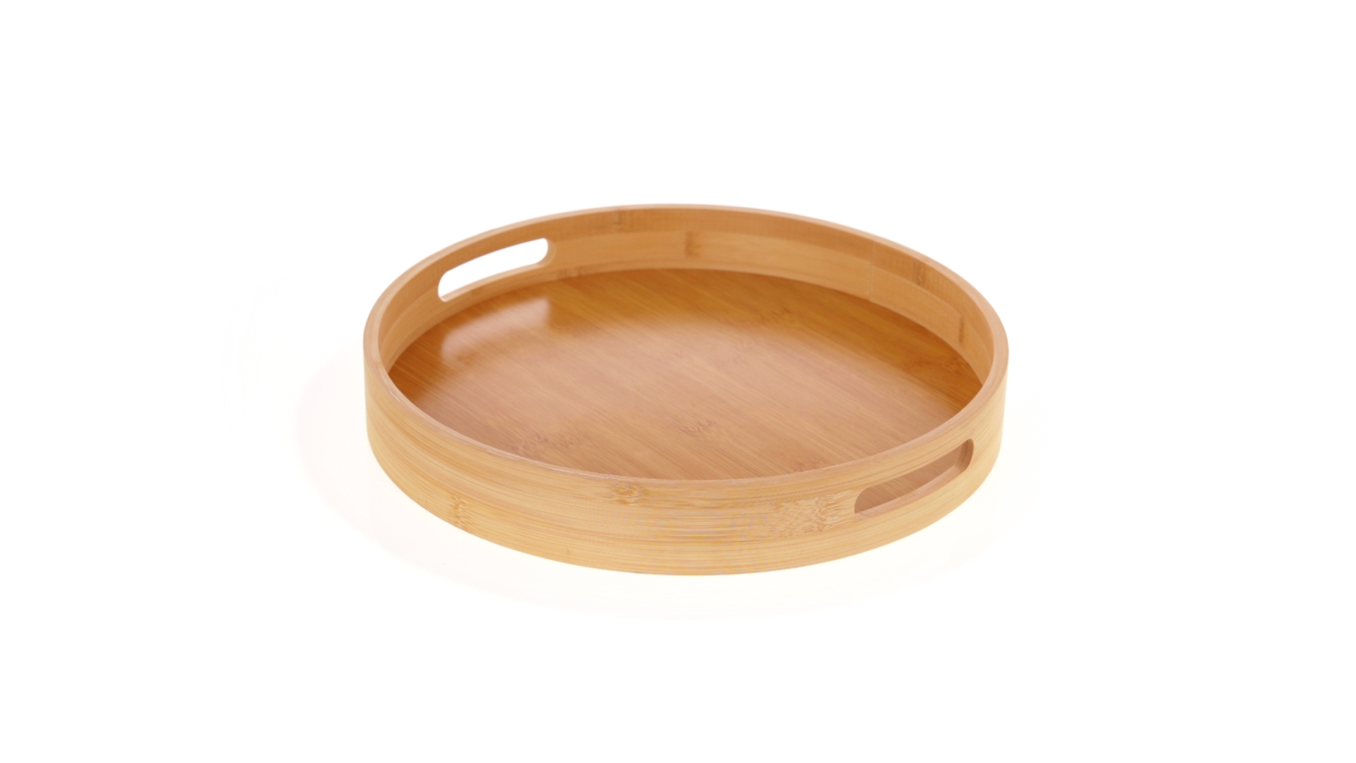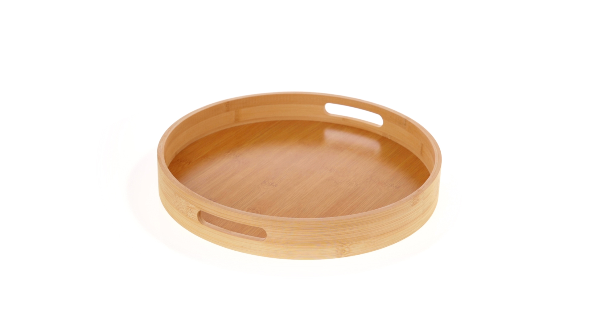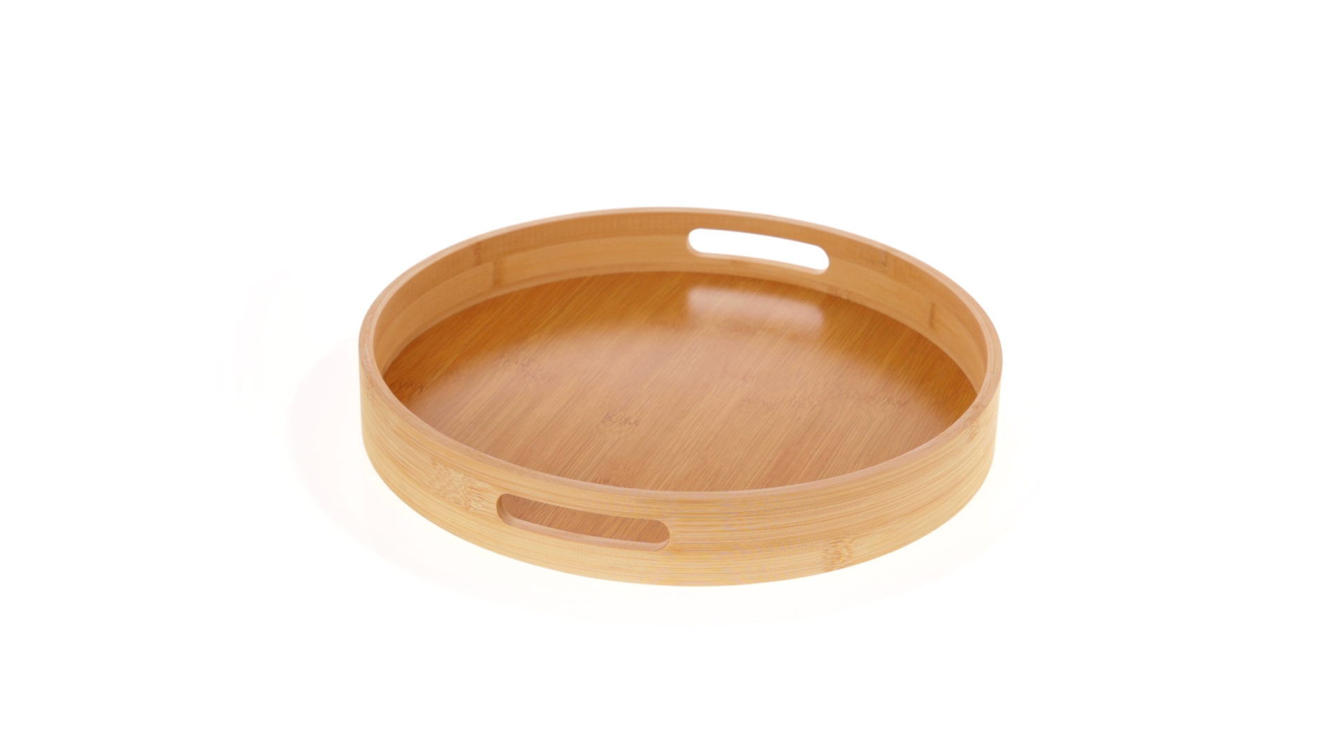 Tablett aus Bambus. Umweltfreundliches Design aus weichem Bambus zum bequemen Tragen von Getränken mithilfe der gestanzten Griffe. Materialien wie Bambus fördern die Verwendung natürlicher Rohstoffe und reduzieren den Schadstoffausstoss.