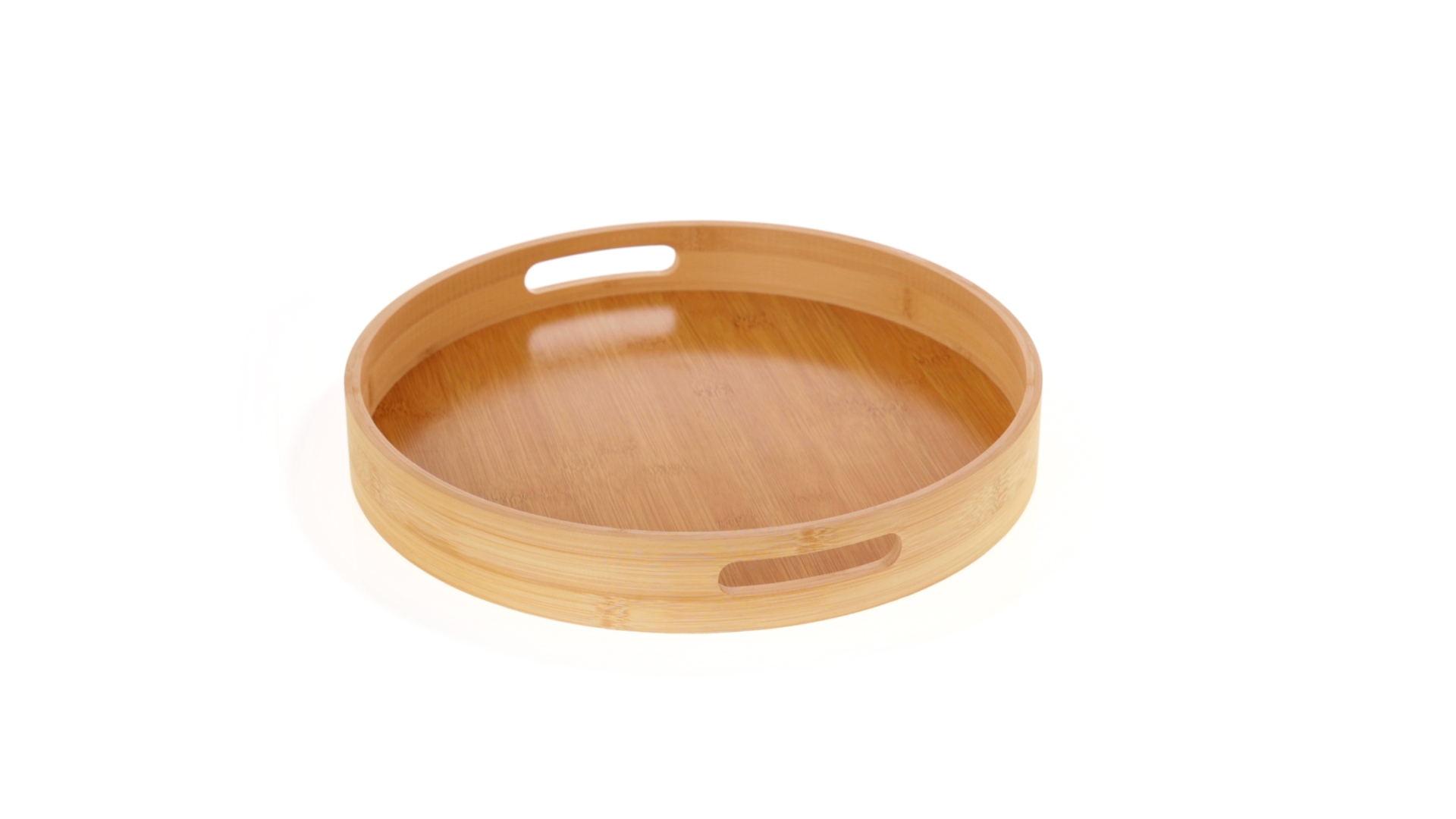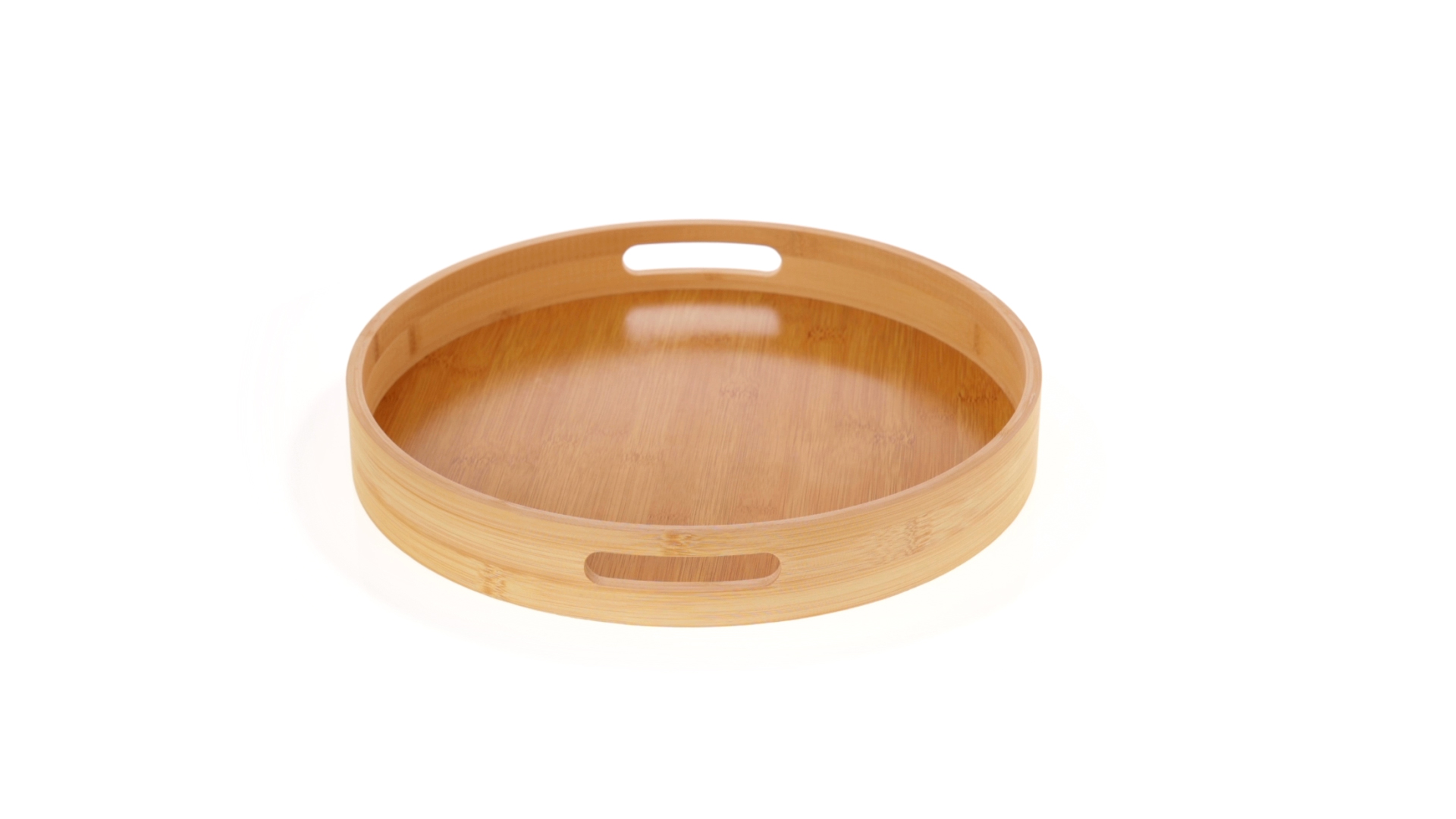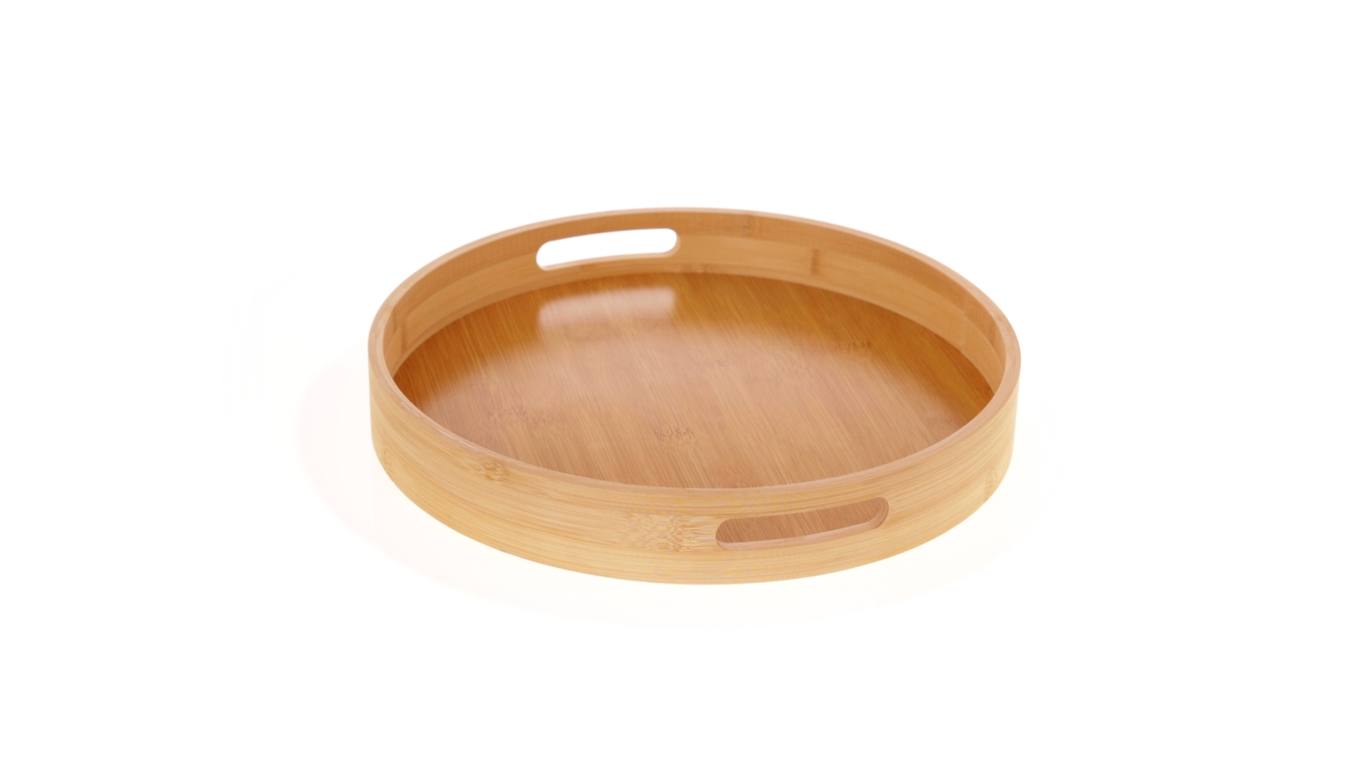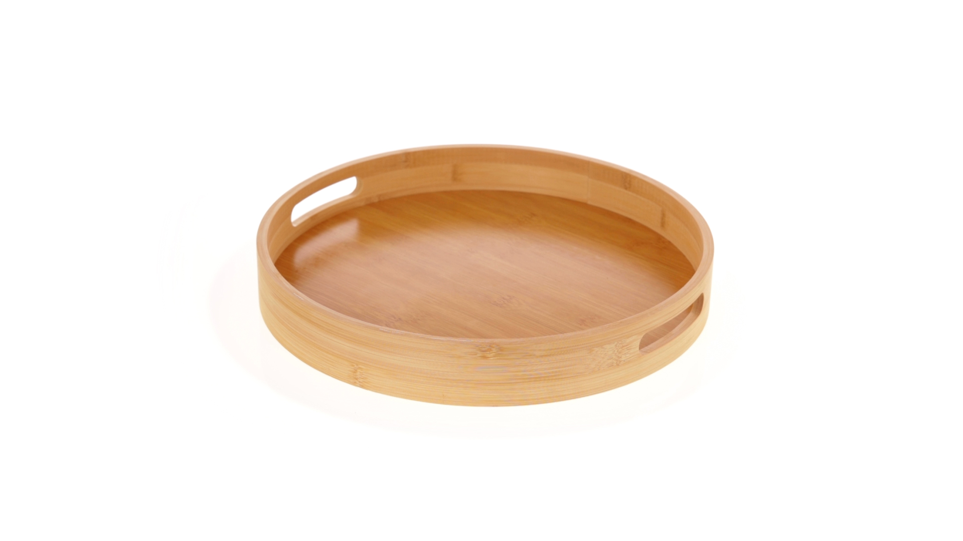 Tablett aus Bambus. Umweltfreundliches Design aus weichem Bambus zum bequemen Tragen von Getränken mithilfe der gestanzten Griffe. Materialien wie Bambus fördern die Verwendung natürlicher Rohstoffe und reduzieren den Schadstoffausstoss.