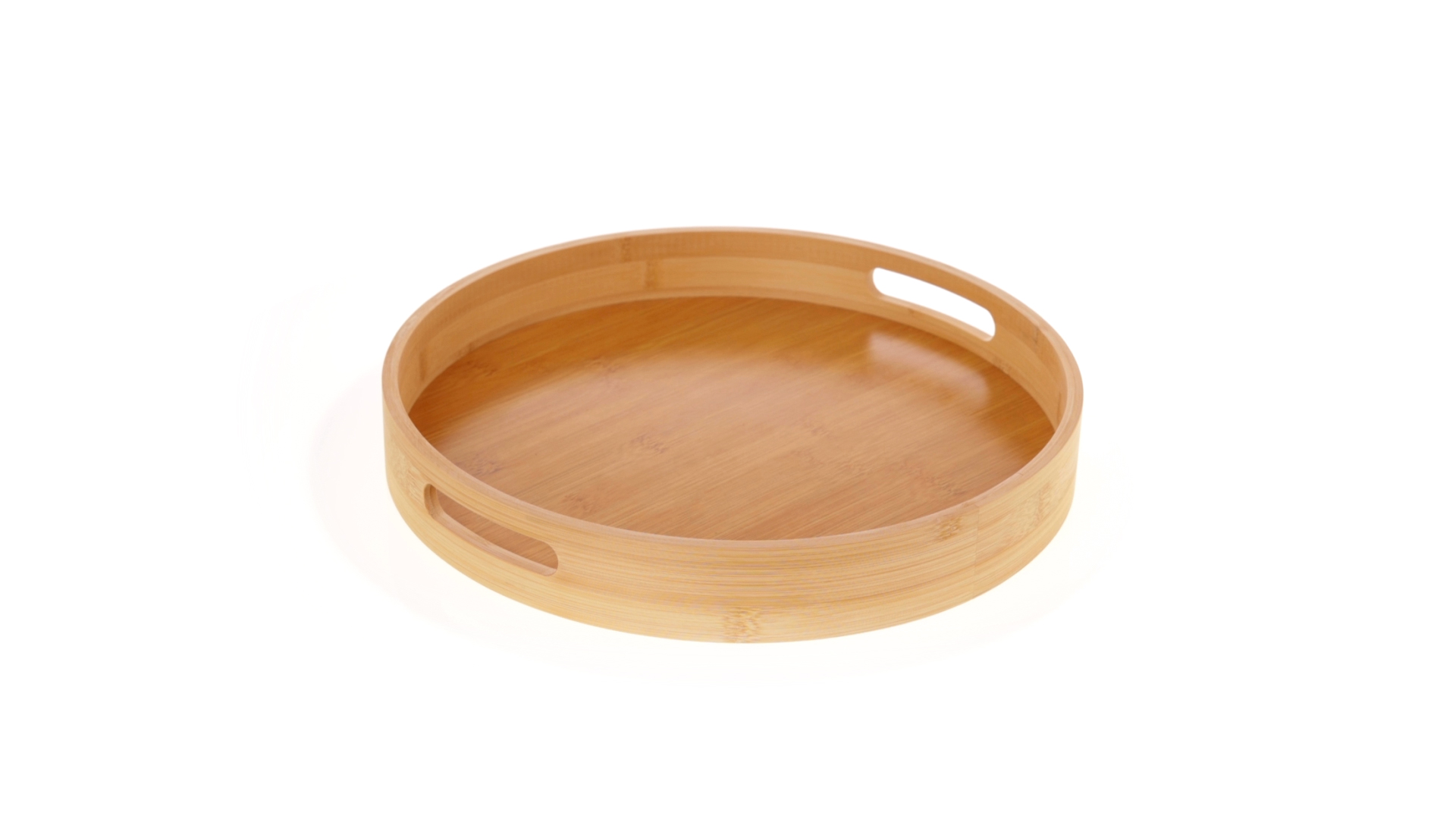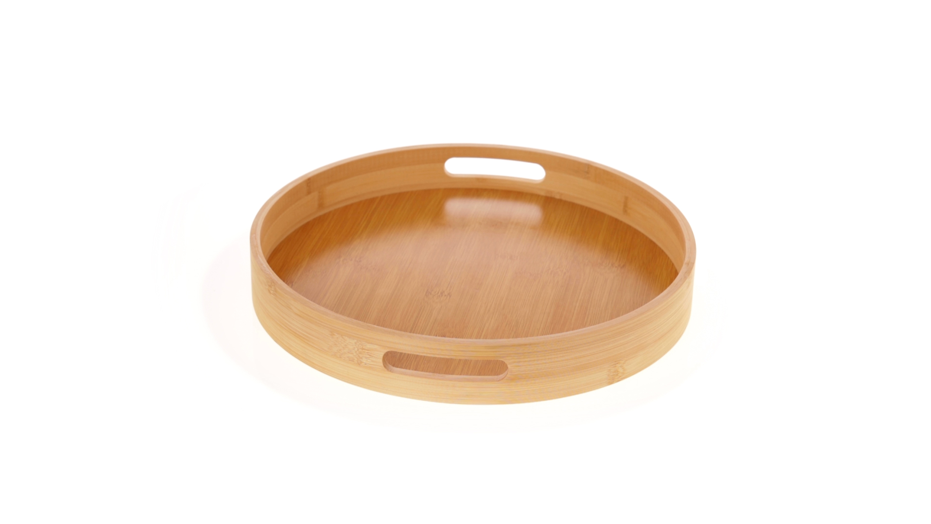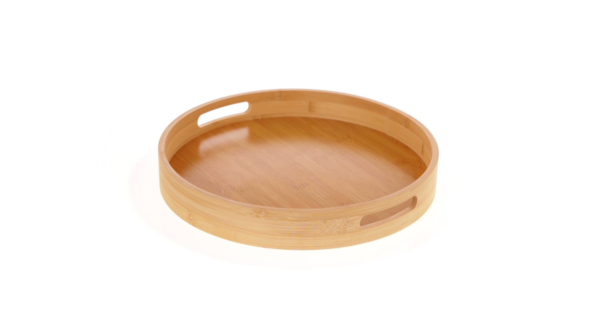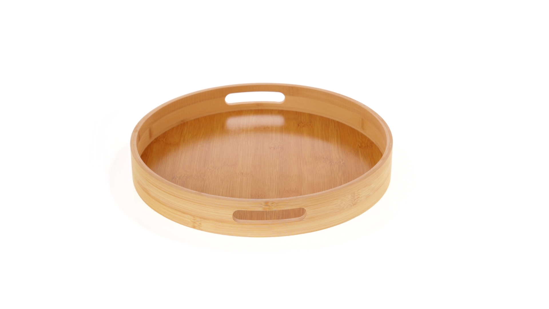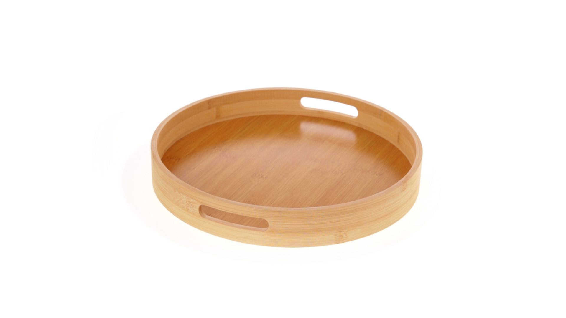 Tablett aus Bambus. Umweltfreundliches Design aus weichem Bambus zum bequemen Tragen von Getränken mithilfe der gestanzten Griffe. Materialien wie Bambus fördern die Verwendung natürlicher Rohstoffe und reduzieren den Schadstoffausstoss.